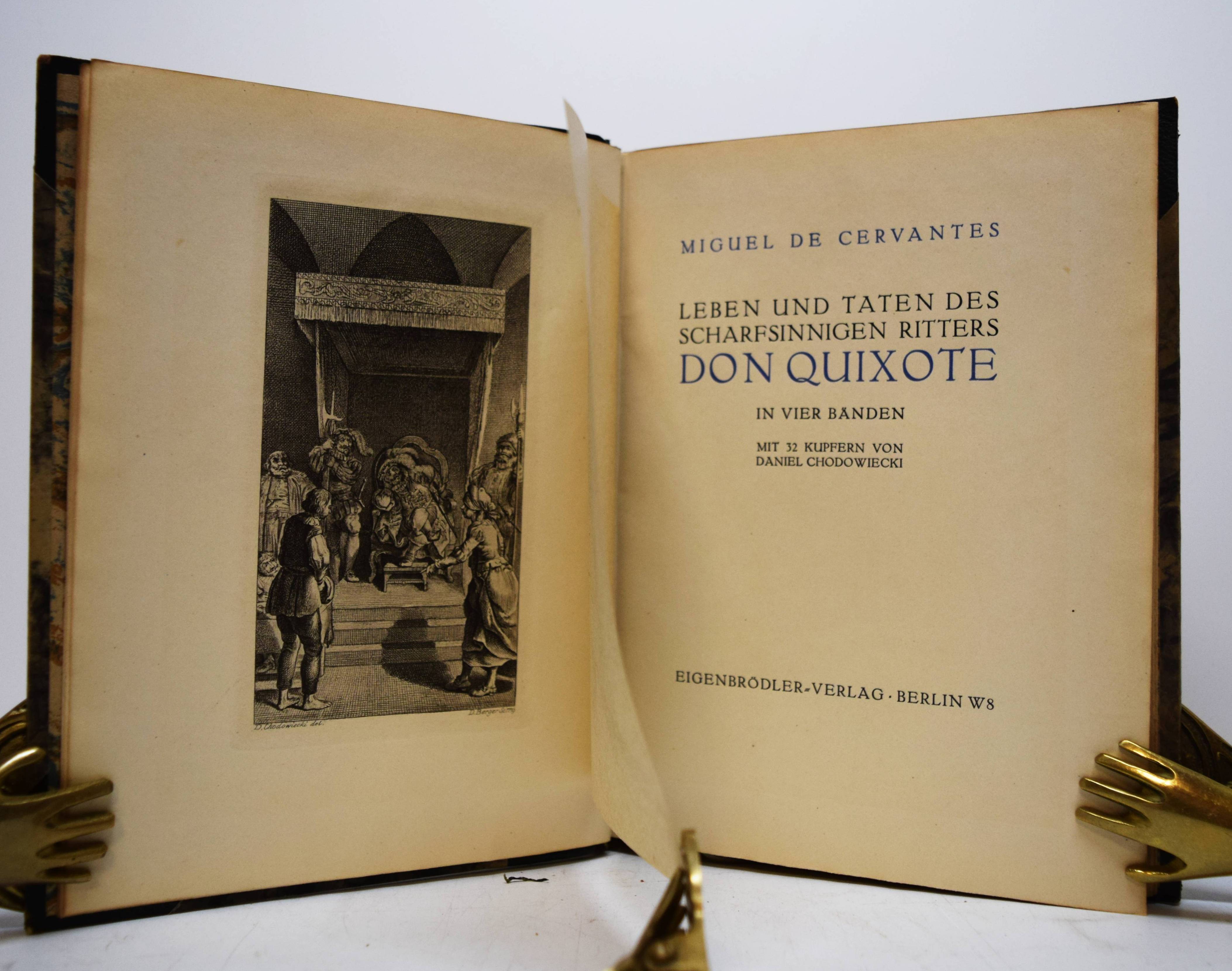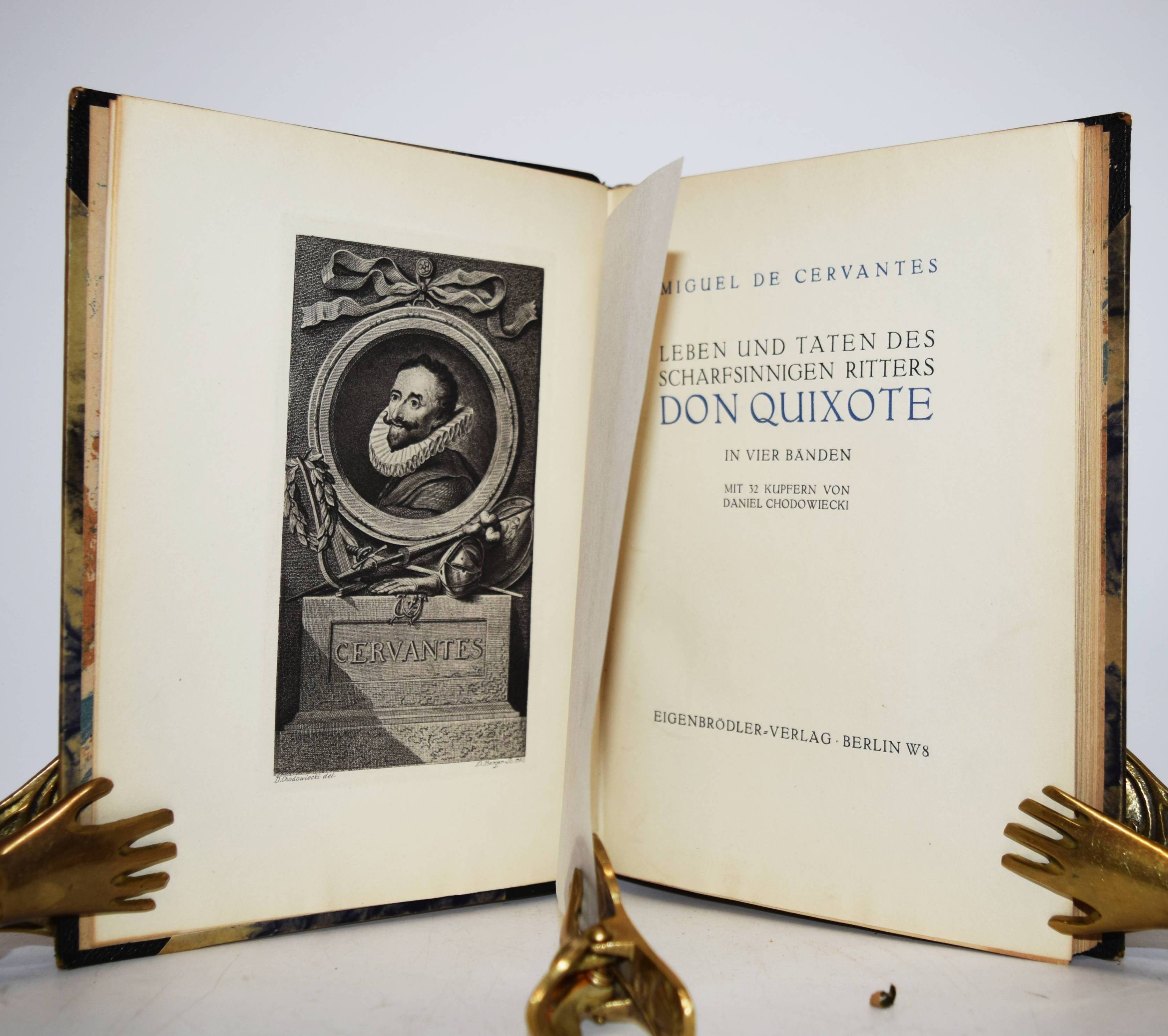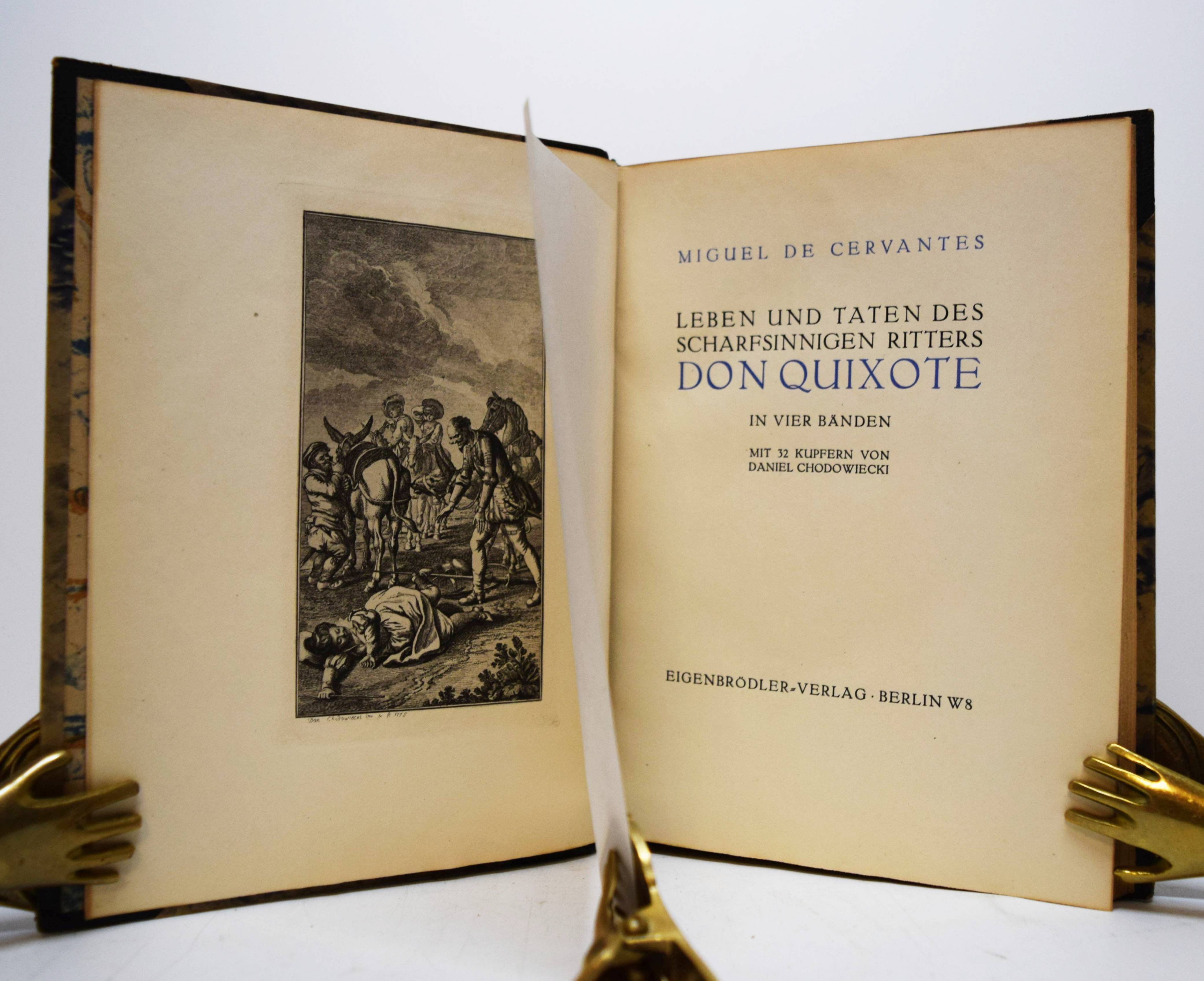 Cervantes Saavedra, Miguel de. Leben und Taten des scharfsinnigen Ritters Don Quixote. Mit 32 Kupfern von Daniel Chodowiecki. 4 Bände. Berlin, Eigenbrödler-Verlag o. J. (1921). 8°. Mit 32 Heliogravüren. Dunkelblaue Orig.-Halblederbände mit goldgepr. Rückenschildern, reicher Rückenvergoldung und Kopfgoldschnitt. Eines von 1100 num. Exemplaren. – Der Text wurde von Curt Moreck nach der Tieckschen Übertragung bearbeitet. – Der Eigenbrödler-Verlag, 1919 in Berlin gegründet, edierte nach eigenem Bekunden „hauptsächlich Werke mit Radierungen“. – Rücken etwas berieben und zu Braun aufgehellt, gutes Exemplar der schönen Halblederausgabe.