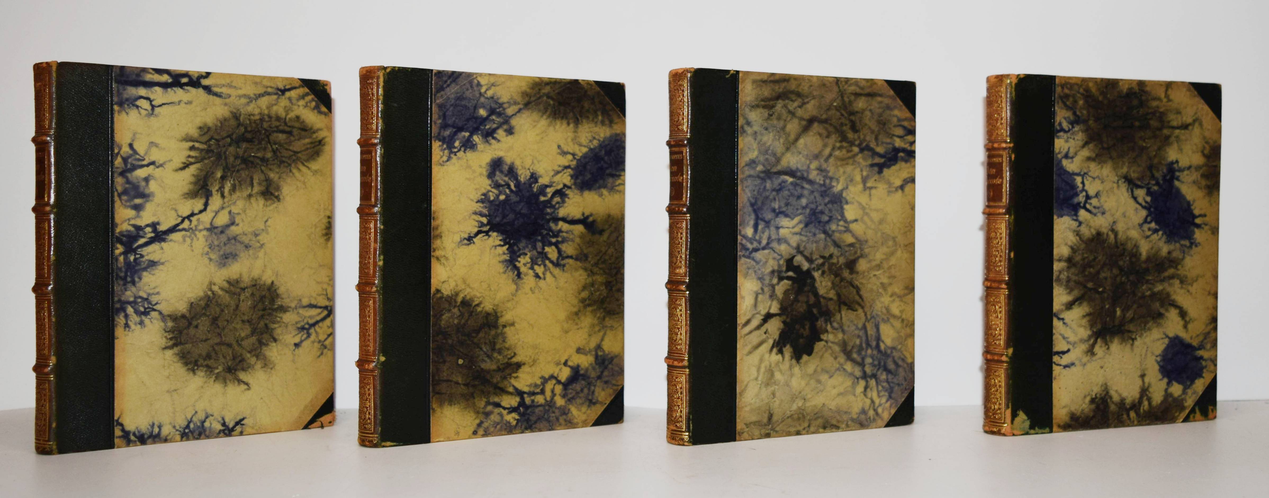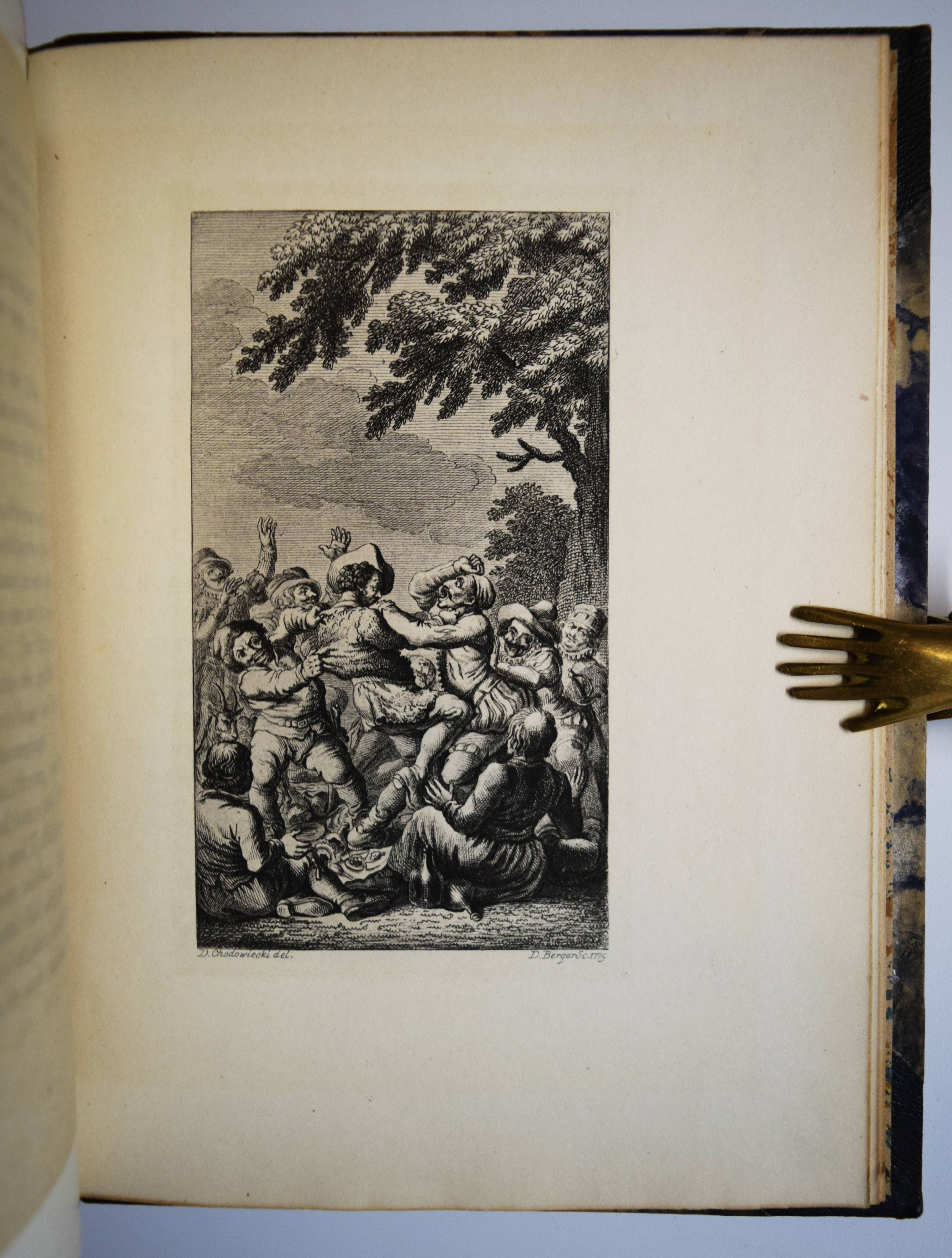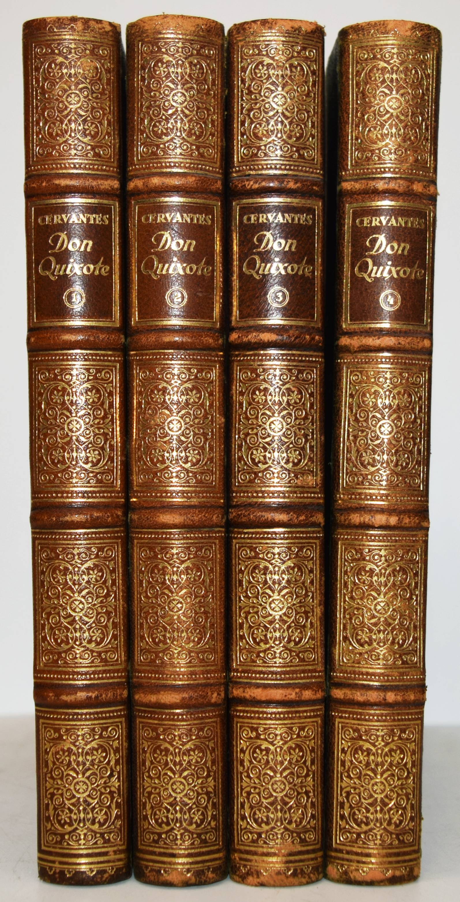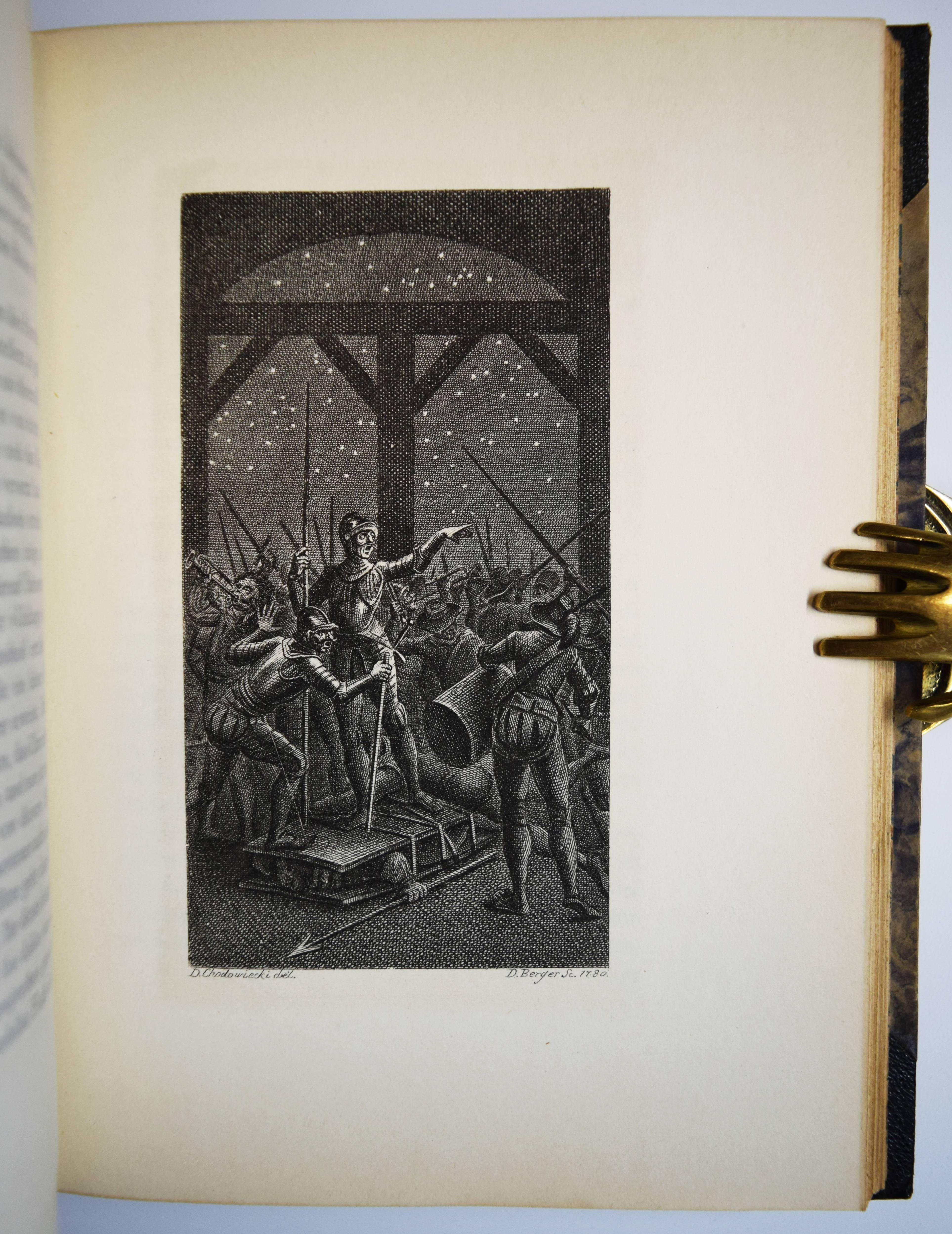 Cervantes Saavedra, Miguel de. Leben und Taten des scharfsinnigen Ritters Don Quixote. Mit 32 Kupfern von Daniel Chodowiecki. 4 Bände. Berlin, Eigenbrödler-Verlag o. J. (1921). 8°. Mit 32 Heliogravüren. Dunkelblaue Orig.-Halblederbände mit goldgepr. Rückenschildern, reicher Rückenvergoldung und Kopfgoldschnitt. Eines von 1100 num. Exemplaren. – Der Text wurde von Curt Moreck nach der Tieckschen Übertragung bearbeitet. – Der Eigenbrödler-Verlag, 1919 in Berlin gegründet, edierte nach eigenem Bekunden „hauptsächlich Werke mit Radierungen“. – Rücken etwas berieben und zu Braun aufgehellt, gutes Exemplar der schönen Halblederausgabe.