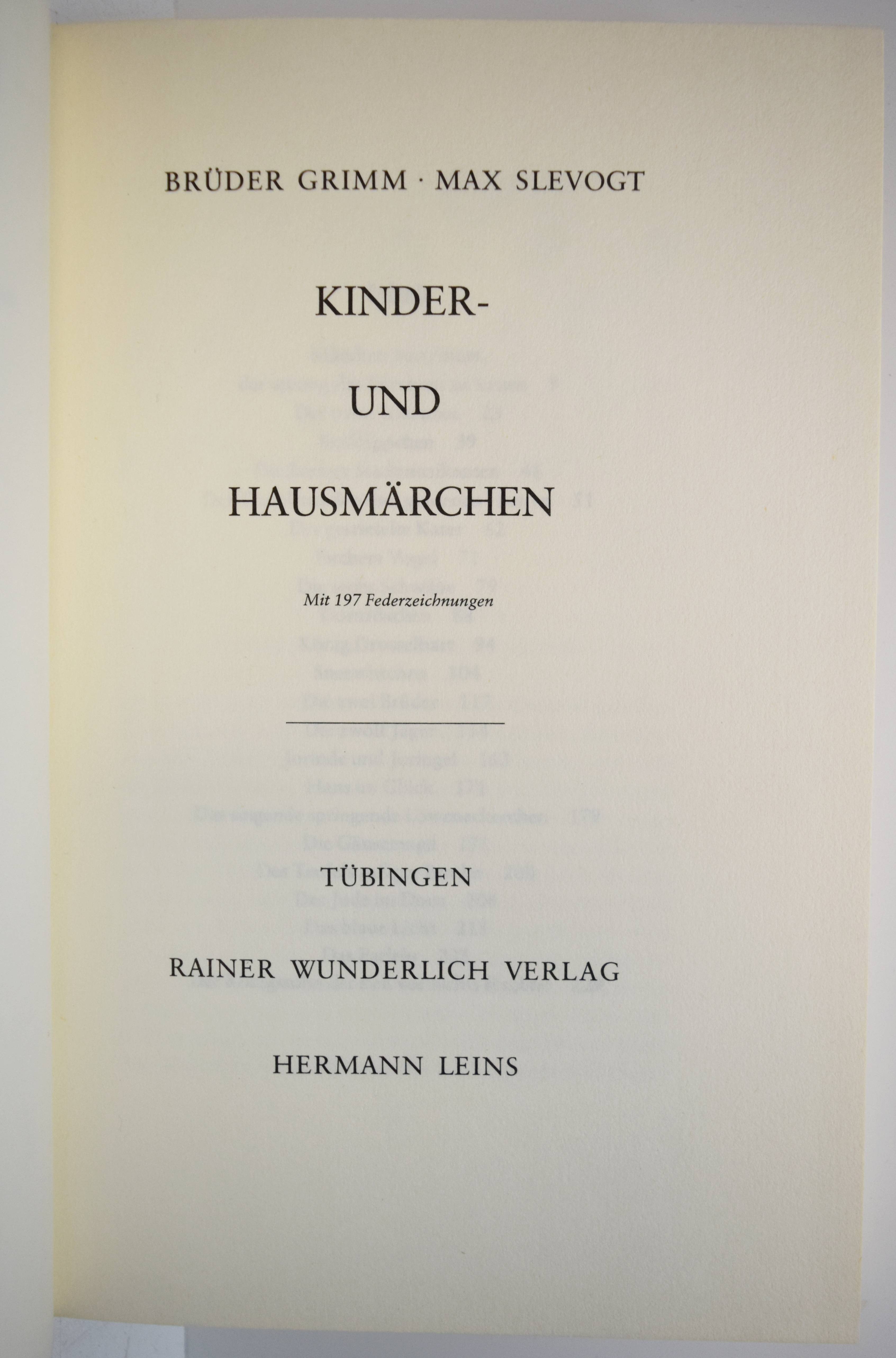 Grimm, (Jacob und Wilhelm). Kinder- und Hausmärchen. Mit 197 Federzeichnungen von Max Slevogt. Tübingen, Rainer Wunderlich Verlag, Hermann Leins (1976). 4°. 240 S. mit 197 Illustrationen. Orig.-Pappband mit illustr. Schutzumschlag in Pappschuber. Erste Gesamtausgabe der von Slevogt illustrierten Märchen der Brüder Grimm. – Sehr schönes Exemplar.