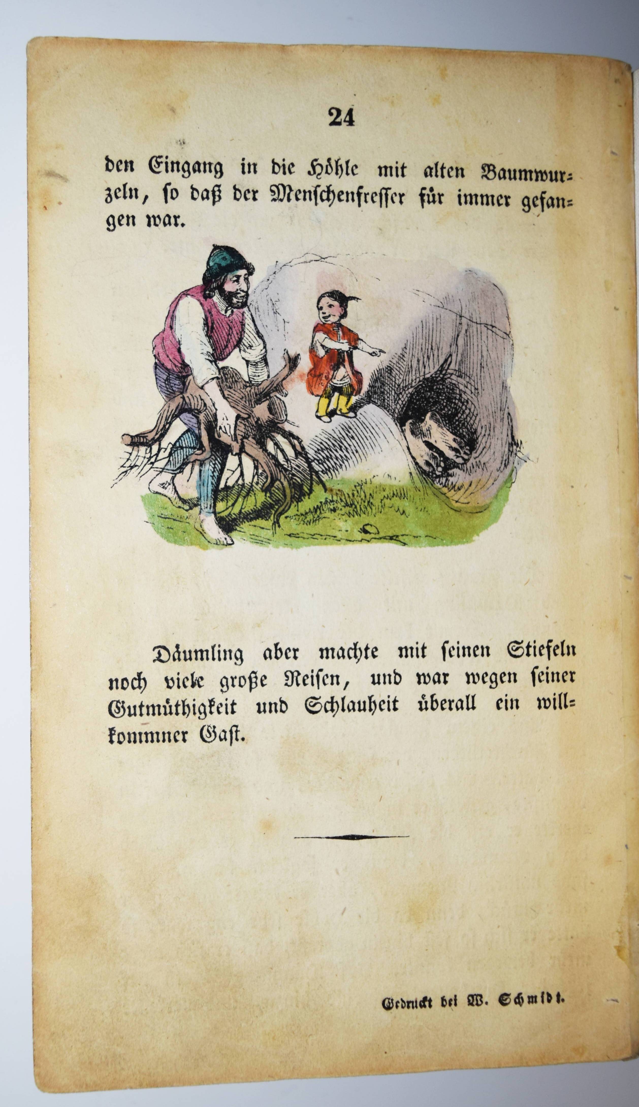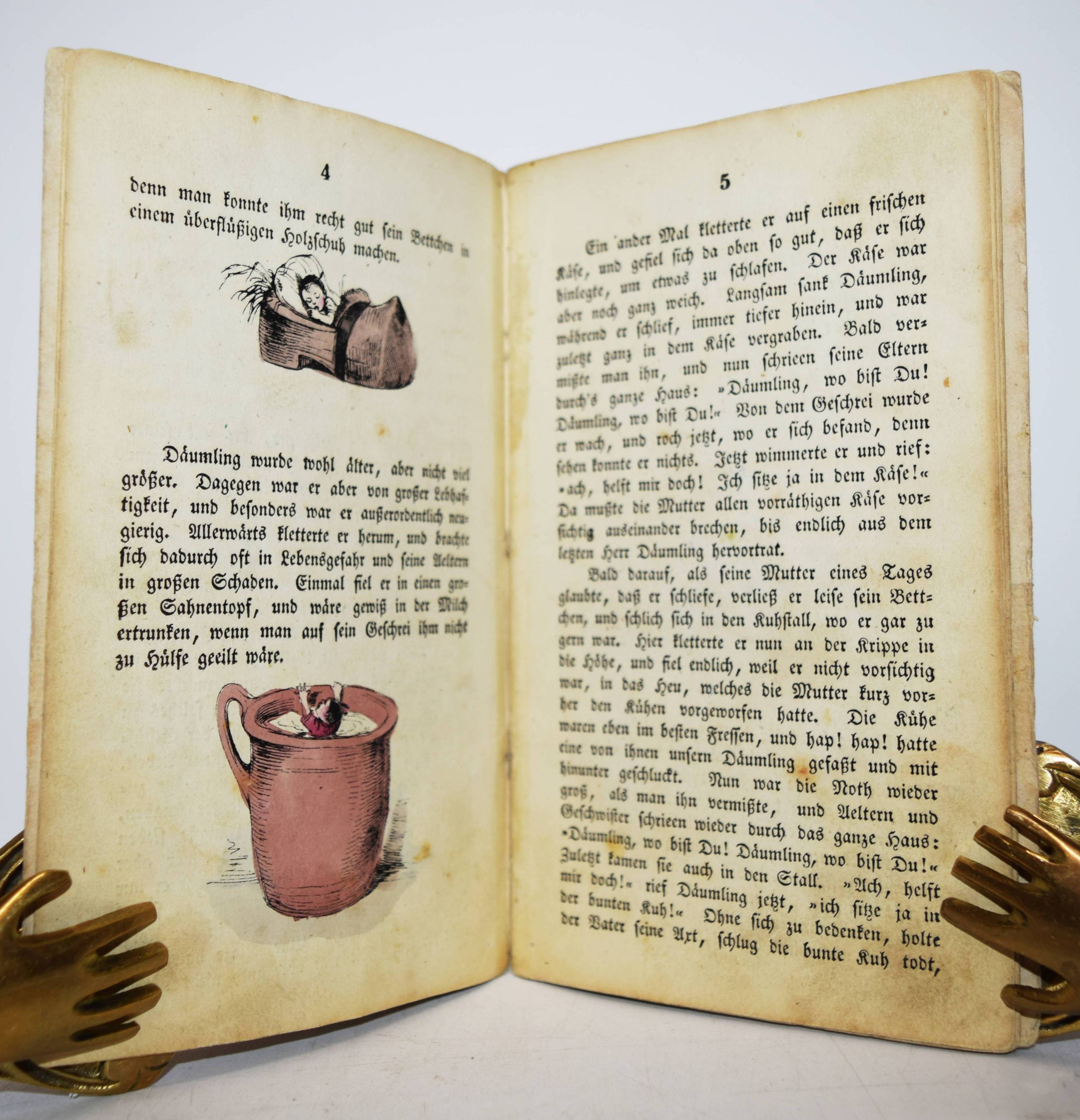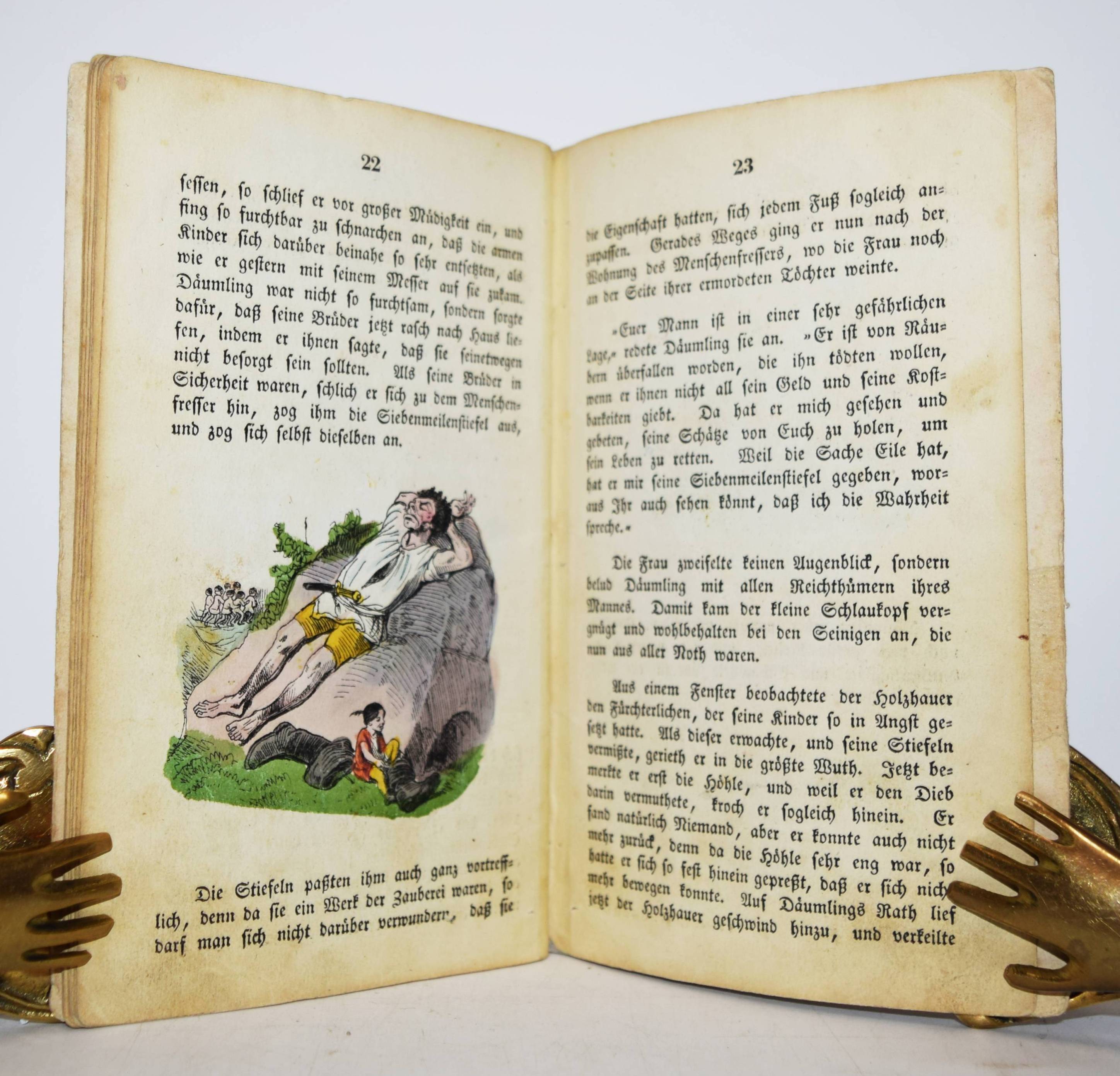 Holting, Gustav (d. i. Karl Gustav Winkelmann). Der kleine Däumling. Nach dem Französischen. Berlin, Winckelmann und Söhne o. J. (1841). Kl.-8° (16,5 x 10,5 cm.). 24 S. mit 16 handkolorierten Vignetten in Federlithographie von T(heodor) H(osemann). Pappband der Zeit mit montiertem illustr. Orig.-Umschlag. Brieger, Hosemann 65. Wegehaupt III, 1726. Vgl. Bilderwelt 266. Hobrecker, Frankfurt 153. Rümann. Illustr. Bücher 862. Rümann, Kinderbücher 189 (mit Farbabb.) und Wegehaupt I, 1018 (Alle französische Ausgabe). – Erste Ausgabe. – Das Märchen ist der Perrault’schen Fassung von Winkelmann neu nacherzählt. – „Hosemann streut Vignetten in den Märchentext ein, der als preiswerte Monographie erschienen ist. Diese Art der Durchsetzung hat als erster Pocci im „Märlein von Sneewittchen“ (1837) angewandt“ (A. Petri in Bilderwelt). – Rücken erneuert, Umschlag berieben, Name auf dem Titel, im Blattrand teils fingerfleckig, sonst gut erhalten.
