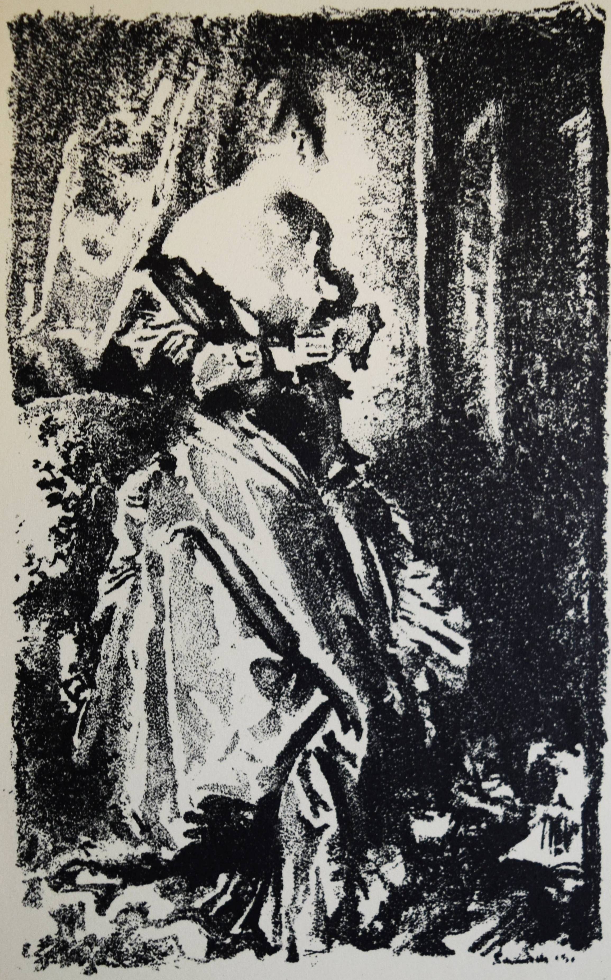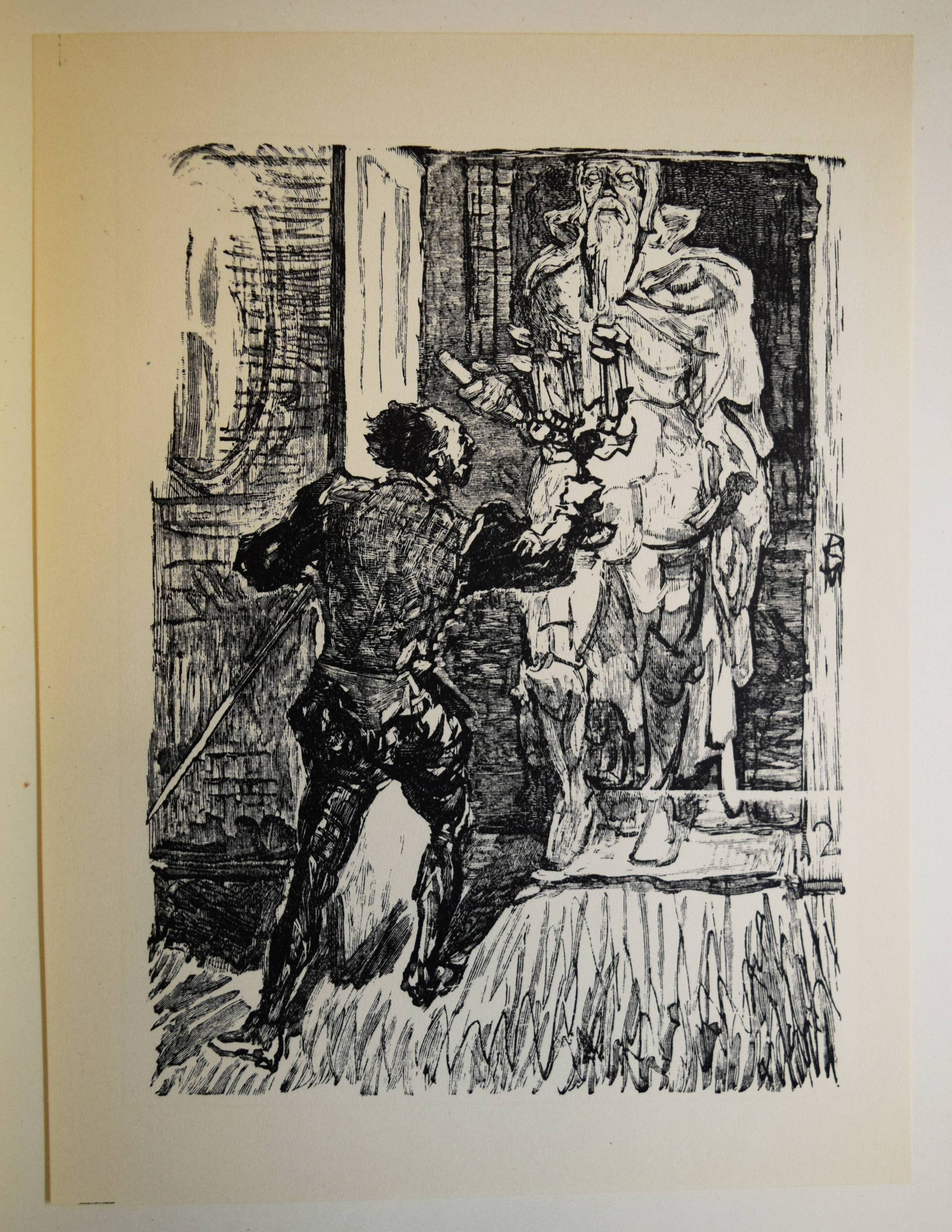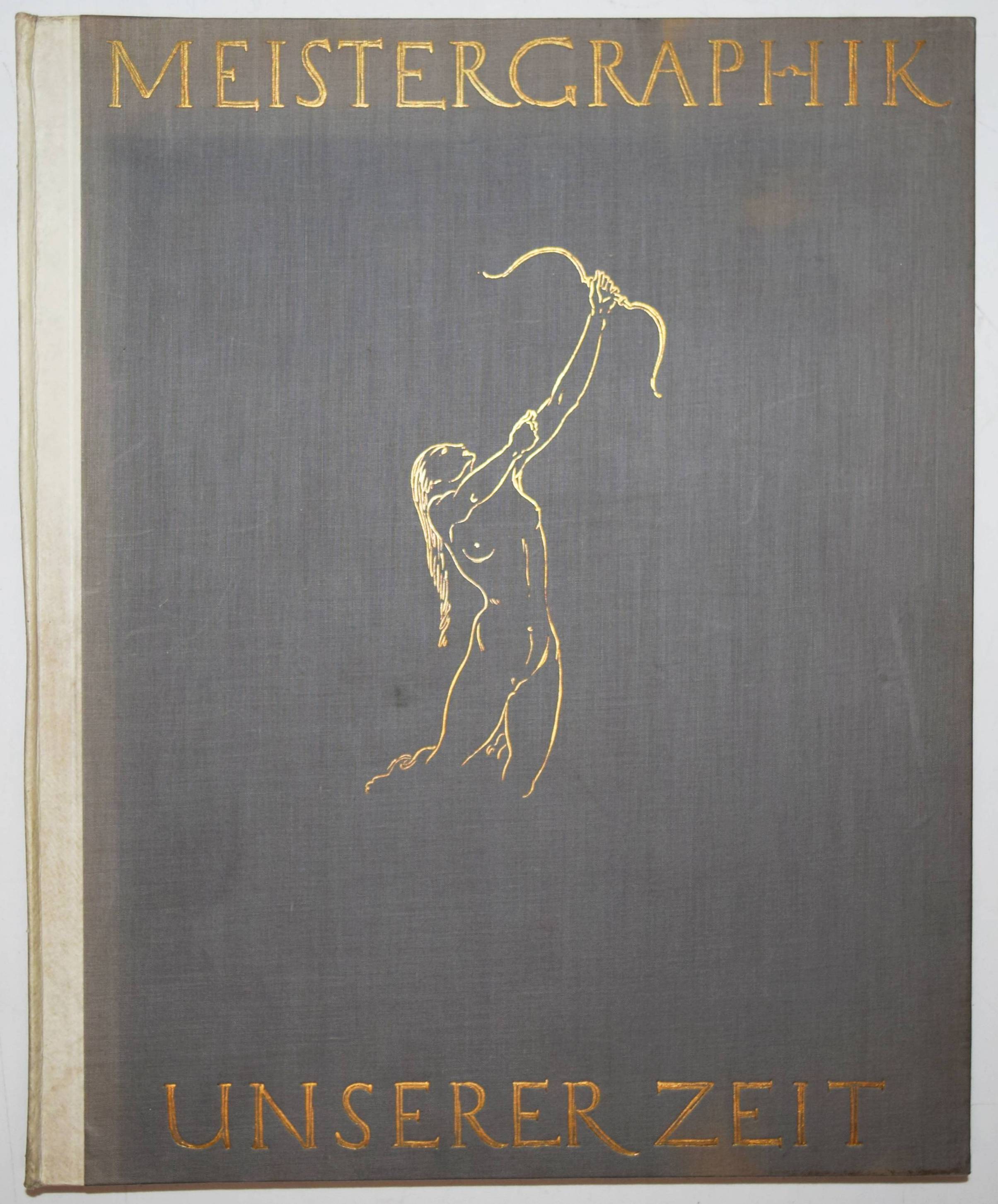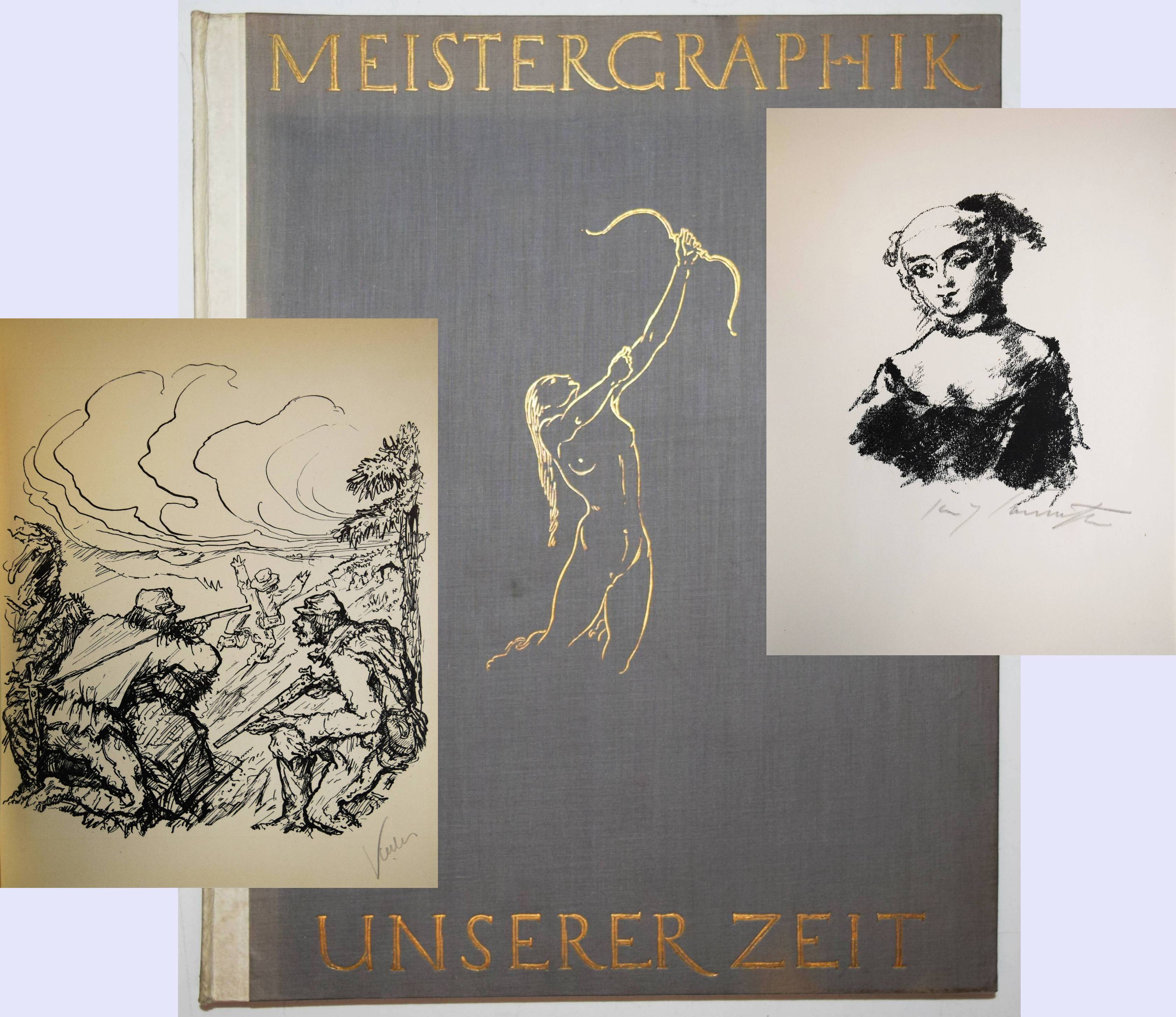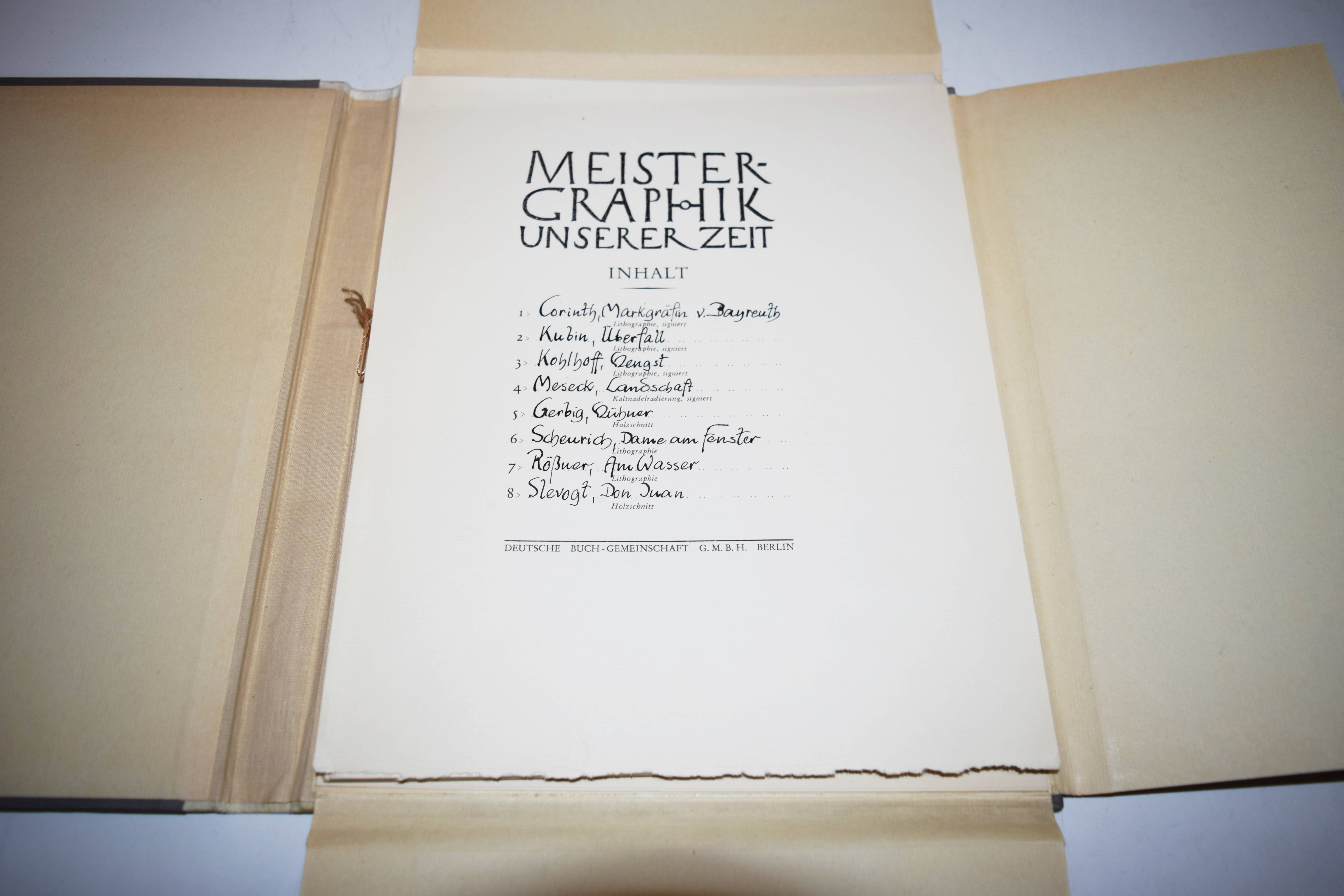 Meister-Graphik unserer Zeit. Acht Blätter Originalgraphik Deutscher Künstler. Mit einer Einführung in die gesamte graphische Technik und einem Überblick über das Schaffen der in der Mappe vertretenen Künstler. Berlin, Deutsche Buch-Gemeinschaft (1935). 4°. Portfolio, 22 S. (Textheft mit 7 Abbildungen). 1 Bl. (Inhalt) und 8 (4 signierte) Orig.-Graphiken unter Passepartouts. Orig.-Halbpergament-Flügelmappe mit goldgepr. Rückenschild, Deckeltitel und Deckelvignette (von E. R. Vogenauer). Eines von 1000 num. Exemplaren. – Das Portfolio enthält die Original-Lithographien von Lovis Corinth (Markgräfin von Bayreuth, signiert), Alfred Kubin (Überfall, signiert), Wilhelm Kohlhoff (Hengst, signiert), Paul Scheurich (Dame am Fenster), Georg Walter Rössner (Am Wasser); 1 Kaltnadelradierung von Felix Meseck (4 Pferde und Hund in Landschaft, signiert) sowie 2 Holzschnitte von Alexander Gerbig (Hühner) und Max Slevogt (Don Juan).