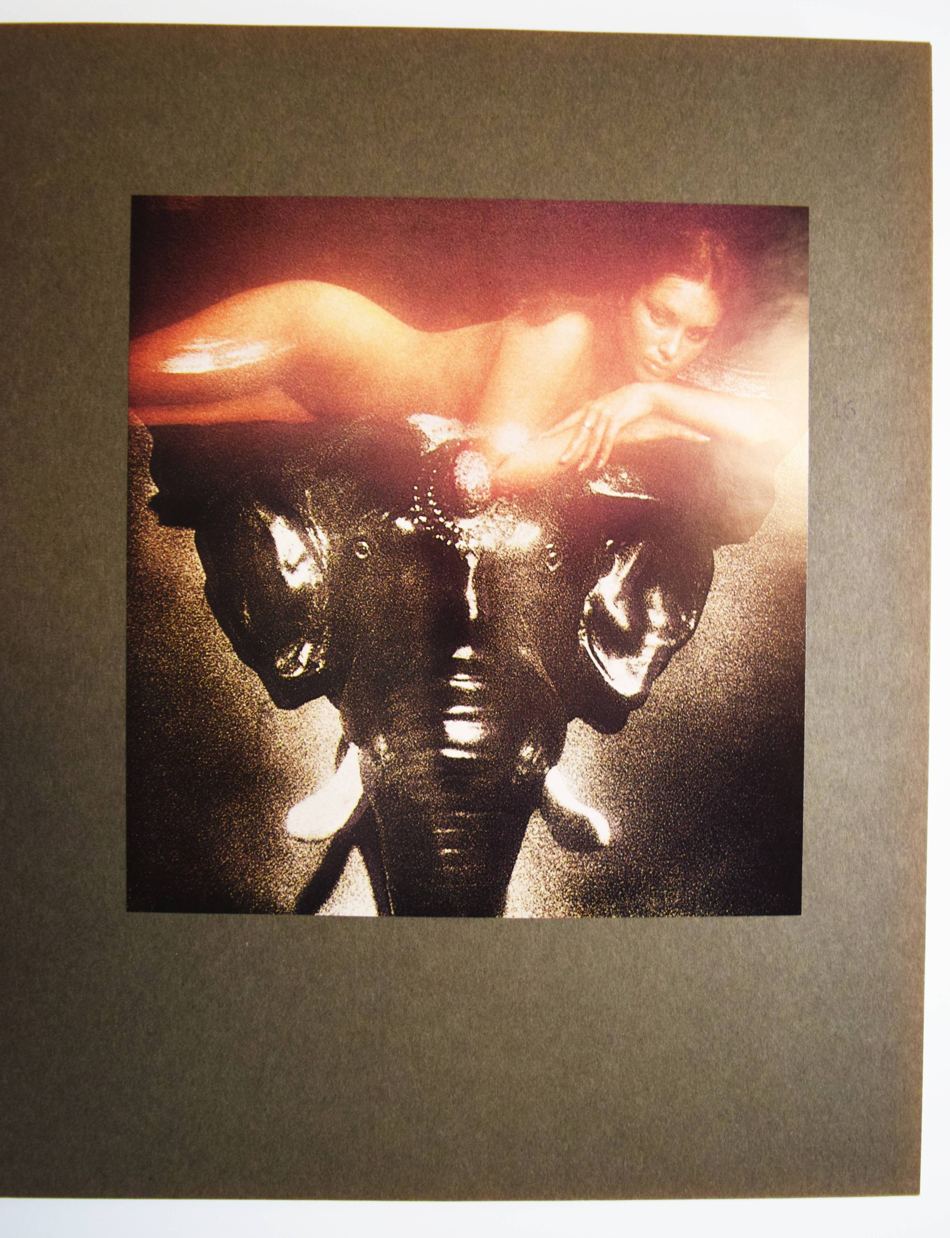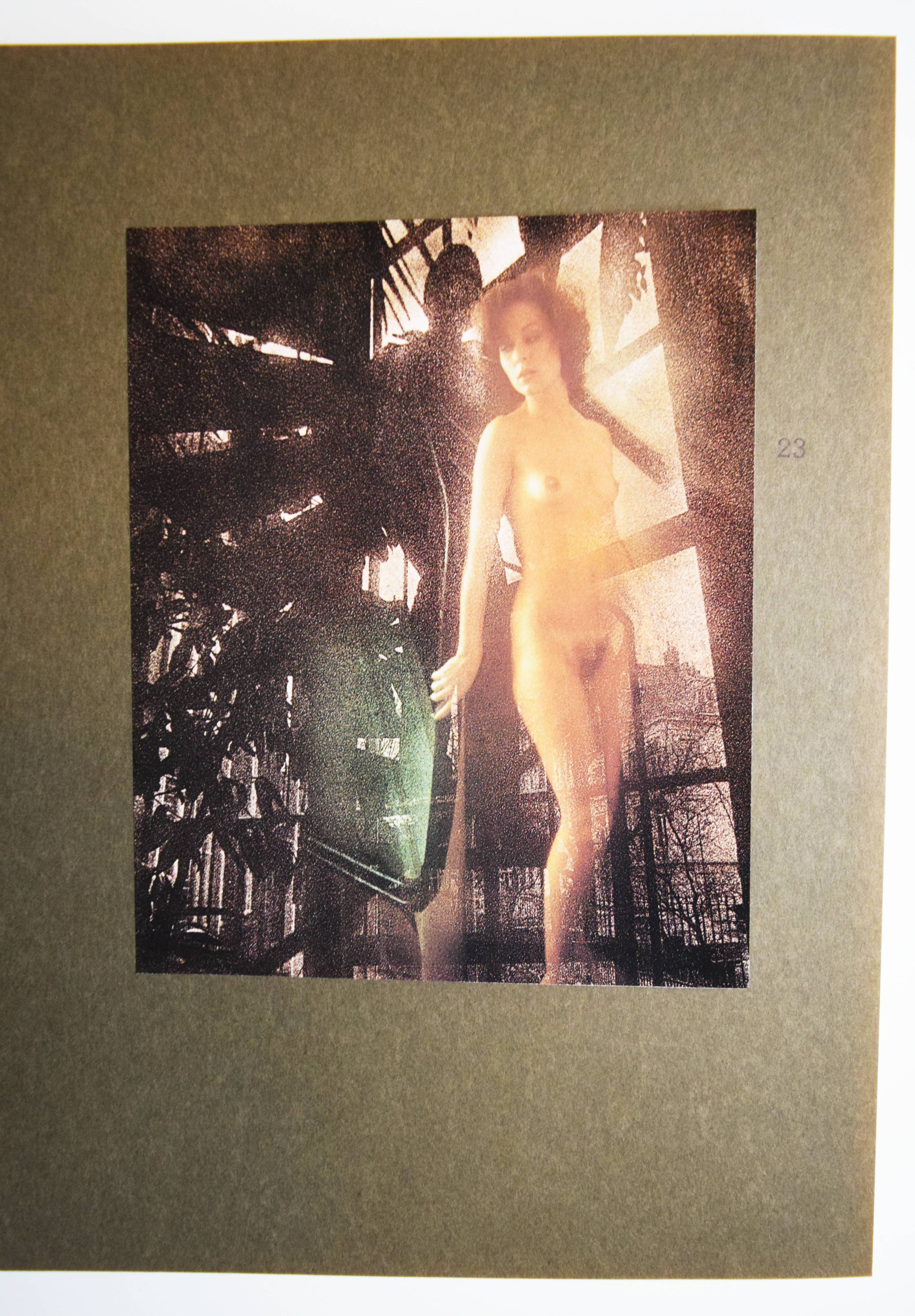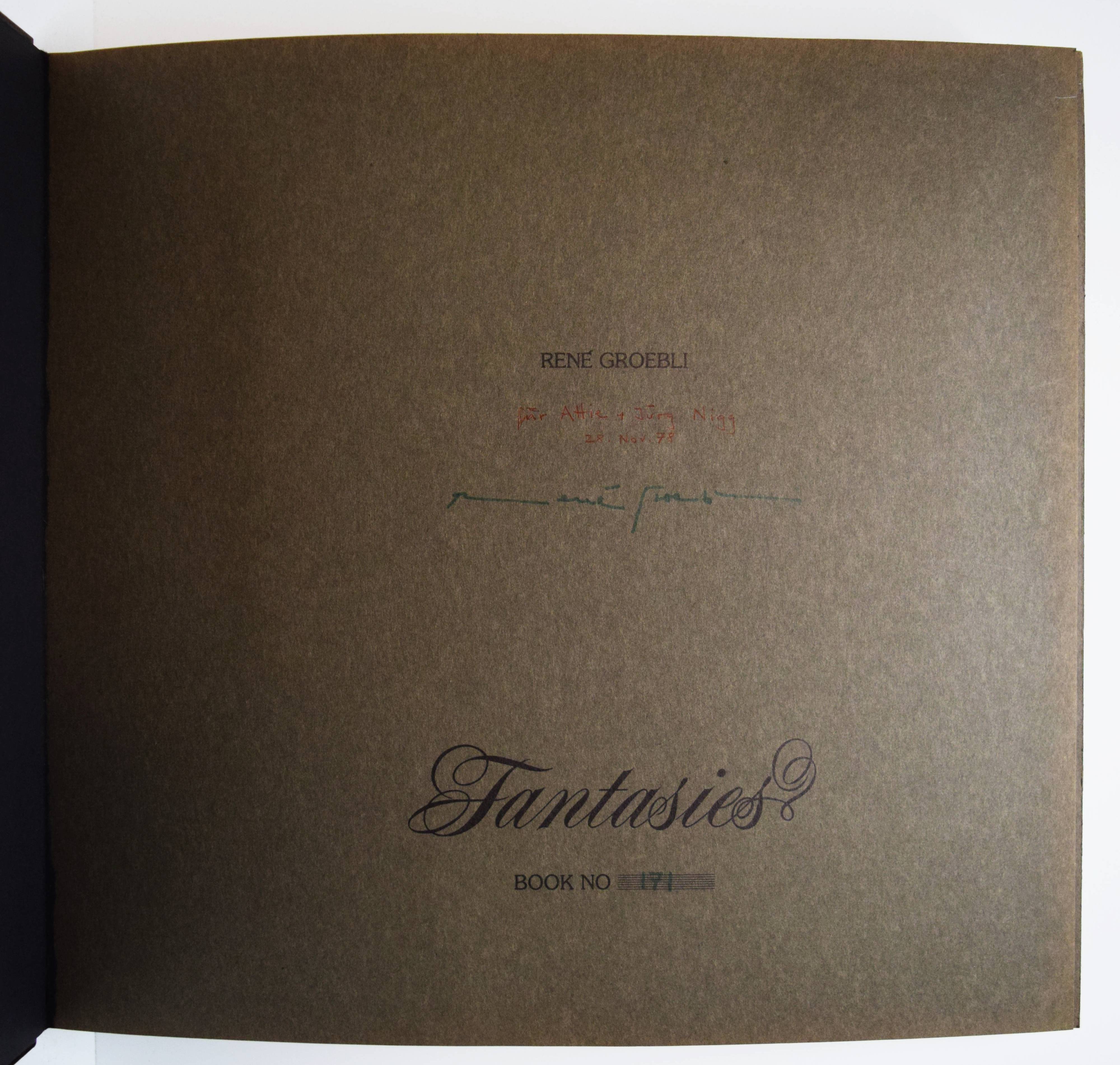 Groebli, René. Fantasies. 47 photographs. (With foreword and 47 Haikus by John Hennessey). New York, Images Gallery und München, Verlag Laterna Magica (1978). Quer-Folio (33 x 35 cm.). [51] Bl. mit 47 mont. Farbtafeln und 1 rückseitig signierten Orig.-Farbphotographie (25 x 20 cm.) sowie Beiheft (8 S., dt. Übersetzung). Orig.-Kunstlederband mit mont. Deckelbild in Pappschuber. Bertolotti 253. – Eines von 696 num. Exemplaren; auf dem Titelblatt von R. Groebli signiert und mit eigenhändiger Widmung: „für Atti u. Jürg Nigg 28. Nov. 78“. – „Surreal, very dreamlike atmospheres can be seen in René Groebli’s erotic photomontages, published in 1978 in Fantasies; these are metaphorical transpositions of women’s memories, fantasies, and desires, in which the man is often clearly present, but sometimes only hypothetically so“ (A. Bertolotti). – Sehr gut erhalten.