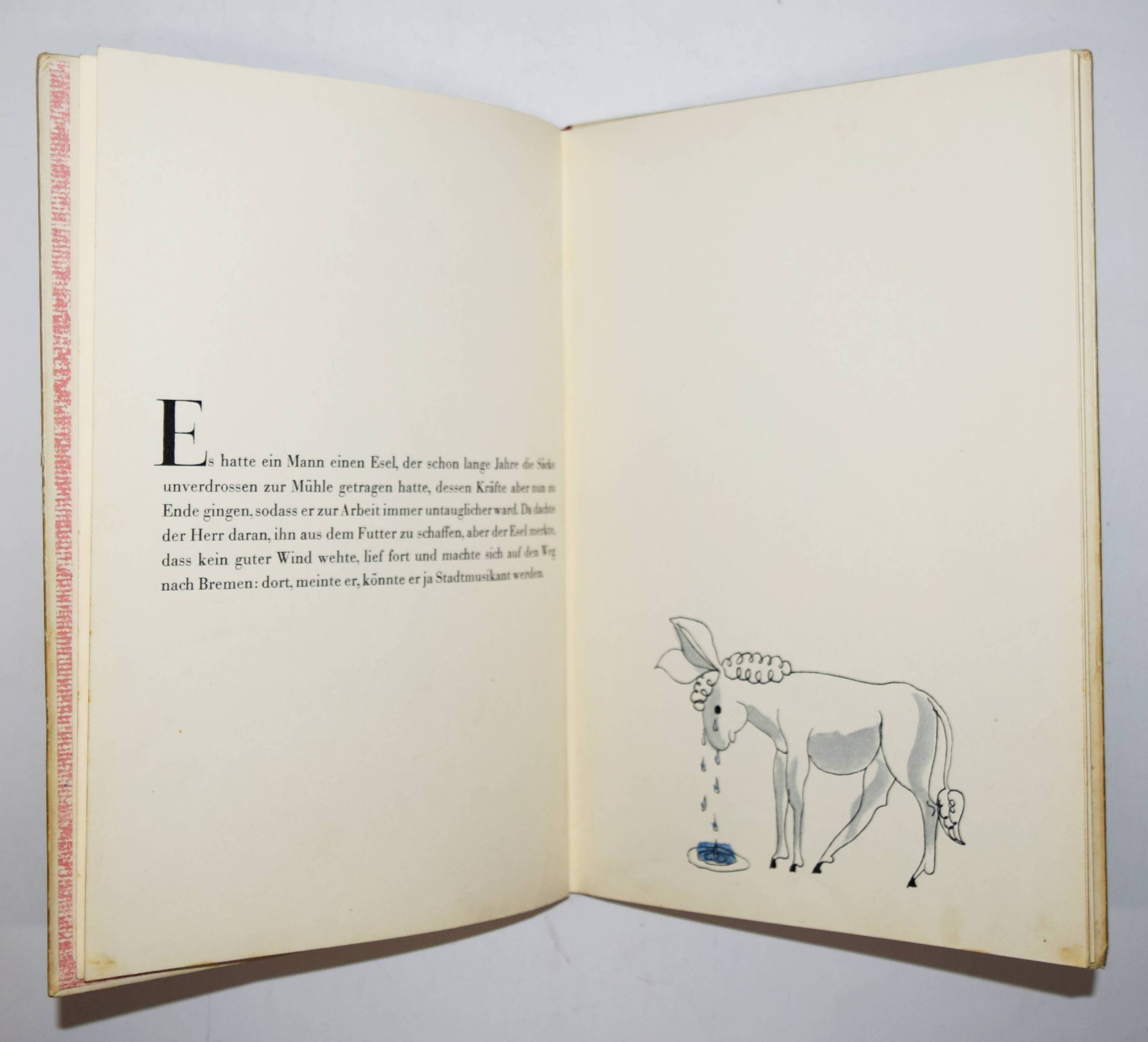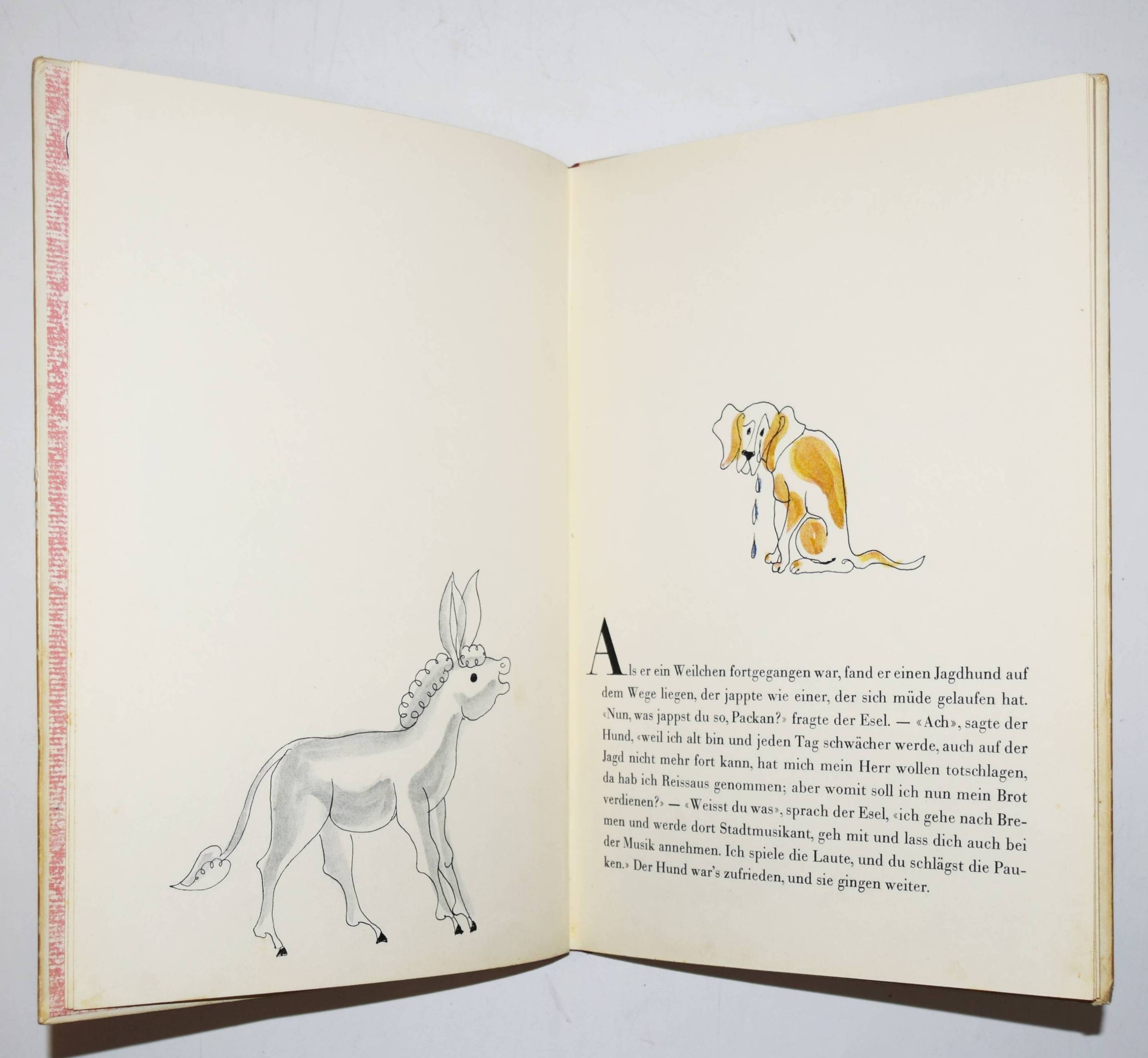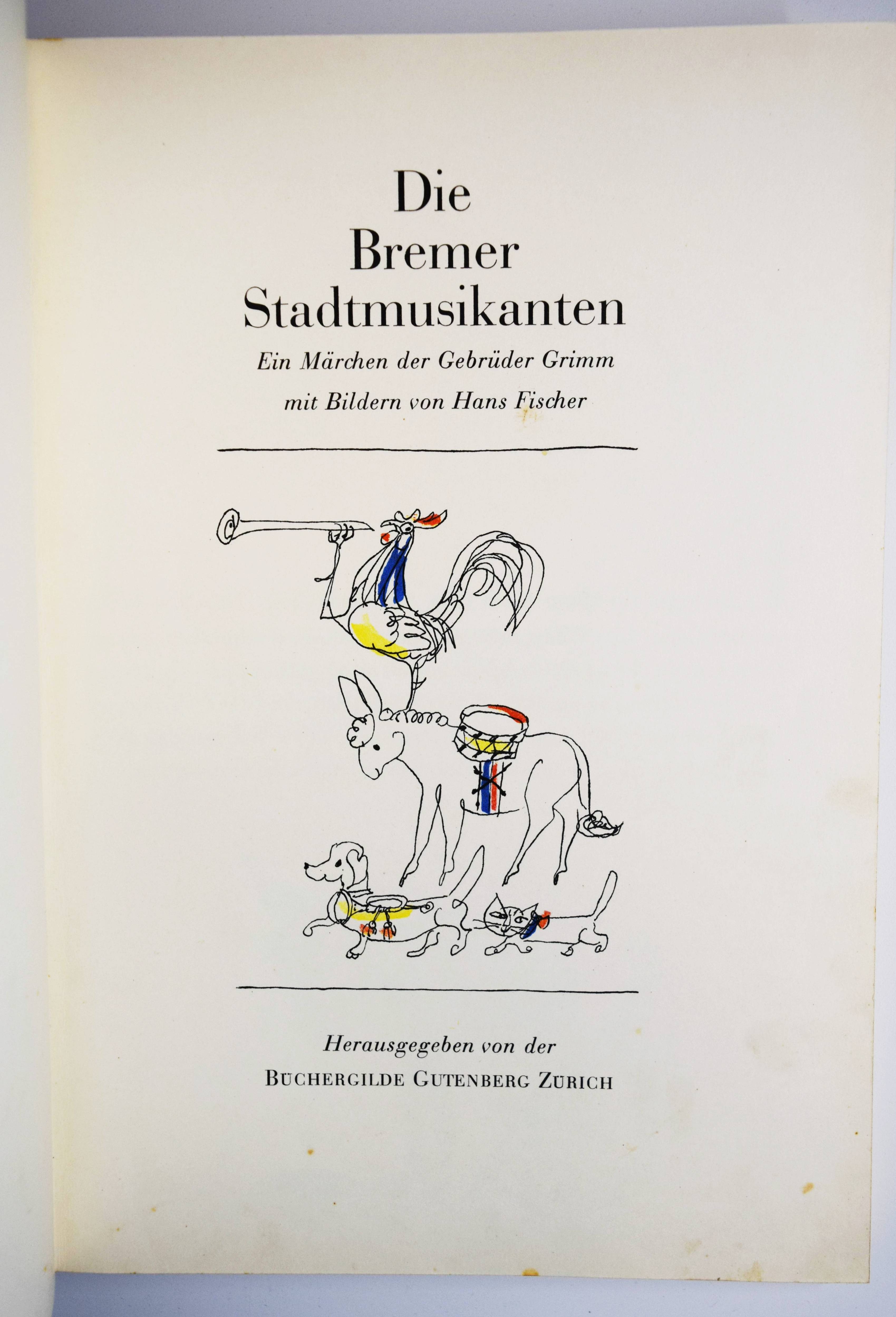 Grimm, (Jakob u. Wilhelm). Die Bremer Stadtmusikanten. Ein Märchen. Mit Bildern von Hans (Erich) Fischer. Zürich, Büchergilde Gutenberg (1944). 4°. [15] Bl. mit farblithogr. Illustrationen. Farbig illustr. Orig.-Halbleinenband. Doderer-Müller 830. u. S. 379 (mit Abb. S. 380). Slg. Hürlimann 110. Hürlimann, Bilderbuch S. 201. Klotz 9000/1816. LKJ I, 388 f. (mit Abb.). SBI 137 u. S. 23. Weismann S. 27. Vgl. Bilderwelt 776. – Erste Ausgabe des ersten von Fischer illustrierten Bilderbuchs. Druck: Wolfsberg Zürich. – Die humorvollen, flott hingezeichneten Illustrationen erinnern an Kinderzeichnungen und auch wegen der köstlichen, oft skurrilen szenischen Einfälle wurden Fischers Bilderbücher von allen Kindern sofort geliebt und erfuhren deshalb hohe Auflagen. – Deckel und Blattränder etwas fingerfleckig, sonst gutes Exemplar.