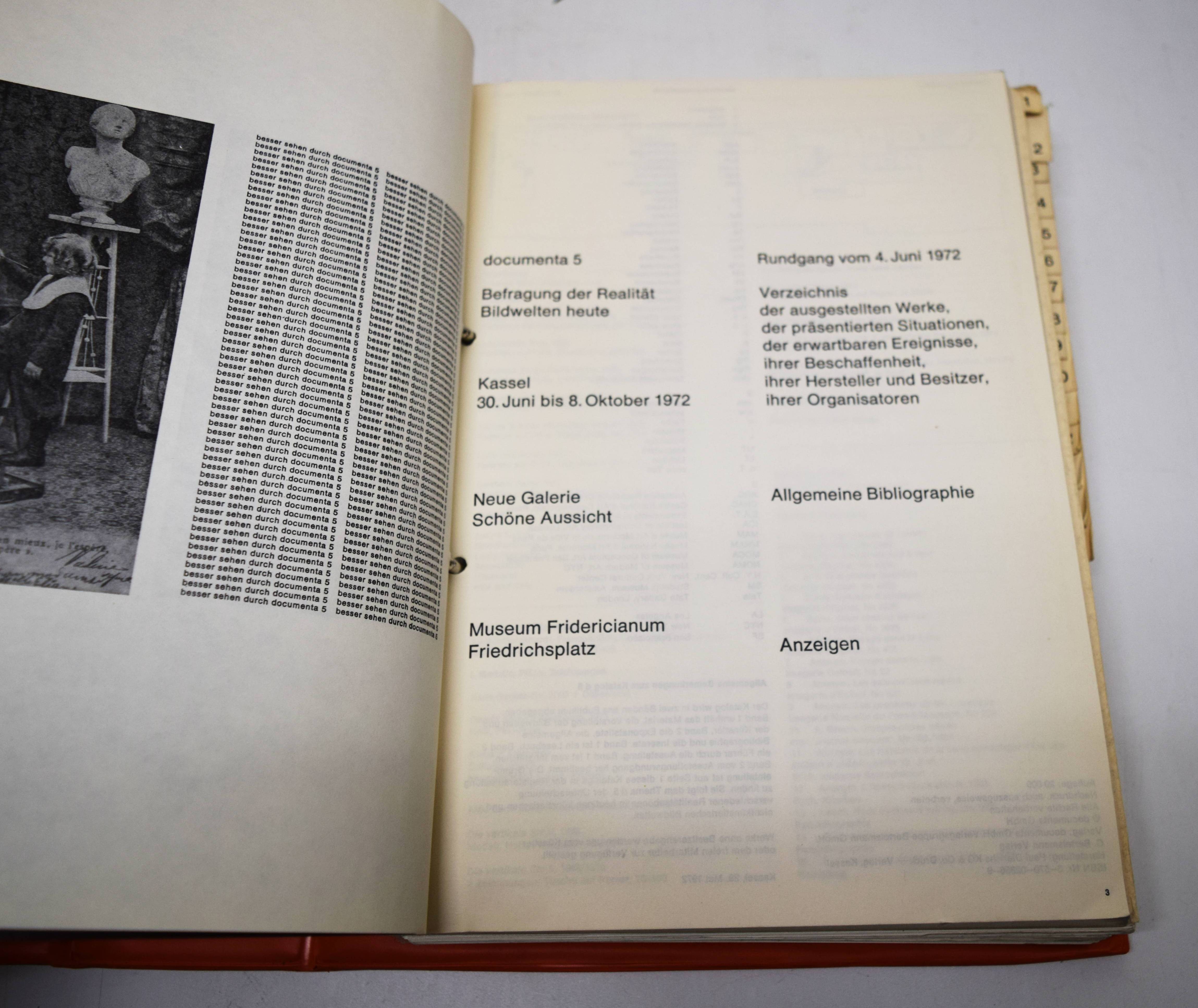 Documenta 5. Befragung der Realität. Bilderwelten heute. Kassel 30. Juni bis 8. Oktober 1972. Neue Galerie Schöne Aussicht. Museum Fridericianum Friedrichsplatz. Kassel 1972. 4°. 693 S. mit zahlr. teils farbigen Abbildungen. Illustr. orangefarb. Orig.-Kunststoff-Ring-Ordner (Entwurf: Ed Ruscha). Der wichtigste Documenta-Katalog. – Enthält nach dem Titel und Vorwort den Übersichtskatalog „Rundgang vom 4. Juni 1972“. Wie meist sind die Registerblätter 19 bis 24 ohne Inhalt (Nr. 25 Fotonachweis enthält ein Blatt). – Ordner mit Altersspuren, sonst sehr gut erhalten.