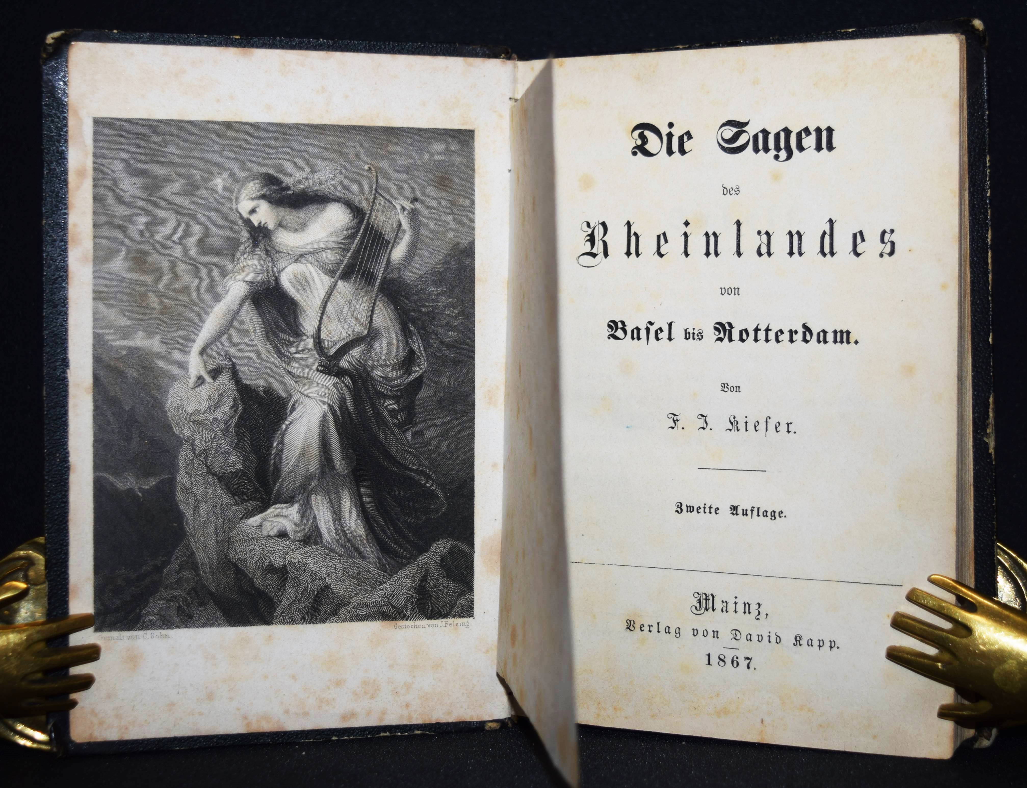 Kiefer, F. J. Die Sagen des Rheinlandes von Basel bis Rotterdam. 2. Aufl. Mainz, Kapp 1867. Kl.-8°. 313 S. mit einem gestoch. Frontispiz. Hldr. der Zeit mit goldgepr. Rückentitel und Linienvergoldung. Einband etwas berieben, stellenweise teils stärker stockfl., sonst gut erhalten.