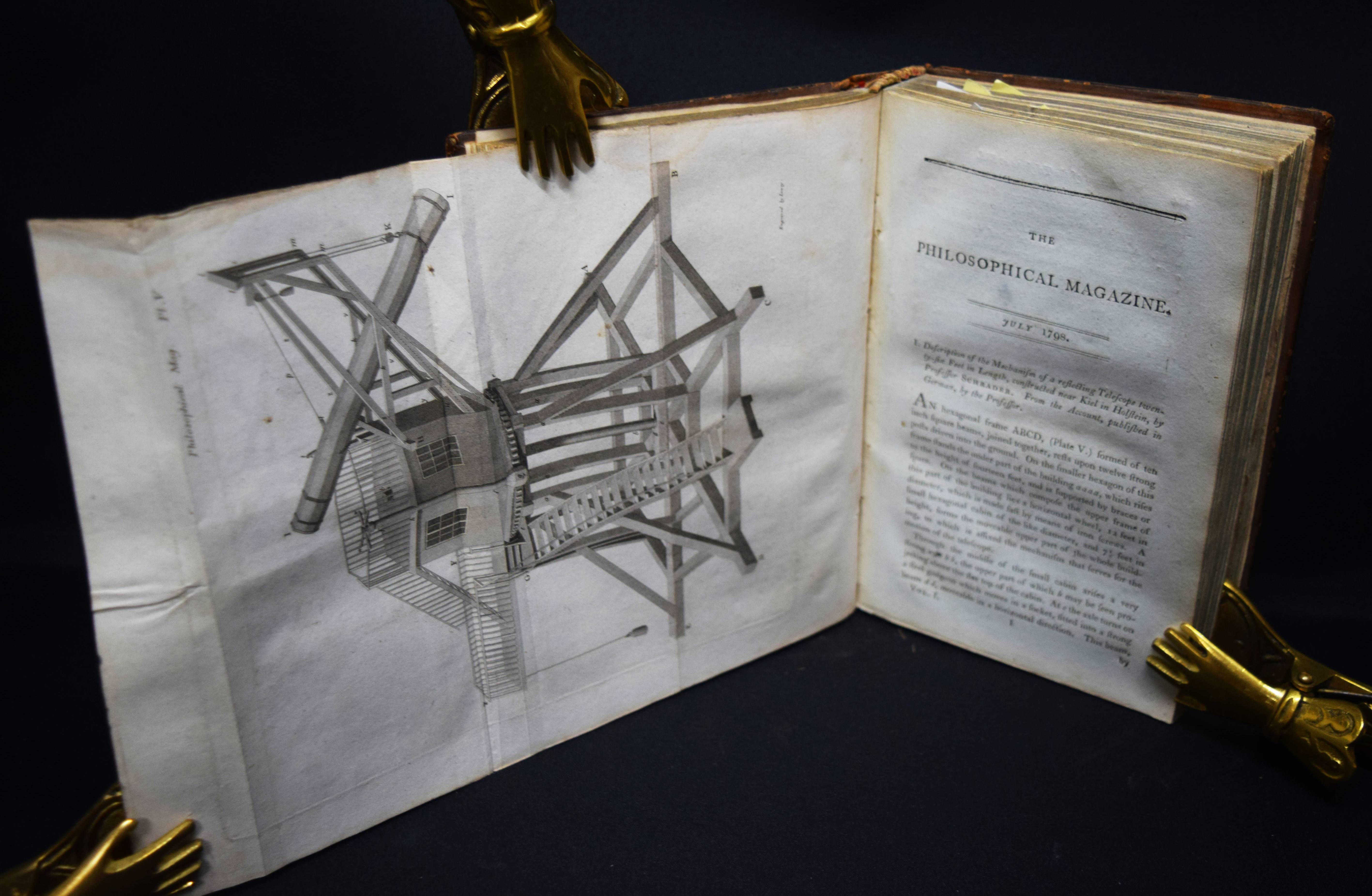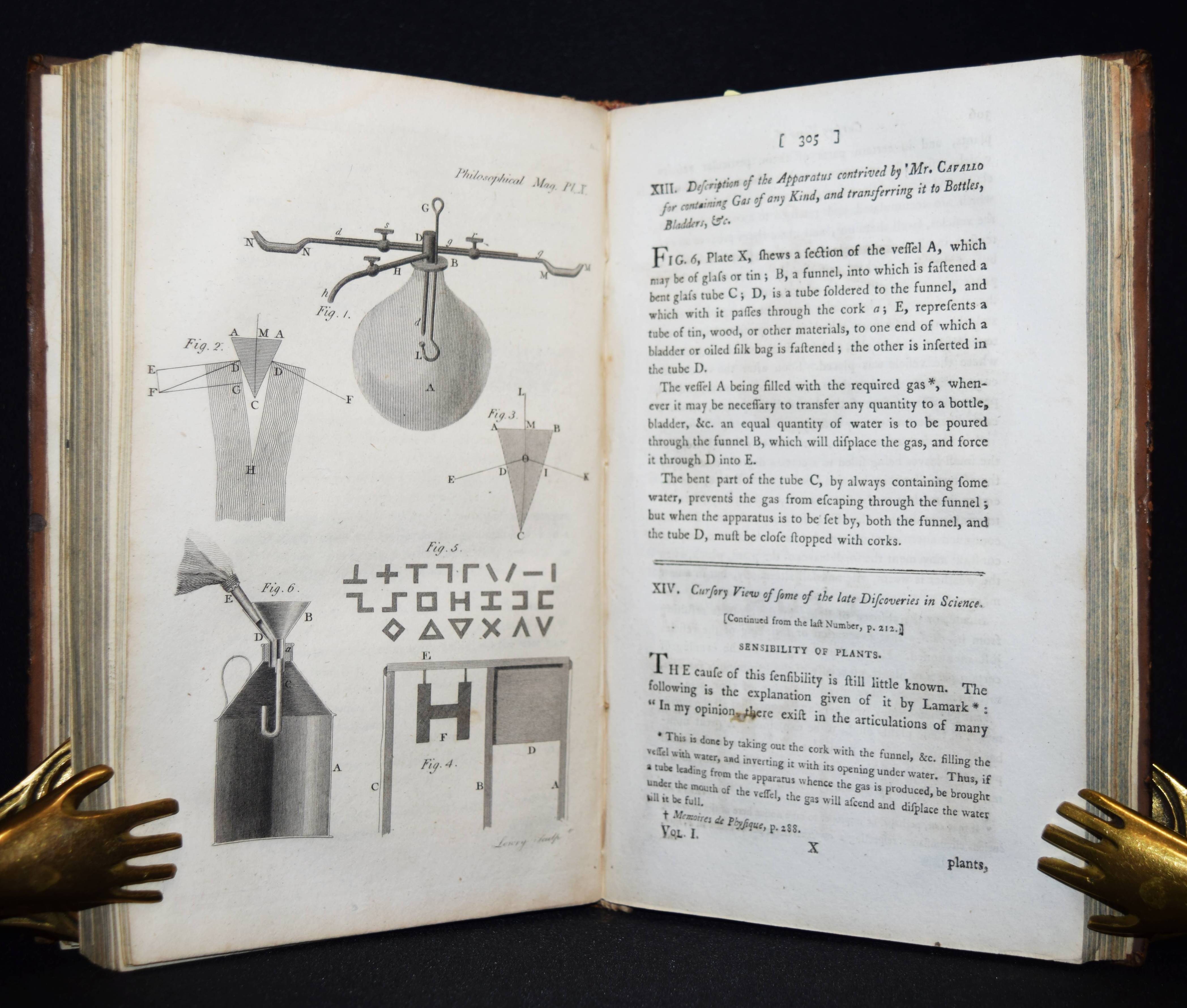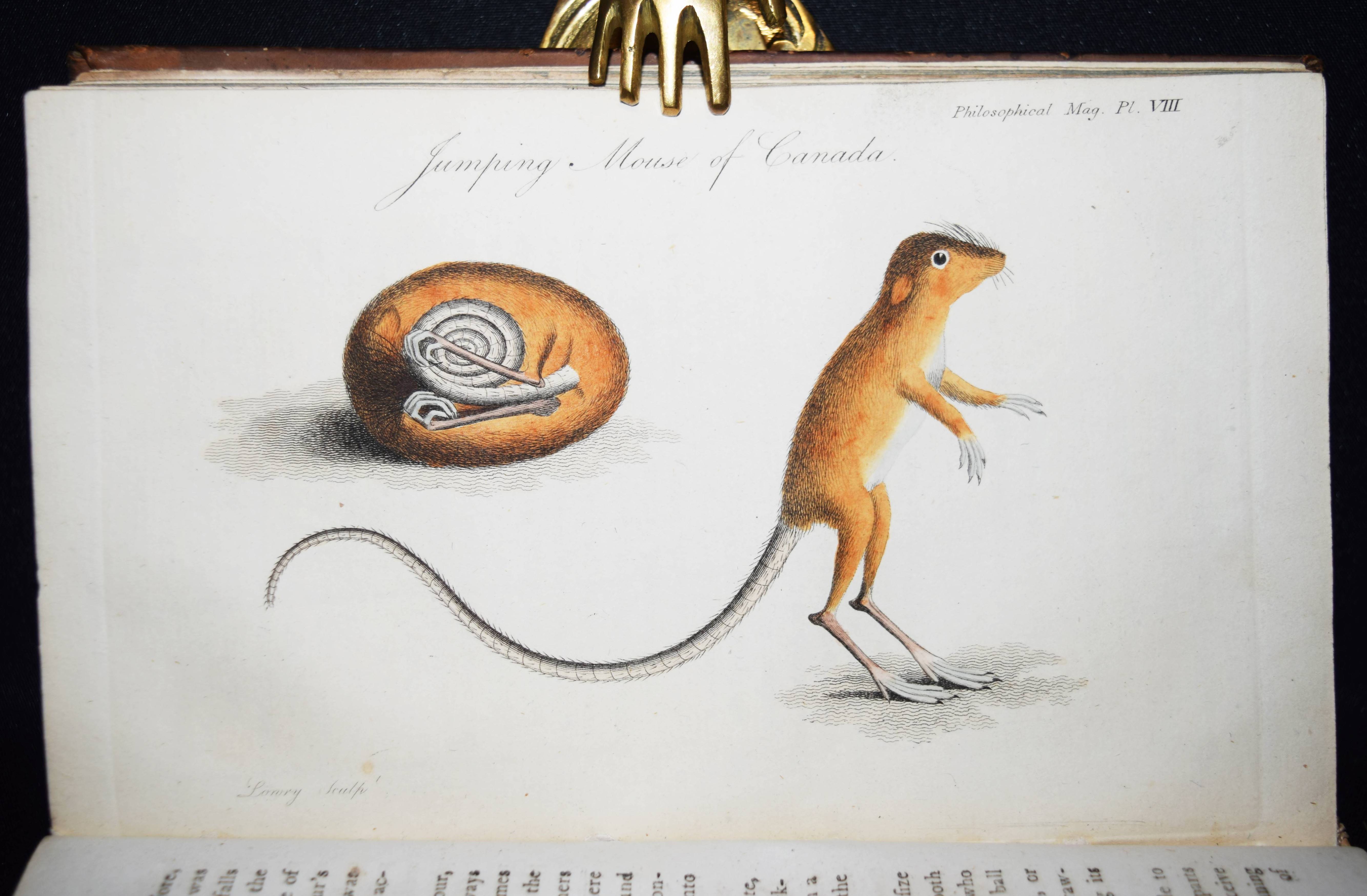 Tilloch, Alexander. Philosophical magazine. Comprehending the various branches of science, the liberal and fine arts, geology, agriculture, manufactures and commerce… Vol. I (June – September). London, Printed for the Proprietors (1798). Gr.-8° VIII, 439, (1) S. mit 13 (2 gefalt., 1 handkolorierte) Kupfertafeln. Ldr. der Zeit mit Linienvergoldung. Seltener erster Jahrgang der wichtigsten englischen naturwissenschaftlichen Zeitschrift. Mit einer wunderschönen handkolorierten Tafel, welche die Springmaus von Kanada zeigt. – „The Philosophical Magazine“ wurde 1798 von Alexander Tilloch gegründet und ist eine der am längsten in englischer Sprache erschienenen wissenschaftlichen Zeitschriften. Der vorliegend erste Jahrgang enthält u. a. Humboldts „Über die Wirkung von Sauerstoff auf die Beschleunigung der Keimung“, Schraders „Beschreibung des Mechanismus eines 26 Fuß langen Spiegelteleskops, das in der Nähe von Kiel in Holstein konstruiert wurde“, Abbé Hauys „Zur Theorie der Struktur der Kristalle“ in erster englischer Übersetzung. – Einband an Kapitalen und Gelenken leicht beschädigt, 1 Tafel etwas gelockert, sonst sehr gutes Exemplar. – With a beautifully hand-coloured plate depicting the ‚Jumping Mouse of Canada‘. – The Philosophical Magazine was founded by Alexander Tilloch in 1798 and is one of the longest-running scientific journals published in English. This is the first volume published, and contains articles on such diverse topics as Humboldt’s ‚On the Effects of Oxygen in Accelerating Germination‘, Schrader’s ‚Description of the Mechanism of a Reflecting Telescope twenty-Six Feet in Length Constructed Near Kiel in Holstein‘, Abbé Hauy’s ‚On the Theory of the Structure of Crystals‘ and many other articles on topics such as zoology, chemistry, physics and botany. – Binding slightly damaged at ends and hinges, otherwise a very good copy.