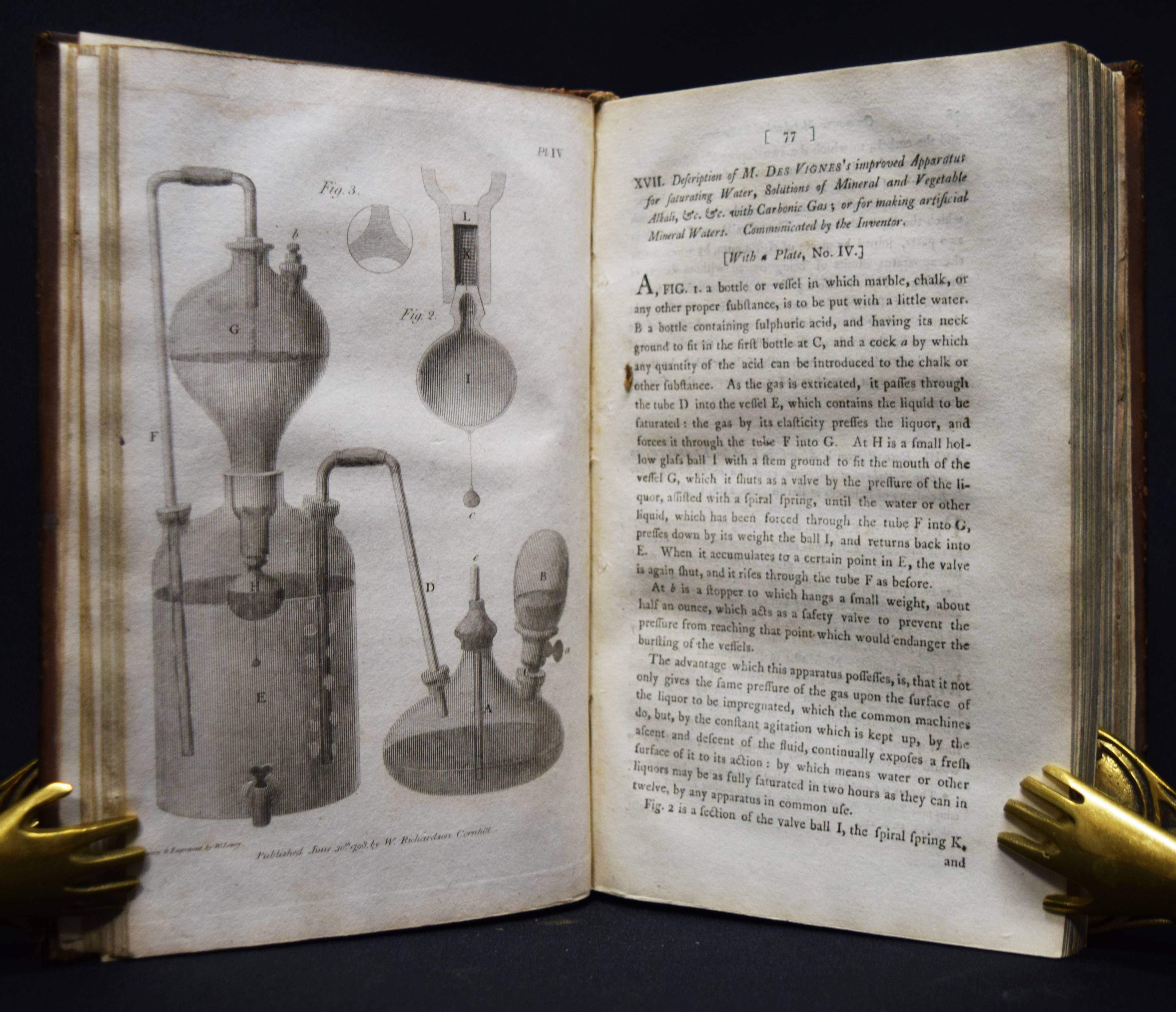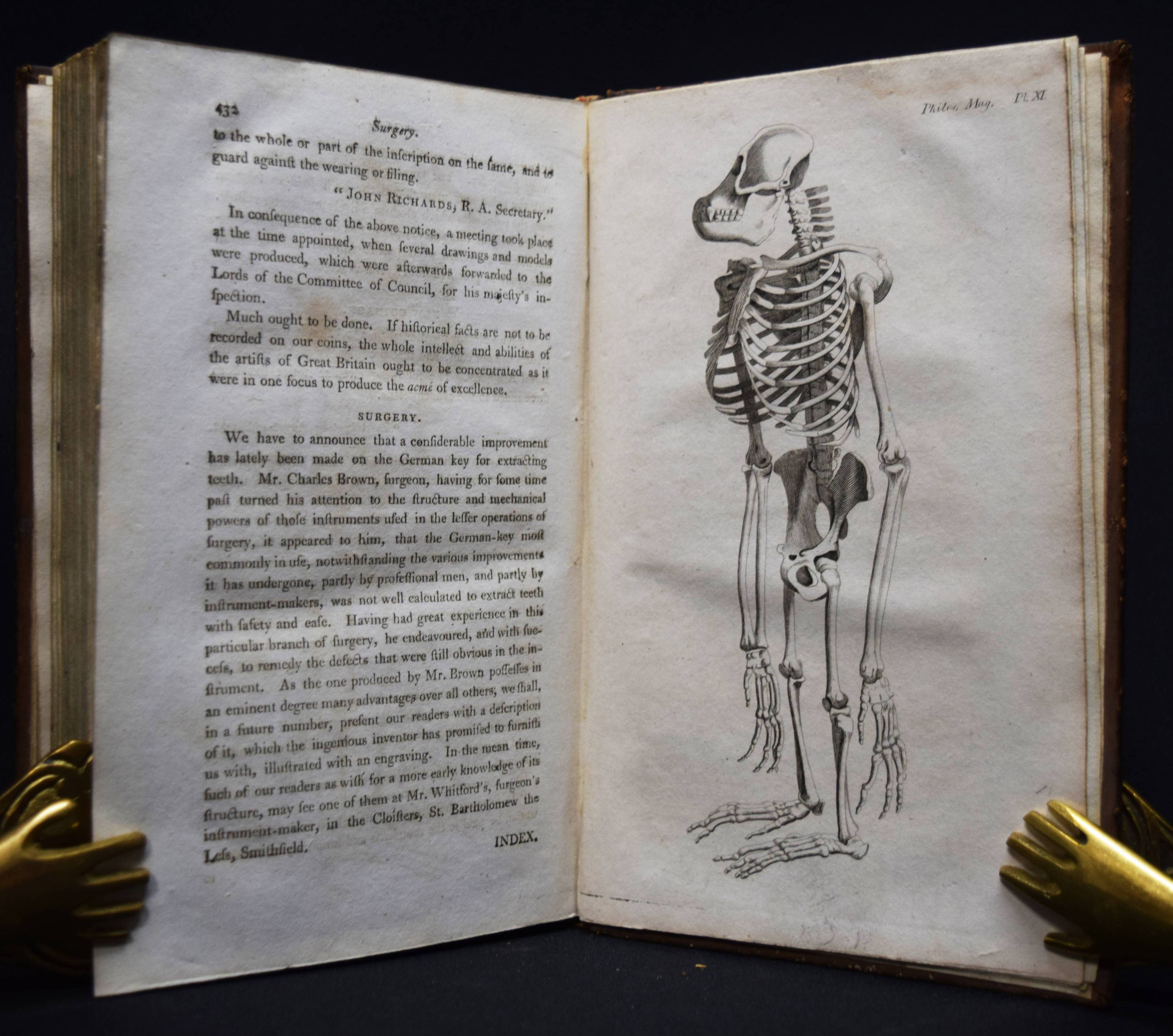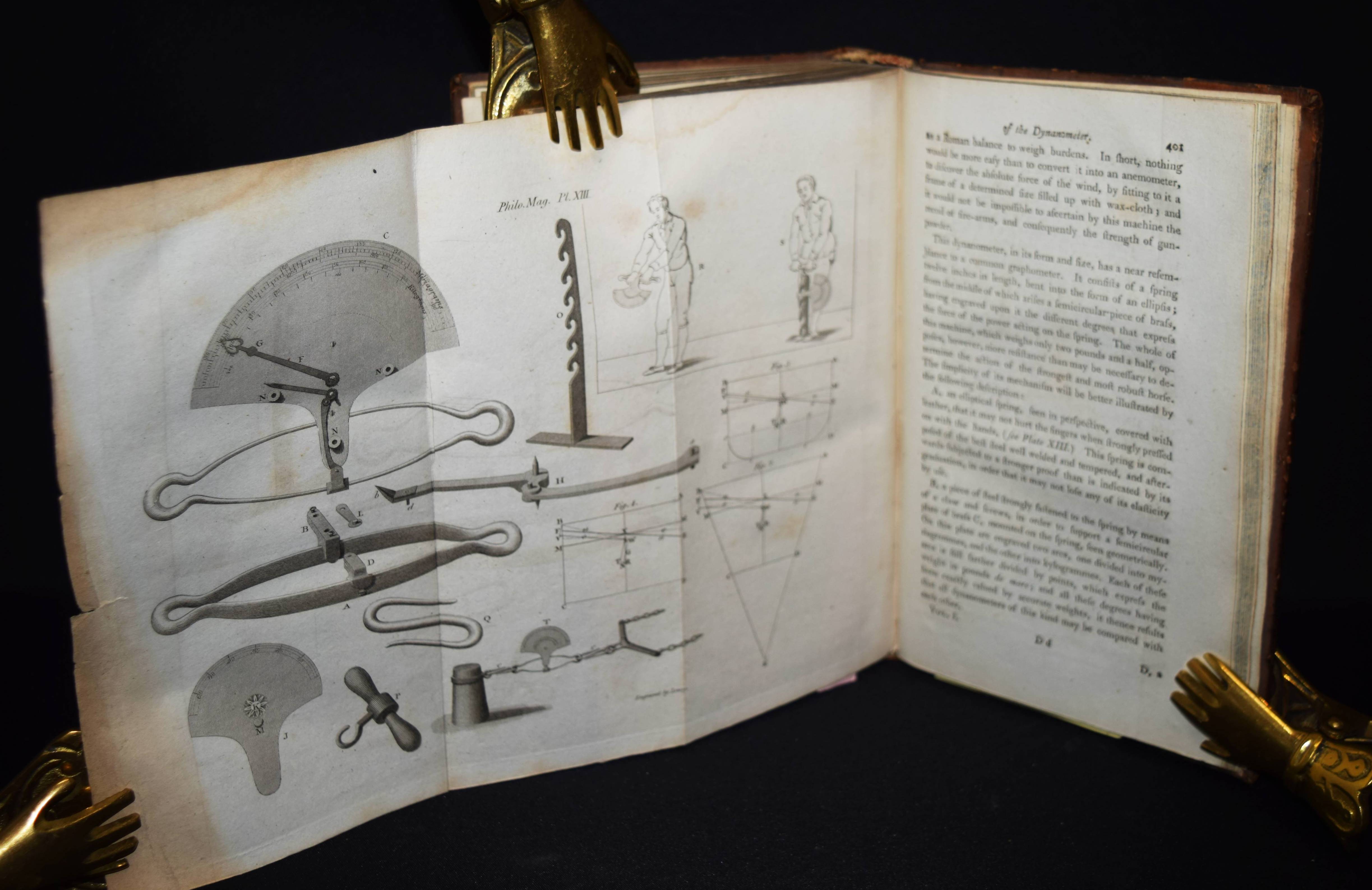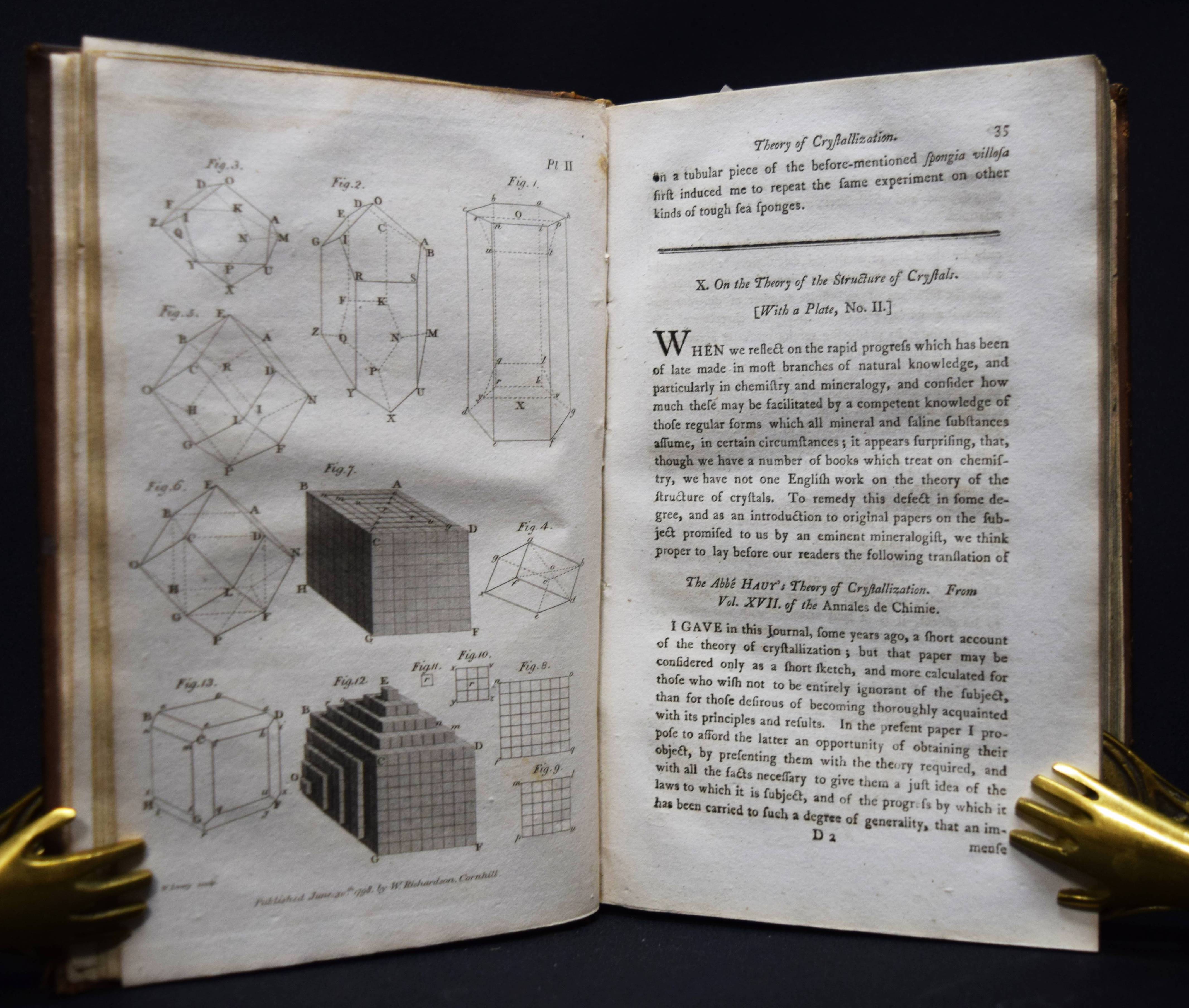 Tilloch, Alexander. Philosophical magazine. Comprehending the various branches of science, the liberal and fine arts, geology, agriculture, manufactures and commerce… Vol. I (June – September). London, Printed for the Proprietors (1798). Gr.-8° VIII, 439, (1) S. mit 13 (2 gefalt., 1 handkolorierte) Kupfertafeln. Ldr. der Zeit mit Linienvergoldung. Seltener erster Jahrgang der wichtigsten englischen naturwissenschaftlichen Zeitschrift. Mit einer wunderschönen handkolorierten Tafel, welche die Springmaus von Kanada zeigt. – „The Philosophical Magazine“ wurde 1798 von Alexander Tilloch gegründet und ist eine der am längsten in englischer Sprache erschienenen wissenschaftlichen Zeitschriften. Der vorliegend erste Jahrgang enthält u. a. Humboldts „Über die Wirkung von Sauerstoff auf die Beschleunigung der Keimung“, Schraders „Beschreibung des Mechanismus eines 26 Fuß langen Spiegelteleskops, das in der Nähe von Kiel in Holstein konstruiert wurde“, Abbé Hauys „Zur Theorie der Struktur der Kristalle“ in erster englischer Übersetzung. – Einband an Kapitalen und Gelenken leicht beschädigt, 1 Tafel etwas gelockert, sonst sehr gutes Exemplar. – With a beautifully hand-coloured plate depicting the ‚Jumping Mouse of Canada‘. – The Philosophical Magazine was founded by Alexander Tilloch in 1798 and is one of the longest-running scientific journals published in English. This is the first volume published, and contains articles on such diverse topics as Humboldt’s ‚On the Effects of Oxygen in Accelerating Germination‘, Schrader’s ‚Description of the Mechanism of a Reflecting Telescope twenty-Six Feet in Length Constructed Near Kiel in Holstein‘, Abbé Hauy’s ‚On the Theory of the Structure of Crystals‘ and many other articles on topics such as zoology, chemistry, physics and botany. – Binding slightly damaged at ends and hinges, otherwise a very good copy.