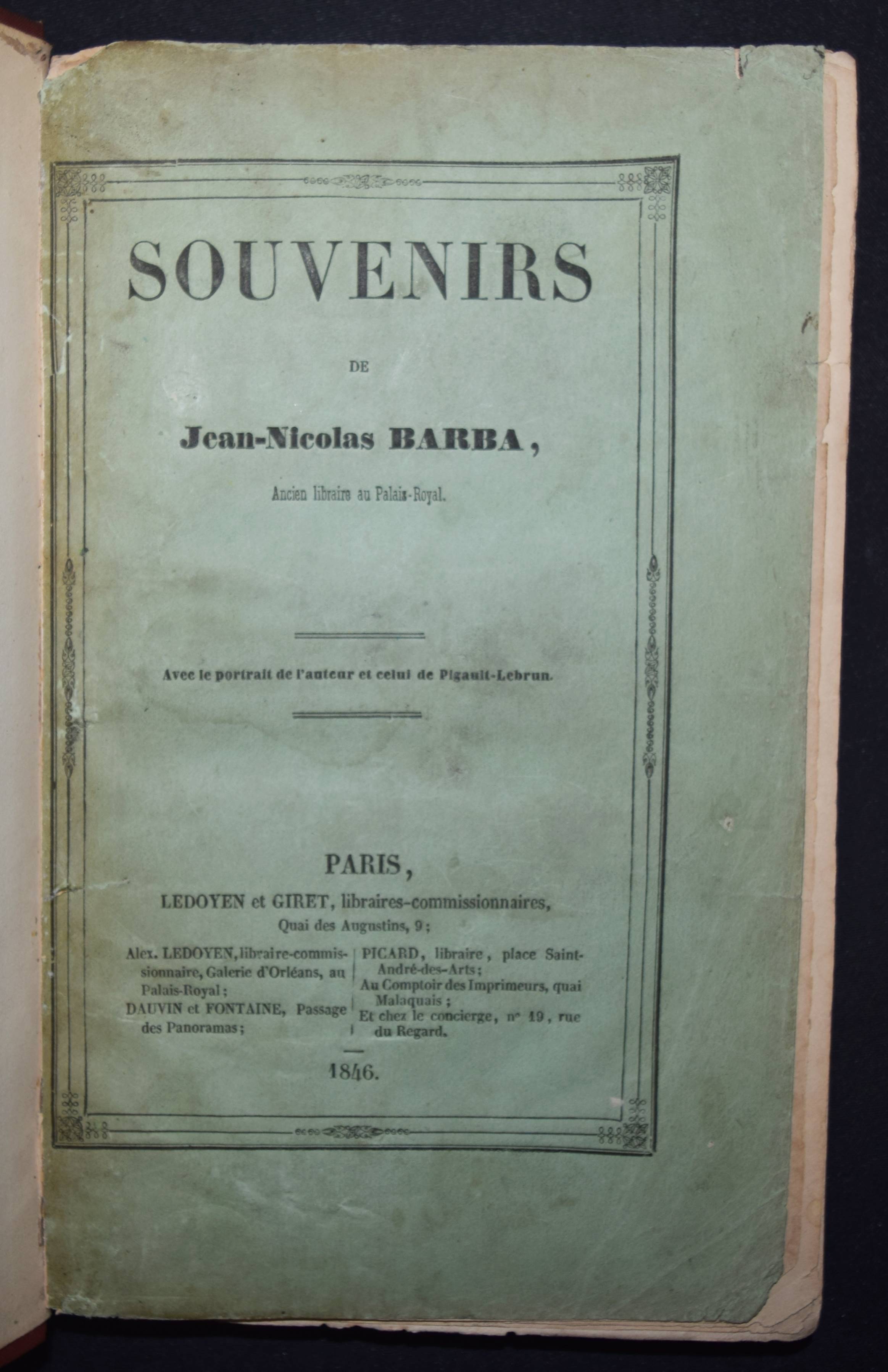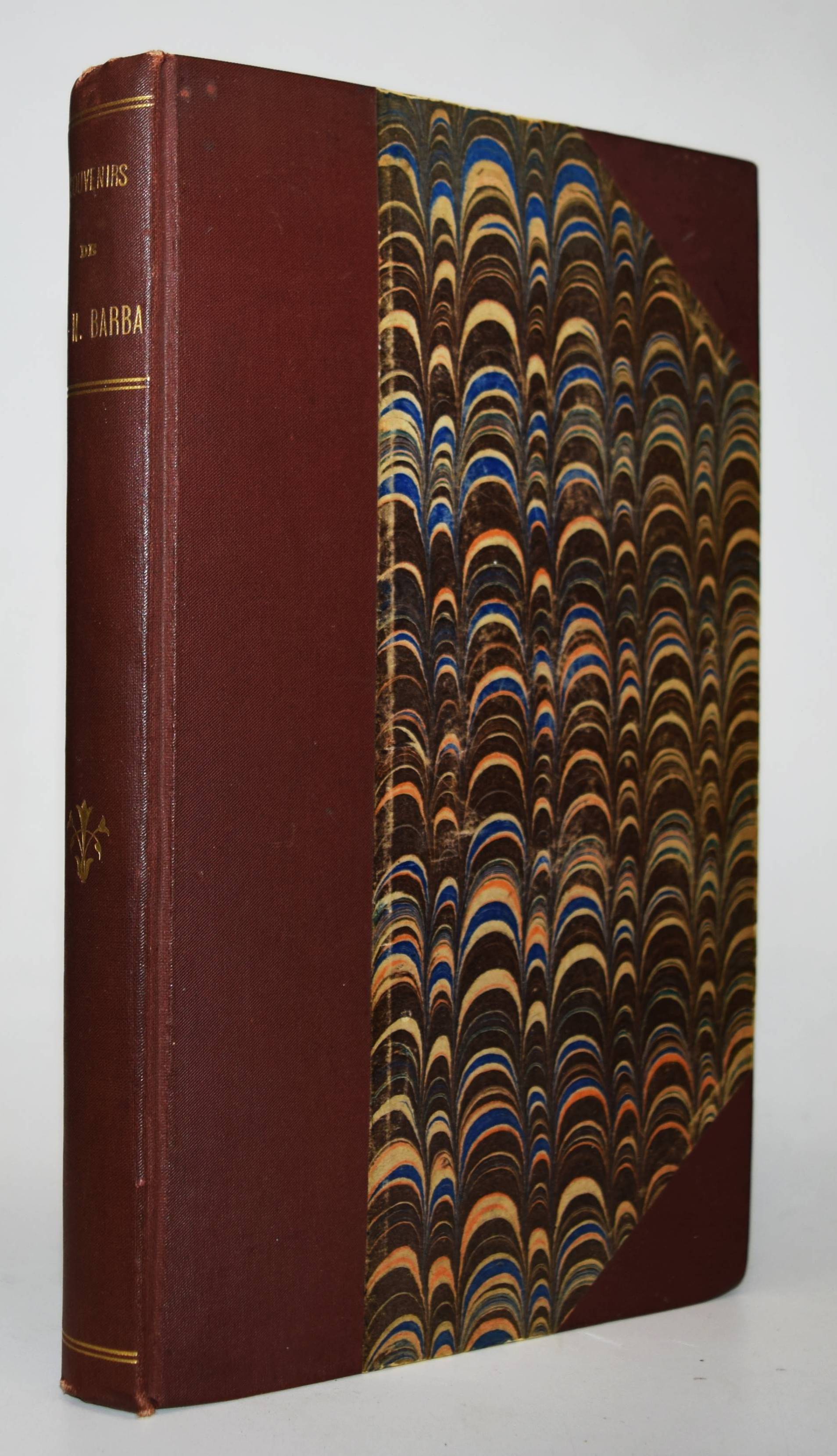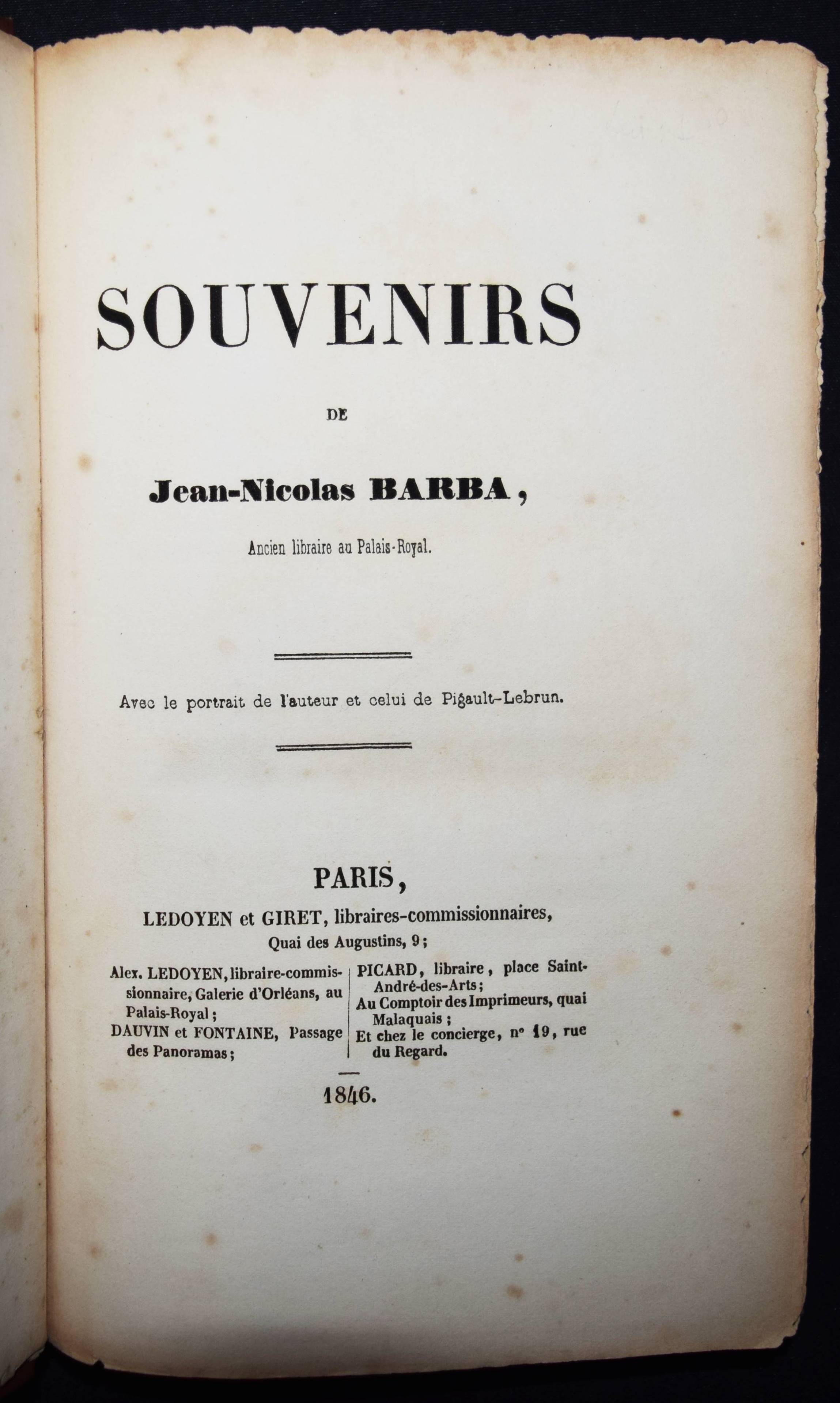 Barba, Jean-Nicolas. Souvenirs. Paris, Ledoyen et Giret 1846. 8°. 4 S. (″Liste des souscripteurs“), [2] Bl., III, 292 S. mit 2 lithogr. Portraits (Barba und Pigault-Lebrun) von Villain nach Roch. Späterer Halbleinen mit marm. Deckelbezug (typogr. Orig.-Umschlag beigebunden). Bertier 59. Quérard I, 457. – Seltene Originalausgabe der berühmten Erinnerungen des Buchhändlers, Verlegers und Druckers J.-N. Barba (1769-1846). – „En m’établissant en 1791, j’avais deux cents francs, après avoir donné cent cinquante francs pour six mois d’avance. Le Prieur [Pierre-Sébastien Le Prieur (1758-1834)] me fit crédit de cinquante francs sur cent que je lui achetais de livres, et le bon Maradan [Claude-François Maradan (1762-1823)] me fit aussi crédit de cent francs. Bance père [Jacques-Louis Bance (1761-1847)] me vendit à crédit la Vie de Marie-Antoinette pour deux mille francs. Je fis en tremblant vingt billets à ordre, et je réussis. […] Puis vint mon père nourricier, Pigault-Lebrun, le Cuisinier royal avec lequel j’ai gagné cent mille francs. J’ai imprimé sept millions d’exemplaires de pièces de théâtre ; je ne réussissais pas toujours. […] Quant aux livres, je réussissais presque toujours, jusqu’aux Œuvres d’Alex. Duval.“ (p. 175-176). – Titelblatt und Frontispiz etwas gelockert, Papier durchgehend etwas gebräunt, stellenweise leicht braunfl., gutes Exemplar mit der meist fehlenden Subskriptions-Liste. – Page de titre et les portraits un peu relâchés, papier un peu bruni sur toute la longueur, quelques rousseurs par endroits, bon exemplaire avec la liste des souscriptions qui manque généralement.