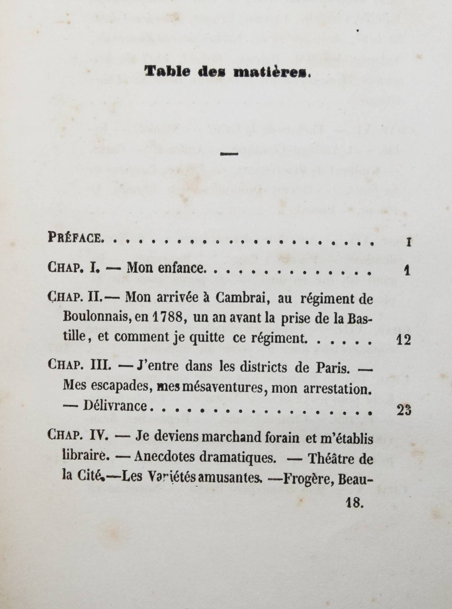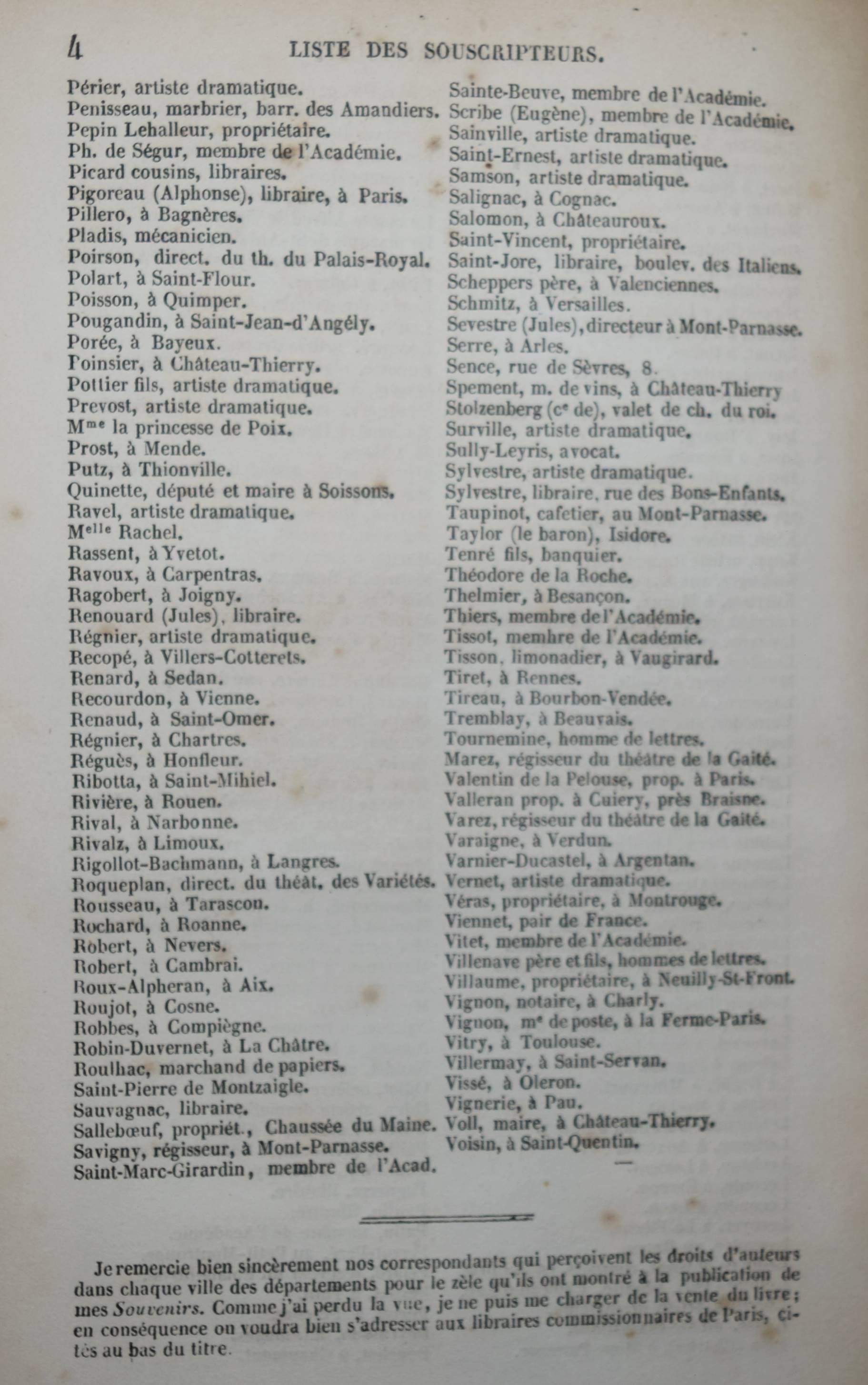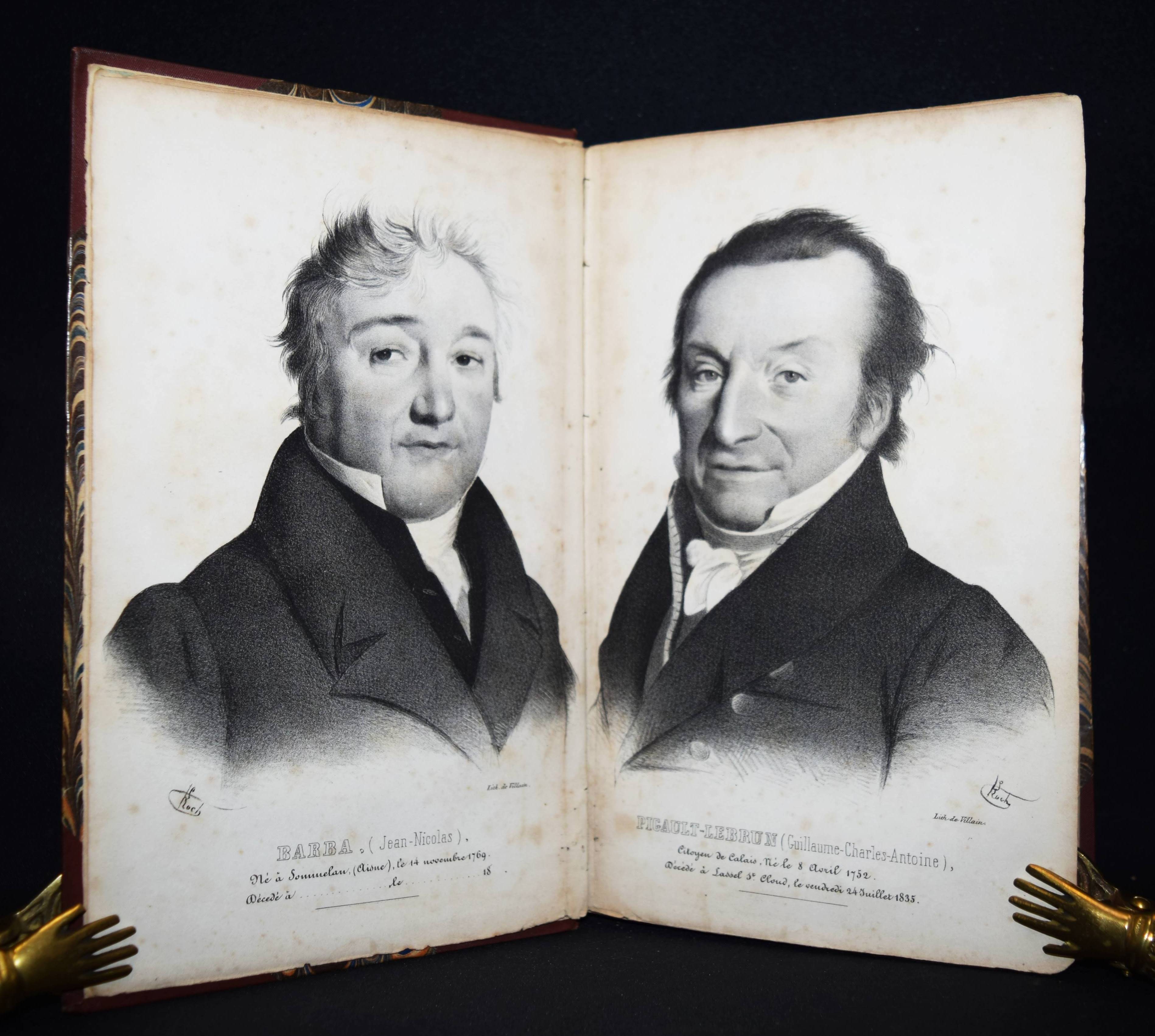 Barba, Jean-Nicolas. Souvenirs. Paris, Ledoyen et Giret 1846. 8°. 4 S. (″Liste des souscripteurs“), [2] Bl., III, 292 S. mit 2 lithogr. Portraits (Barba und Pigault-Lebrun) von Villain nach Roch. Späterer Halbleinen mit marm. Deckelbezug (typogr. Orig.-Umschlag beigebunden). Bertier 59. Quérard I, 457. – Seltene Originalausgabe der berühmten Erinnerungen des Buchhändlers, Verlegers und Druckers J.-N. Barba (1769-1846). – „En m’établissant en 1791, j’avais deux cents francs, après avoir donné cent cinquante francs pour six mois d’avance. Le Prieur [Pierre-Sébastien Le Prieur (1758-1834)] me fit crédit de cinquante francs sur cent que je lui achetais de livres, et le bon Maradan [Claude-François Maradan (1762-1823)] me fit aussi crédit de cent francs. Bance père [Jacques-Louis Bance (1761-1847)] me vendit à crédit la Vie de Marie-Antoinette pour deux mille francs. Je fis en tremblant vingt billets à ordre, et je réussis. […] Puis vint mon père nourricier, Pigault-Lebrun, le Cuisinier royal avec lequel j’ai gagné cent mille francs. J’ai imprimé sept millions d’exemplaires de pièces de théâtre ; je ne réussissais pas toujours. […] Quant aux livres, je réussissais presque toujours, jusqu’aux Œuvres d’Alex. Duval.“ (p. 175-176). – Titelblatt und Frontispiz etwas gelockert, Papier durchgehend etwas gebräunt, stellenweise leicht braunfl., gutes Exemplar mit der meist fehlenden Subskriptions-Liste. – Page de titre et les portraits un peu relâchés, papier un peu bruni sur toute la longueur, quelques rousseurs par endroits, bon exemplaire avec la liste des souscriptions qui manque généralement.