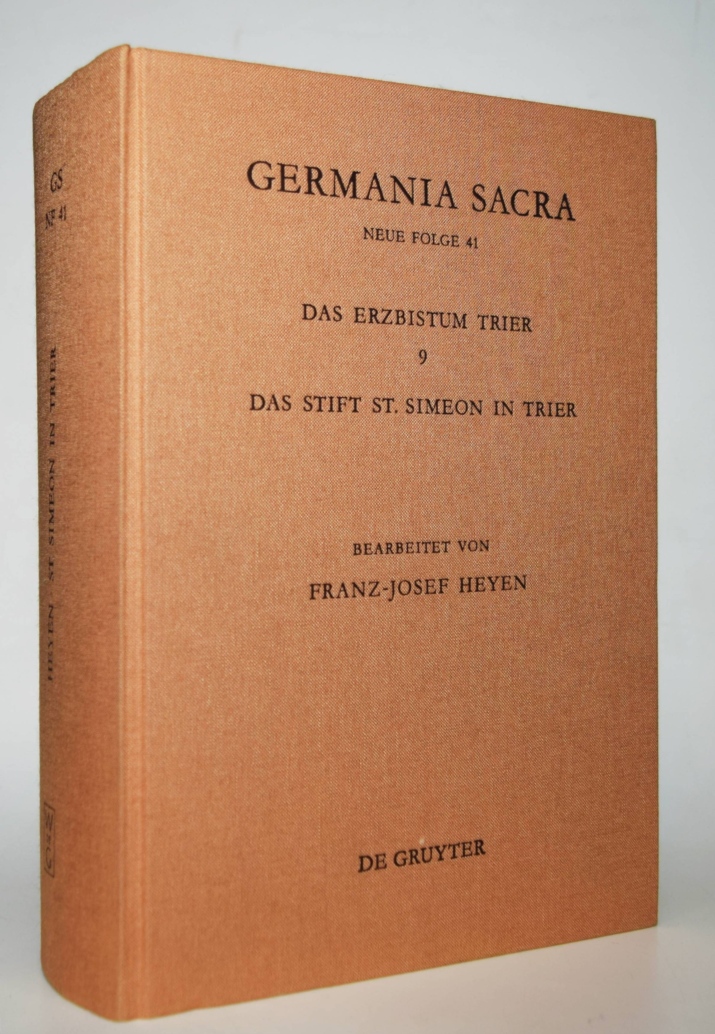 Heyen, Franz-Josef. Das Stift St. Simeon in Trier. Berlin, u. a., de Gruyter 2002. 4°. XX, 1100 S. mit zahlr. Abb. u. 5 gefalt. Karten. Orig.-Leinenband. (Das Erzbistum Trier, Band 9). Sehr gutes, neuwertiges Exemplar.