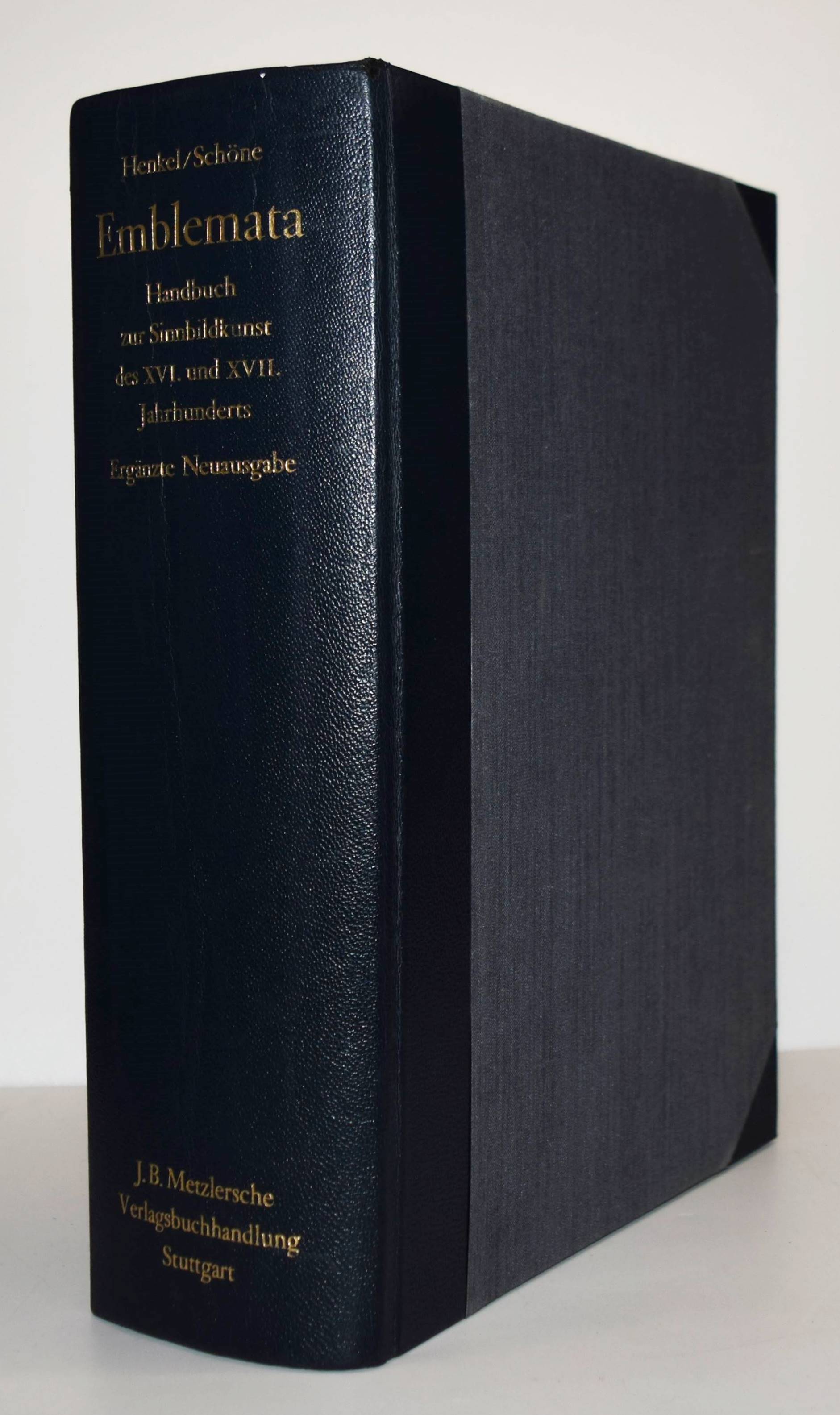 Henkel, Arthur u. Albrecht Schöne (Hg.). Emblemata. Handbuch zur Sinnbildkunst des XVI. und XVII. Jahrhunderts. Ergänzte Neuausgabe. Stuttgart, Metzler 1976. Gr.-4°. CCXVII S., 2196 Sp. mit zahlr. Abb. Orig.-Halblederband mit goldgepr. Rückentitel. Vorsätze mit einigen privaten Eintragungen, gutes Exemplar der schönen Halbleder-Ausgabe.