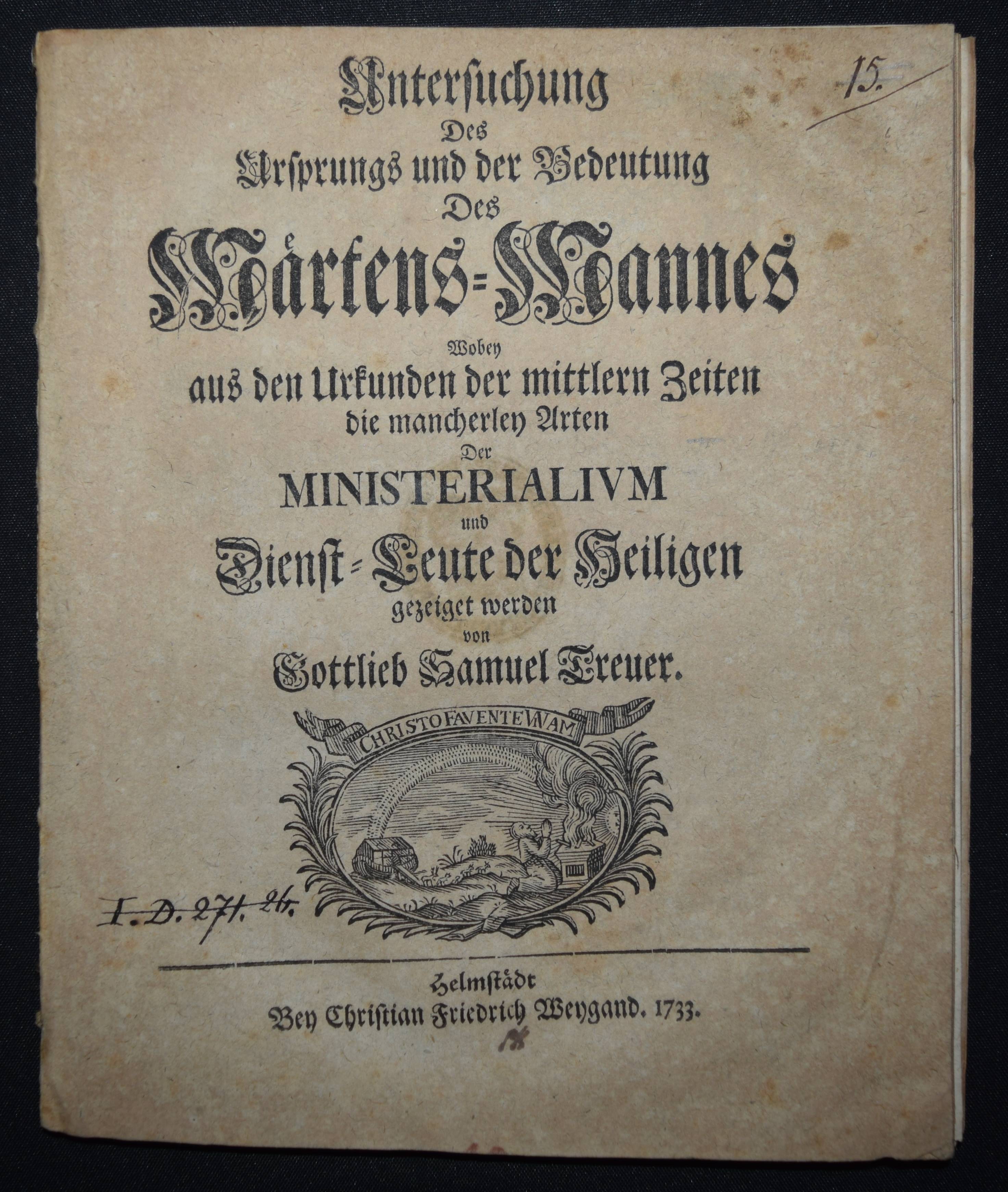 Treuer, Gottlieb Samuel. Untersuchung des Ursprungs und der Bedeutung des Märtens-Mannes. Wobey aus den Urkunden der mittlern Zeiten die mancherley Arten der Ministerialivm und Dienst-Leute der Heiligen gezeiget werden. Helmstädt, Christian Friedrich Weygand 1733. Gr.-8°. 94 S. Ohne Einband (ausgebunden). ADB XXXVIII, 582 f. VD18 14748185. – Einzige Ausgabe, selten. – „Der Brauch der Reise des Martensmannes wird erstmals 1520 erwähnt. Es wurde alljährlich im November zum Martinstag von Lübeck aus den Mecklenburger Fürsten ein Fass Rotwein (Rotspon) nach Schwerin gesandt. Die Pflicht dazu geht zurück auf die Lübecker Fehde und die Bedingungen zu deren Friedensschluss. Demnach mussten die Städte Lübeck und Lüneburg an den Herzog von Mecklenburg einen jährlichen Betrag von 500 Gulden entrichten. In diesem Zusammenhang findet der Martensmann erstmalig Erwähnung. Der Brauch verbindet Elemente des am Martinstag traditionell gezahlten Zehnts mit dem Heischebrauch der Kinder entlang der Wegstrecke, besonders in Rehna. Der Weg führt den Lübecker Boten über Schönberg am 9. November nach Rehna, wo der Martensmann die Nacht in einer Herberge verbringt. Diese Herberge ist über eine lange Zeit das Deutsche Haus gewesen. 1758 erhoben die Rehnschen Jungs ihre Forderung nach Nüssen und Geld so energisch, dass sie dem Martensmann die Fenster mit Erdklößen und Steinen teilweise einwarfen. Am nächsten Morgen fährt der Martensmann weiter nach Schwerin, wo er am Abend des 10. November eintrifft und dem Herzog am 11. November gegen Mittag das Fass Wein überreicht. Der Brauch erlosch 1817. 1991 wurde er im Rahmen der Wiedervereinigung auf Initiative des damaligen Ministerpräsidenten von Schleswig-Holstein, Björn Engholm, neu aufgenommen. Die Ankunft des Lübecker Boten wird in Rehna als Volksfest begangen. Seit dem Jahr 2020 ist der Brauch immaterielles Kulturerbe der UNESCO“ (Wikipedia). – Der Historiker und Jurist G. S. Treuer (1683-1743) war seit 1712 Professor in Helmstedt und später in Göttingen. „Seine wissenschaftliche Thätigkeit ist sehr vielseitig, die Zahl seiner Schriften, die sich in den Göttinger Zeitungen von gelehrten Sachen, 1743, S. 180—84 und an den unten angegebenen Stellen verzeichnet finden, sehr bedeutend“ (P. Zimmermann in ADB). – Ohne das gestoch. Frontispiz (wie bei beiden digtalisierten Exemplaren in der Bayerischen Staatsbibliothek), durchgehend etwas gebräunt, aus einem Sammelband mit Dissertationen entnommen.