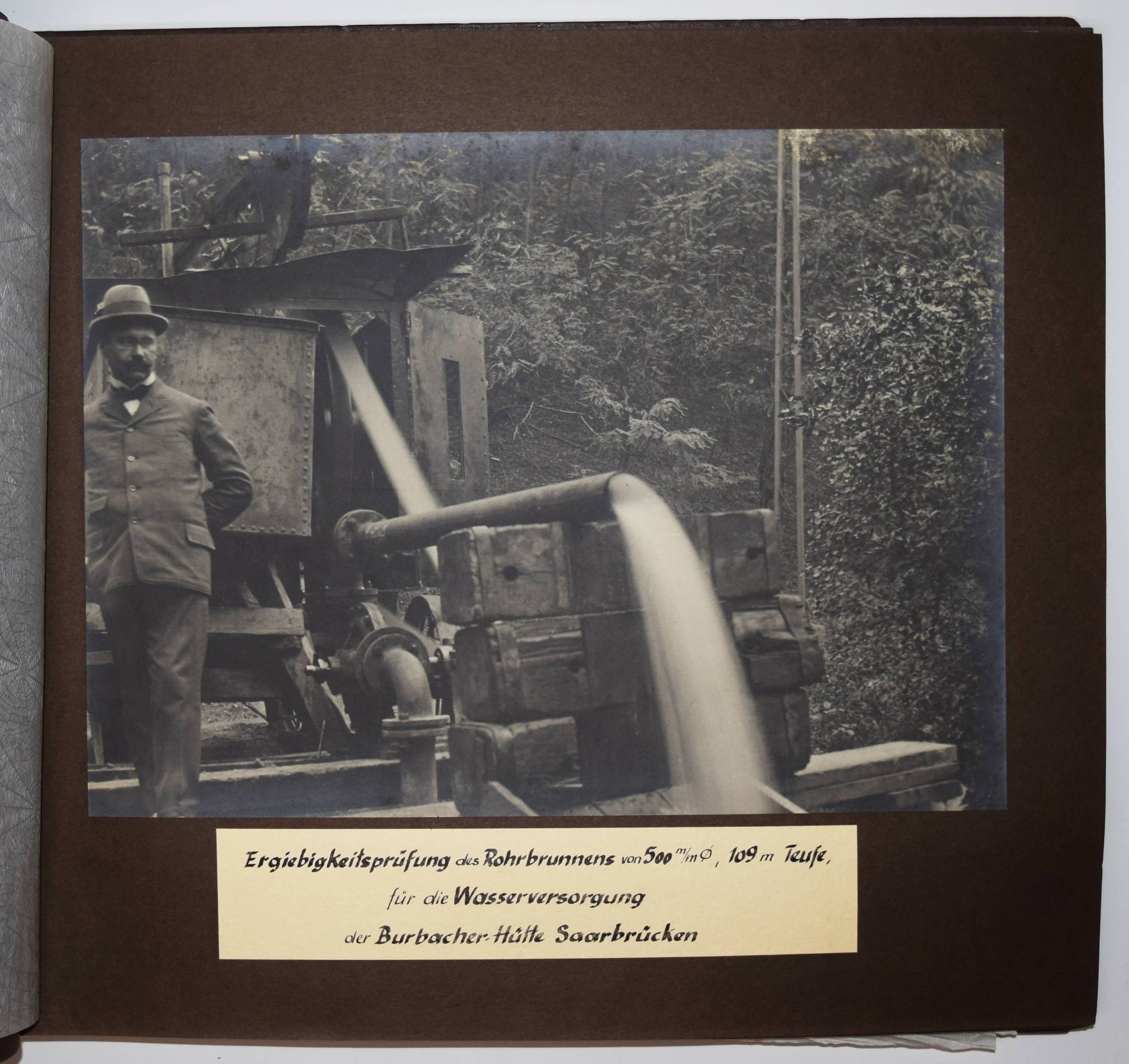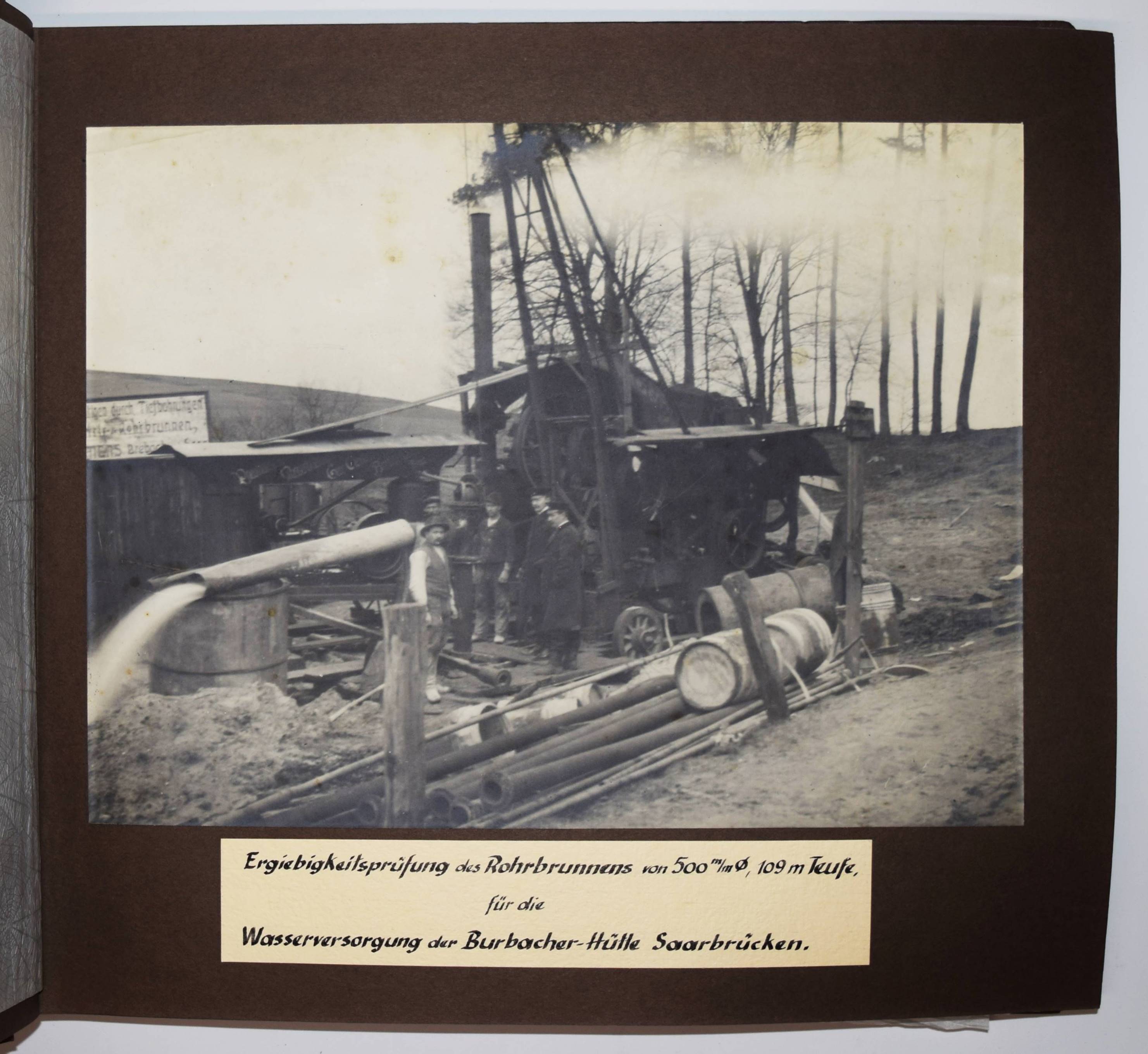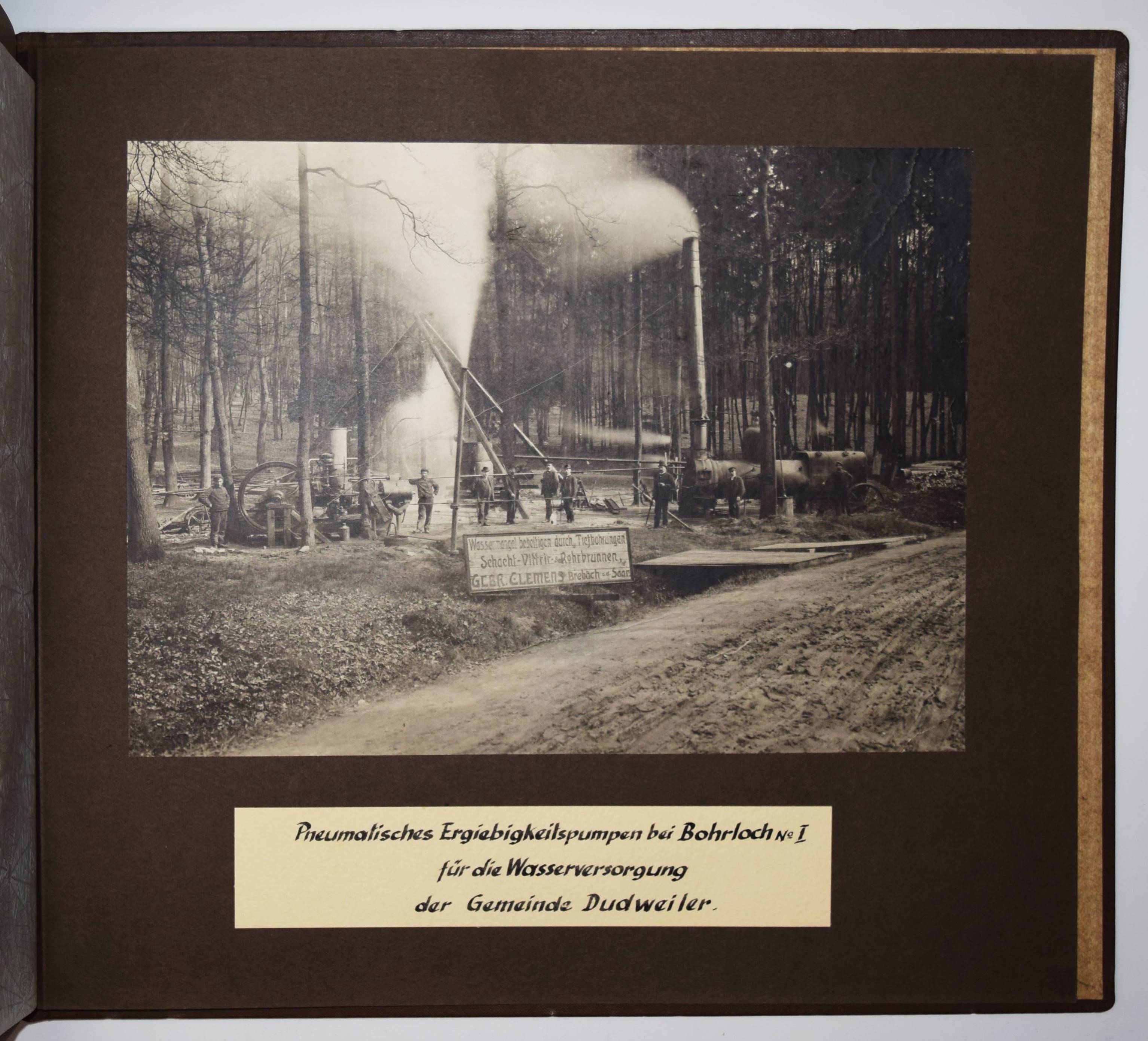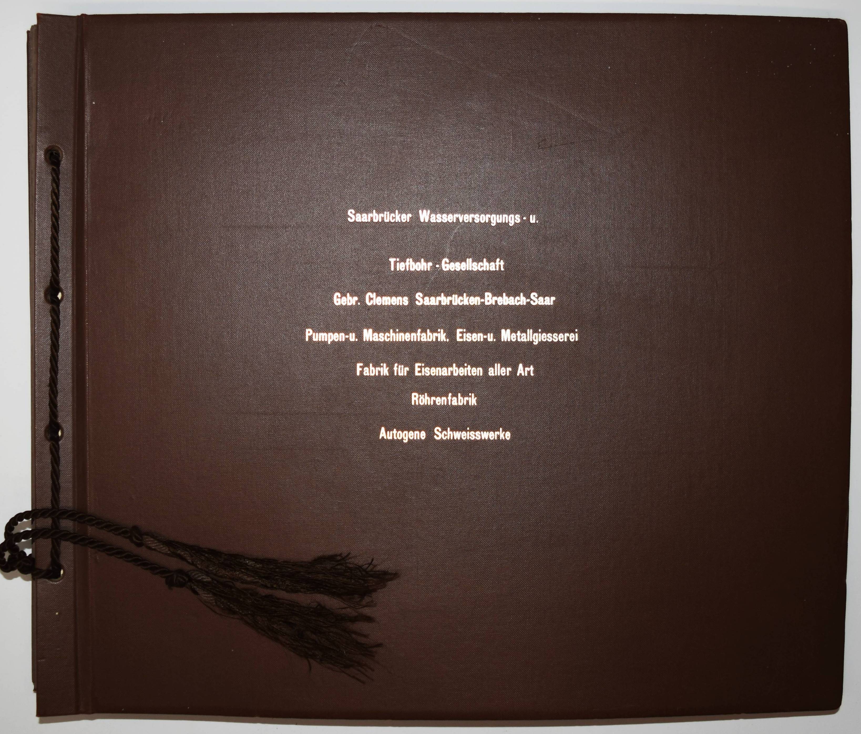 Gebr. L. & Th. Clemens. Saarbrücker Wasserversorgungs- u. Tiefbohr-Gesellschaft. Pumpen- u. Maschinenfabrik, Eisen- u. Metallgieserei. Fabrik für Eisenarbeiten aller Art. Röhrenfabrik. Autogene Schweisswerke. Saarbrücken-Brebach o. J. (um 1910). Quer-Folio (51 x 44 cm.). [57] Bl. mit 54 mont. Orig.-Photographien (Albuminabzüge, ca. 38 x 24 bis 39 x 30 cm.) u. 3 mont. Profil- und Situationspläne (Bodenbeschaffenheit). OLn. mit goldgepr. Deckeltitel u. Kordelheftung. Eindrucksvolle monumentale Dokumentation des Saarbrücker Tiefbohr-Unternehmens. – Die großformatigen Aufnahmen dokumentieren Bohrungen für Brunnen und Wasserleitungen in Straßburg (Bahnhof Hargarten), bei der Burbacher Hütte, Saarbrücken (Wasserwerk), Münster (Solbad), Malstadt, Saarunion, Neunkirchen, Trier, Dudweiler, St. Wendel, Bad Kreuznach, St. Avold (Lothringen) und Navarra (Spanien). – Sehr gut erhalten.