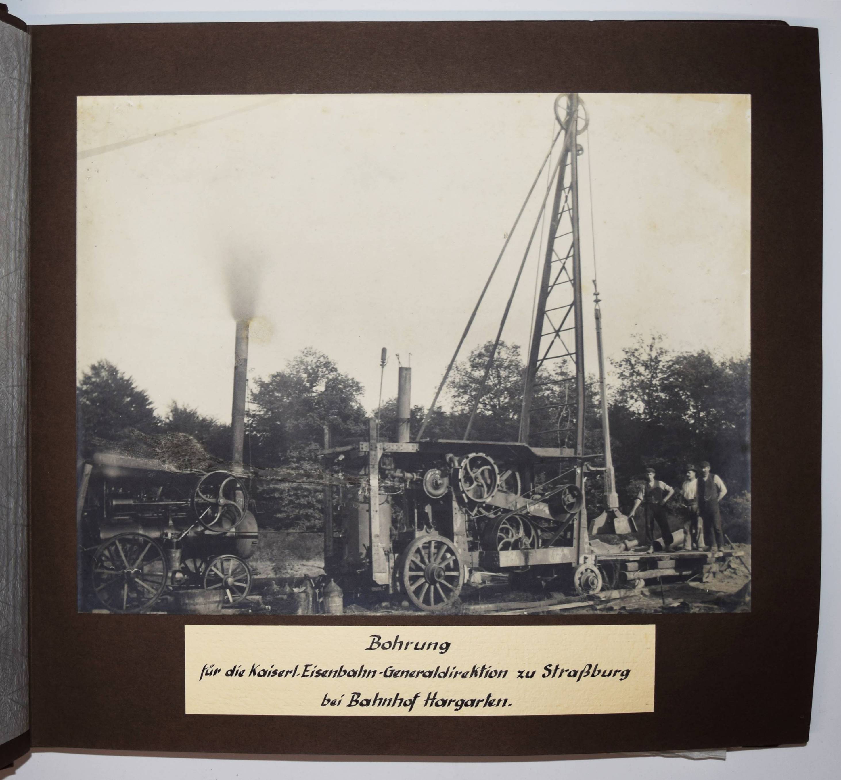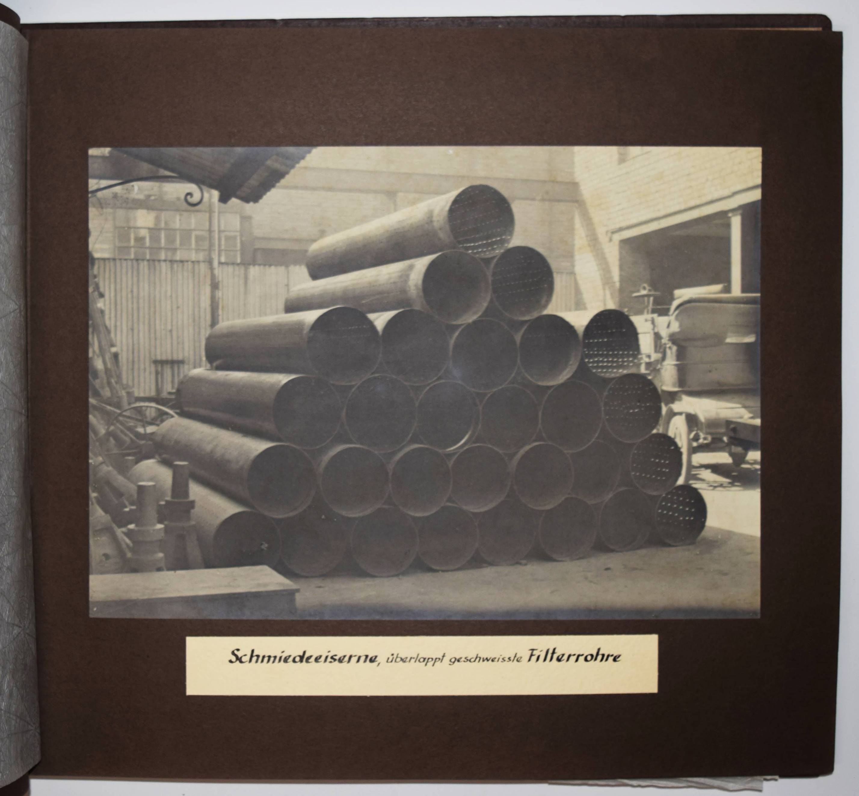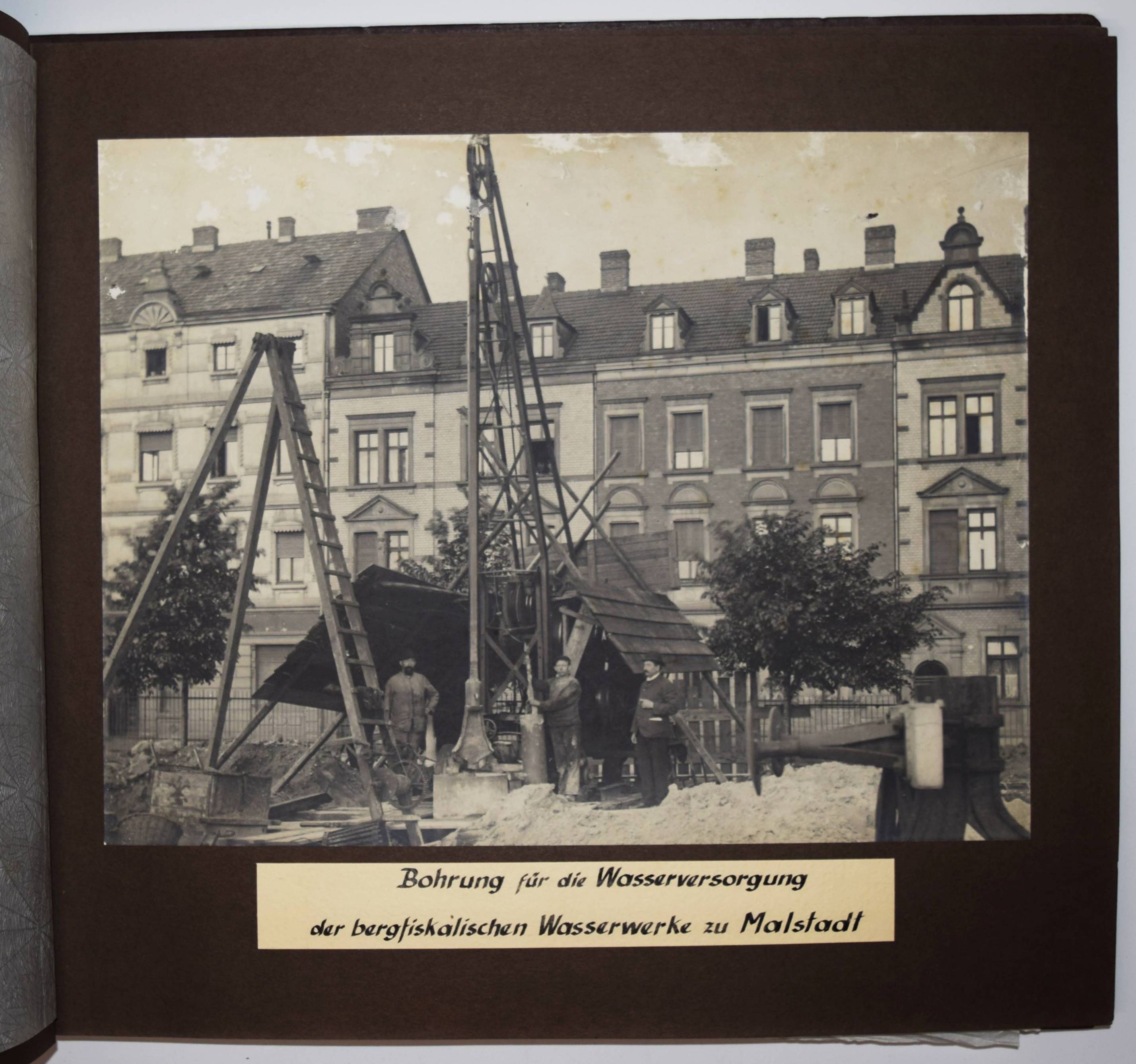 Gebr. L. & Th. Clemens. Saarbrücker Wasserversorgungs- u. Tiefbohr-Gesellschaft. Pumpen- u. Maschinenfabrik, Eisen- u. Metallgieserei. Fabrik für Eisenarbeiten aller Art. Röhrenfabrik. Autogene Schweisswerke. Saarbrücken-Brebach o. J. (um 1910). Quer-Folio (51 x 44 cm.). [57] Bl. mit 54 mont. Orig.-Photographien (Albuminabzüge, ca. 38 x 24 bis 39 x 30 cm.) u. 3 mont. Profil- und Situationspläne (Bodenbeschaffenheit). OLn. mit goldgepr. Deckeltitel u. Kordelheftung. Eindrucksvolle monumentale Dokumentation des Saarbrücker Tiefbohr-Unternehmens. – Die großformatigen Aufnahmen dokumentieren Bohrungen für Brunnen und Wasserleitungen in Straßburg (Bahnhof Hargarten), bei der Burbacher Hütte, Saarbrücken (Wasserwerk), Münster (Solbad), Malstadt, Saarunion, Neunkirchen, Trier, Dudweiler, St. Wendel, Bad Kreuznach, St. Avold (Lothringen) und Navarra (Spanien). – Sehr gut erhalten.