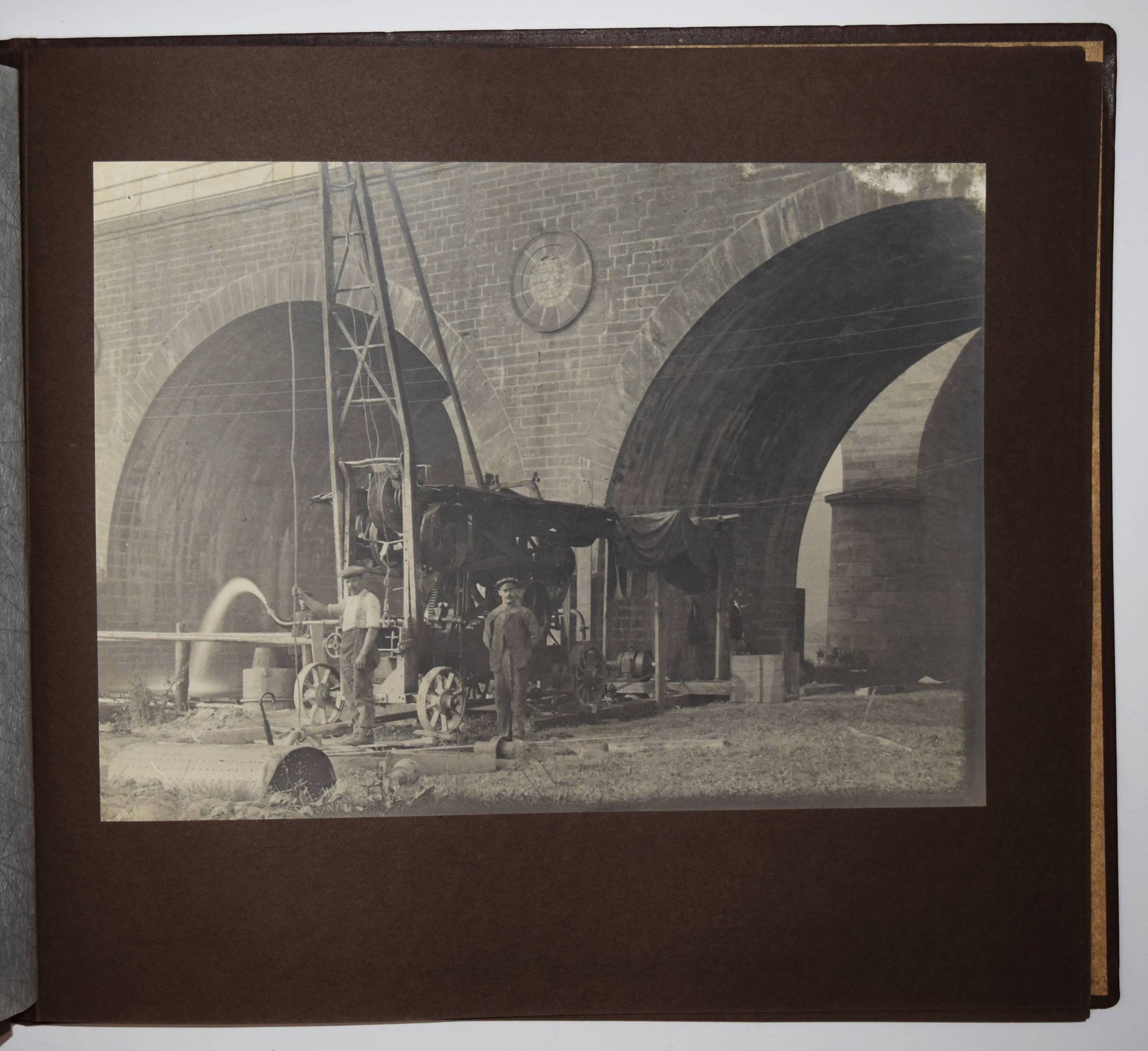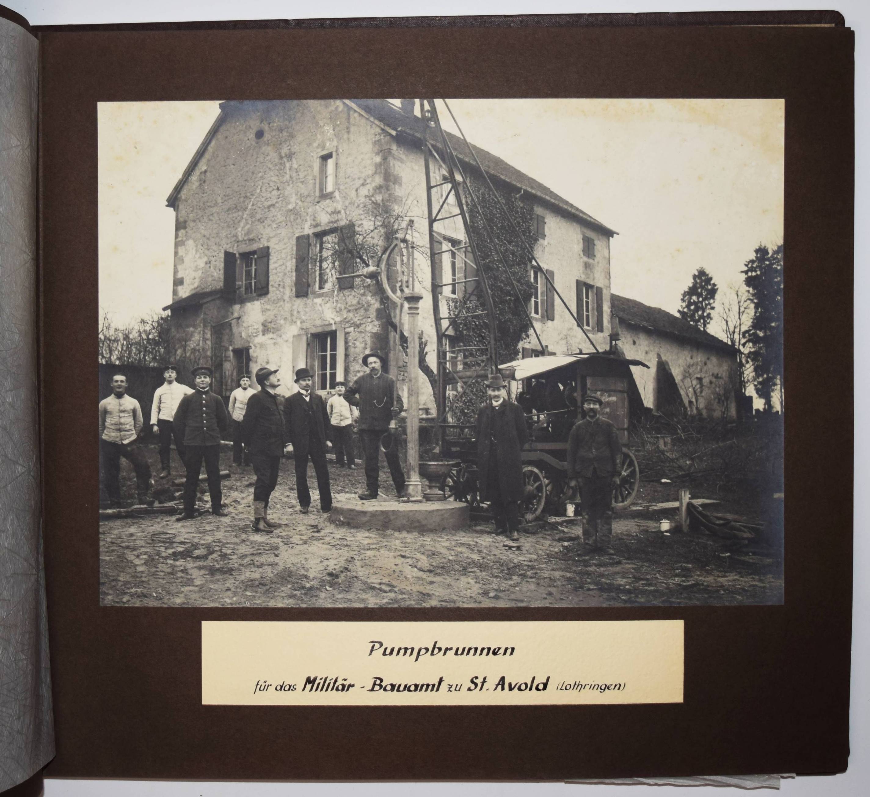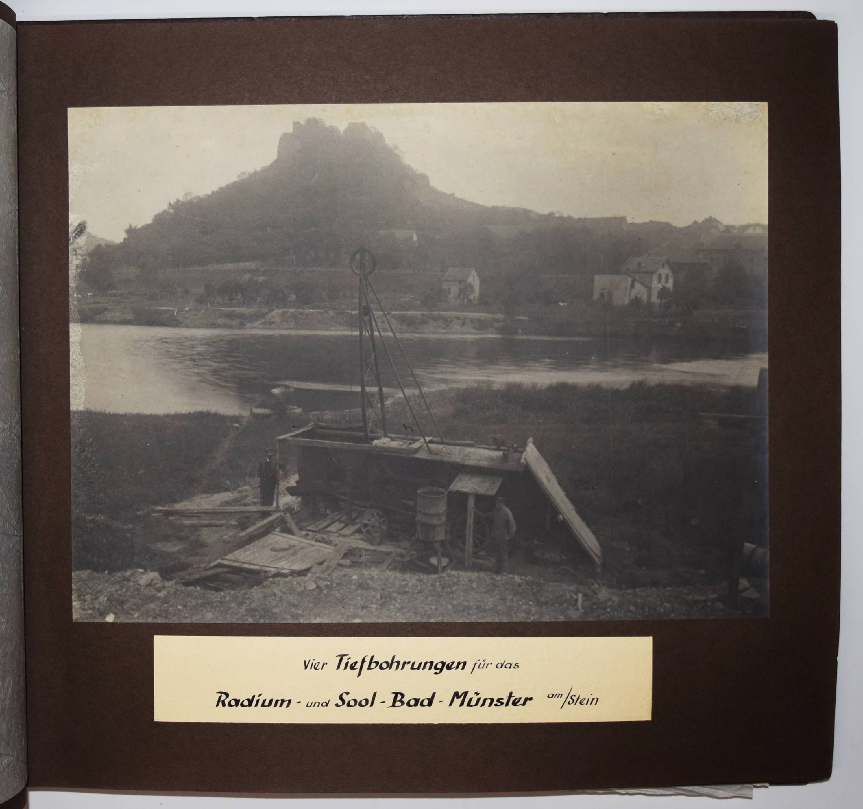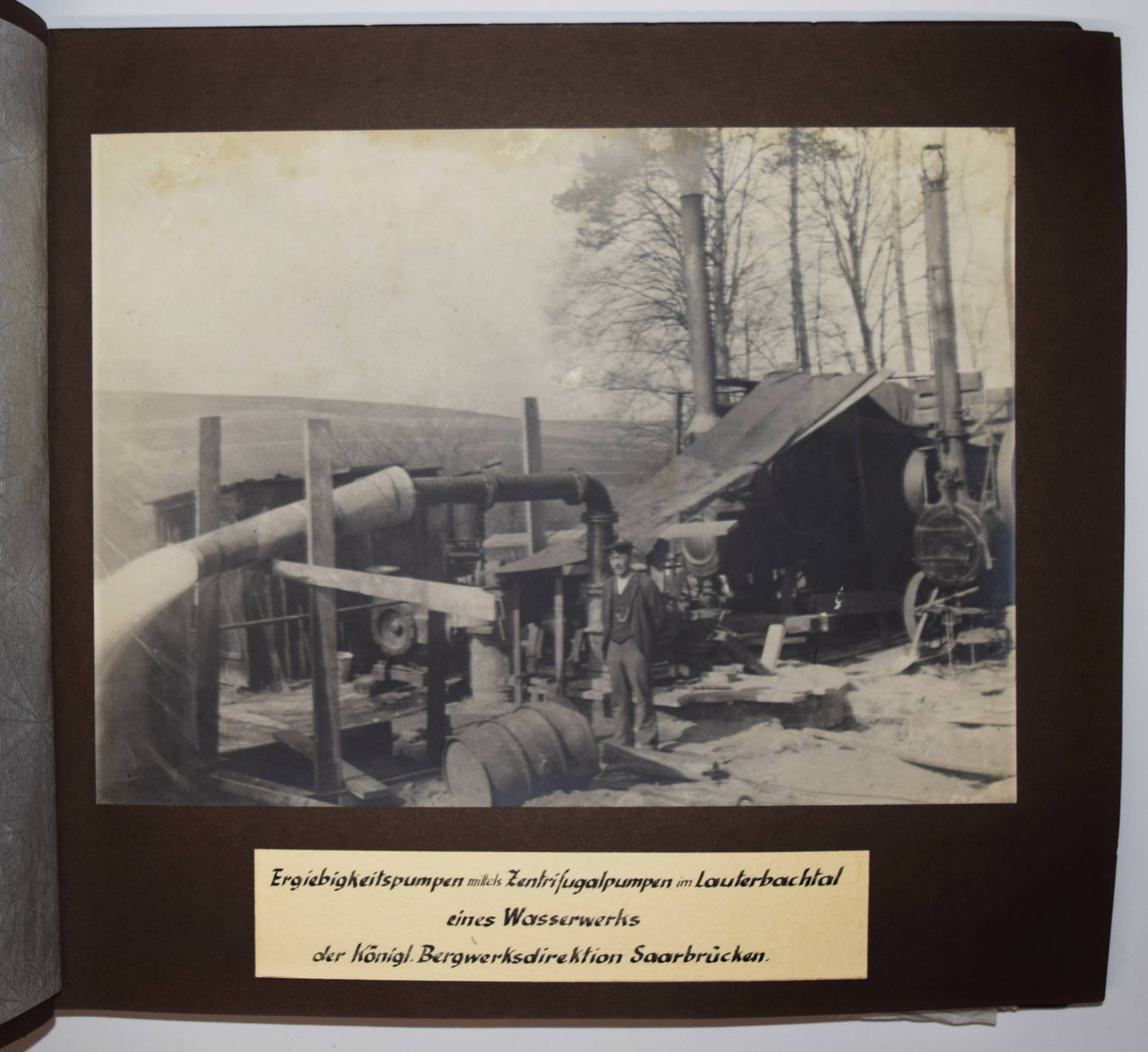 Gebr. L. & Th. Clemens. Saarbrücker Wasserversorgungs- u. Tiefbohr-Gesellschaft. Pumpen- u. Maschinenfabrik, Eisen- u. Metallgieserei. Fabrik für Eisenarbeiten aller Art. Röhrenfabrik. Autogene Schweisswerke. Saarbrücken-Brebach o. J. (um 1910). Quer-Folio (51 x 44 cm.). [57] Bl. mit 54 mont. Orig.-Photographien (Albuminabzüge, ca. 38 x 24 bis 39 x 30 cm.) u. 3 mont. Profil- und Situationspläne (Bodenbeschaffenheit). OLn. mit goldgepr. Deckeltitel u. Kordelheftung. Eindrucksvolle monumentale Dokumentation des Saarbrücker Tiefbohr-Unternehmens. – Die großformatigen Aufnahmen dokumentieren Bohrungen für Brunnen und Wasserleitungen in Straßburg (Bahnhof Hargarten), bei der Burbacher Hütte, Saarbrücken (Wasserwerk), Münster (Solbad), Malstadt, Saarunion, Neunkirchen, Trier, Dudweiler, St. Wendel, Bad Kreuznach, St. Avold (Lothringen) und Navarra (Spanien). – Sehr gut erhalten.