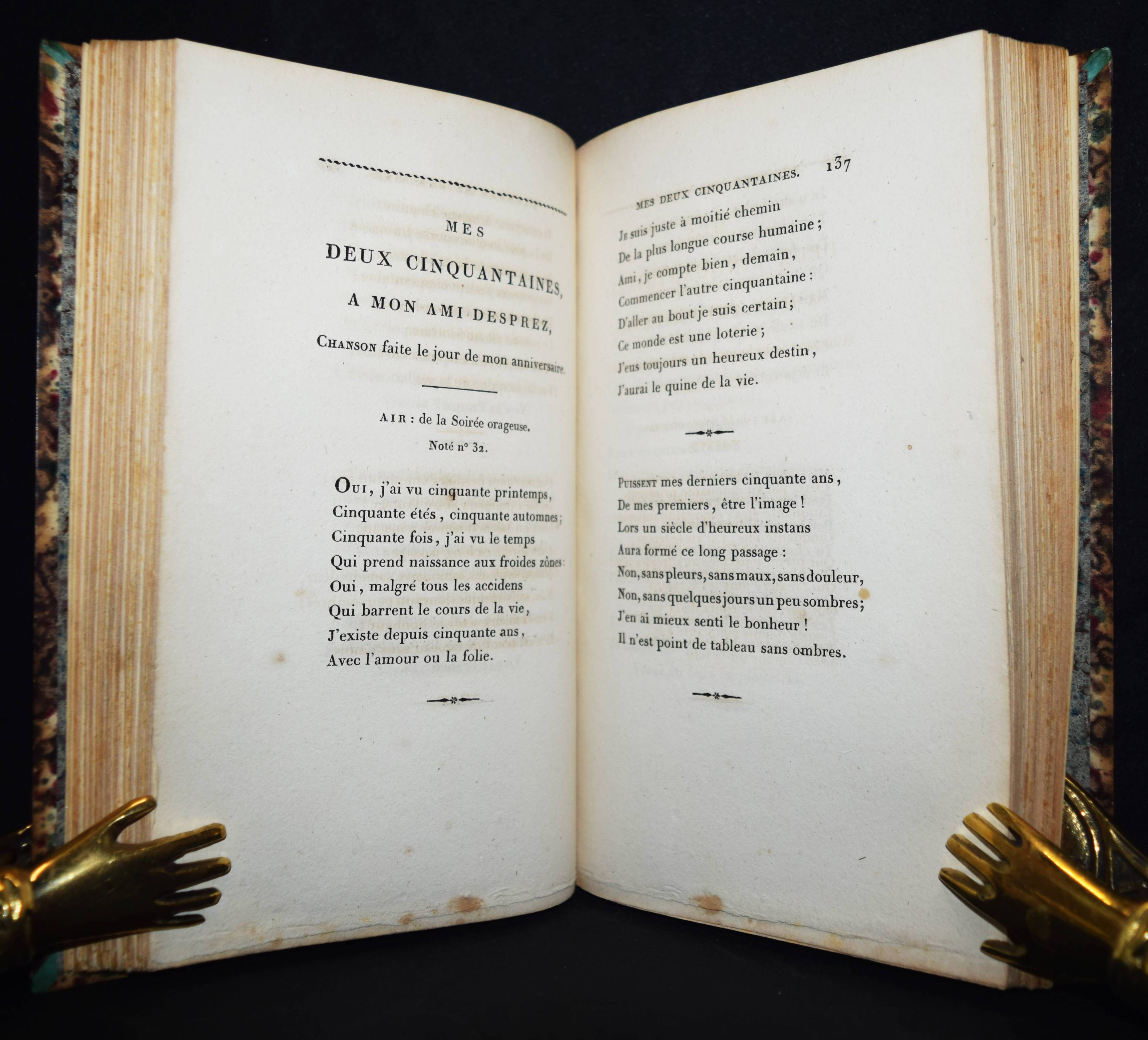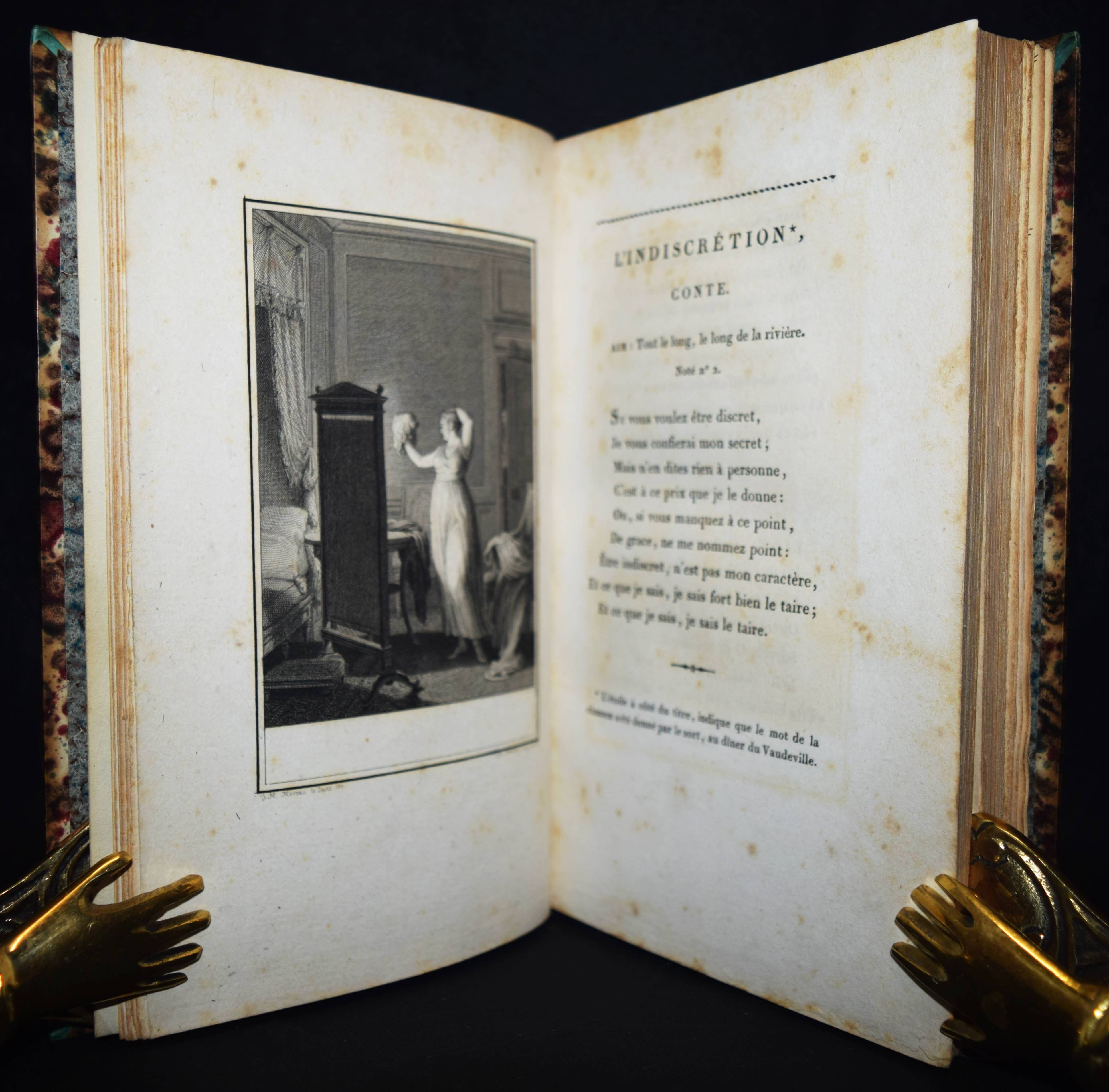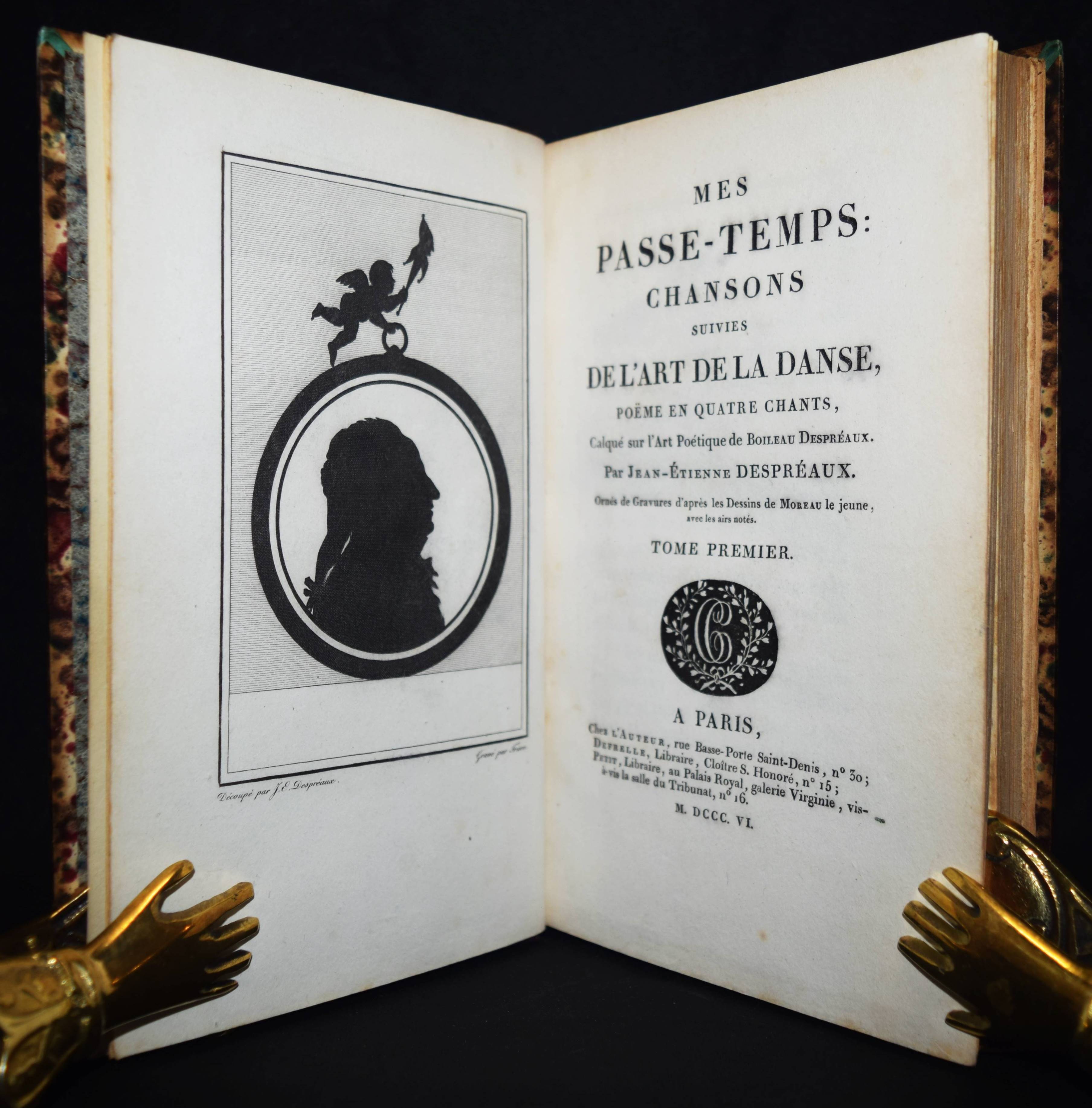 Despréaux, Jean Étienne. Mes Passe-temps. Chansons suivies de l’art de la danse. Poeme en quatre chants, calqué sur l’Art poétique de Boileau Despréaux. 2 Bände. Paris, Chez l’auteur, Defrelle et Petit 1806. 8°. XIV, [1] Bl., 249, 47 S.; VIII, 306 S., [1] Bl. mit gestoch. Frontispitz, 2 Kupfertafeln von Ph(ilippe) Frére nach J(ean) M(ichel) Moreau le jeune, 3 gestoch. Vignetten u. 47 S. mit gestoch. Musiknoten. Hldr. d. Zt. mit goldgepr. Rückensch. u. dekorativer Rückenverg. (signiert: Capé). Biographisch-Bibliographisches Quellen-Lexikon der Musiker und Musikgelehrten S. 186. Cohen-de Ricci 301. Derra de Moroda 759. Magriel 26. Vicaire III, 231. – Erste Ausgabe. – Der franz. Schaupieler und Komponist J.-E. Despréaux (1748-1820) erhielt seine Ausbildung durch seinen Vater (Oboe-Spieler an der Académie royale de musique) „und konnte mit dessen Unterstützung 1763 erfolgreich als Musiker debütieren. Neben seinen Fähigkeiten als Musiker (Flöte, Geige) wurde Despréaux aber erst durch sein Können als Tänzer im königlichen Ballett bekannt. 1781 zog sich Despréaux als Tänzer von der Bühne zurück und widmete sich nur noch dem Komponieren und Schreiben. Ein Schwerpunkt dabei waren seine gelungenen Parodien bekannter und beliebter Theaterstücke. König Ludwig XVI. bewilligte ihm eine Pension von 1.000 Livres. Am 14. August 1789 heiratete er in Paris seine Kollegin, die Tänzerin Marie Madeleine Guimard“ (Wikipedia). – „Veuf depuis dix ans de la Guimard, Despréaux vient de mourir. Je préférais à ses écrits baroques son imitation des danseurs, parce qu’elle était plaisante. Du haute d’un tout petit théâtre dont le rideau était à moitié baissé, il introduisait sur la scène le doigt indicateur de chaque main affublé d’une tunique, avec maillot et chaussures formant de petites jambes. Puis, au son d’une musique de ballet, il exécutait si exactement des pas qu’on y reconnaissait le genre et les manières du danseur ou de la danseuse qu’il voulait rappeler“ (Charles Maurice, Histoire anecdotique du théatre… Paris 1856). – Stellenweise etwas braunfleckig, schönes Exemplar im signierten Handeinband.