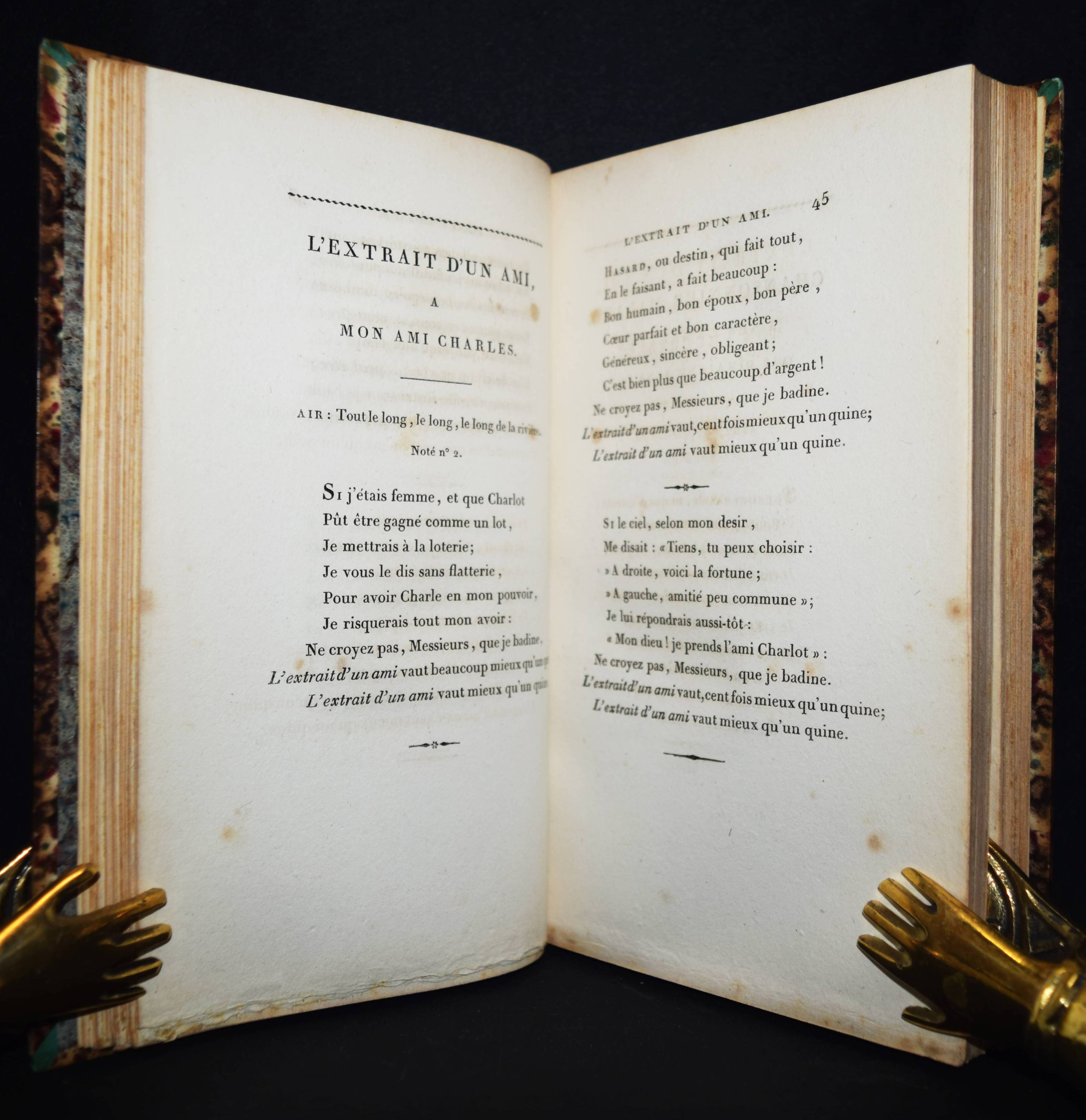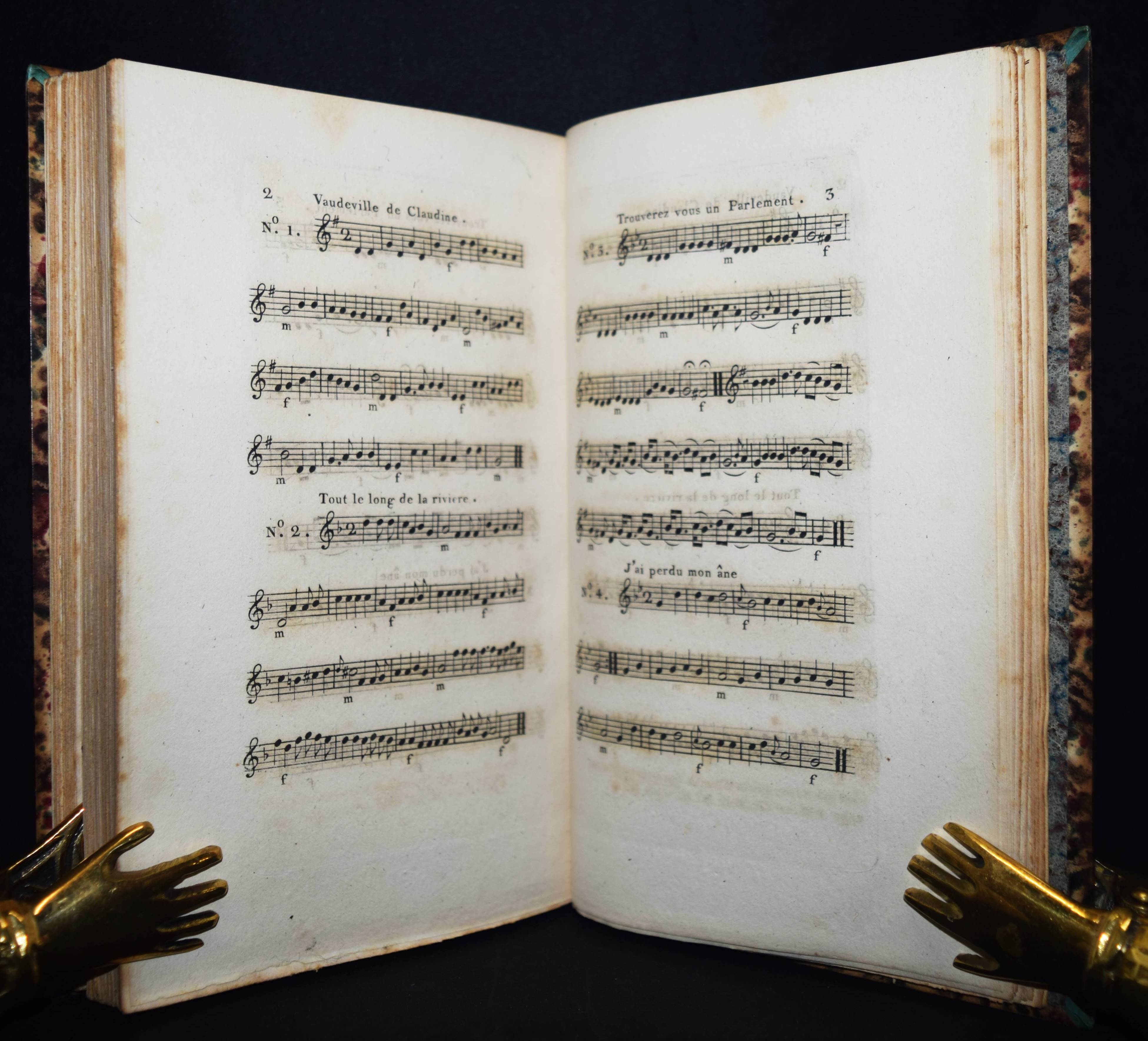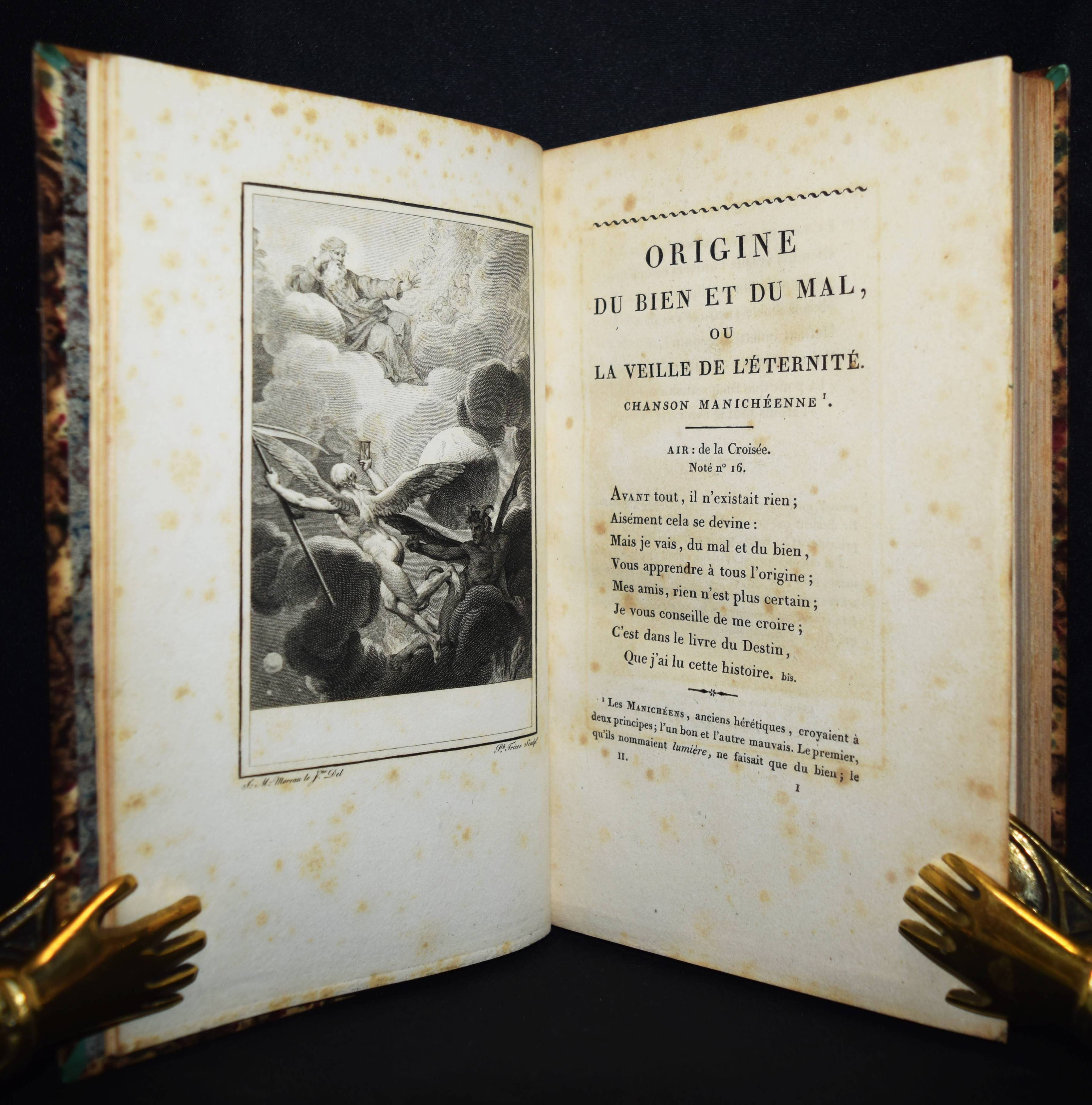 Despréaux, Jean Étienne. Mes Passe-temps. Chansons suivies de l’art de la danse. Poeme en quatre chants, calqué sur l’Art poétique de Boileau Despréaux. 2 Bände. Paris, Chez l’auteur, Defrelle et Petit 1806. 8°. XIV, [1] Bl., 249, 47 S.; VIII, 306 S., [1] Bl. mit gestoch. Frontispitz, 2 Kupfertafeln von Ph(ilippe) Frére nach J(ean) M(ichel) Moreau le jeune, 3 gestoch. Vignetten u. 47 S. mit gestoch. Musiknoten. Hldr. d. Zt. mit goldgepr. Rückensch. u. dekorativer Rückenverg. (signiert: Capé). Biographisch-Bibliographisches Quellen-Lexikon der Musiker und Musikgelehrten S. 186. Cohen-de Ricci 301. Derra de Moroda 759. Magriel 26. Vicaire III, 231. – Erste Ausgabe. – Der franz. Schaupieler und Komponist J.-E. Despréaux (1748-1820) erhielt seine Ausbildung durch seinen Vater (Oboe-Spieler an der Académie royale de musique) „und konnte mit dessen Unterstützung 1763 erfolgreich als Musiker debütieren. Neben seinen Fähigkeiten als Musiker (Flöte, Geige) wurde Despréaux aber erst durch sein Können als Tänzer im königlichen Ballett bekannt. 1781 zog sich Despréaux als Tänzer von der Bühne zurück und widmete sich nur noch dem Komponieren und Schreiben. Ein Schwerpunkt dabei waren seine gelungenen Parodien bekannter und beliebter Theaterstücke. König Ludwig XVI. bewilligte ihm eine Pension von 1.000 Livres. Am 14. August 1789 heiratete er in Paris seine Kollegin, die Tänzerin Marie Madeleine Guimard“ (Wikipedia). – „Veuf depuis dix ans de la Guimard, Despréaux vient de mourir. Je préférais à ses écrits baroques son imitation des danseurs, parce qu’elle était plaisante. Du haute d’un tout petit théâtre dont le rideau était à moitié baissé, il introduisait sur la scène le doigt indicateur de chaque main affublé d’une tunique, avec maillot et chaussures formant de petites jambes. Puis, au son d’une musique de ballet, il exécutait si exactement des pas qu’on y reconnaissait le genre et les manières du danseur ou de la danseuse qu’il voulait rappeler“ (Charles Maurice, Histoire anecdotique du théatre… Paris 1856). – Stellenweise etwas braunfleckig, schönes Exemplar im signierten Handeinband.
