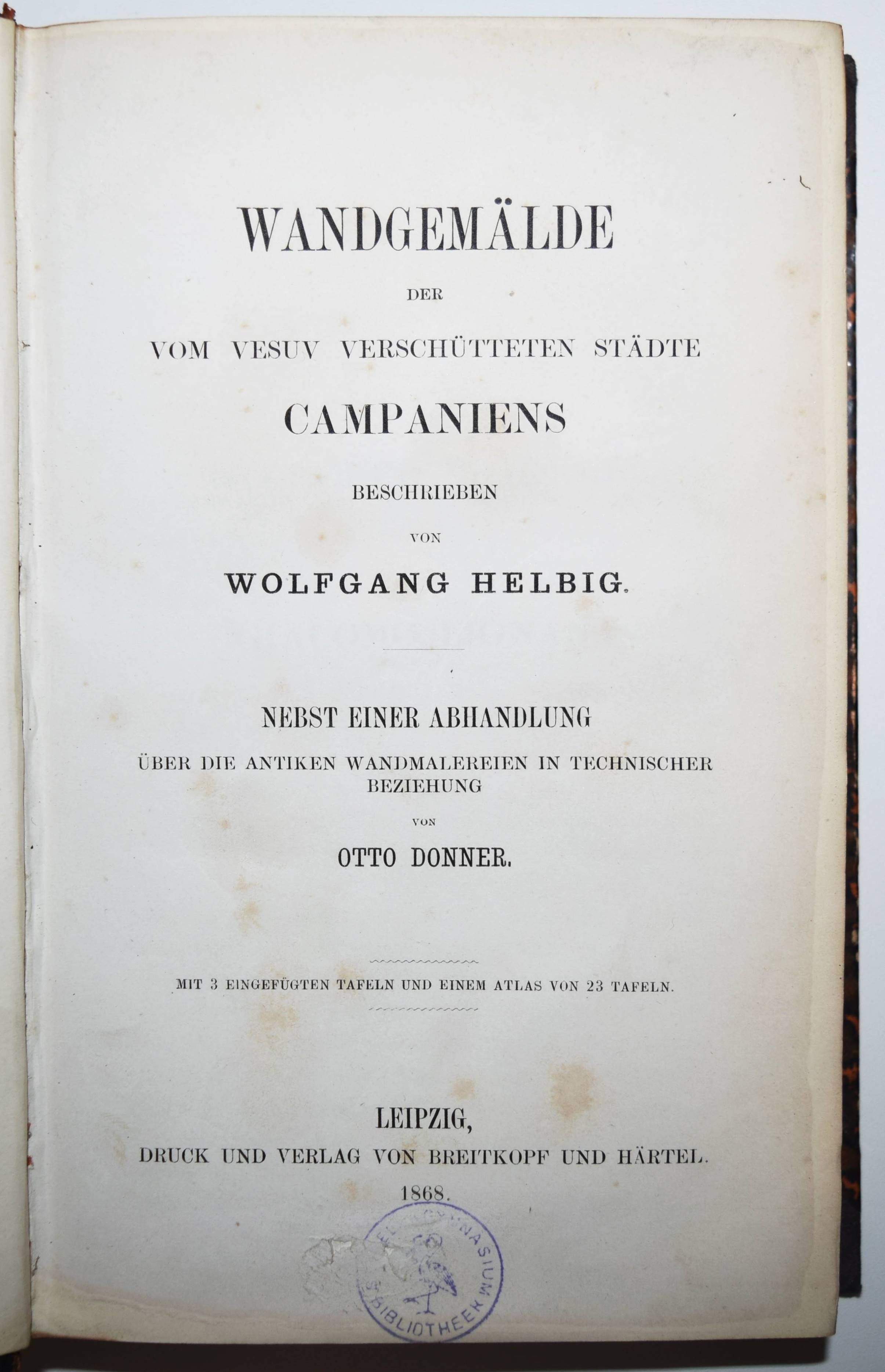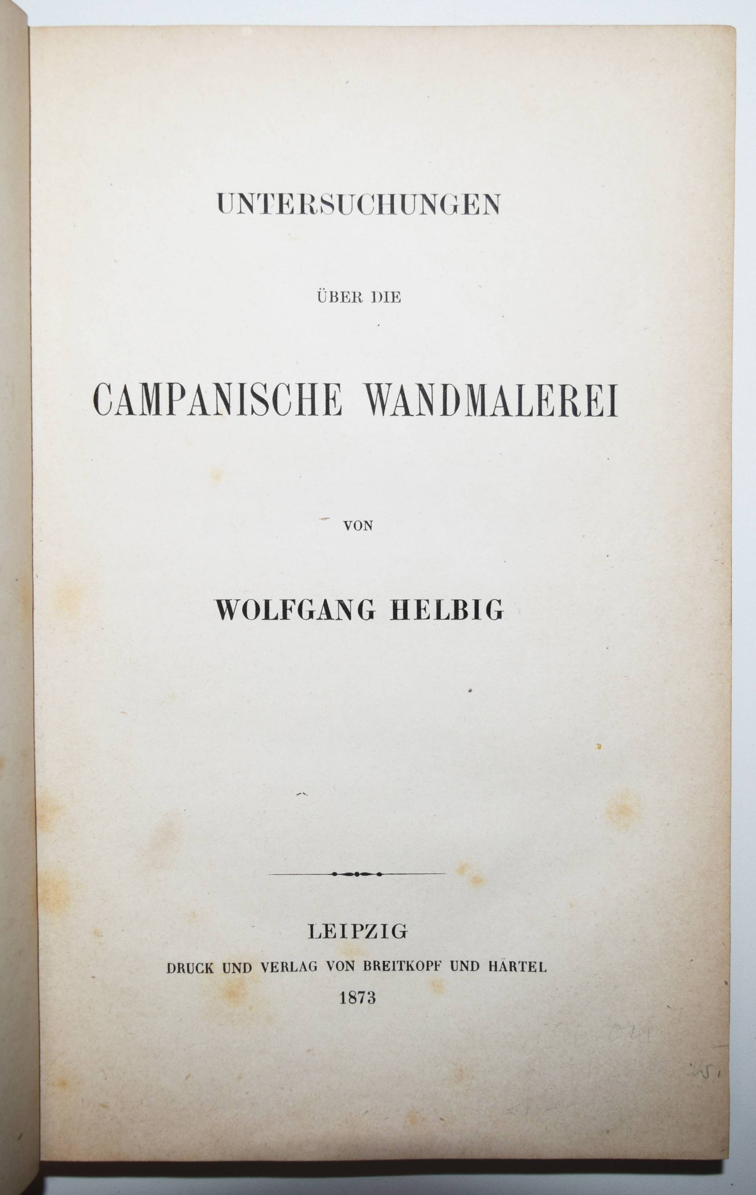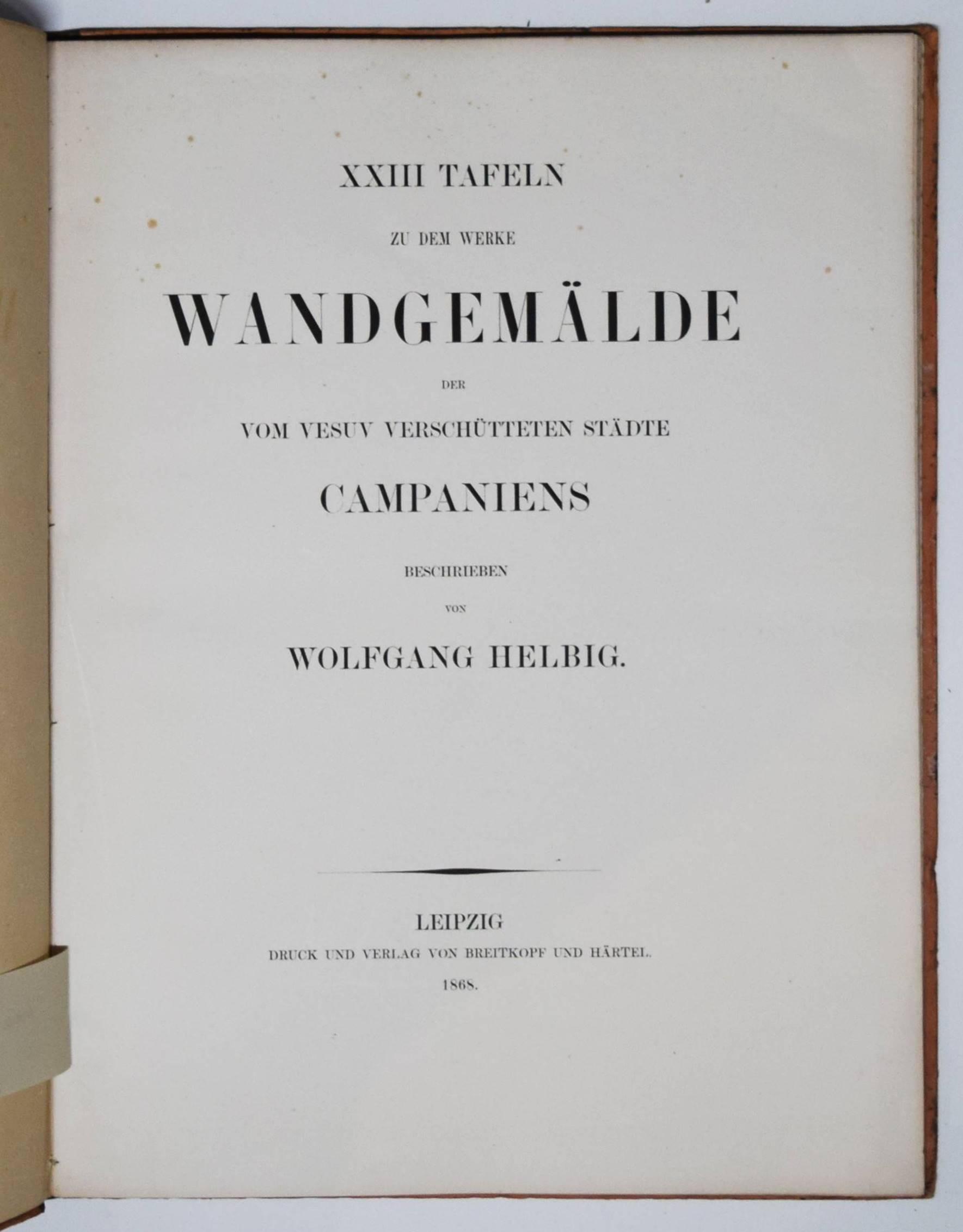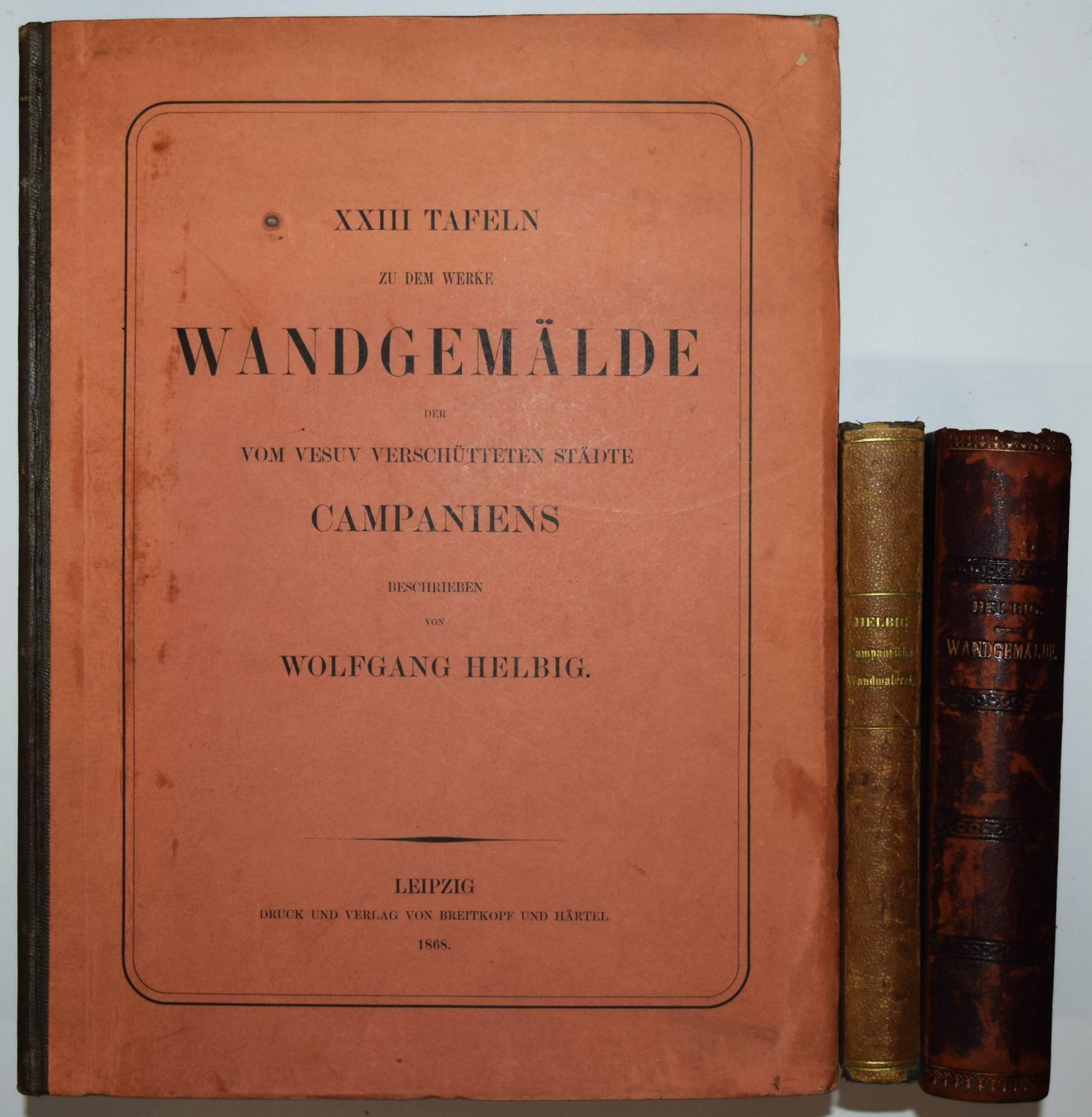 Helbig, Wolfgang. Wandgemälde der vom Vesuv verschütteten Städte Campaniens. Nebst einer Abhandlung über die antiken Wandmalereien in technischer Beziehung von Otto Donner. (Und): XXIII Tafeln zu dem Werke Wandgemälde der vom Vesuv verschütteten Städte Campaniens. 2 Bände (Text und Tafelband). Leipzig, Breitkopf u. Härtel 1868. 8° u. 4°. CXXVII, 500 S. mit 3 (2 gefalt.) lithogr. Tafeln; Titel u. 23 teils doppelblattgr. lithogr. Tafeln. Orig.-Halblederband mit goldgepr. Rückentitel und Orig.-Halbleinenbände mit Deckeltitel. Garcia 6677. NDB VIII, 459 f. – Erste Ausgabe. – „Fundamental work on the cataloging of wall paintings in Pompeii, Herculaneum and Stabia“ (L. Garcia). – W. Helbig (1839-1915) kam nach seinem Studium in Göttingen bei E. Curtius und G. A. Sauppe und in Bonn bei O. Jahn, F. W. Ritschel und F. G. Welcker als Stipendiat an das Archäologische Institut in Rom. „Die Beschäftigung mit der etruskischen Malerei hatte sein Interesse für die „campanische“ Wandmalerei geweckt, woraus der Katalog „Wandgemälde der vom Vesuv verschütteten Städte Campaniens“ 1860 und die „Untersuchungen über die campanische Wandmalerei“ 1873 entstanden. Danach wandte er sich einem neuen Forschungsgebiet zu: der italienischen Vorgeschichte („Die Italiker in der Po-Ebene“, 1879). Durch die in dieser Zeit bekannt werdenden mykenischen und trojanischen Funde H. Schliemanns wurde H. zu seiner Untersuchung „Das Homerische Epos aus den Denkmälern erläutert“ (1884, ²1887) angeregt, die noch nach 65 Jahren als ein „Pionierwerk“ bezeichnet worden ist“ (H. Speier in NDB). – Rücken des Textbands berieben, St.a.T., stellenweise etwas braunfleckig, Deckel des Tafelbands etwas angestaubt, sonst sehr gutes sauberes Exemplar. – Dazu: Ders. Untersuchungen über die Campanische Wandmalerei. Leipzig, Breitkopf u. Härtel 1873. 8°. XIV, [1] Bl., 384 S. Orig.-Halbleinenband. – Erste Ausgabe. – Rücken berieben und aufgehellt, nur vereinzelt leicht braunfleckig, gutes Exemplar. – Zusammen 3 Bände.