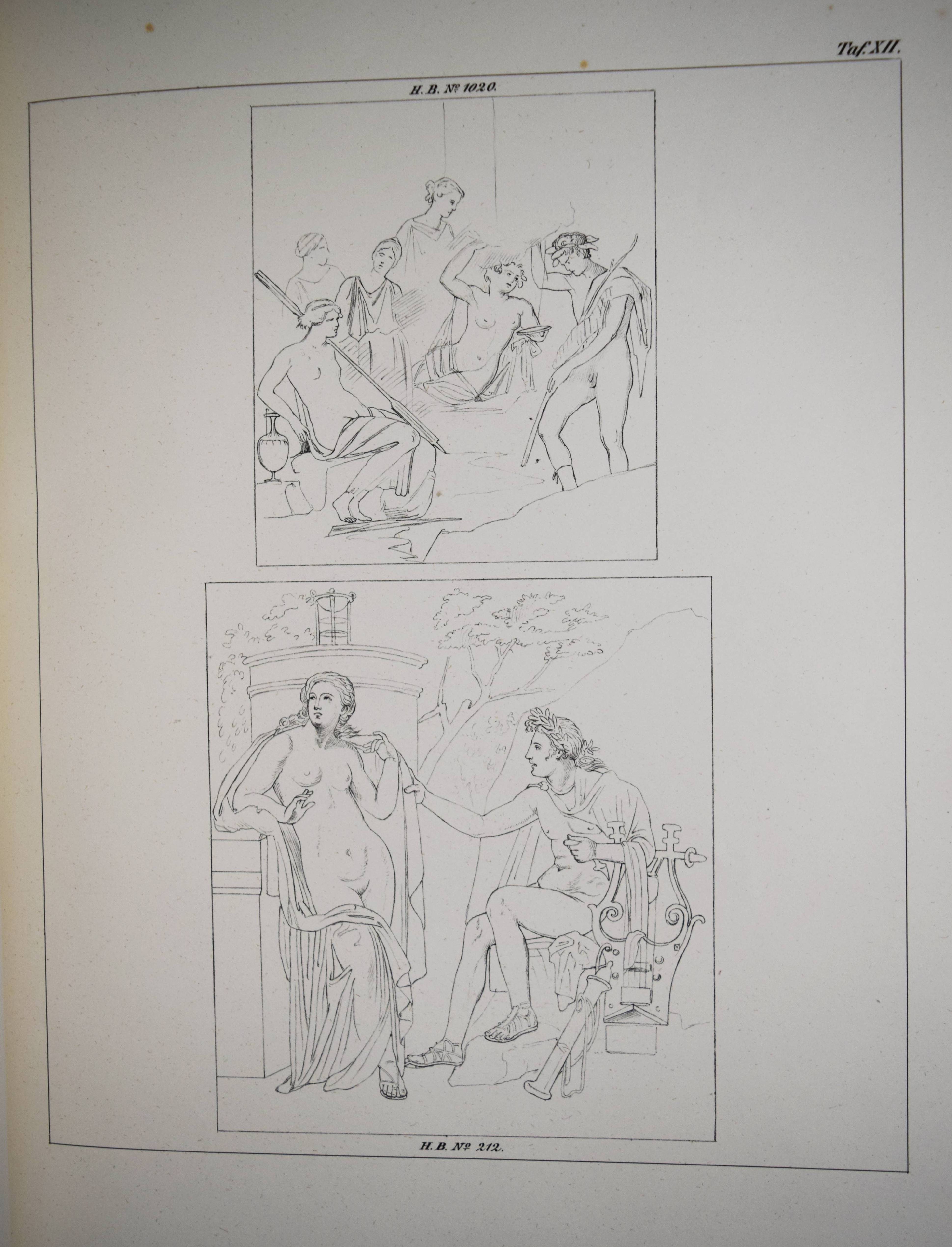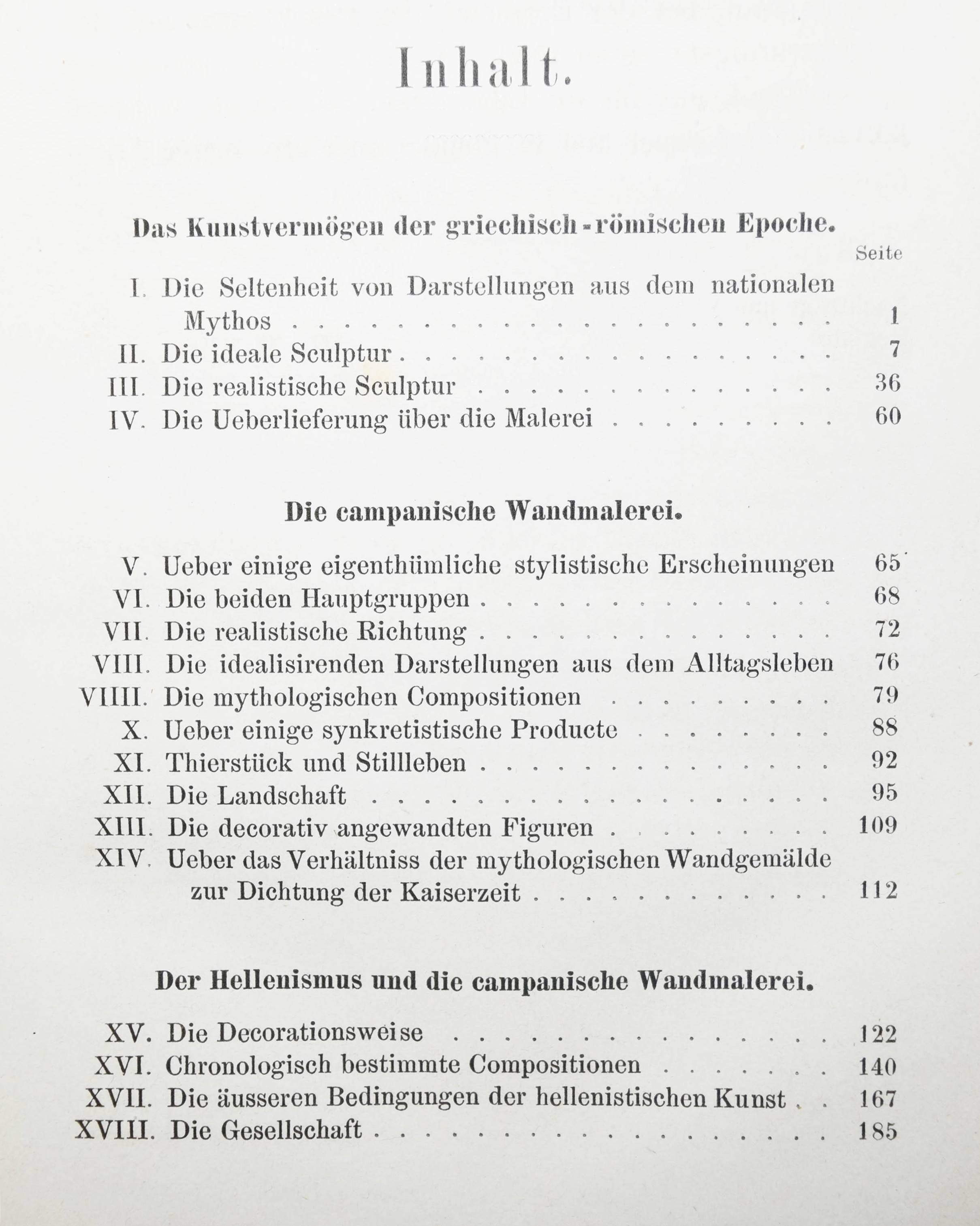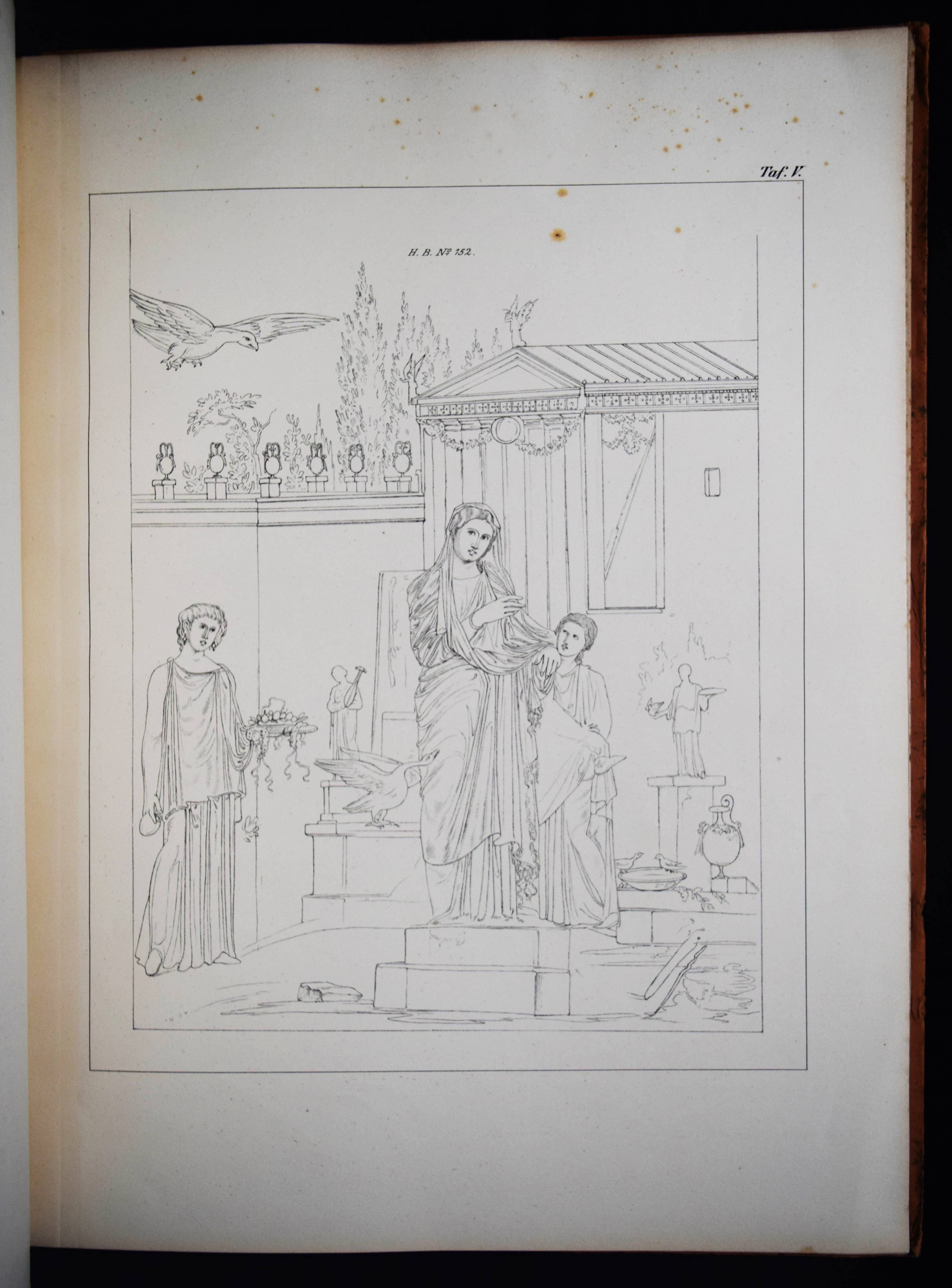 Helbig, Wolfgang. Wandgemälde der vom Vesuv verschütteten Städte Campaniens. Nebst einer Abhandlung über die antiken Wandmalereien in technischer Beziehung von Otto Donner. (Und): XXIII Tafeln zu dem Werke Wandgemälde der vom Vesuv verschütteten Städte Campaniens. 2 Bände (Text und Tafelband). Leipzig, Breitkopf u. Härtel 1868. 8° u. 4°. CXXVII, 500 S. mit 3 (2 gefalt.) lithogr. Tafeln; Titel u. 23 teils doppelblattgr. lithogr. Tafeln. Orig.-Halblederband mit goldgepr. Rückentitel und Orig.-Halbleinenbände mit Deckeltitel. Garcia 6677. NDB VIII, 459 f. – Erste Ausgabe. – „Fundamental work on the cataloging of wall paintings in Pompeii, Herculaneum and Stabia“ (L. Garcia). – W. Helbig (1839-1915) kam nach seinem Studium in Göttingen bei E. Curtius und G. A. Sauppe und in Bonn bei O. Jahn, F. W. Ritschel und F. G. Welcker als Stipendiat an das Archäologische Institut in Rom. „Die Beschäftigung mit der etruskischen Malerei hatte sein Interesse für die „campanische“ Wandmalerei geweckt, woraus der Katalog „Wandgemälde der vom Vesuv verschütteten Städte Campaniens“ 1860 und die „Untersuchungen über die campanische Wandmalerei“ 1873 entstanden. Danach wandte er sich einem neuen Forschungsgebiet zu: der italienischen Vorgeschichte („Die Italiker in der Po-Ebene“, 1879). Durch die in dieser Zeit bekannt werdenden mykenischen und trojanischen Funde H. Schliemanns wurde H. zu seiner Untersuchung „Das Homerische Epos aus den Denkmälern erläutert“ (1884, ²1887) angeregt, die noch nach 65 Jahren als ein „Pionierwerk“ bezeichnet worden ist“ (H. Speier in NDB). – Rücken des Textbands berieben, St.a.T., stellenweise etwas braunfleckig, Deckel des Tafelbands etwas angestaubt, sonst sehr gutes sauberes Exemplar. – Dazu: Ders. Untersuchungen über die Campanische Wandmalerei. Leipzig, Breitkopf u. Härtel 1873. 8°. XIV, [1] Bl., 384 S. Orig.-Halbleinenband. – Erste Ausgabe. – Rücken berieben und aufgehellt, nur vereinzelt leicht braunfleckig, gutes Exemplar. – Zusammen 3 Bände.
