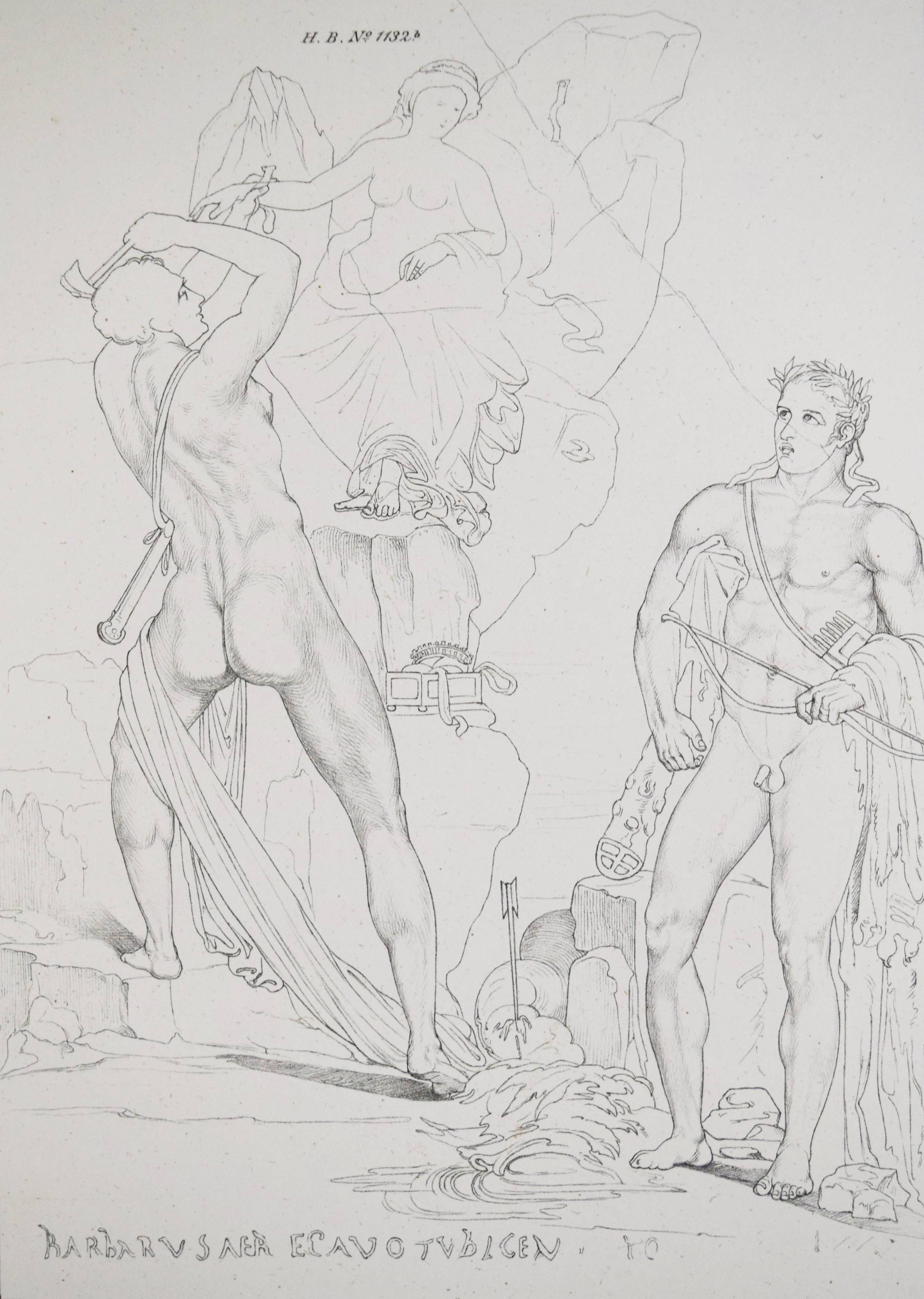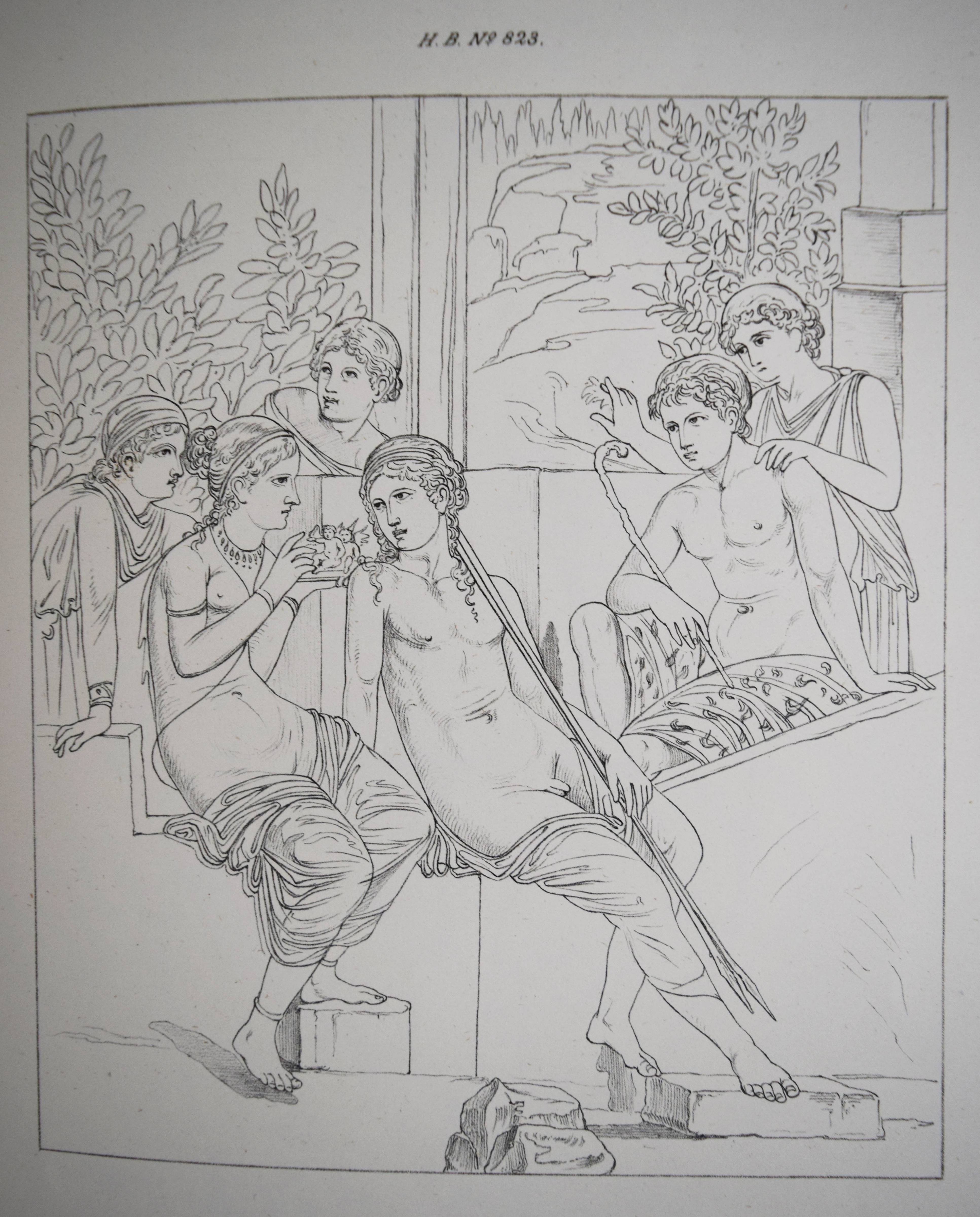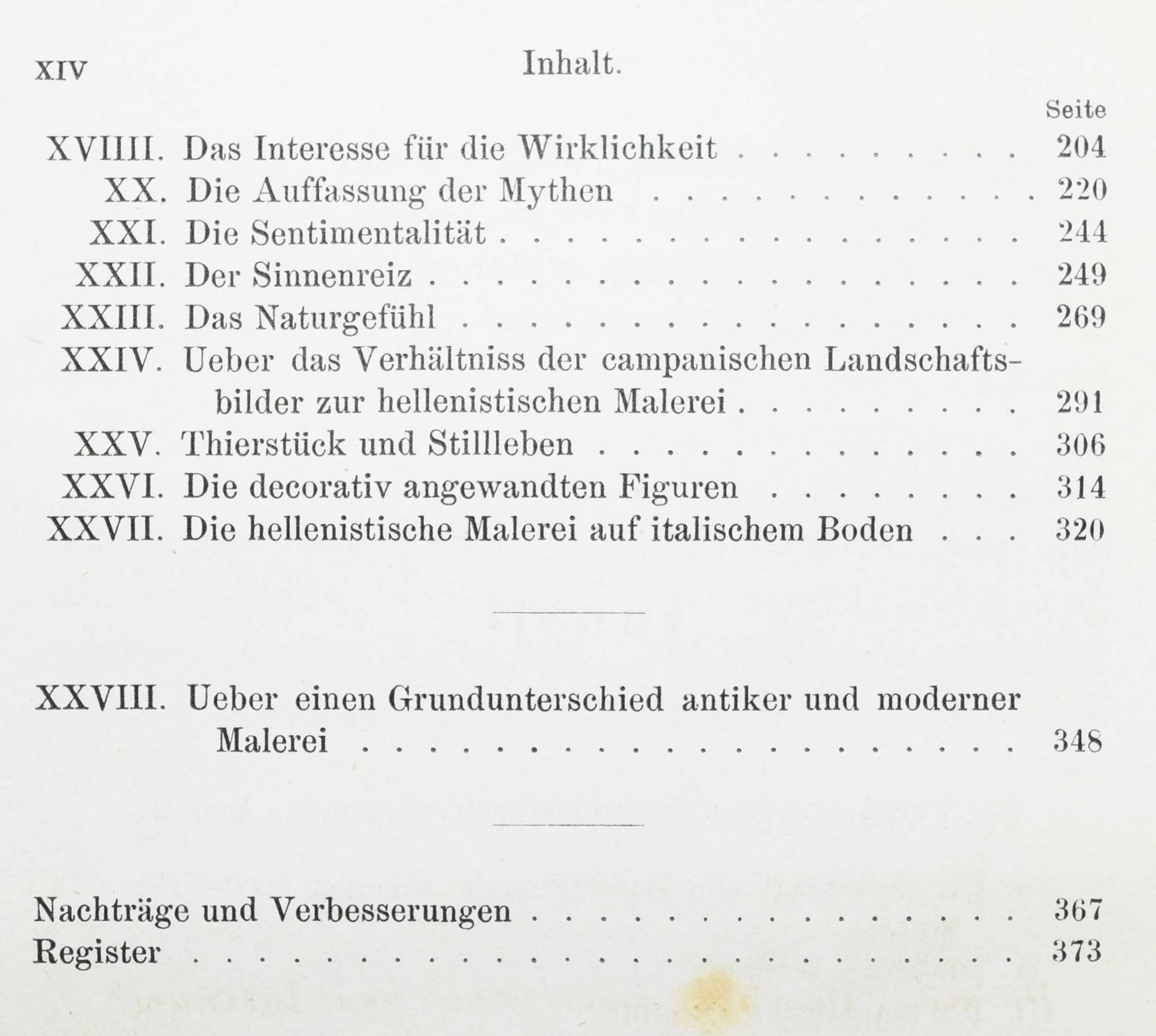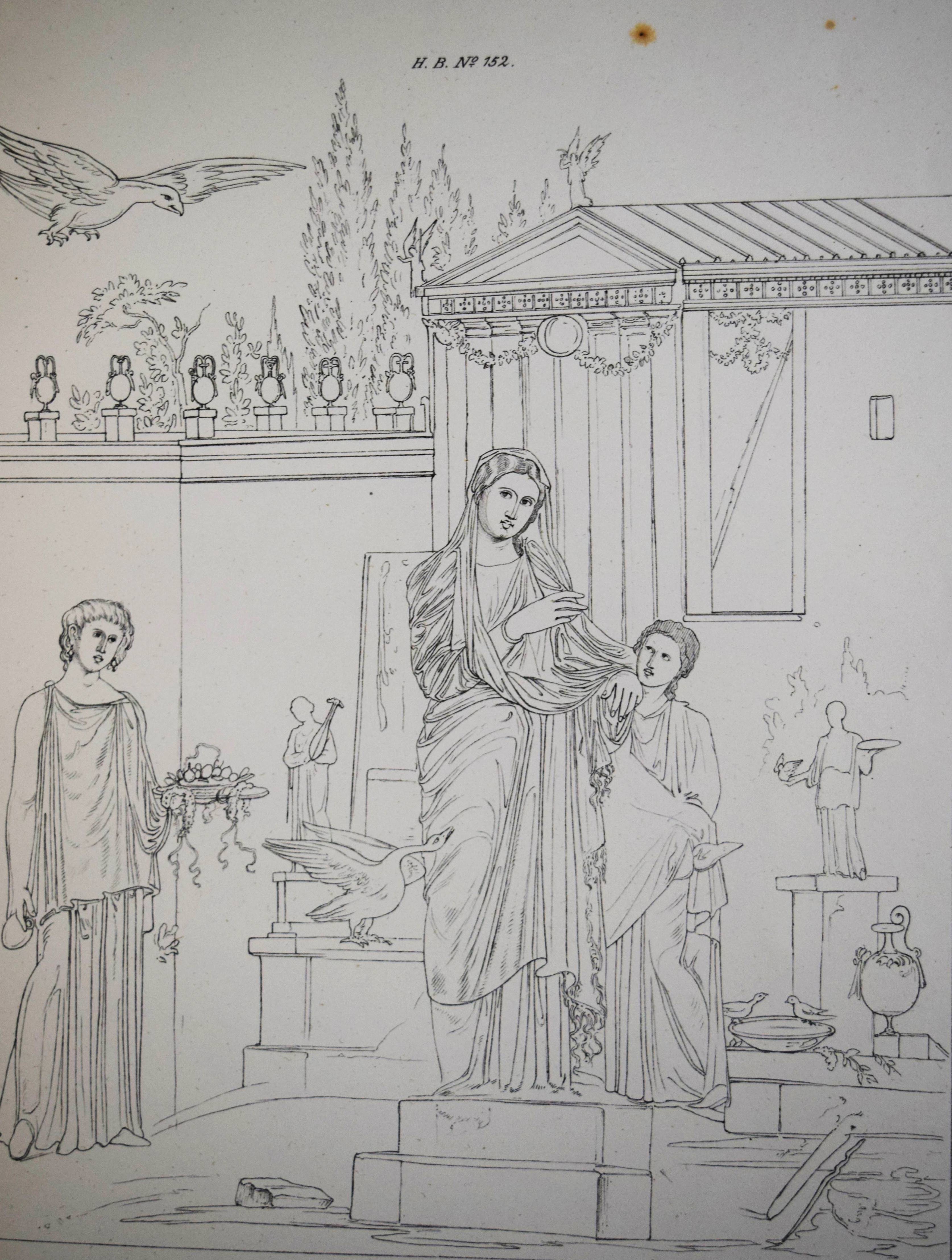 Helbig, Wolfgang. Wandgemälde der vom Vesuv verschütteten Städte Campaniens. Nebst einer Abhandlung über die antiken Wandmalereien in technischer Beziehung von Otto Donner. (Und): XXIII Tafeln zu dem Werke Wandgemälde der vom Vesuv verschütteten Städte Campaniens. 2 Bände (Text und Tafelband). Leipzig, Breitkopf u. Härtel 1868. 8° u. 4°. CXXVII, 500 S. mit 3 (2 gefalt.) lithogr. Tafeln; Titel u. 23 teils doppelblattgr. lithogr. Tafeln. Orig.-Halblederband mit goldgepr. Rückentitel und Orig.-Halbleinenbände mit Deckeltitel. Garcia 6677. NDB VIII, 459 f. – Erste Ausgabe. – „Fundamental work on the cataloging of wall paintings in Pompeii, Herculaneum and Stabia“ (L. Garcia). – W. Helbig (1839-1915) kam nach seinem Studium in Göttingen bei E. Curtius und G. A. Sauppe und in Bonn bei O. Jahn, F. W. Ritschel und F. G. Welcker als Stipendiat an das Archäologische Institut in Rom. „Die Beschäftigung mit der etruskischen Malerei hatte sein Interesse für die „campanische“ Wandmalerei geweckt, woraus der Katalog „Wandgemälde der vom Vesuv verschütteten Städte Campaniens“ 1860 und die „Untersuchungen über die campanische Wandmalerei“ 1873 entstanden. Danach wandte er sich einem neuen Forschungsgebiet zu: der italienischen Vorgeschichte („Die Italiker in der Po-Ebene“, 1879). Durch die in dieser Zeit bekannt werdenden mykenischen und trojanischen Funde H. Schliemanns wurde H. zu seiner Untersuchung „Das Homerische Epos aus den Denkmälern erläutert“ (1884, ²1887) angeregt, die noch nach 65 Jahren als ein „Pionierwerk“ bezeichnet worden ist“ (H. Speier in NDB). – Rücken des Textbands berieben, St.a.T., stellenweise etwas braunfleckig, Deckel des Tafelbands etwas angestaubt, sonst sehr gutes sauberes Exemplar. – Dazu: Ders. Untersuchungen über die Campanische Wandmalerei. Leipzig, Breitkopf u. Härtel 1873. 8°. XIV, [1] Bl., 384 S. Orig.-Halbleinenband. – Erste Ausgabe. – Rücken berieben und aufgehellt, nur vereinzelt leicht braunfleckig, gutes Exemplar. – Zusammen 3 Bände.