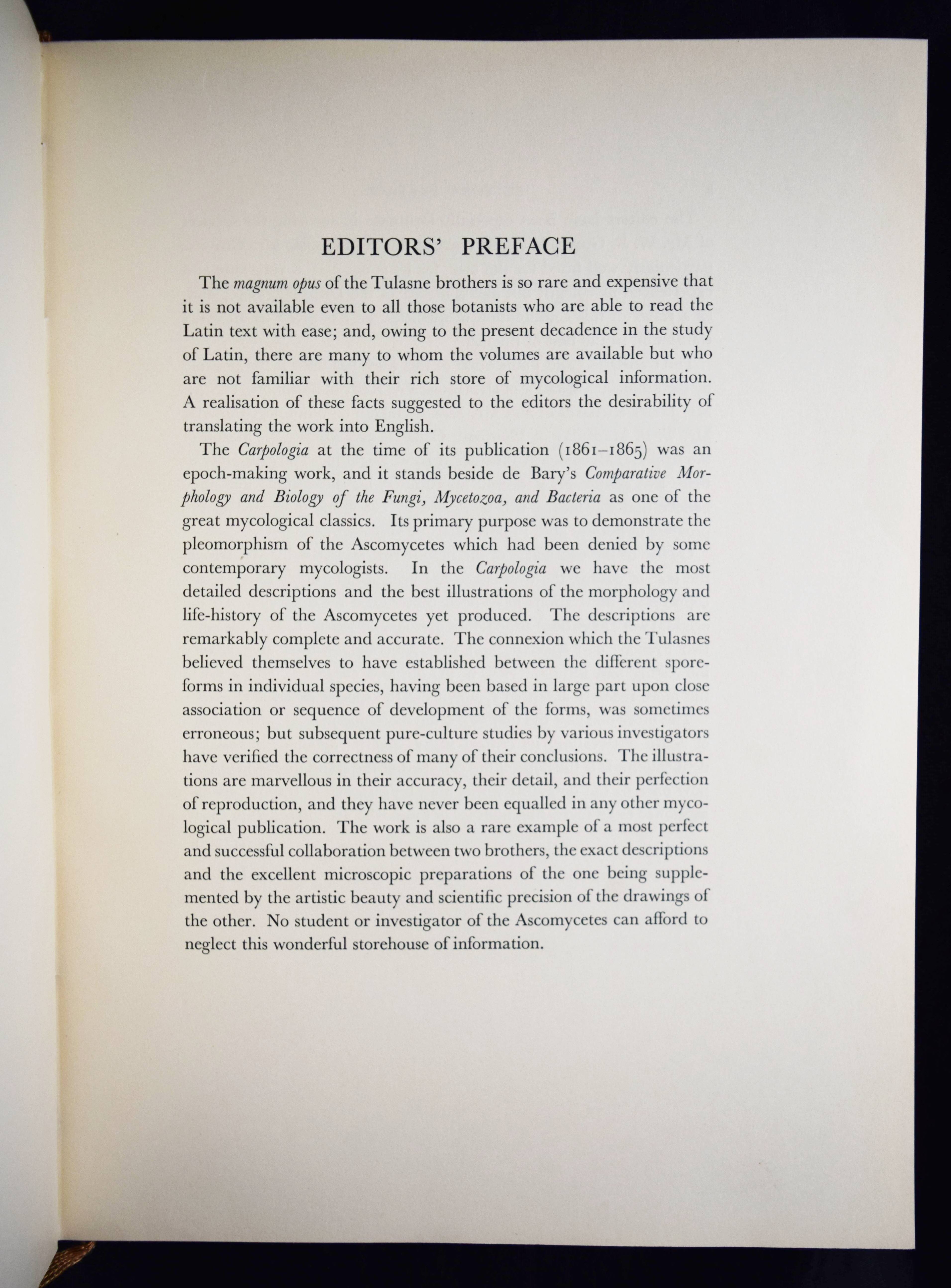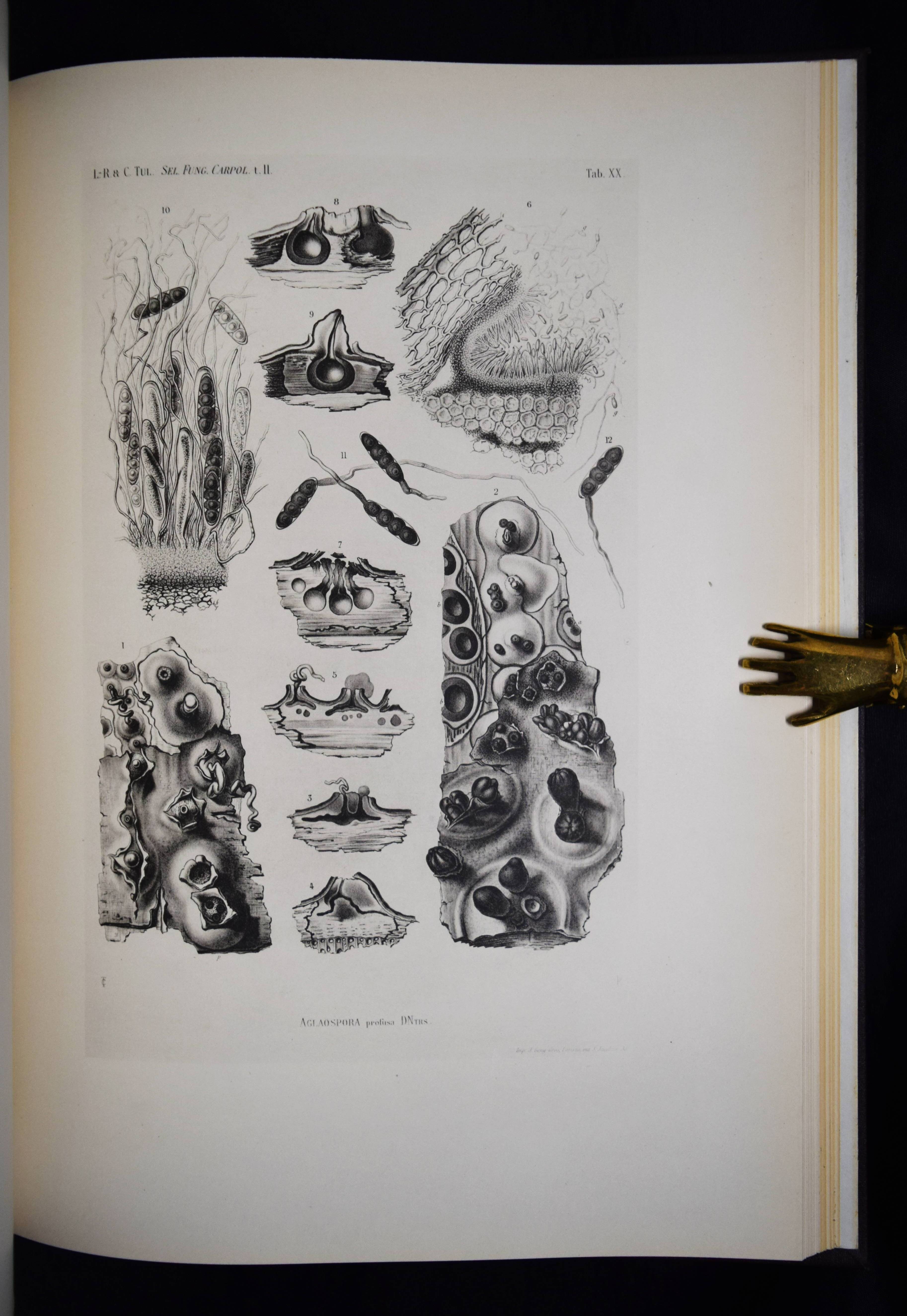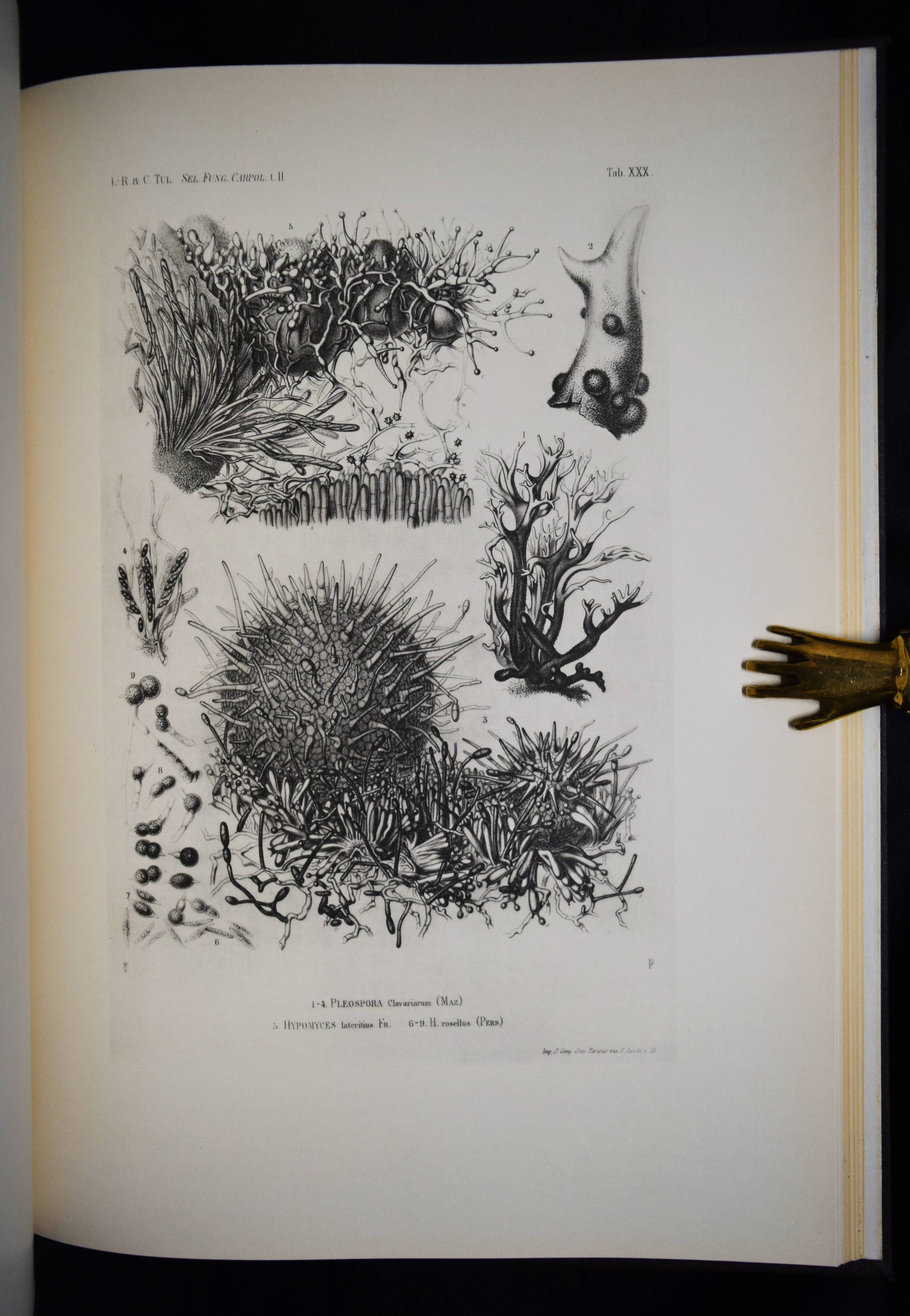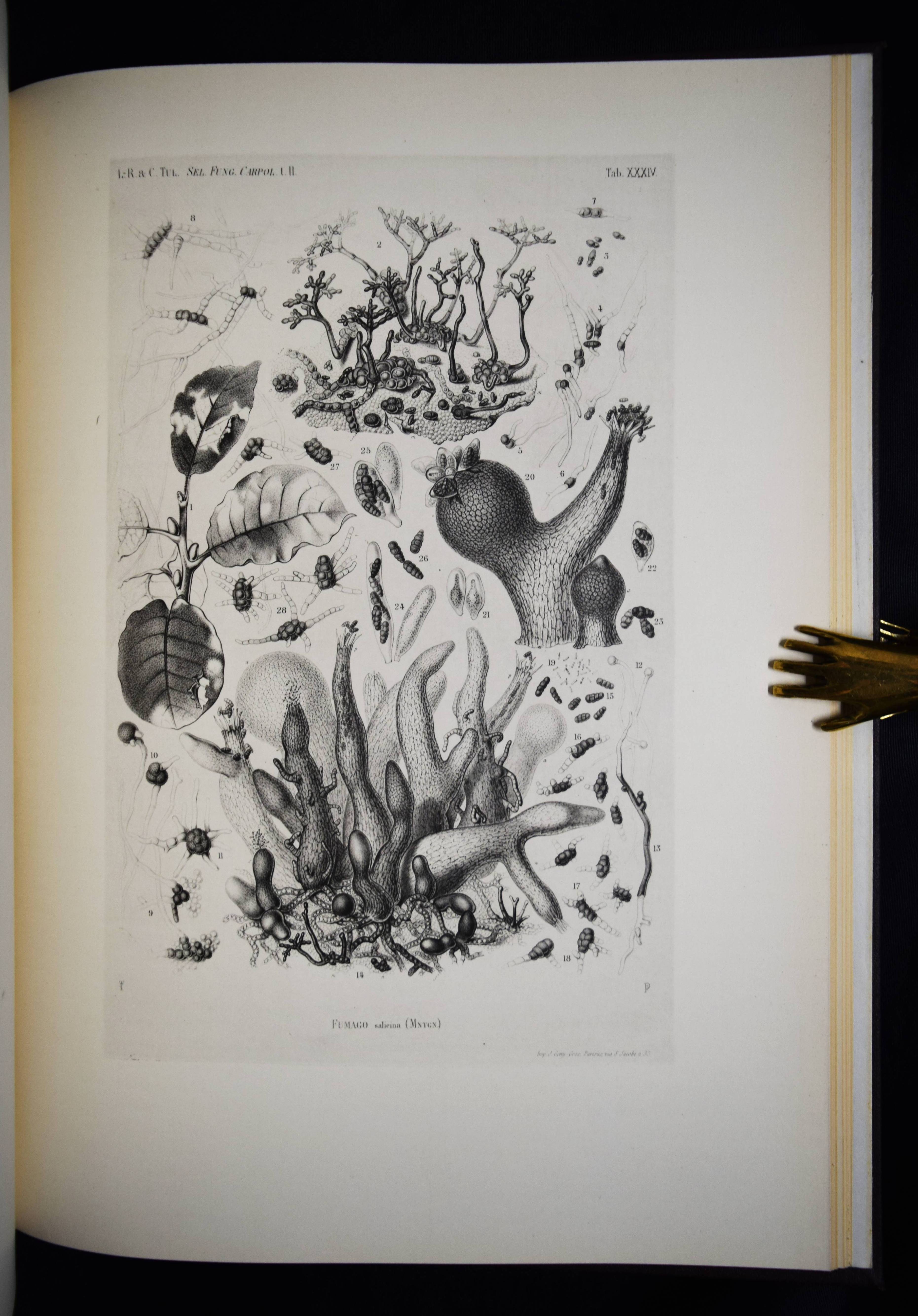Tulasne, L(ouis) R(ene). Selecta fungorum Carpologia. Of the brothers L. R. and C(harles) Tulasne translated into English by W. B. Grove. Edited by A. H. Reginald Buller and C(ornelius) L. Shear. 3 Bände. Oxford, Clarendon Press 1931. Folio (39 x 29 cm.). [15] Bl., XXVIII, 247 S., [2] Bl.; [3] Bl., XX, 302 S., 34 Tafeln, [1] Bl.; [3] Bl., XV, [1] Bl., 206 S., 22 Tafeln, [1] Bl. Hldr. d. Zt. mit goldgepr. Rückentiteln u. Rückenverg. Vgl. DSB XIII, 489. Nissen BBI, 2010; Stafleu & Cowan, 15.315. Volbracht 2136. – Neuausgabe des berühmten Werks. Die Orig.-Ausgabe erschien 1861-1865 in Paris. – „Sehr selten in der lateinischen Erstausgabe. Die Tafeln von Charles Tulasne mit detaillierten Mikrozeichnungen zählen zu den feinsten Darstellungen der mykologischen Literatur“ (C. Vollbracht). – „Their magnum opus was the ‚Selecta Fungorum Carpologia‘ in three magnificent quarto volumes published in 1861-1865, in which they demonstrated the pleomorphism of ascomycetes which had been denied by some contemporary mycologists. They depicted for the first time the conidia, perithecia, and asci of many important parasitic ascomycetes“ (Reed. A short history of Plant Sciences 272). – Sehr schönes sauberes Exemplar in dekorativen Halbledereinbänden.