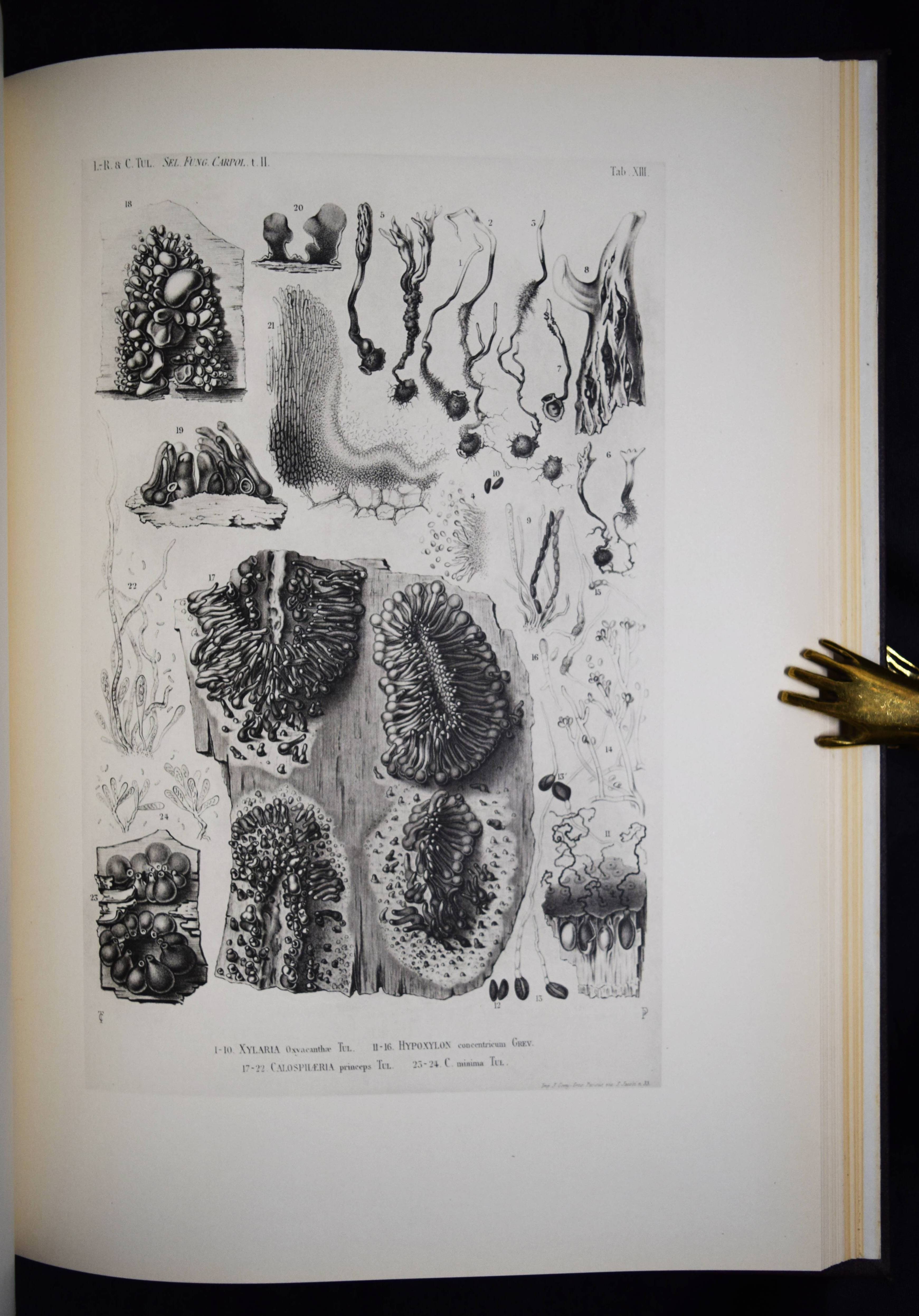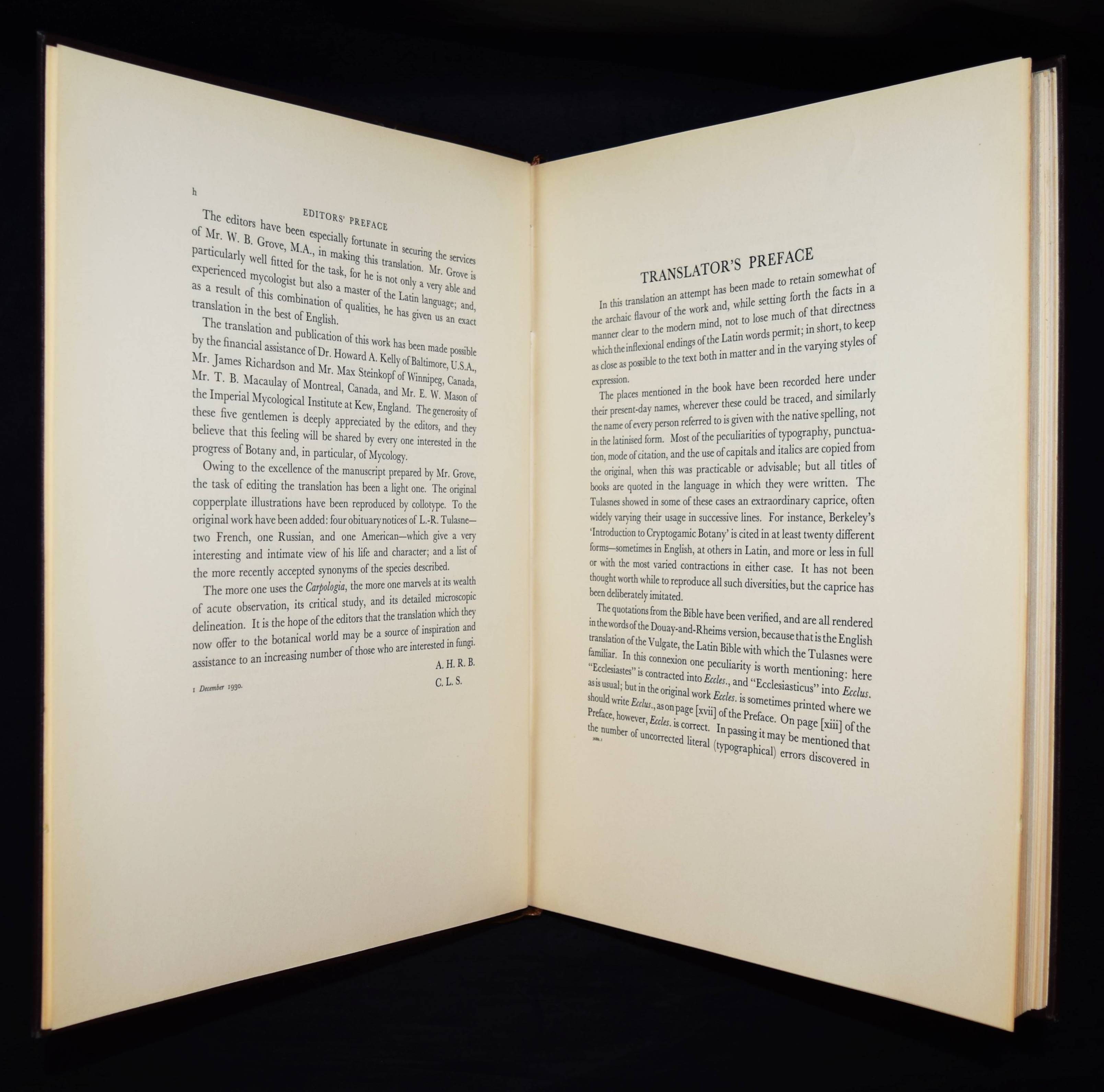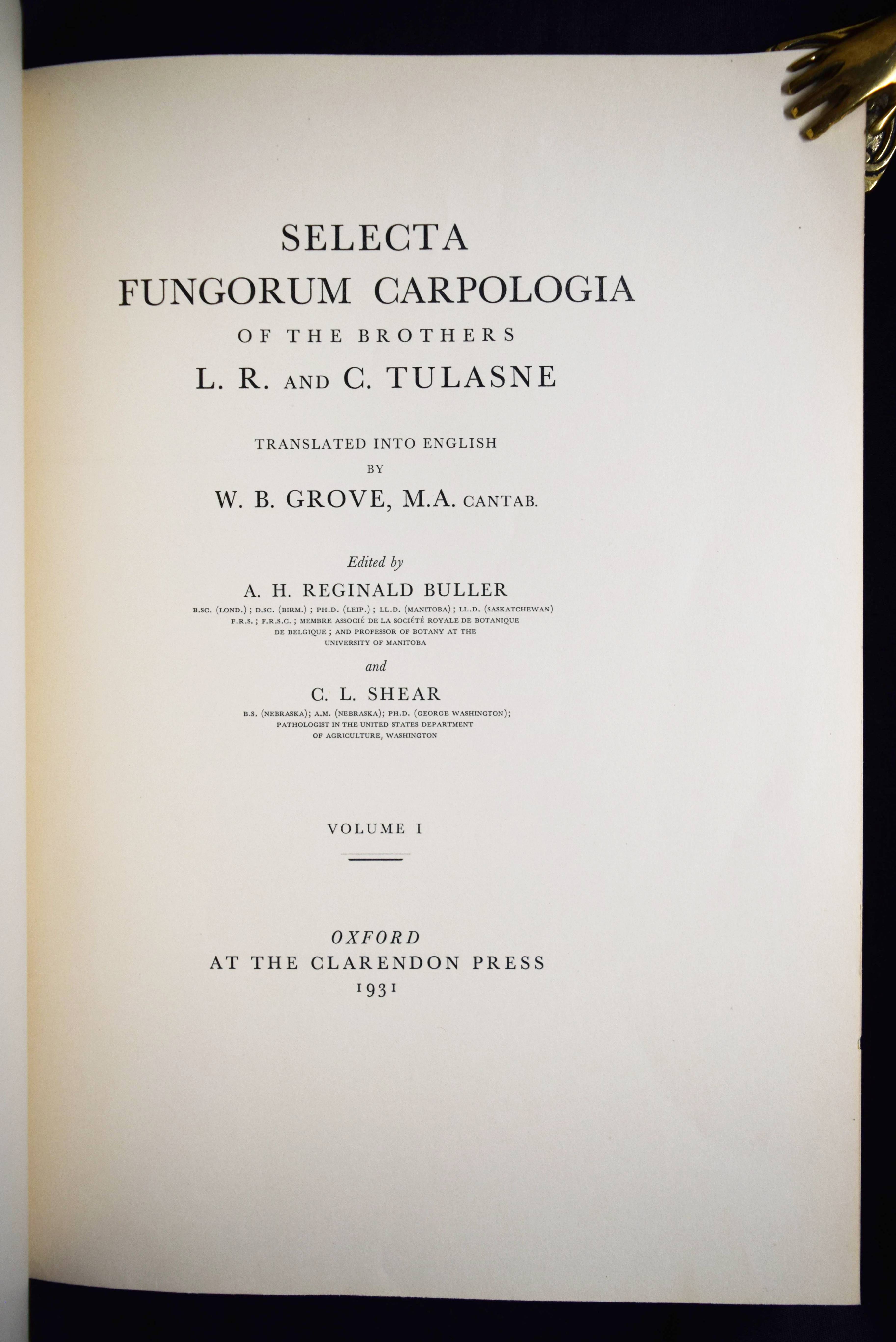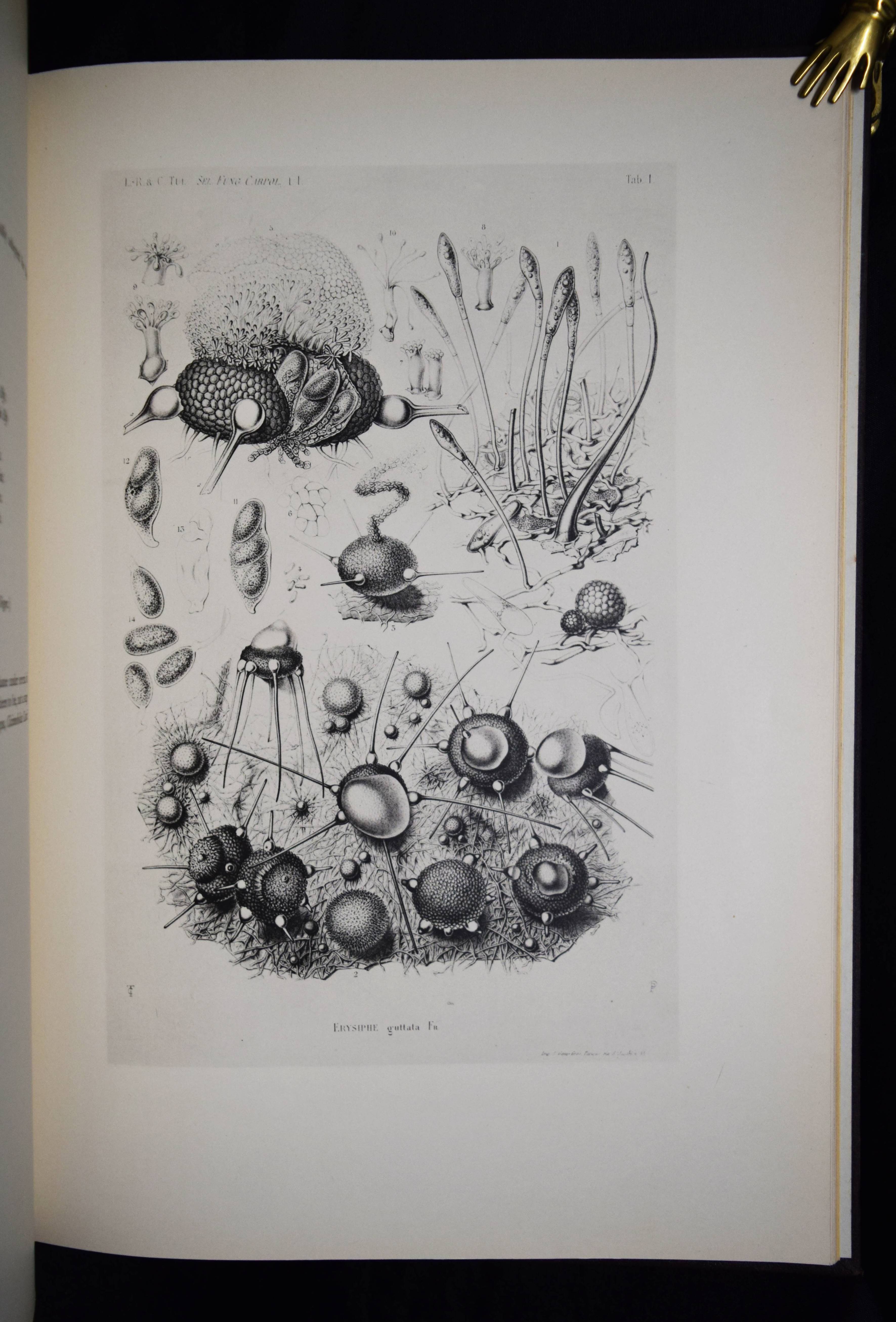 Tulasne, L(ouis) R(ene). Selecta fungorum Carpologia. Of the brothers L. R. and C(harles) Tulasne translated into English by W. B. Grove. Edited by A. H. Reginald Buller and C(ornelius) L. Shear. 3 Bände. Oxford, Clarendon Press 1931. Folio (39 x 29 cm.). [15] Bl., XXVIII, 247 S., [2] Bl.; [3] Bl., XX, 302 S., 34 Tafeln, [1] Bl.; [3] Bl., XV, [1] Bl., 206 S., 22 Tafeln, [1] Bl. Hldr. d. Zt. mit goldgepr. Rückentiteln u. Rückenverg. Vgl. DSB XIII, 489. Nissen BBI, 2010; Stafleu & Cowan, 15.315. Volbracht 2136. – Neuausgabe des berühmten Werks. Die Orig.-Ausgabe erschien 1861-1865 in Paris. – „Sehr selten in der lateinischen Erstausgabe. Die Tafeln von Charles Tulasne mit detaillierten Mikrozeichnungen zählen zu den feinsten Darstellungen der mykologischen Literatur“ (C. Vollbracht). – „Their magnum opus was the ‚Selecta Fungorum Carpologia‘ in three magnificent quarto volumes published in 1861-1865, in which they demonstrated the pleomorphism of ascomycetes which had been denied by some contemporary mycologists. They depicted for the first time the conidia, perithecia, and asci of many important parasitic ascomycetes“ (Reed. A short history of Plant Sciences 272). – Sehr schönes sauberes Exemplar in dekorativen Halbledereinbänden.