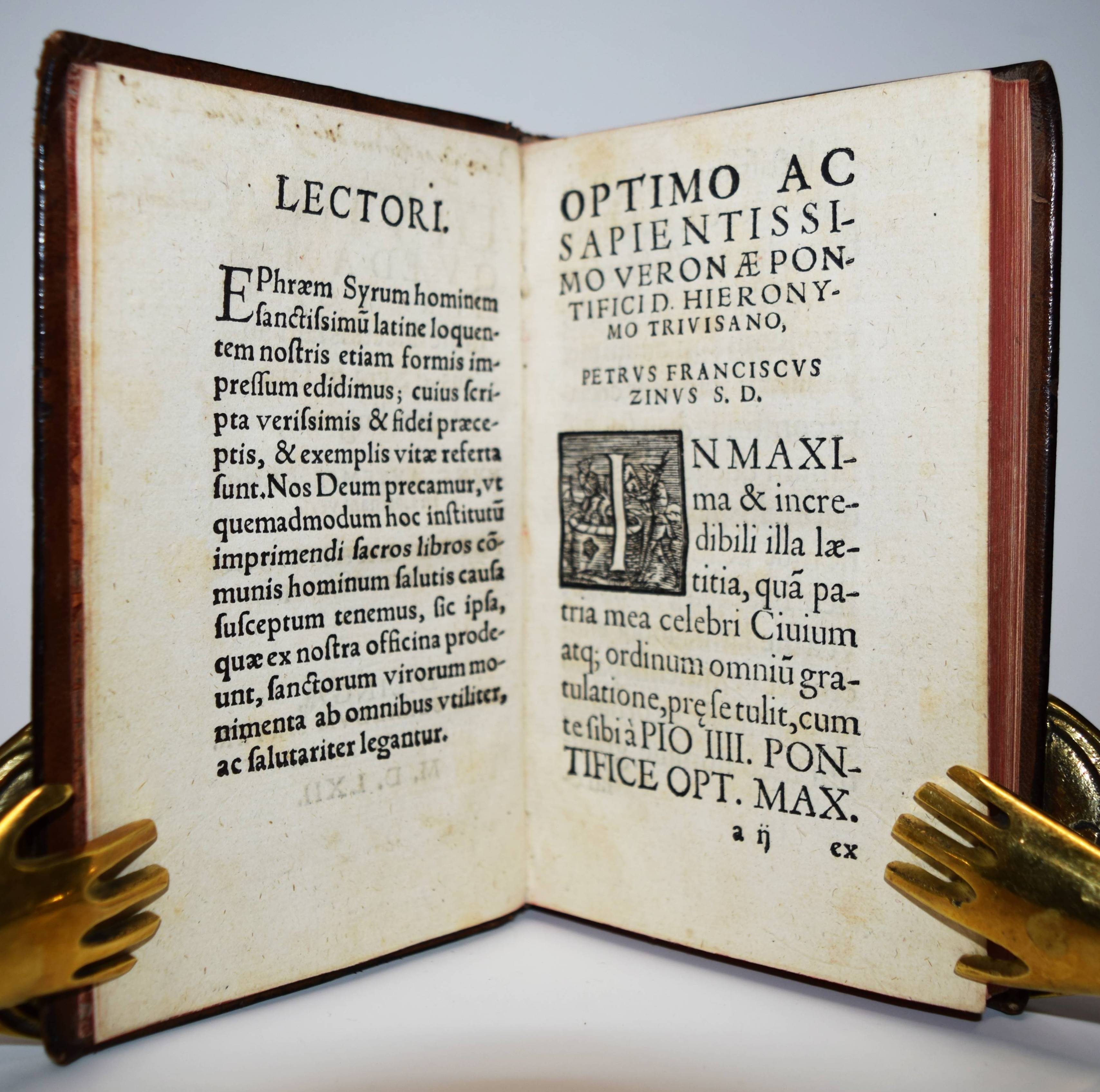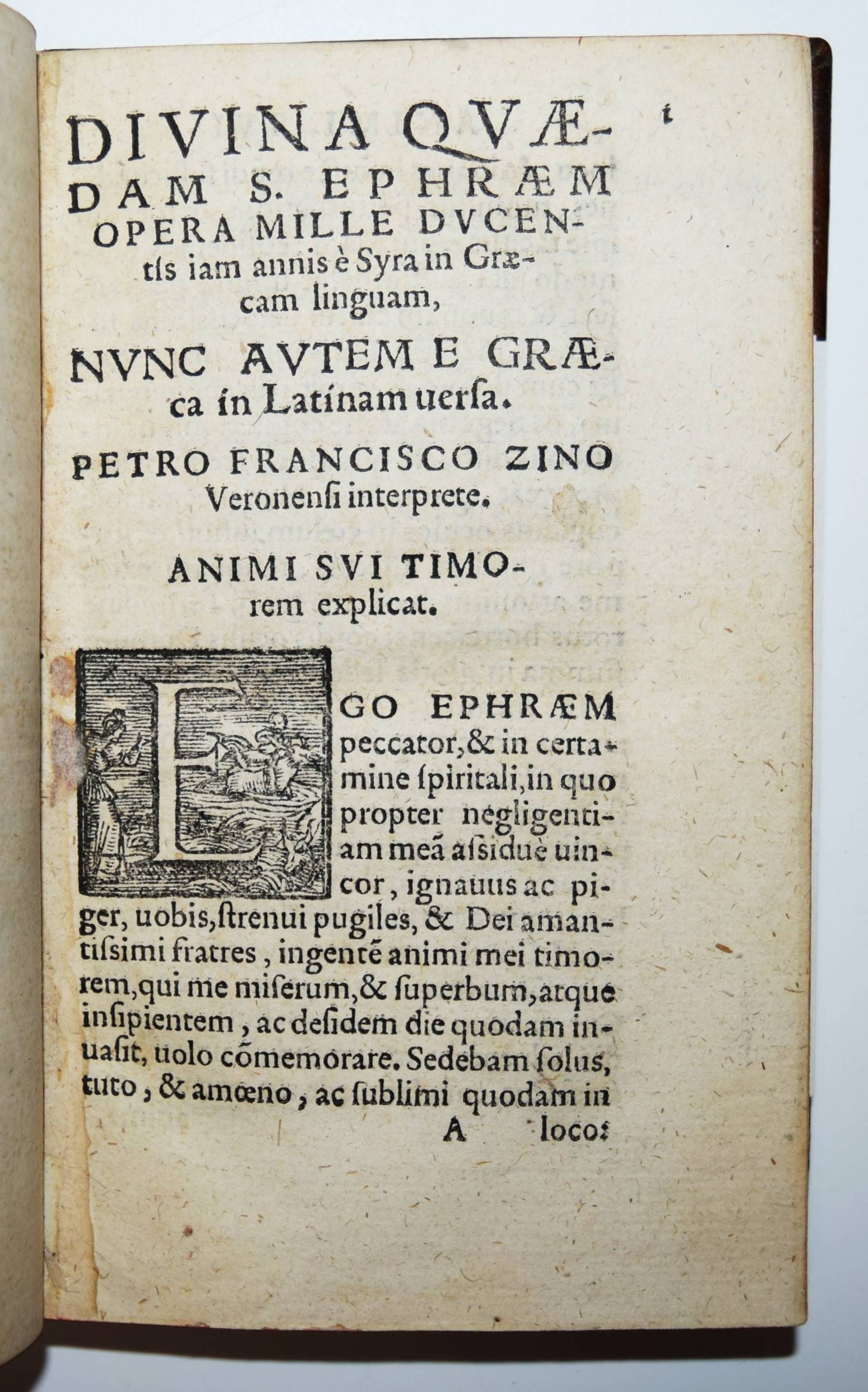 Ephraem Syrus. Divina qvaedam S. Ephraem opera. Mille ducentisiam annis e Syra in Graecam linguam, nunc autem e Graeca in Latinam versa. Dilingae (Dillingen), Sebald Mayer 1562. Kl.-8° (15 x 9,5 cm.). [7] Bl., 144 Bl. mit illustr. Holzschnitt-Initiale am Anfang. Ldr. d. 18. Jahrhunderts mit goldgepr. Rückenschild u. floraler Rückenverg. BBKL I, Sp. 1519 f. Bucher, Dillingen 160. Lexikon des Mittelalters III, Sp. 2052 ff. LThK III, Sp. 708 ff. VD16 E 1576. – Lateinische Übersetzung einiger Texte des persischen Kirchenschriftstellers Ephraim Syrus (auch Afrem, Ephraem und Ephrem, um 306-373). Ephraem „gilt als Begründer der Schule der Perser und neben seinem älteren Zeitgenossen Aphrahat als einer der größten Theologen der syrischen Kirche. Da Ephräm vor den großen Kirchenspaltungen lebte, wird er in vielen östlichen und westlichen Kirchen sehr geschätzt und als Heiliger verehrt. … Die besondere Frömmigkeit der „Bundessöhne“, einer asketischen, dem Mönchtum ähnlichen Gemeinschaft, prägte Ephräm. Die eigentliche monastische Bewegung, die in Mesopotamien vom Manichäismus beeinflusst war, bekämpfte er jedoch. Aufgrund seiner Frömmigkeit und Intelligenz wurde er zum Lehrer der Schule von Nisibis, später zu deren Leiter ernannt. Eine Legende erzählt, dass er dort durch Bischof Basilios von Caesarea zum Diakon geweiht wurde“ (Wikipedia). – Alter Besitzvermerk a. T., schönes dekorartiv gebundenes Exemplar.