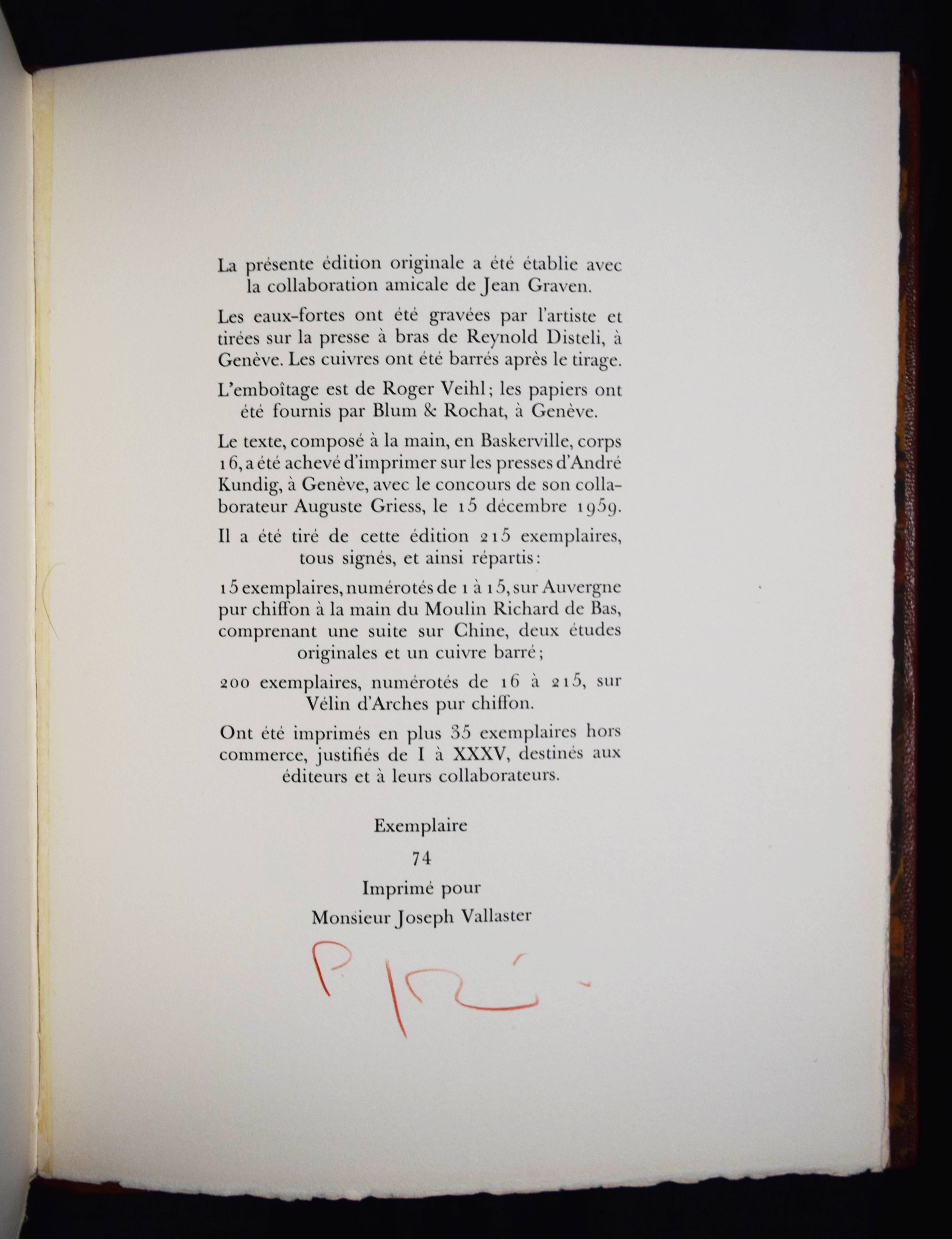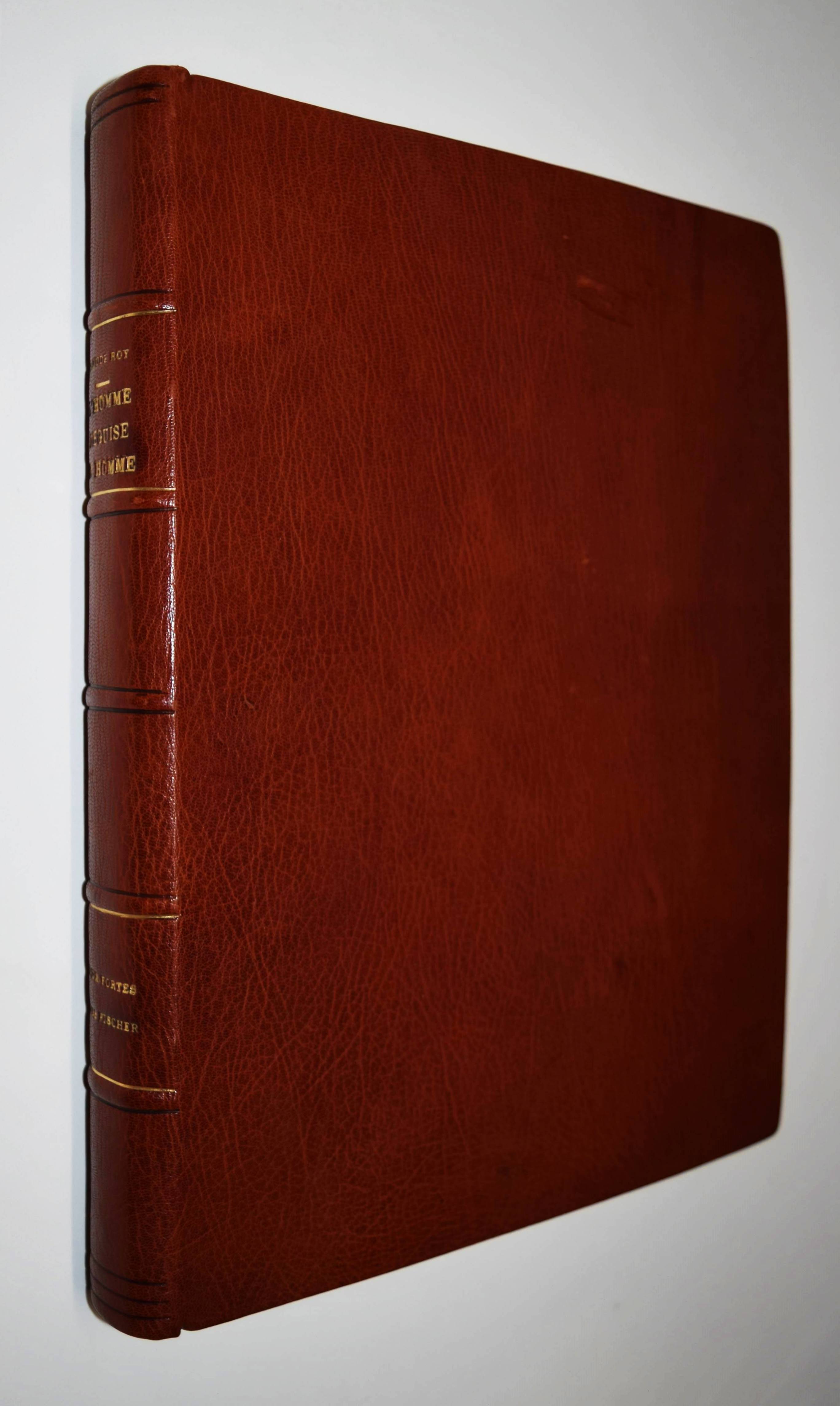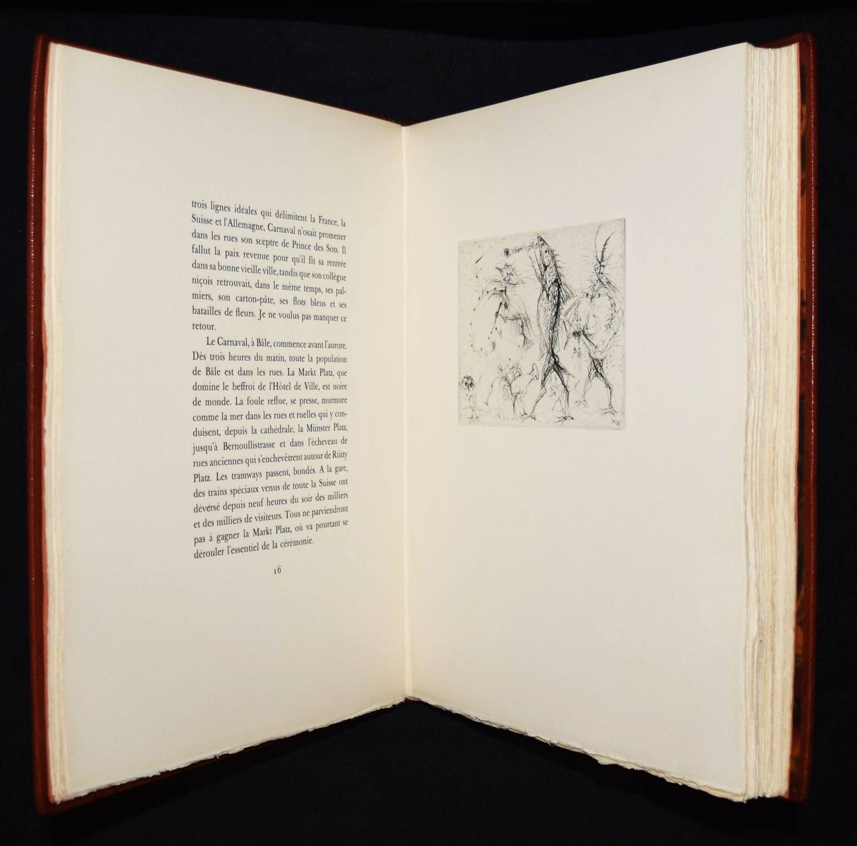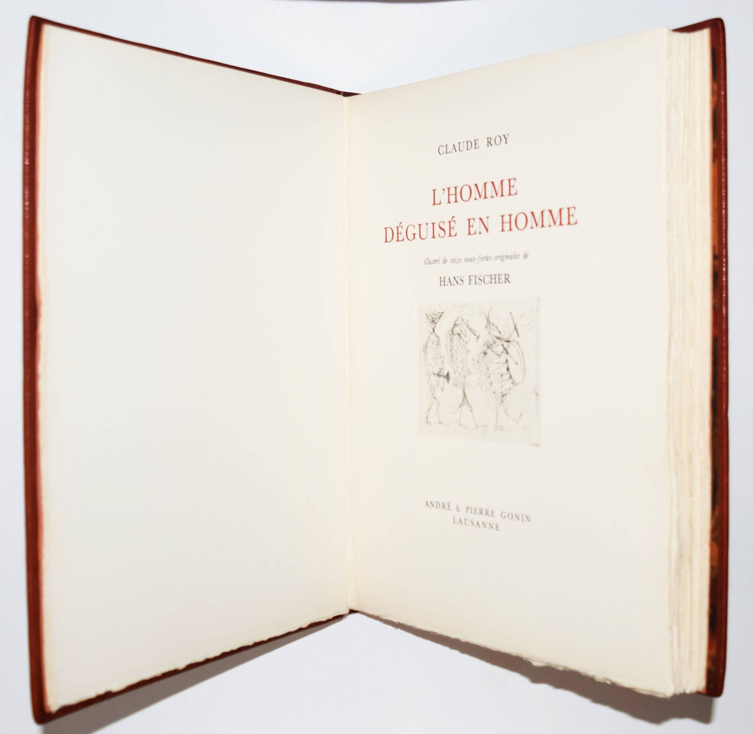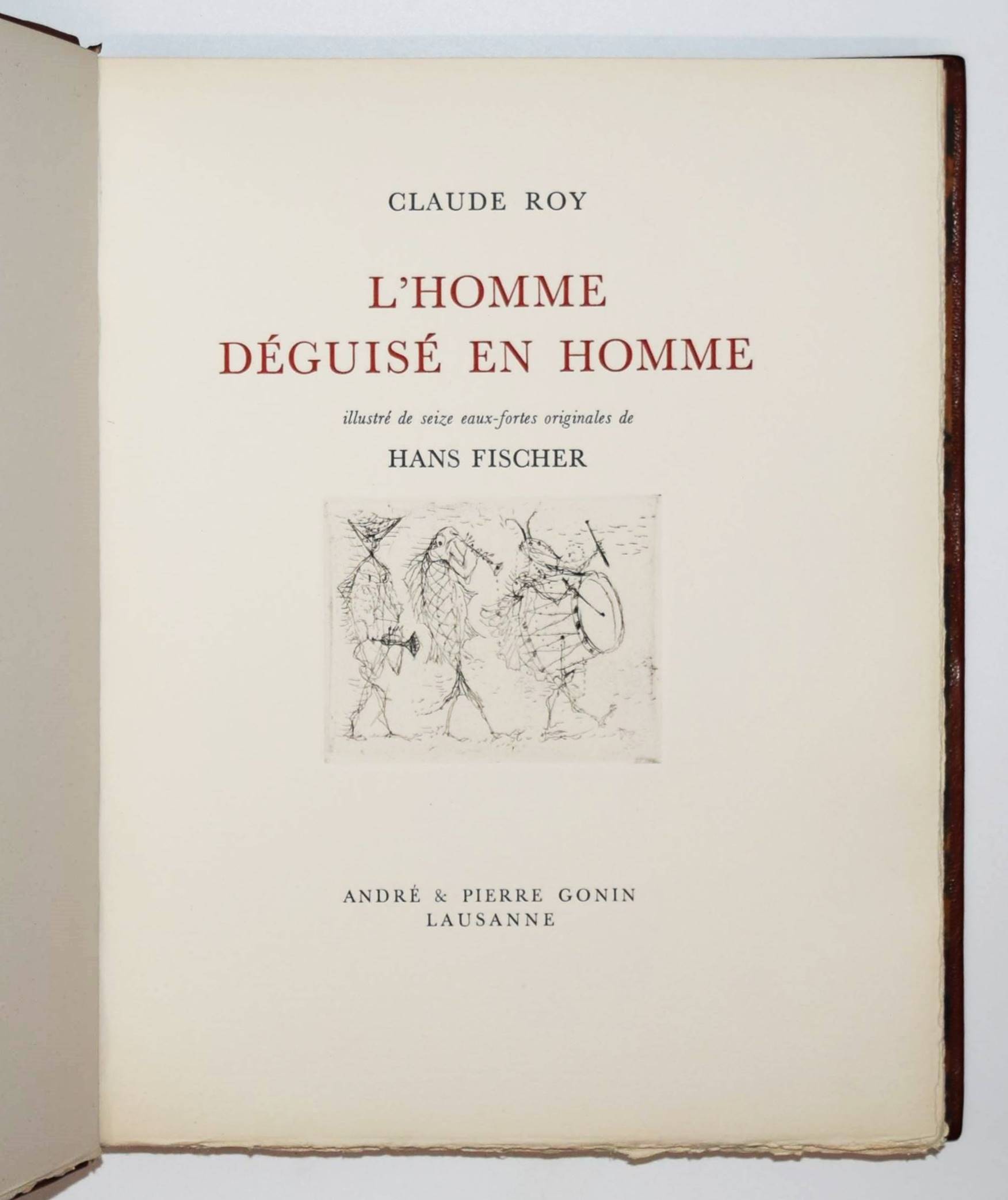 Roy, Claude. L’homme déguisé en homme. (Conte fantastique). Illustré de seize eaux-fortes originales de Hans Fischer. Lausanne, André & Pierre Gonin (1959). Folio (33 x 27 cm.). 148 S., [4] Bl. mit 16 Orig.-Kaltnadelradierungen von H. Fischer. Kalbslederband d. Zt. mit goldgepr. Rückentitel u. Linienverg. sowie Kopfgoldschnitt (Orig.-Umschlag beigebunden). Tiessen I, 48. – Eines von 200 num. Exemplaren auf ’Vélin d’Arches pur chiffon’ (GA 250). Im Impressum von P. Gonin signiert. – Druck der Radierungen von Reynold Disteli, Genf. – Die schönen Radierungen mit Karnevalsszenen aus Basel und Venedig, schuf der Schweizer Maler, Graphiker und Buchillustrator Hans Fischer, auch Fis genannt (1909-1958), erst kurz vor seinem Tod. Mit Nachworten von Bianca Fischer und C. Roy. – Schönes breitrandiges Exemplar in einem dekorativen Handeinband.