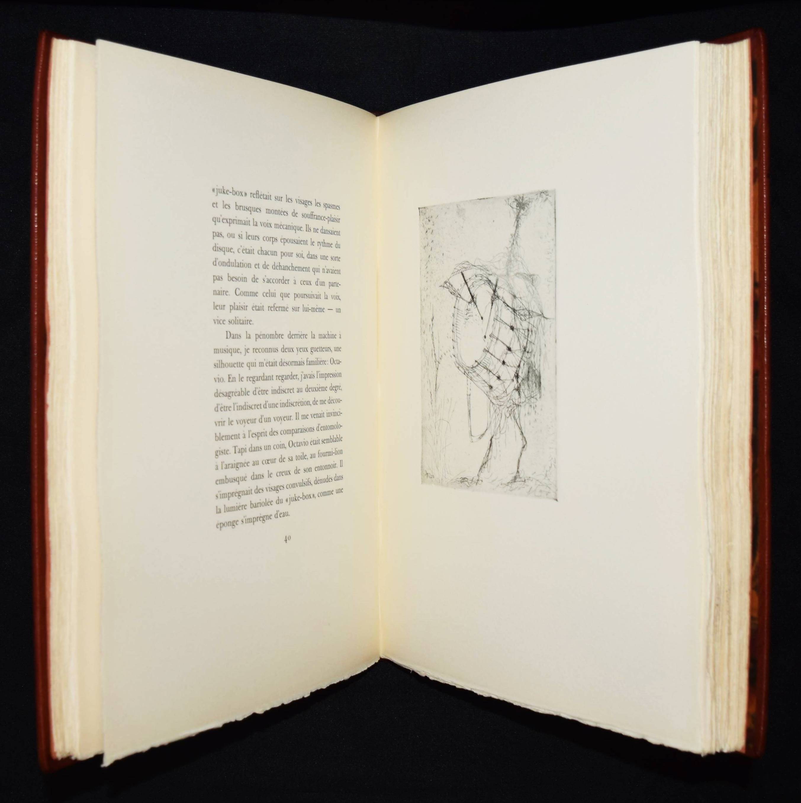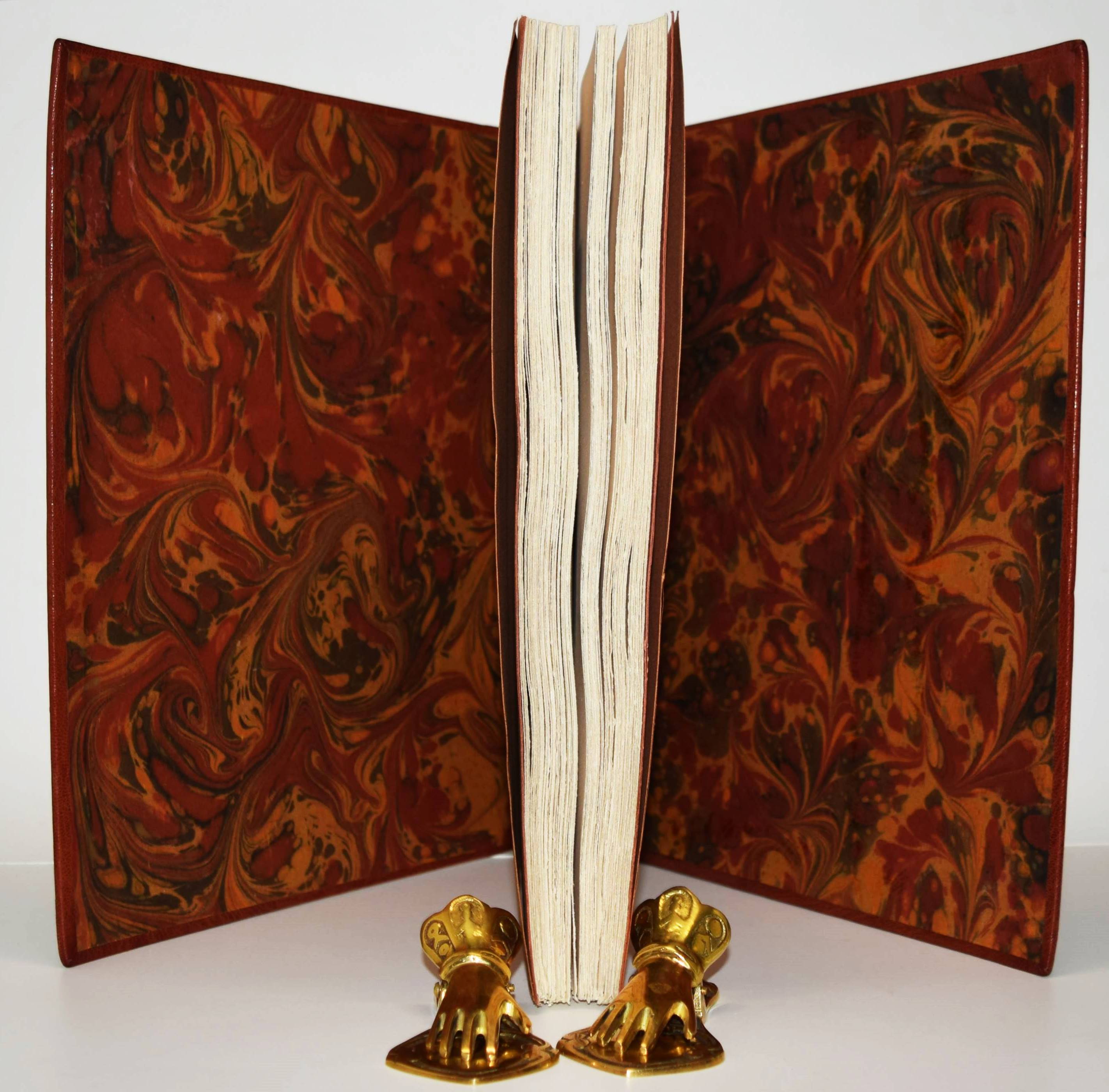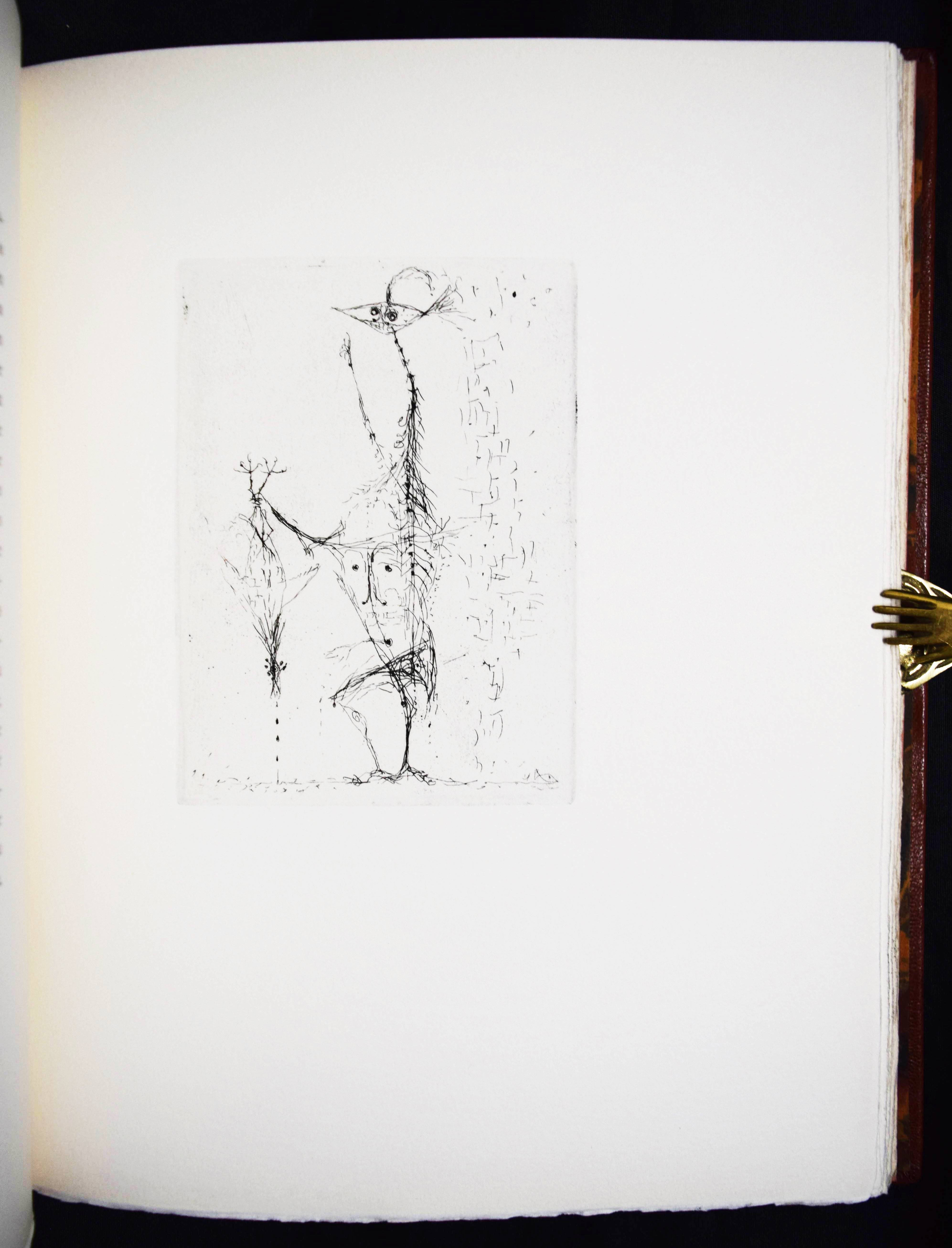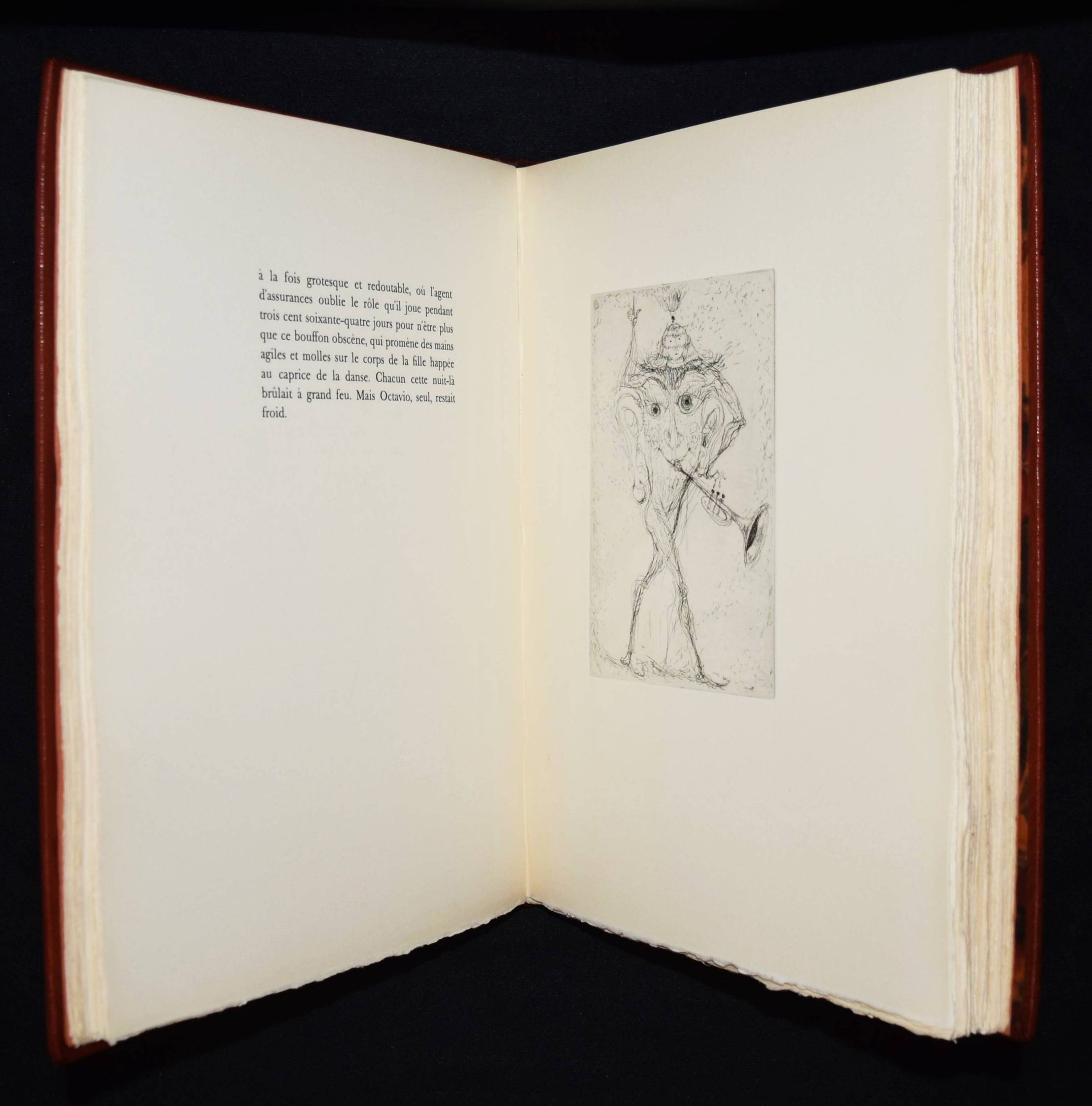 Roy, Claude. L’homme déguisé en homme. (Conte fantastique). Illustré de seize eaux-fortes originales de Hans Fischer. Lausanne, André & Pierre Gonin (1959). Folio (33 x 27 cm.). 148 S., [4] Bl. mit 16 Orig.-Kaltnadelradierungen von H. Fischer. Kalbslederband d. Zt. mit goldgepr. Rückentitel u. Linienverg. sowie Kopfgoldschnitt (Orig.-Umschlag beigebunden). Tiessen I, 48. – Eines von 200 num. Exemplaren auf ’Vélin d’Arches pur chiffon’ (GA 250). Im Impressum von P. Gonin signiert. – Druck der Radierungen von Reynold Disteli, Genf. – Die schönen Radierungen mit Karnevalsszenen aus Basel und Venedig, schuf der Schweizer Maler, Graphiker und Buchillustrator Hans Fischer, auch Fis genannt (1909-1958), erst kurz vor seinem Tod. Mit Nachworten von Bianca Fischer und C. Roy. – Schönes breitrandiges Exemplar in einem dekorativen Handeinband.