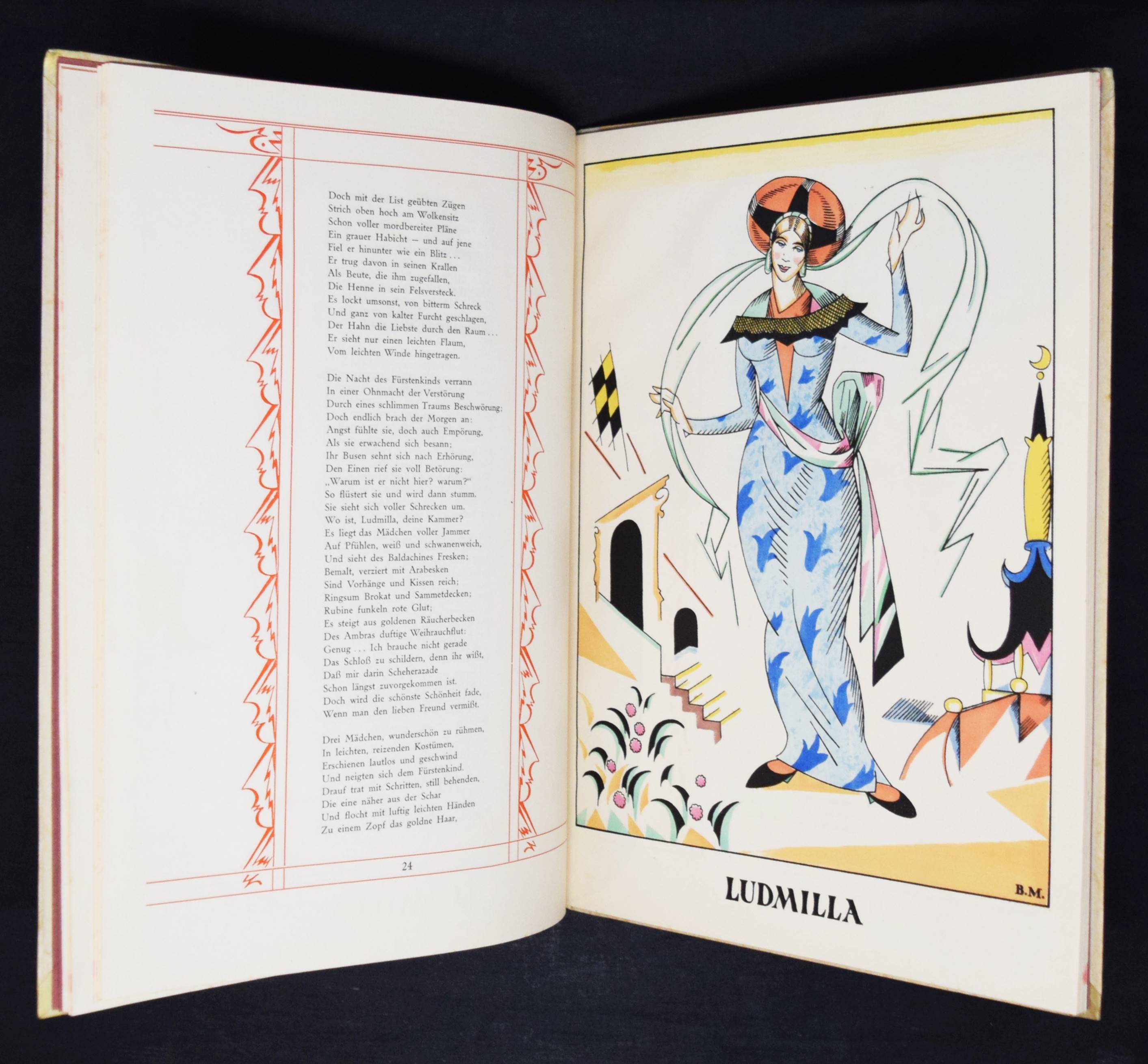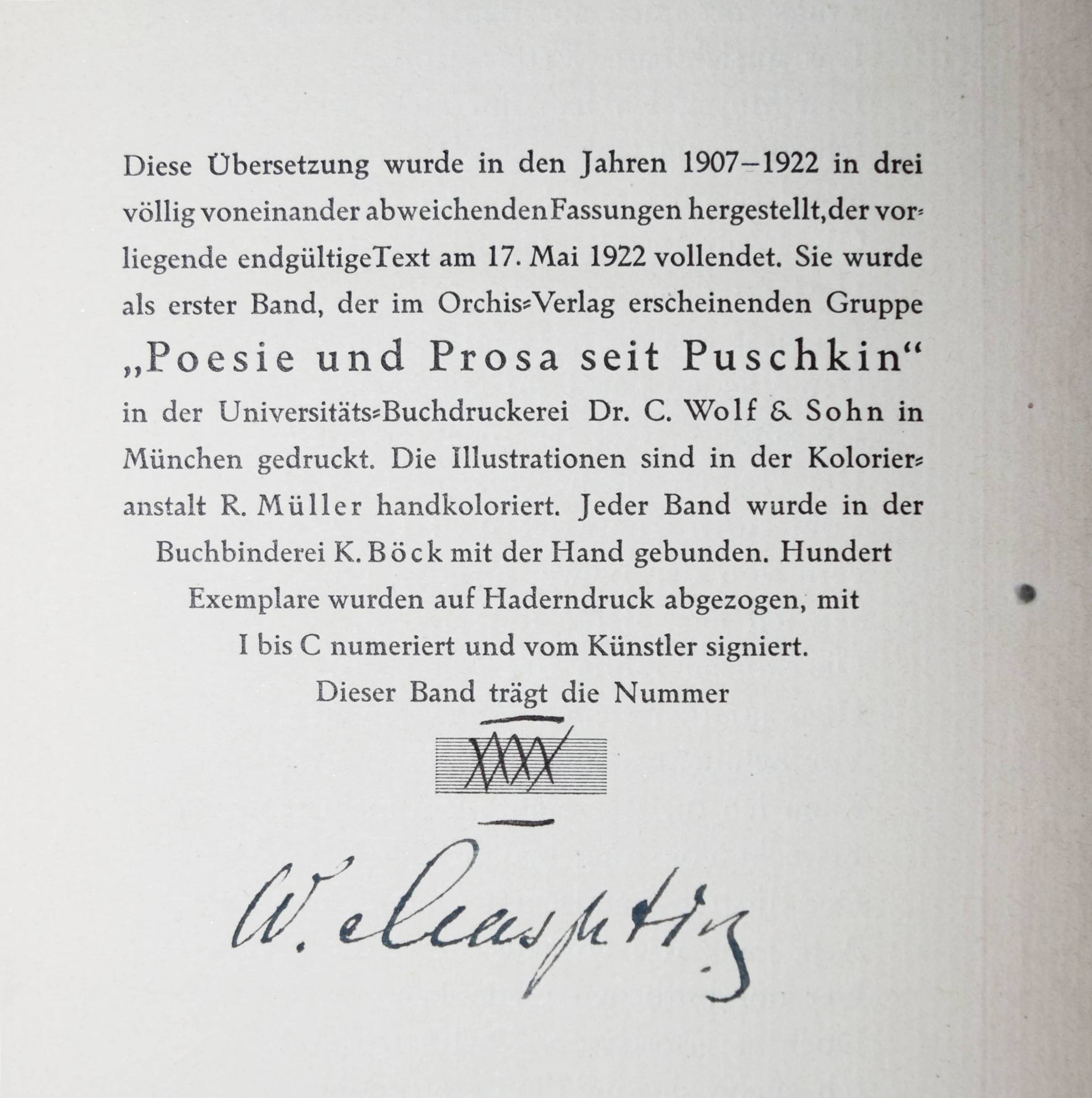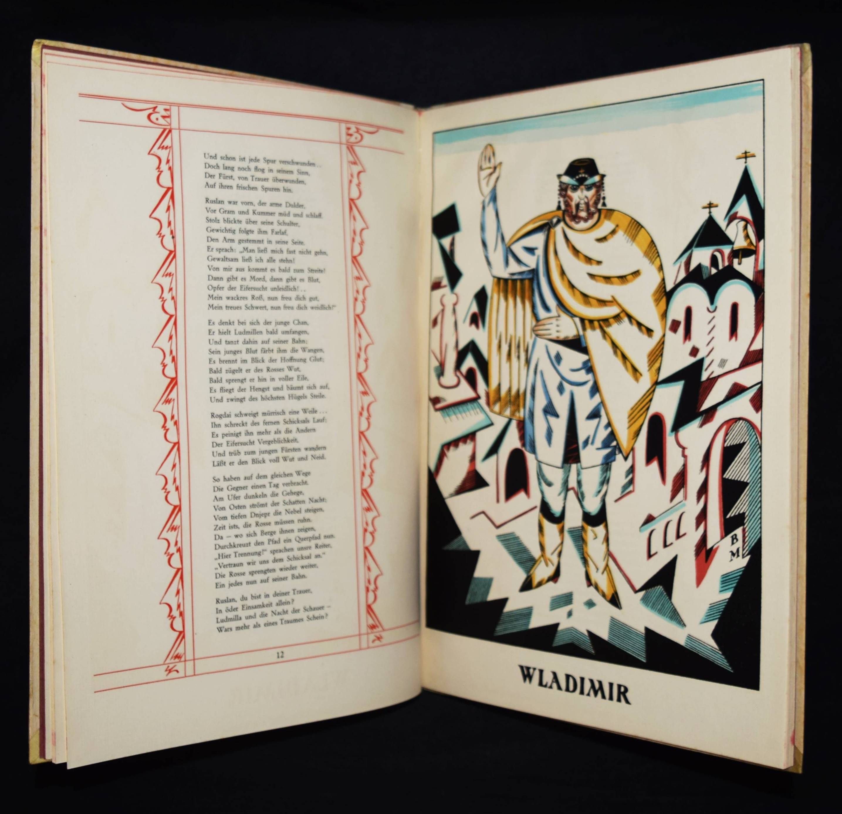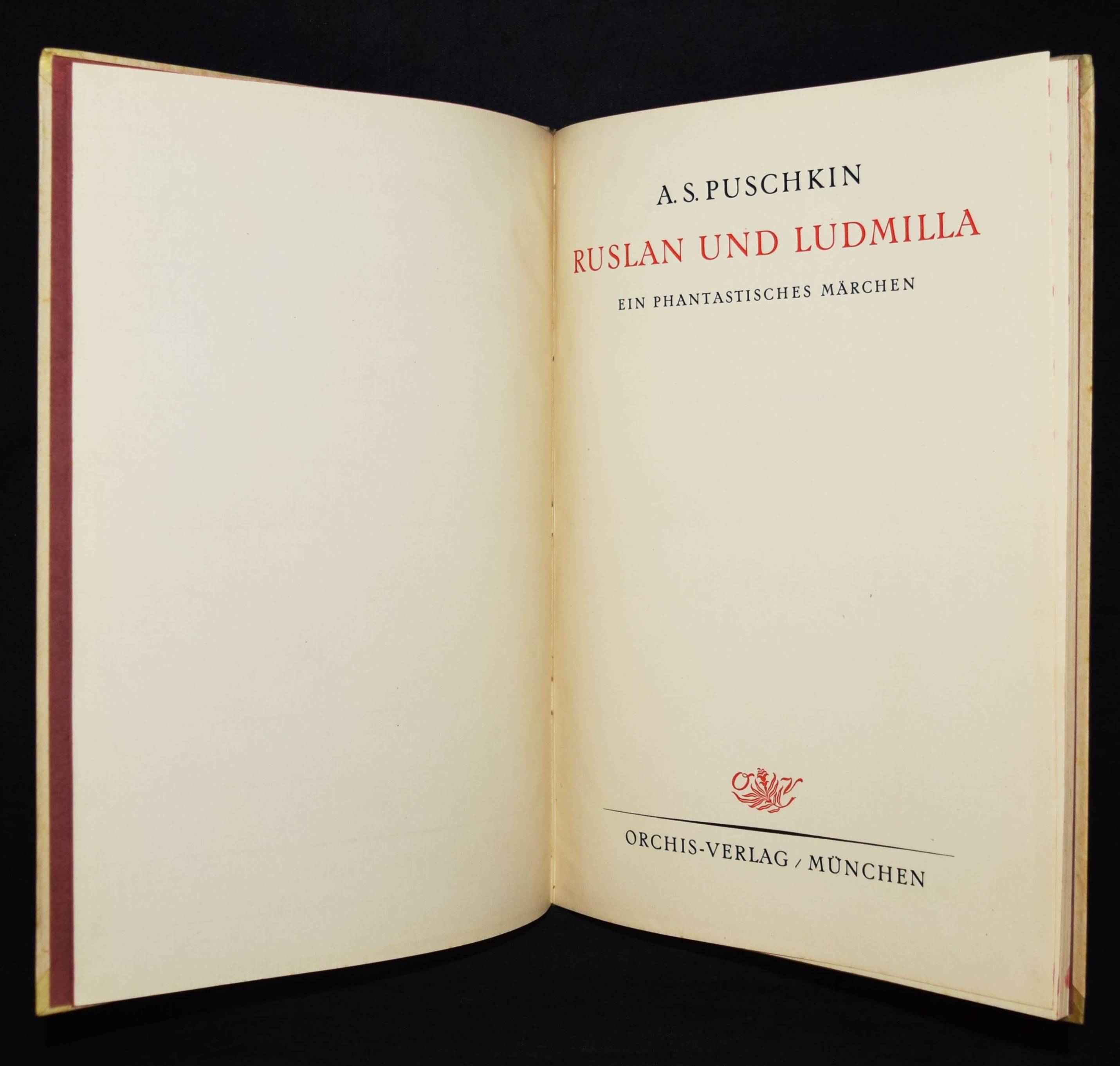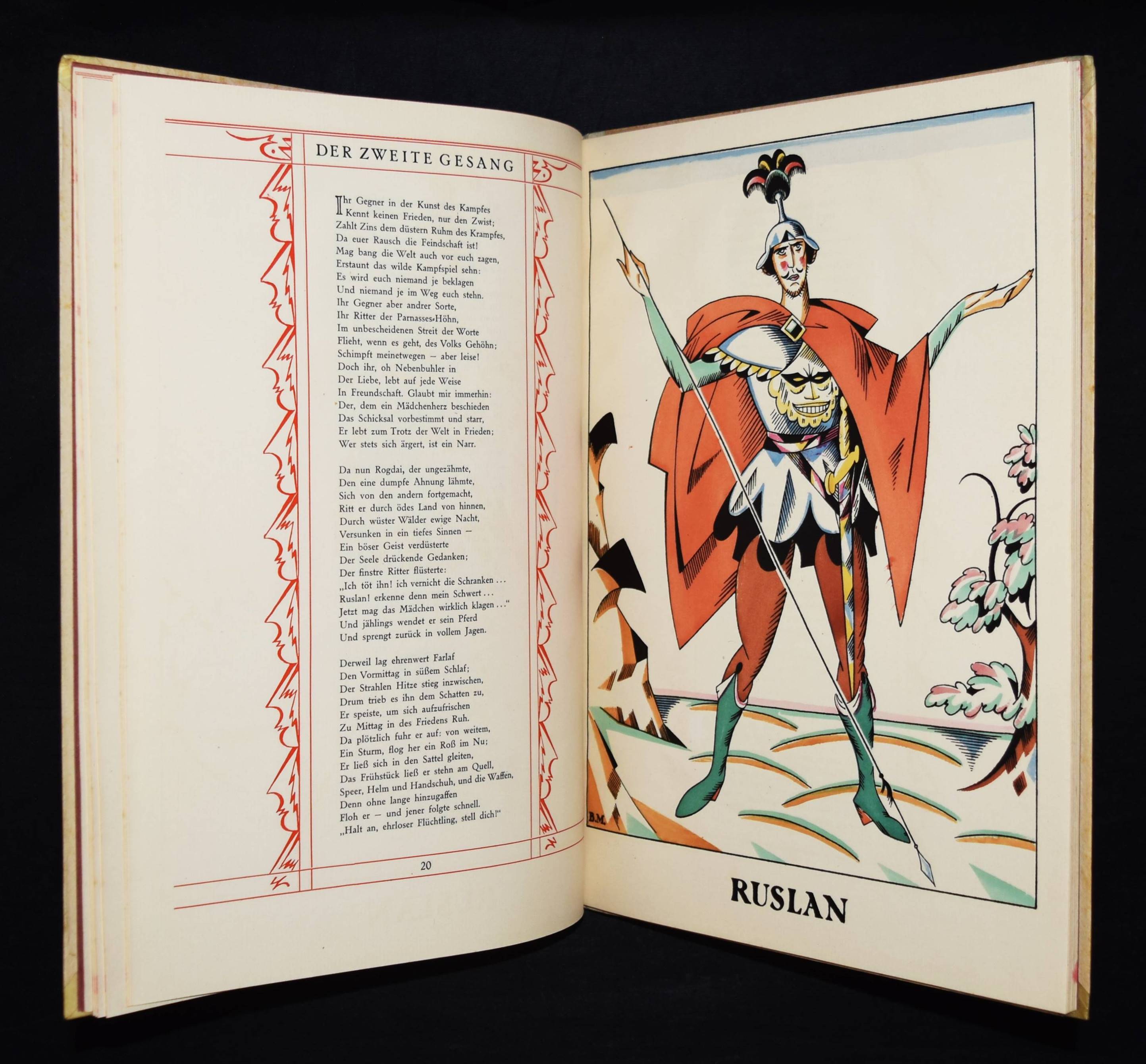 Puschkin, A(lexander) S(ergejewitsch). Ruslan und Ludmilla. Ein phantastisches Märchen. (Aus dem Russischen von Johannes v. Guenther. Titelzeichnung und Illustrationen von Wassilij Masjutin). München, Orchis-Verlag (1922). Gr.-4° (34 x 25 cm.). 67, (1) S. mit 9 ganzs. schablonenkolorierten Illustrationen und Buchschmuck. Orig.-Halbpergamentband mit handkol. Deckelvignette. (Poesie und Prosa seit Puschkin, Band 1). Kritter VIII/20. Oestmann 17 a. – Exemplar XXXX von 100 der römisch nummerierten Exemplaren der Vorzugsausgabe auf Hadernbütten. – Im Druckvermerk vom Künstler signiert und nummeriert. – Gedruckt und koloriert nach Holzschnitten des Künstlers. – Wassili Nikolajewitsch Masjutin (1884-1955) studierte an der Schule für Malerei, Bildhauerei und Baukunst in Moskau, zeitweise gemeinsam mit Majakowski und Burljuk. Nach der Revolution emigrierte er über Riga 1922 nach Berlin. – Deckel geringfügig braunfleckig u. angestaubt, schönes Exemplar.
