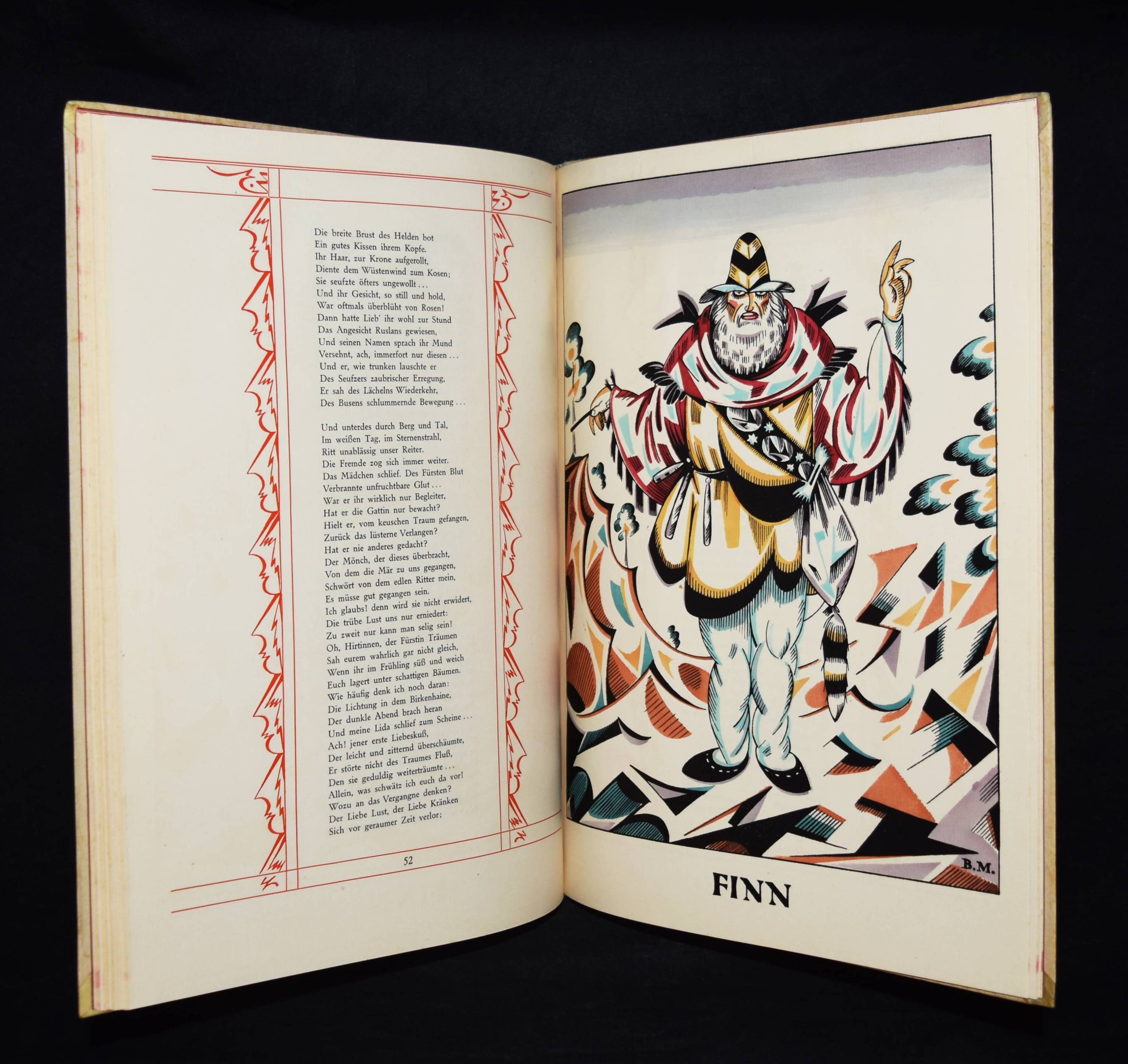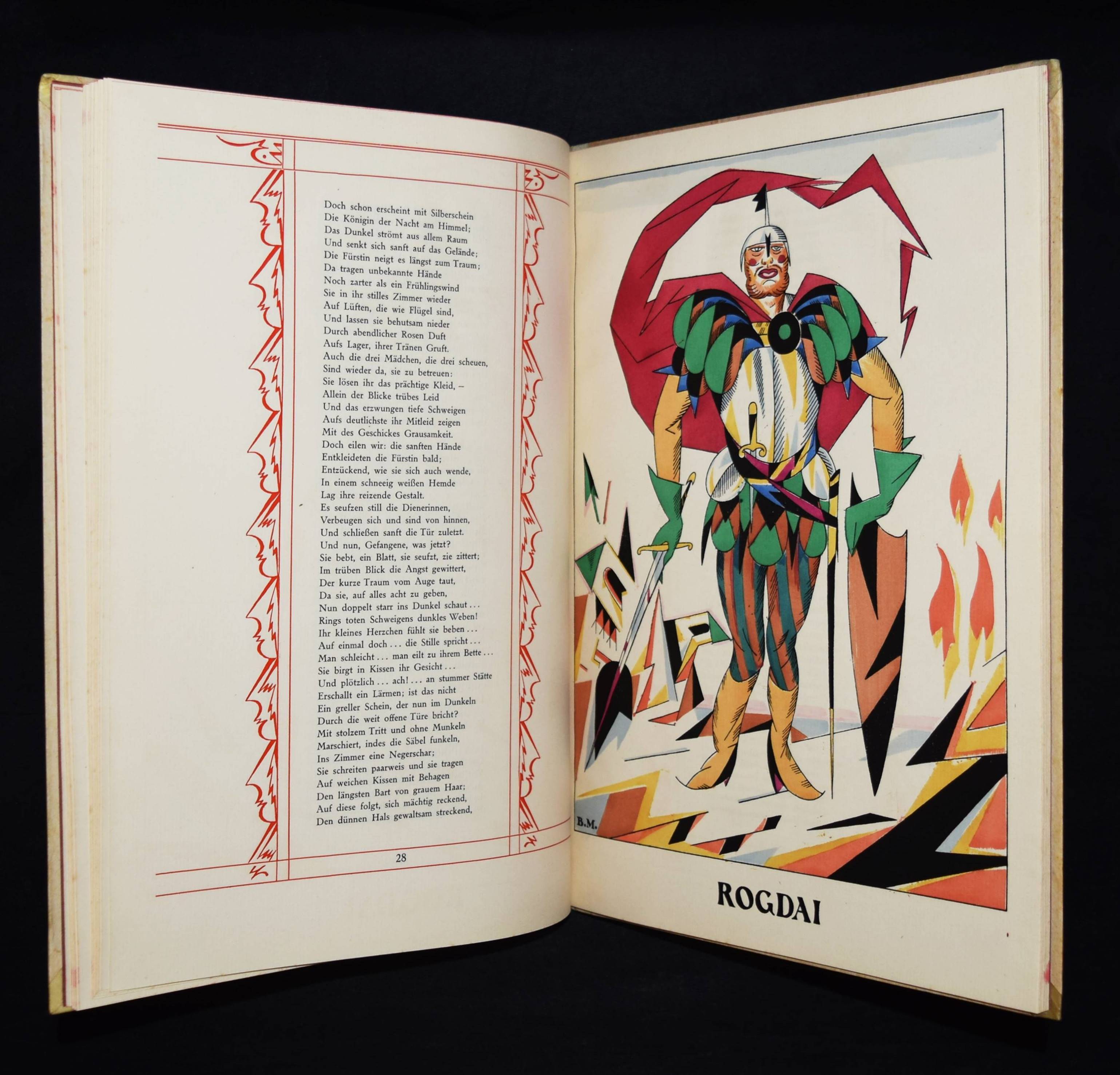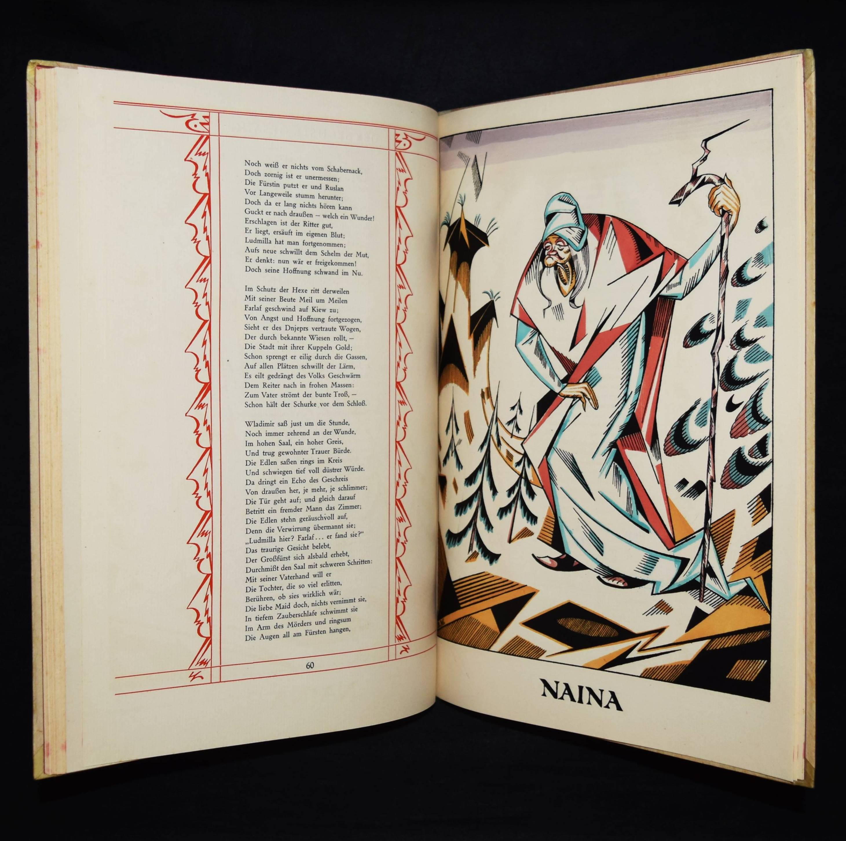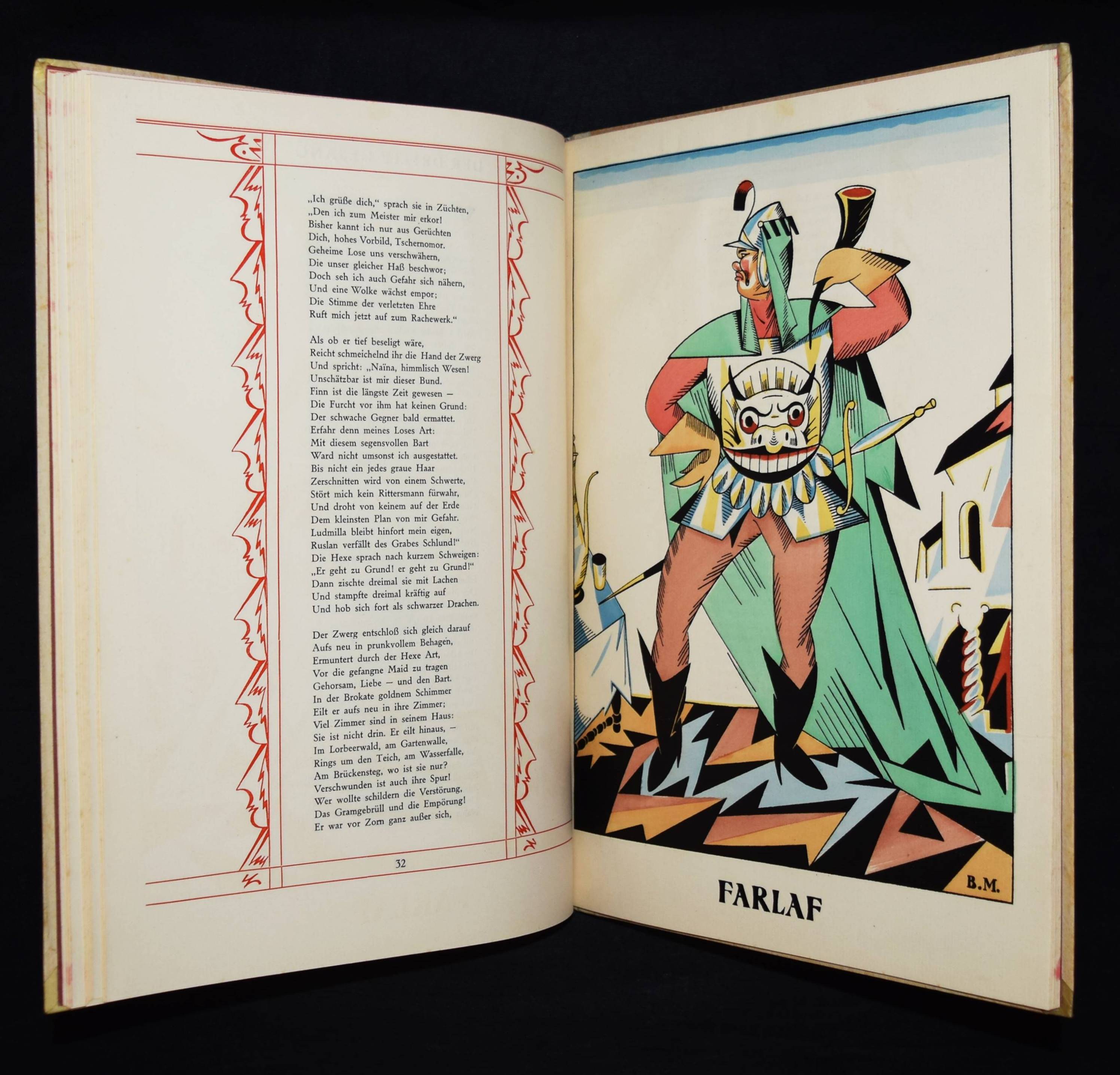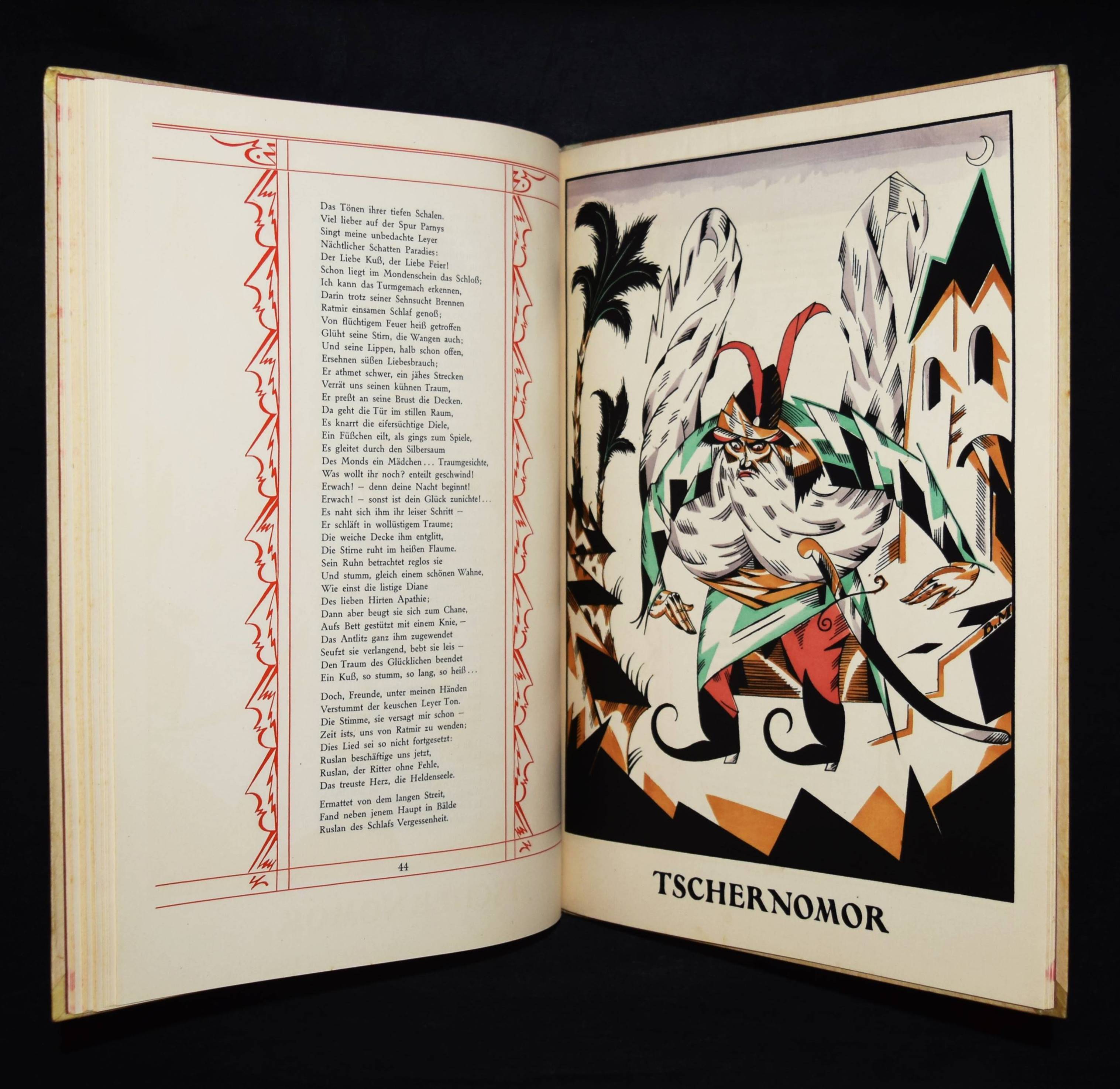 Puschkin, A(lexander) S(ergejewitsch). Ruslan und Ludmilla. Ein phantastisches Märchen. (Aus dem Russischen von Johannes v. Guenther. Titelzeichnung und Illustrationen von Wassilij Masjutin). München, Orchis-Verlag (1922). Gr.-4° (34 x 25 cm.). 67, (1) S. mit 9 ganzs. schablonenkolorierten Illustrationen und Buchschmuck. Orig.-Halbpergamentband mit handkol. Deckelvignette. (Poesie und Prosa seit Puschkin, Band 1). Kritter VIII/20. Oestmann 17 a. – Exemplar XXXX von 100 der römisch nummerierten Exemplaren der Vorzugsausgabe auf Hadernbütten. – Im Druckvermerk vom Künstler signiert und nummeriert. – Gedruckt und koloriert nach Holzschnitten des Künstlers. – Wassili Nikolajewitsch Masjutin (1884-1955) studierte an der Schule für Malerei, Bildhauerei und Baukunst in Moskau, zeitweise gemeinsam mit Majakowski und Burljuk. Nach der Revolution emigrierte er über Riga 1922 nach Berlin. – Deckel geringfügig braunfleckig u. angestaubt, schönes Exemplar.