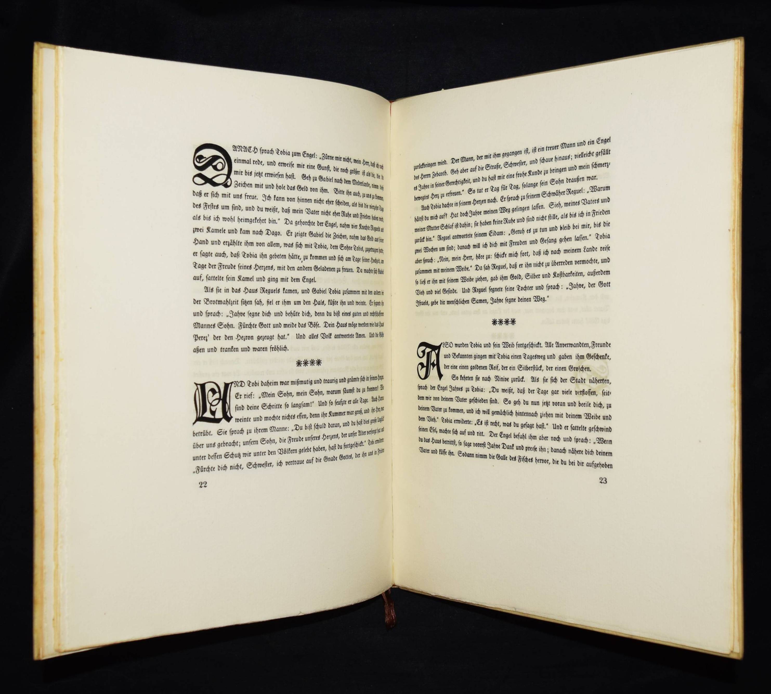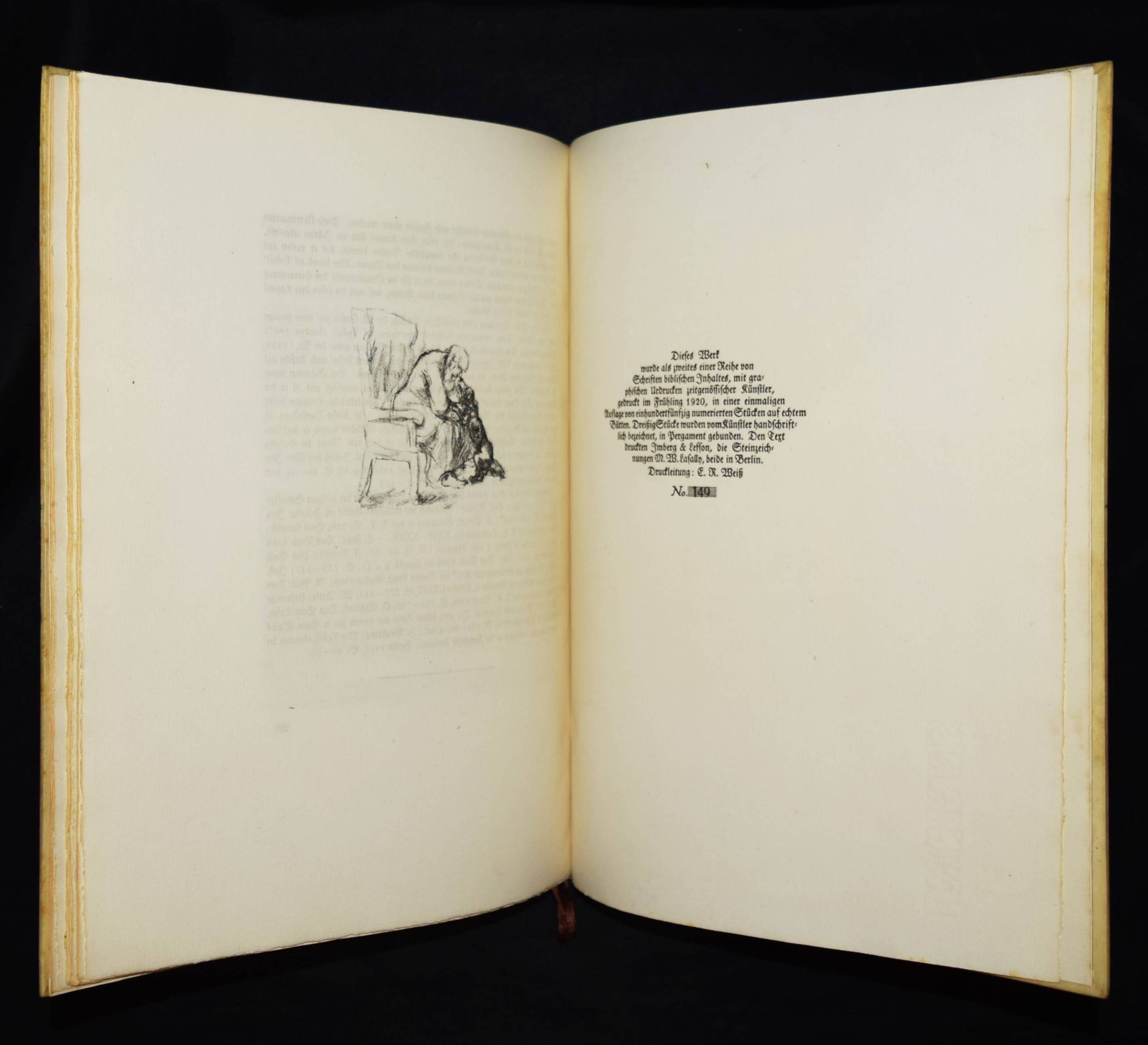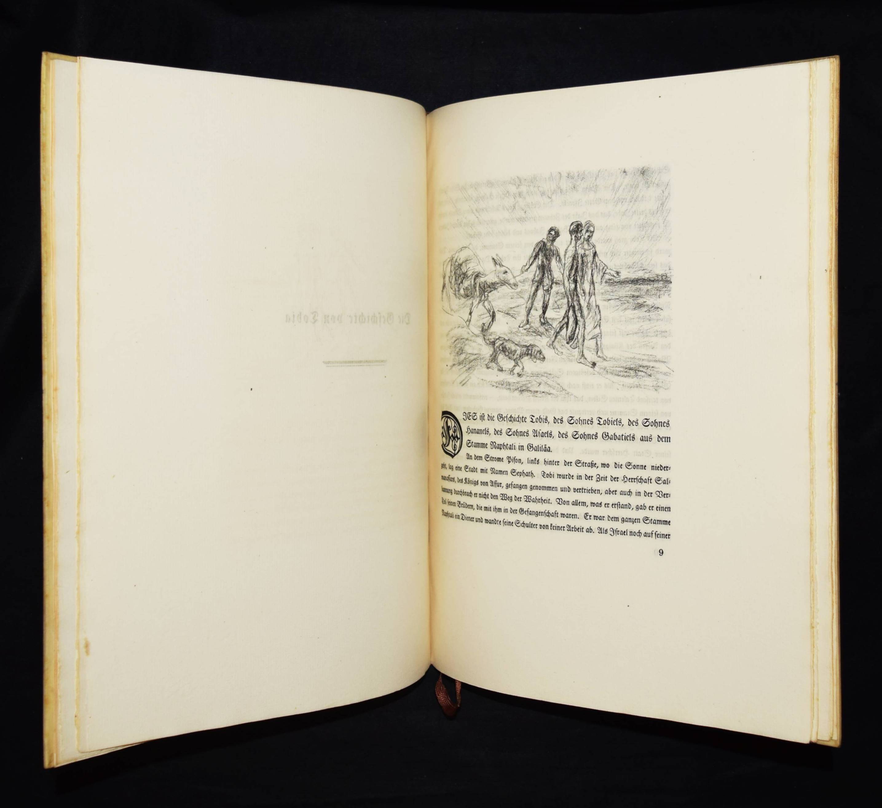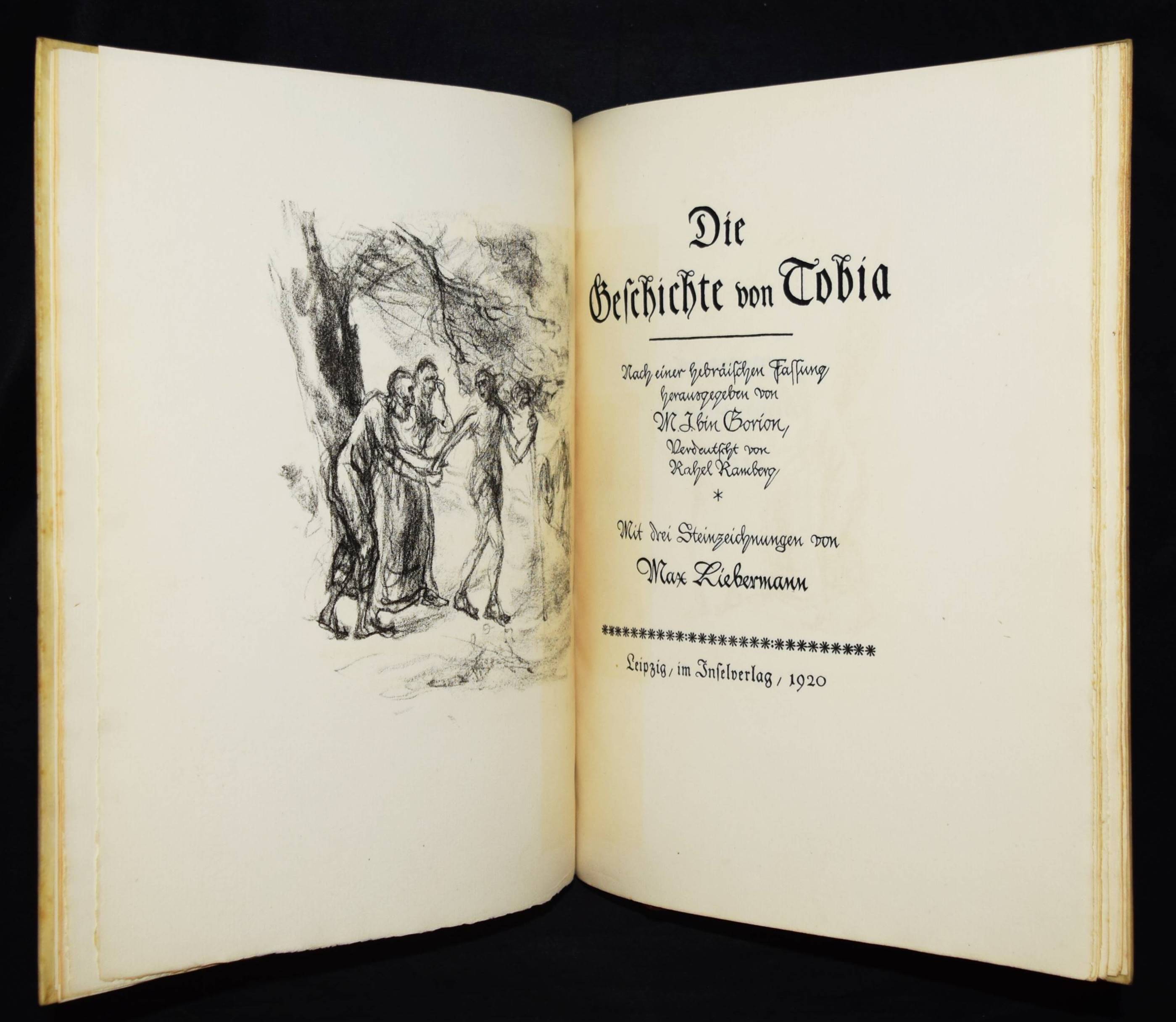 Gorion, M. J. bin (Hrsg.). Die Geschichte von Tobia. Nach einer hebräischen Fassung herausgegeben. Verdeutscht von Rahel Ramberg. Mit drei Steinzeichnungen von Max Liebermann. Leipzig, Insel Verlag (Anton Kippenberg) 1920. Folio (33 x 27 cm.). 29 S., [1] Bl. mit 3 (1 ganzs.) Orig.-Lithographien. OPrgt. mit Rücken- u. Deckeltitel u. Kopfgoldschnitt (Entwurf: E(mil) R(udolf) Weiß). Lang I, 111. Sarkowski 522. Schiefler 310–312. – Eines von 150 Exemplaren auf ZVG-Bütten. Wie die 30 Exemplare der signierten Vorzugsausgabe hier in Ganzpergament gebunden. – Der Text wurde von Imberg & Lesson gedruckt, die Lithographien von M. W. Lassally, beide Berlin, die Druckleitung lag bei Emil Rudolf Weiß. – Einband leicht fleckig, schönes Exemplar.