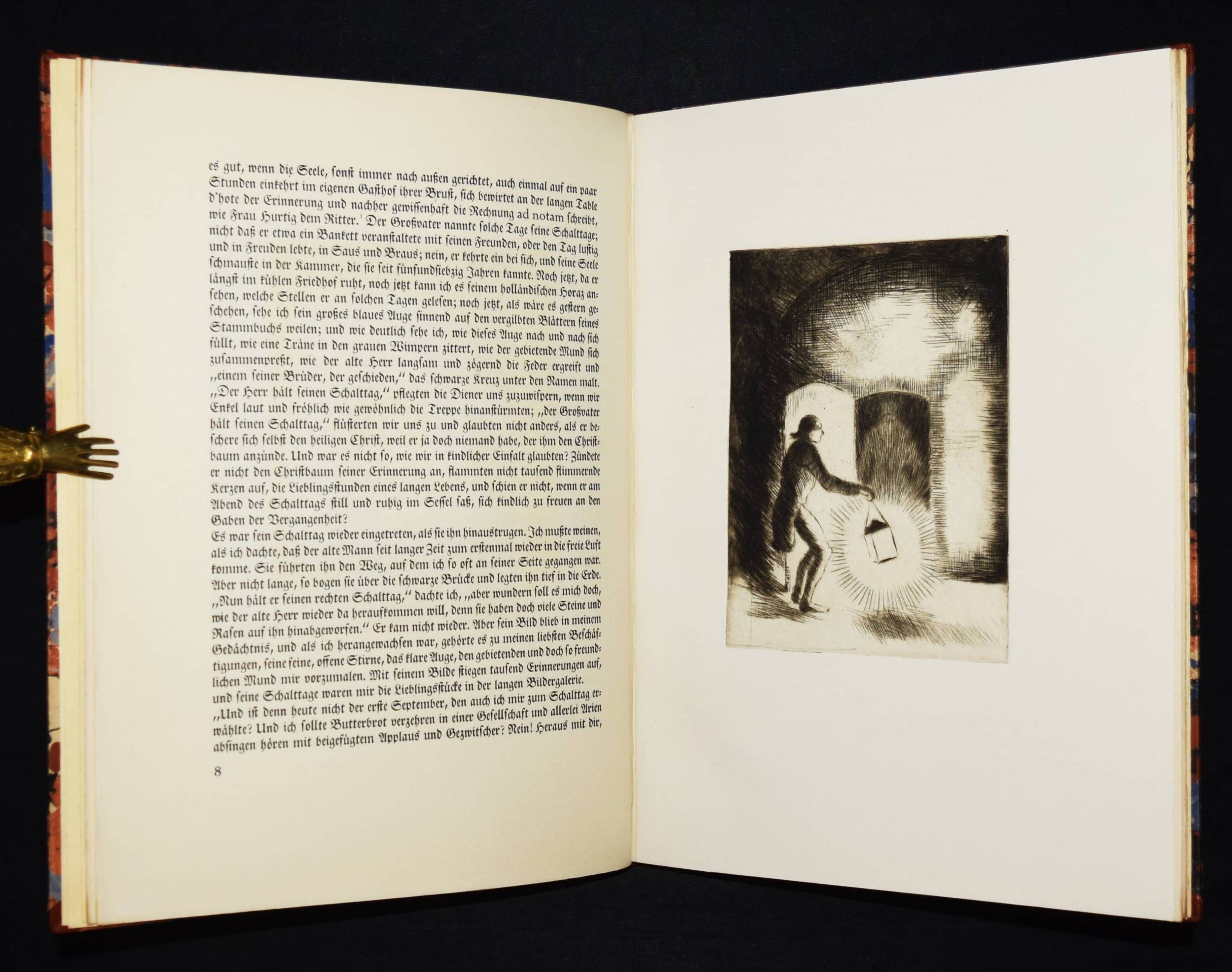 Hauff, Wilhelm. Phantasien im Bremer Ratskeller. Ein Herbstgeschenk für Freunde des Weins. Mit acht Originalradierungen von Ernst Wetzenstein. Weimar, Martin Biewald (1920). Gr.-4° (32,5 x 24,5 cm.). 44 S. mit 8 Orig.-Radierungen. OHldr. mit goldgepr. Rückenschild. Vollmer V, 120. – Eines von 200 num. Exemplaren auf Van Geldern Bütten. – Sehr gutes sauberes Exemplar.
