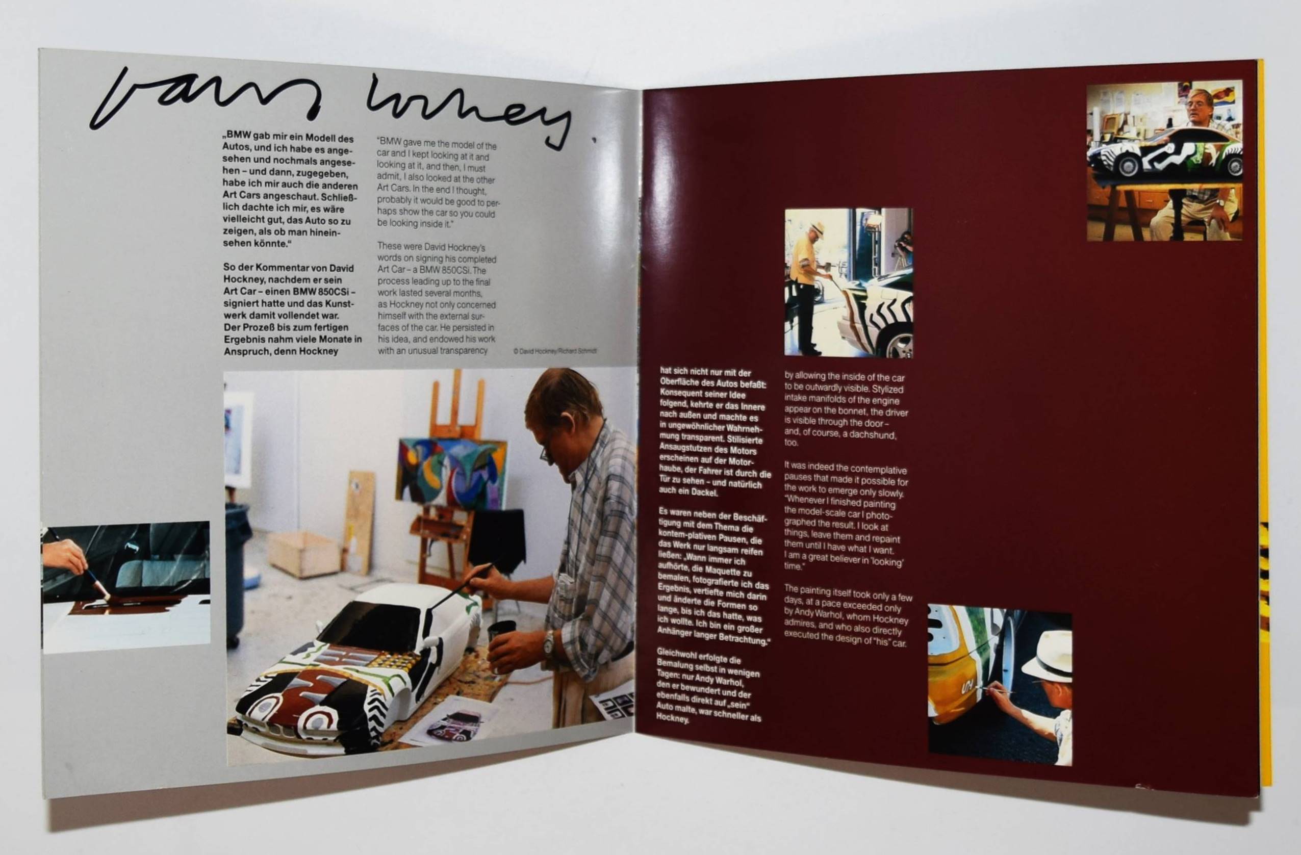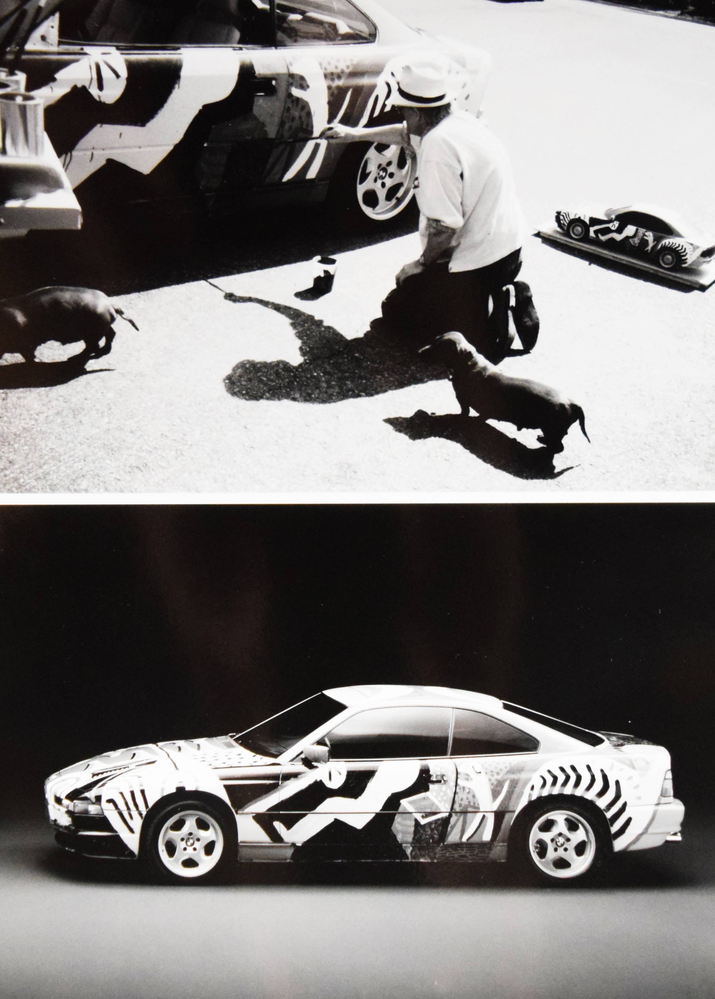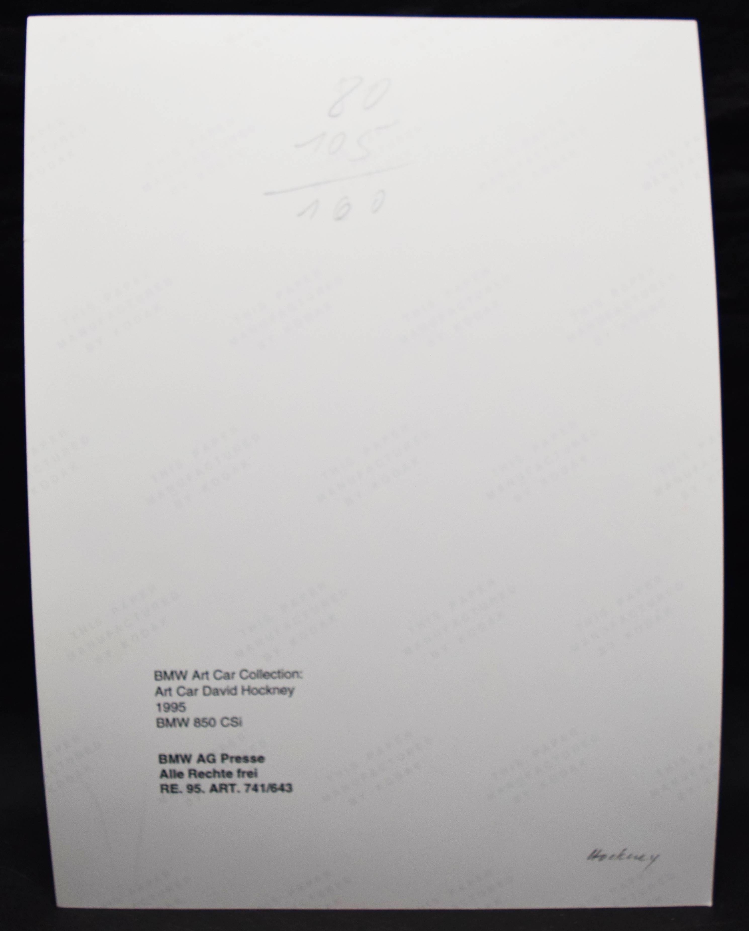 Hockney, David (geb. 1937, britischer Maler, Grafiker, Bühnenbildner und Fotograf). 2 Orig.-Farbphotographien und 1 Schwarzweißphotographie auf Kodak-Papier. Los Angeles, BMW AG 1995. Jeweils ca. 24 x 18 cm. Pressefotos anlässlich der Auftragsarbeit eines BMW 850 CSi, BMW Art Car 1995. Die beiden Farbfotos mit Porträts des Künstlers; der Schwarzweissabzug zeigt den Künstler beim Bemalen des Autos und das bemalte Fahrzeug. Die 1975 auf Anregung des Rennfahrers Hervé Poulain entstandene „Kunstsammlung“ der BMW Art Cars umfasst Auto-Kunstwerke von A. Calder, R. Liechtenstein, F. Stella, E. Fuchs, A. R. Penck u. a. – Hockneys „Palette reicht bis zu Bühnenbildern, Autolackierungen und Kunstwerken mit Fax- oder Multimedia-Medien. Alleine diese Vielfalt der Medien lässt eine Begeisterung Hockneys für Technologie erkennen“ (Wikipedia). – „Das Automobil sei schöner als die Nike von Samothrake, behaupteten die italienischen Futuristen am Anfang dieses Jahrhunderts. Jetzt, fast neunzig Jahre später, steht diese Behauptung einmal mehr auf dem Prüfstand. Ist das industriell gefertigte Auto an sich schon ein Kunstwerk, oder läßt erst der Eingriff des Künstlers, wie David Hockney, die Industrieform zum Kunstwerk werden?“ (U. Luckhardt in der beil. Presse-Mittelung).