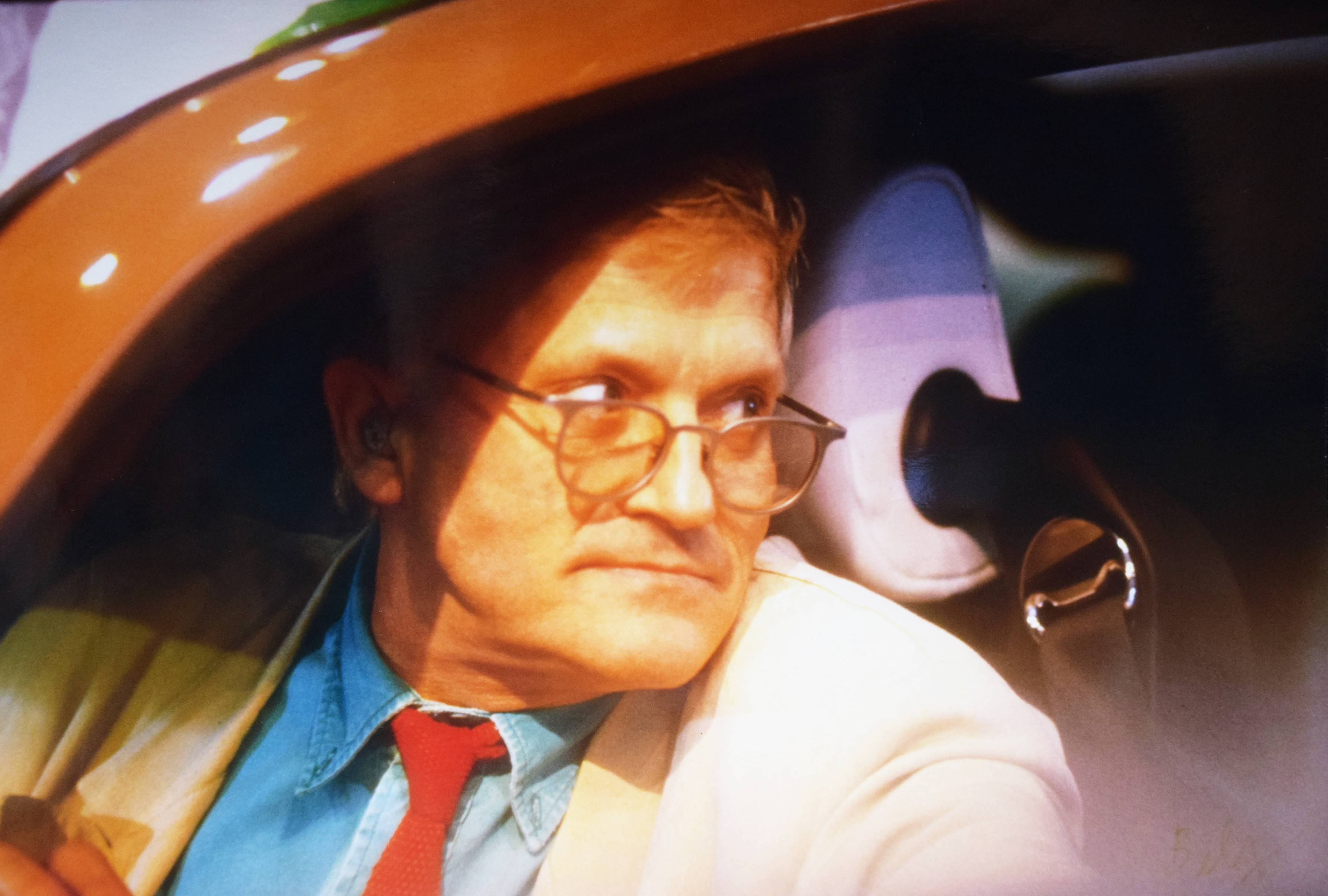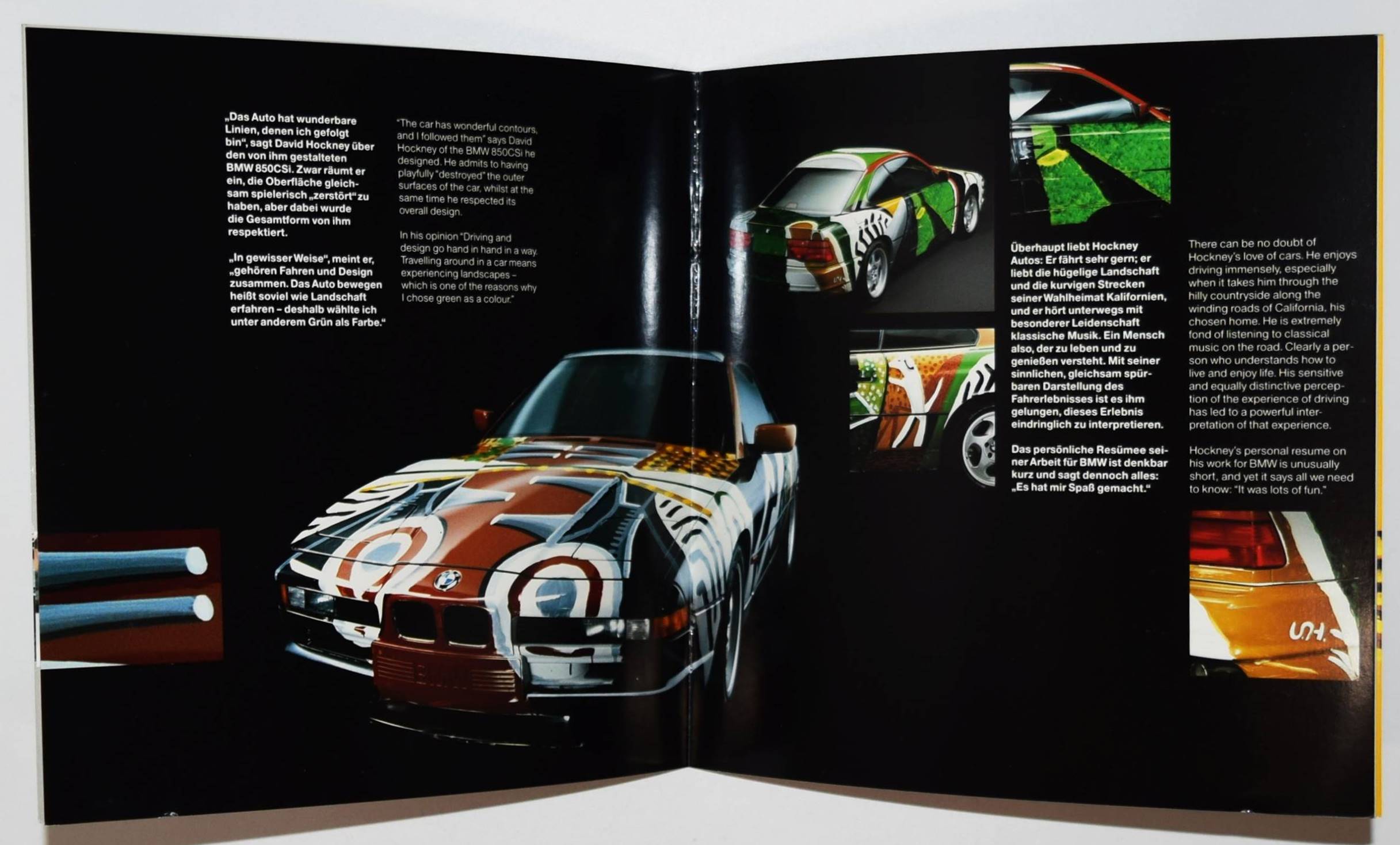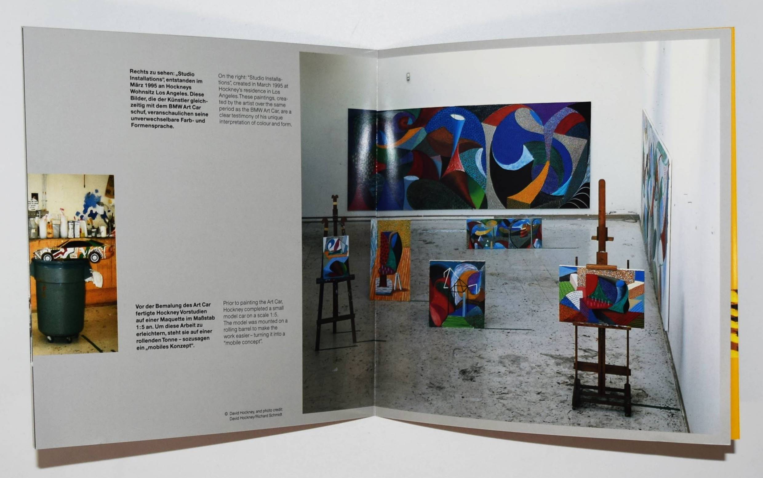Hockney, David (geb. 1937, britischer Maler, Grafiker, Bühnenbildner und Fotograf). 2 Orig.-Farbphotographien und 1 Schwarzweißphotographie auf Kodak-Papier. Los Angeles, BMW AG 1995. Jeweils ca. 24 x 18 cm. Pressefotos anlässlich der Auftragsarbeit eines BMW 850 CSi, BMW Art Car 1995. Die beiden Farbfotos mit Porträts des Künstlers; der Schwarzweissabzug zeigt den Künstler beim Bemalen des Autos und das bemalte Fahrzeug. Die 1975 auf Anregung des Rennfahrers Hervé Poulain entstandene „Kunstsammlung“ der BMW Art Cars umfasst Auto-Kunstwerke von A. Calder, R. Liechtenstein, F. Stella, E. Fuchs, A. R. Penck u. a. – Hockneys „Palette reicht bis zu Bühnenbildern, Autolackierungen und Kunstwerken mit Fax- oder Multimedia-Medien. Alleine diese Vielfalt der Medien lässt eine Begeisterung Hockneys für Technologie erkennen“ (Wikipedia). – „Das Automobil sei schöner als die Nike von Samothrake, behaupteten die italienischen Futuristen am Anfang dieses Jahrhunderts. Jetzt, fast neunzig Jahre später, steht diese Behauptung einmal mehr auf dem Prüfstand. Ist das industriell gefertigte Auto an sich schon ein Kunstwerk, oder läßt erst der Eingriff des Künstlers, wie David Hockney, die Industrieform zum Kunstwerk werden?“ (U. Luckhardt in der beil. Presse-Mittelung).