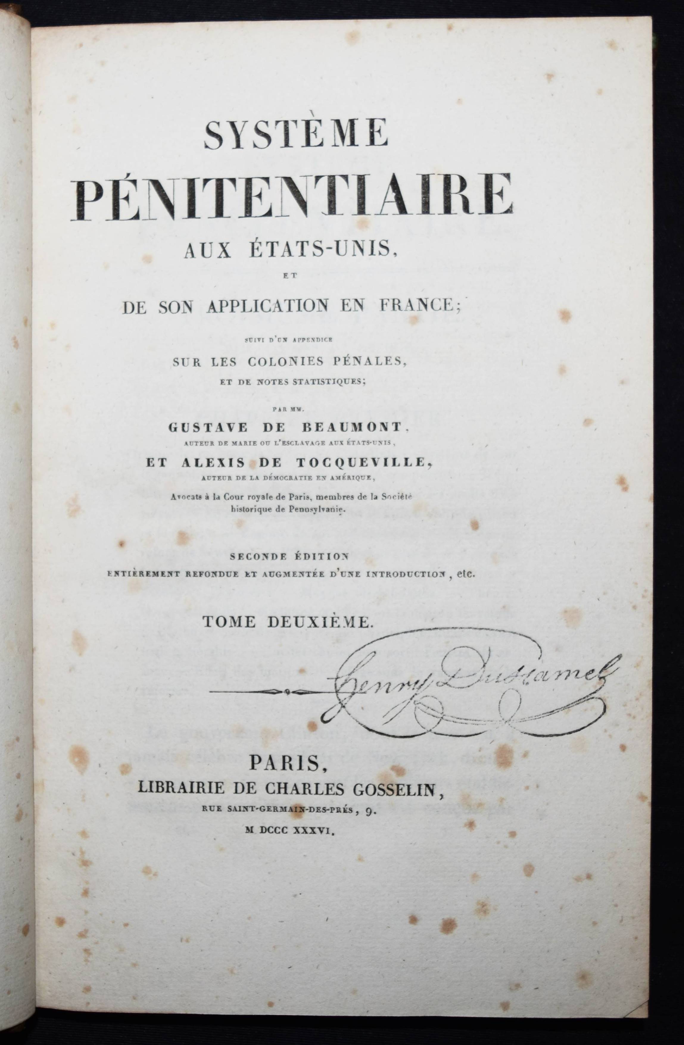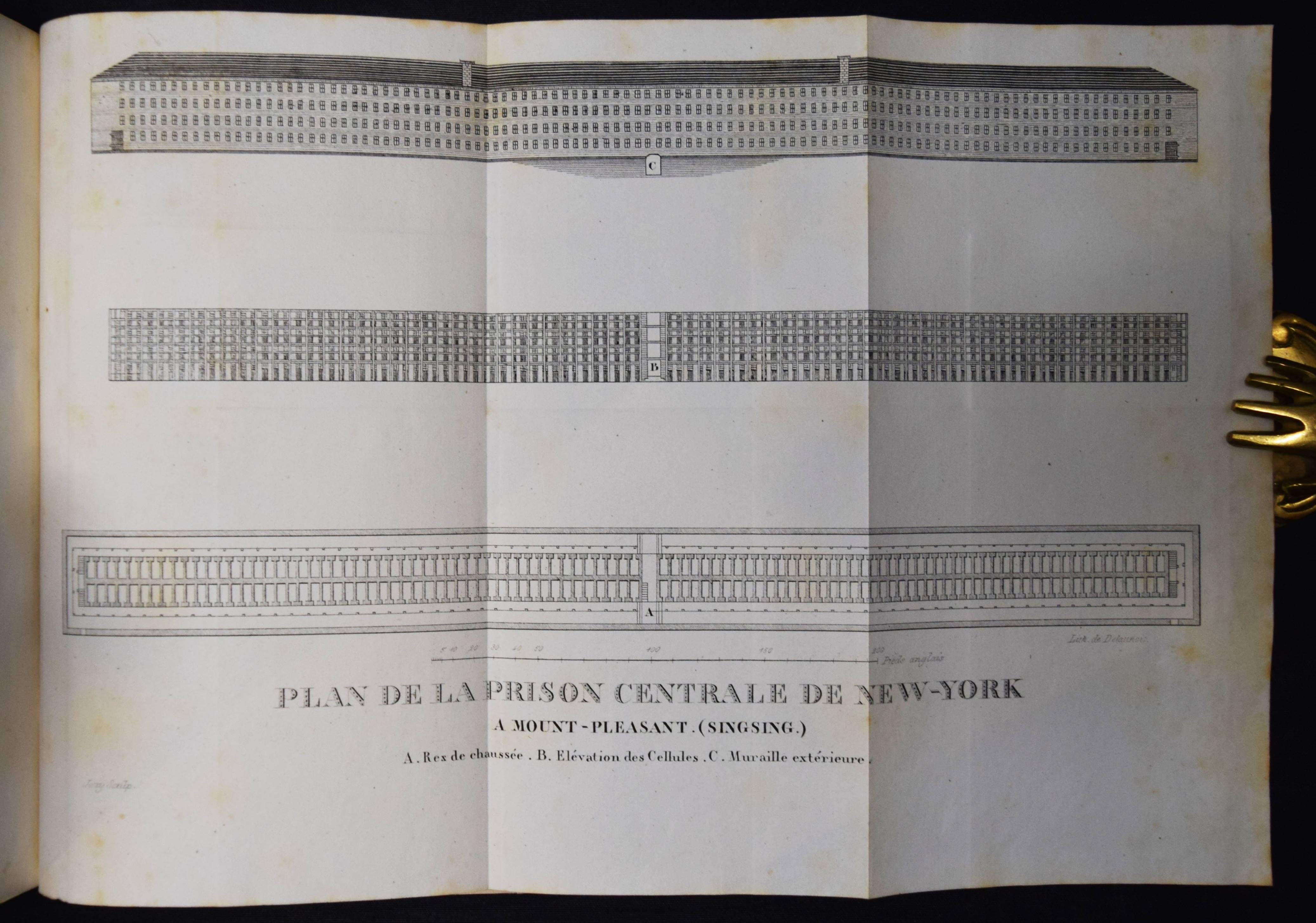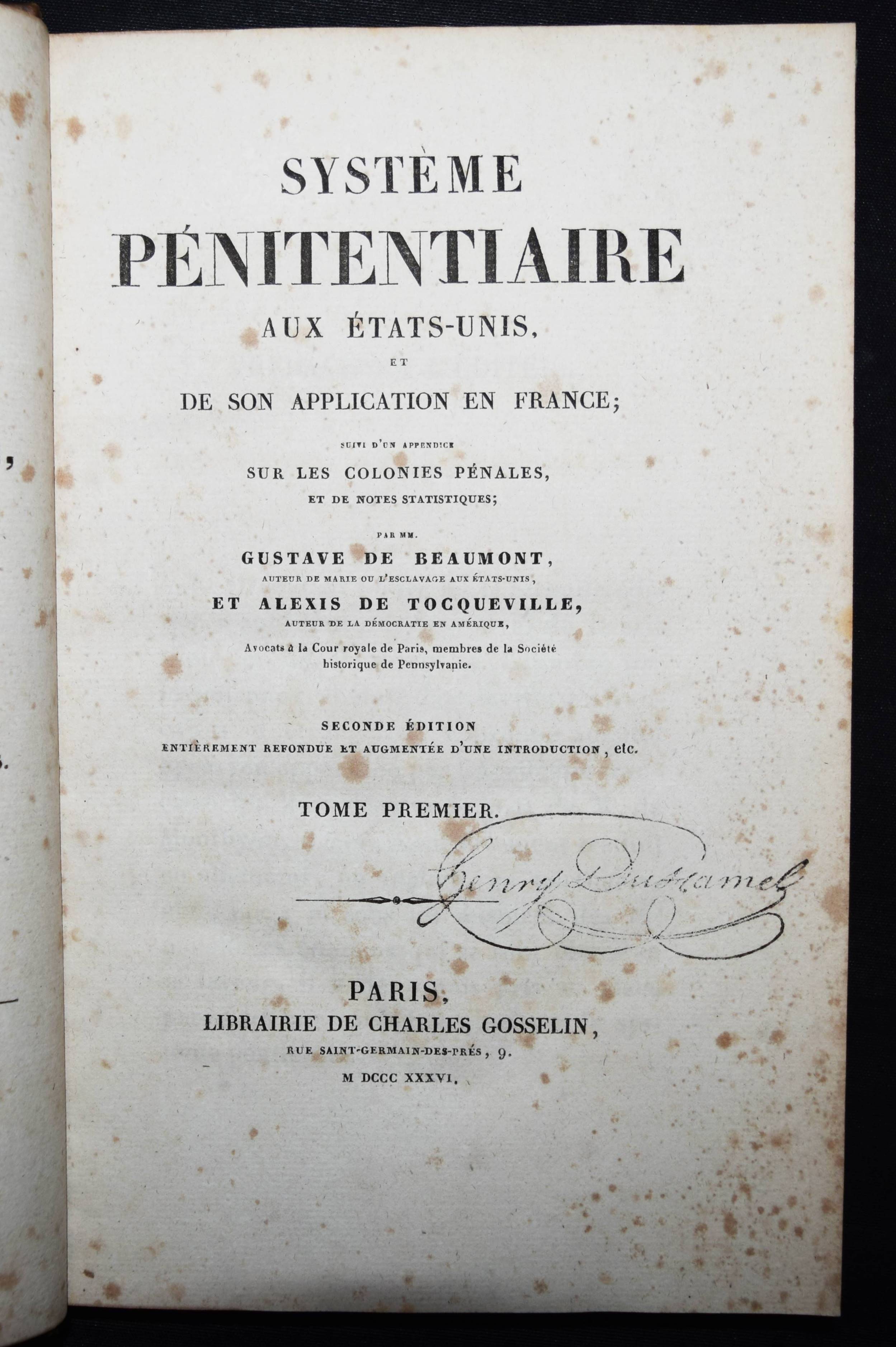 Beaumont, Gustave de et Alexis de Tocqueville. Système pénitentiaire aux Etats-Unis et de son application en France. Séconde Édition, entièrement refondue et augmentée d’une introduction, etc. 2 Bände. Paris, Charles Gosselin 1836. 8°. [2] Bl., 394 S., 1 w. Bl.; [2] Bl., 374 S. mit 5 (3 gefalt.) lithogr. Tafeln. Hldr. d. Zt. mit goldgepr. Rückensch. u. dezenter Rückenvergoldung. Goldsmith 28184. Sabin 4190. – Zweite überarbeitete Ausgabe des grundlegenden Werks über das amerikanische Strafvollzugssystem, massgeblich auch für die Reform des französischen Gefängsniswesens. Die erste Ausgabe erschien 1833. – Die Tafeln mit Grundrissen und Ansichten von Strafanstalten, darunter auch Sing Sing. – Gelenke berieben und stellenweise angeplatzt, Rücken von Band II mit Brandfleck, durchgehend stockfleckig, sonst gutes Exemplar aus der Bibliothek von Baron James Mayer de Rothschild (1792-1868), Gründer des französischen Zweigs der prominenten Bankiers-Familie mit dessen Exlibris.