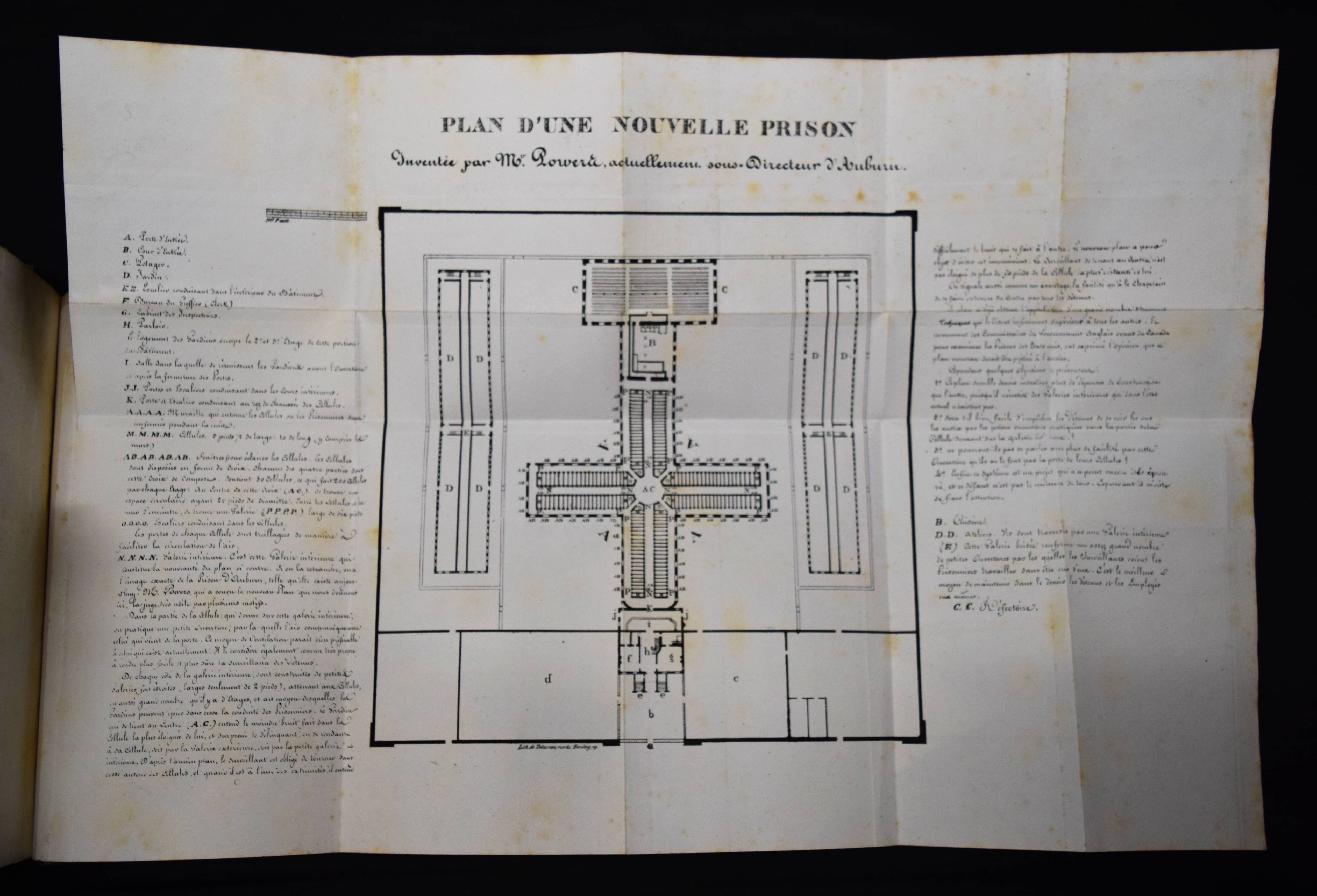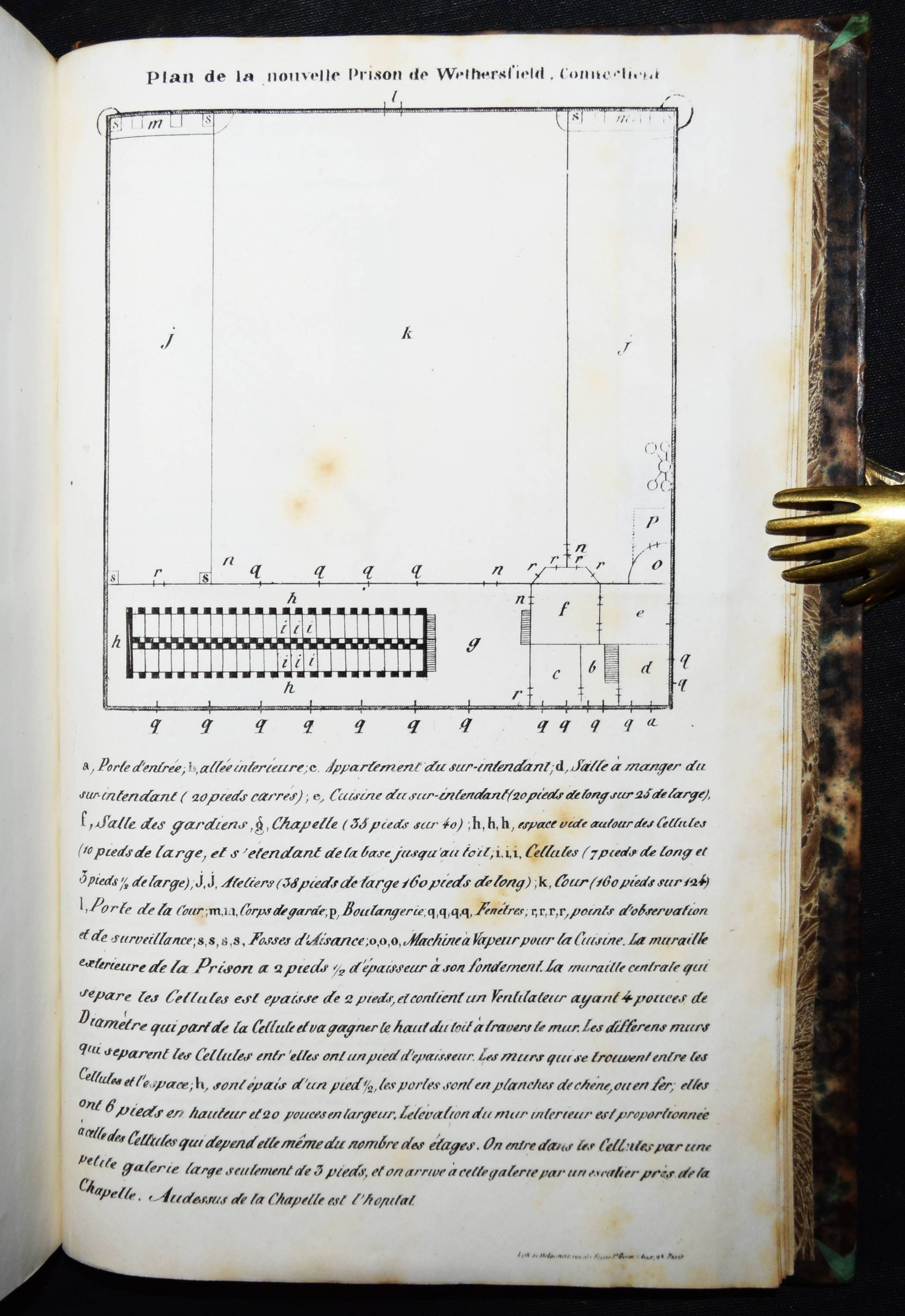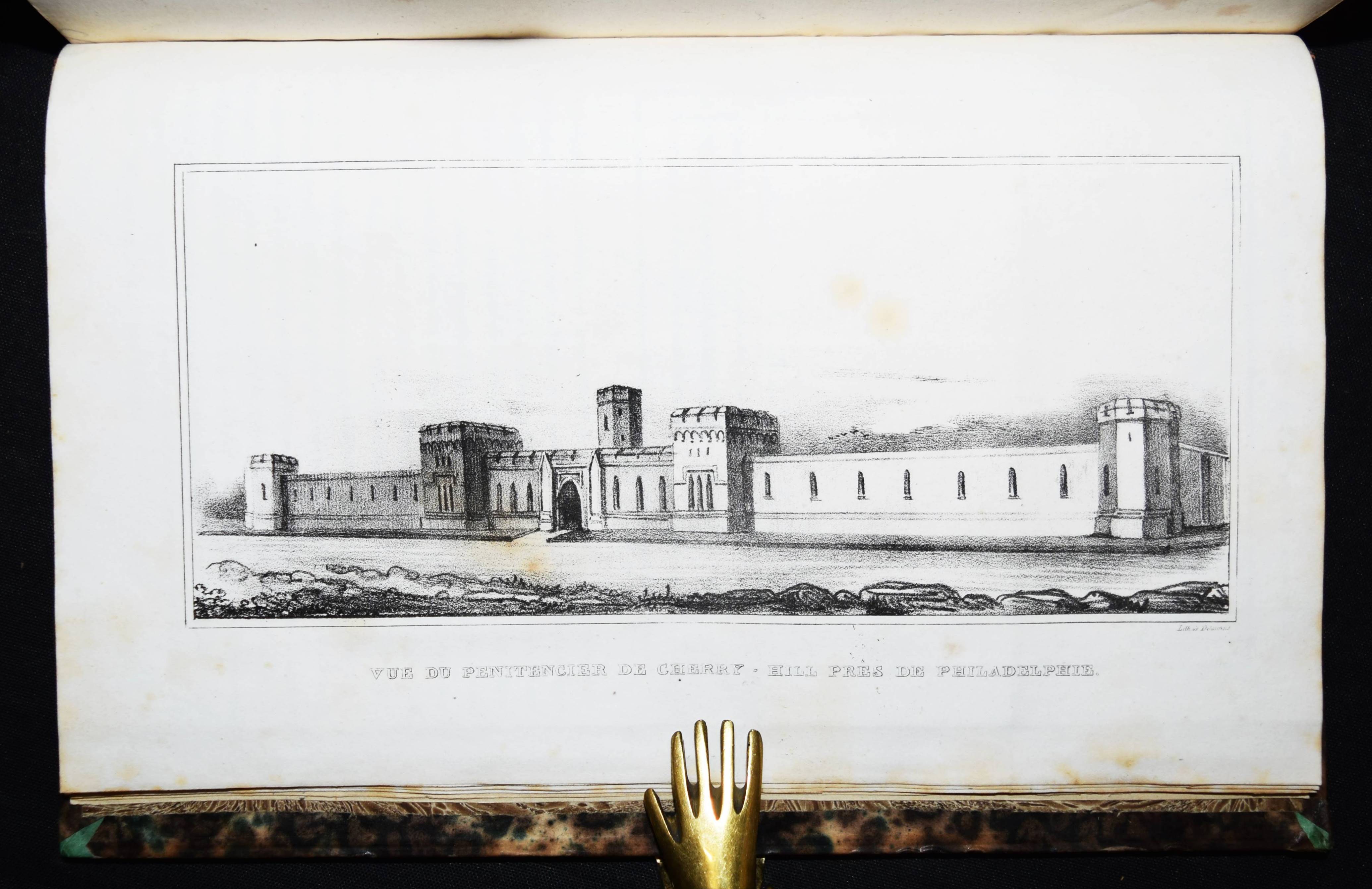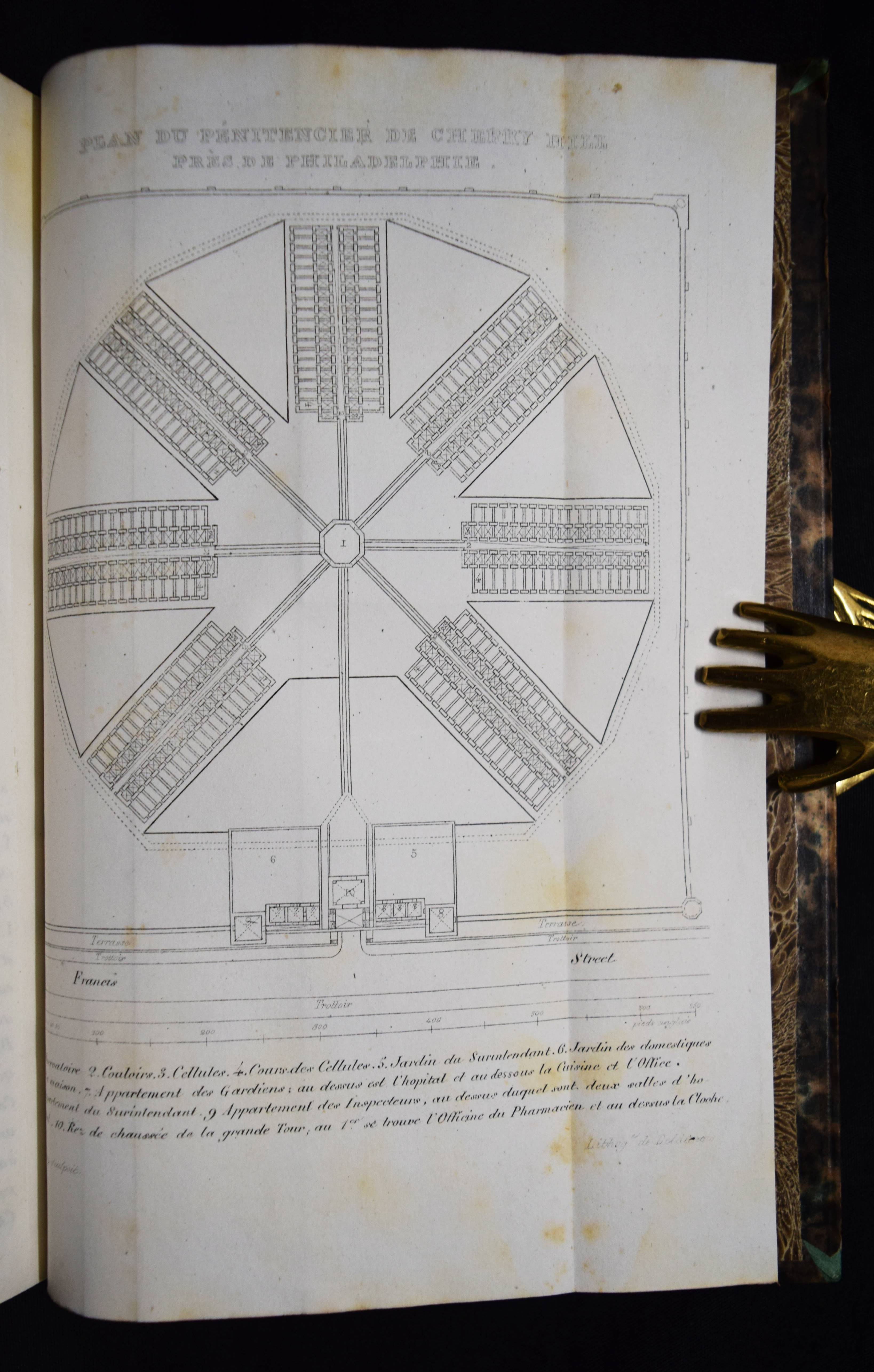 Beaumont, Gustave de et Alexis de Tocqueville. Système pénitentiaire aux Etats-Unis et de son application en France. Séconde Édition, entièrement refondue et augmentée d’une introduction, etc. 2 Bände. Paris, Charles Gosselin 1836. 8°. [2] Bl., 394 S., 1 w. Bl.; [2] Bl., 374 S. mit 5 (3 gefalt.) lithogr. Tafeln. Hldr. d. Zt. mit goldgepr. Rückensch. u. dezenter Rückenvergoldung. Goldsmith 28184. Sabin 4190. – Zweite überarbeitete Ausgabe des grundlegenden Werks über das amerikanische Strafvollzugssystem, massgeblich auch für die Reform des französischen Gefängsniswesens. Die erste Ausgabe erschien 1833. – Die Tafeln mit Grundrissen und Ansichten von Strafanstalten, darunter auch Sing Sing. – Gelenke berieben und stellenweise angeplatzt, Rücken von Band II mit Brandfleck, durchgehend stockfleckig, sonst gutes Exemplar aus der Bibliothek von Baron James Mayer de Rothschild (1792-1868), Gründer des französischen Zweigs der prominenten Bankiers-Familie mit dessen Exlibris.