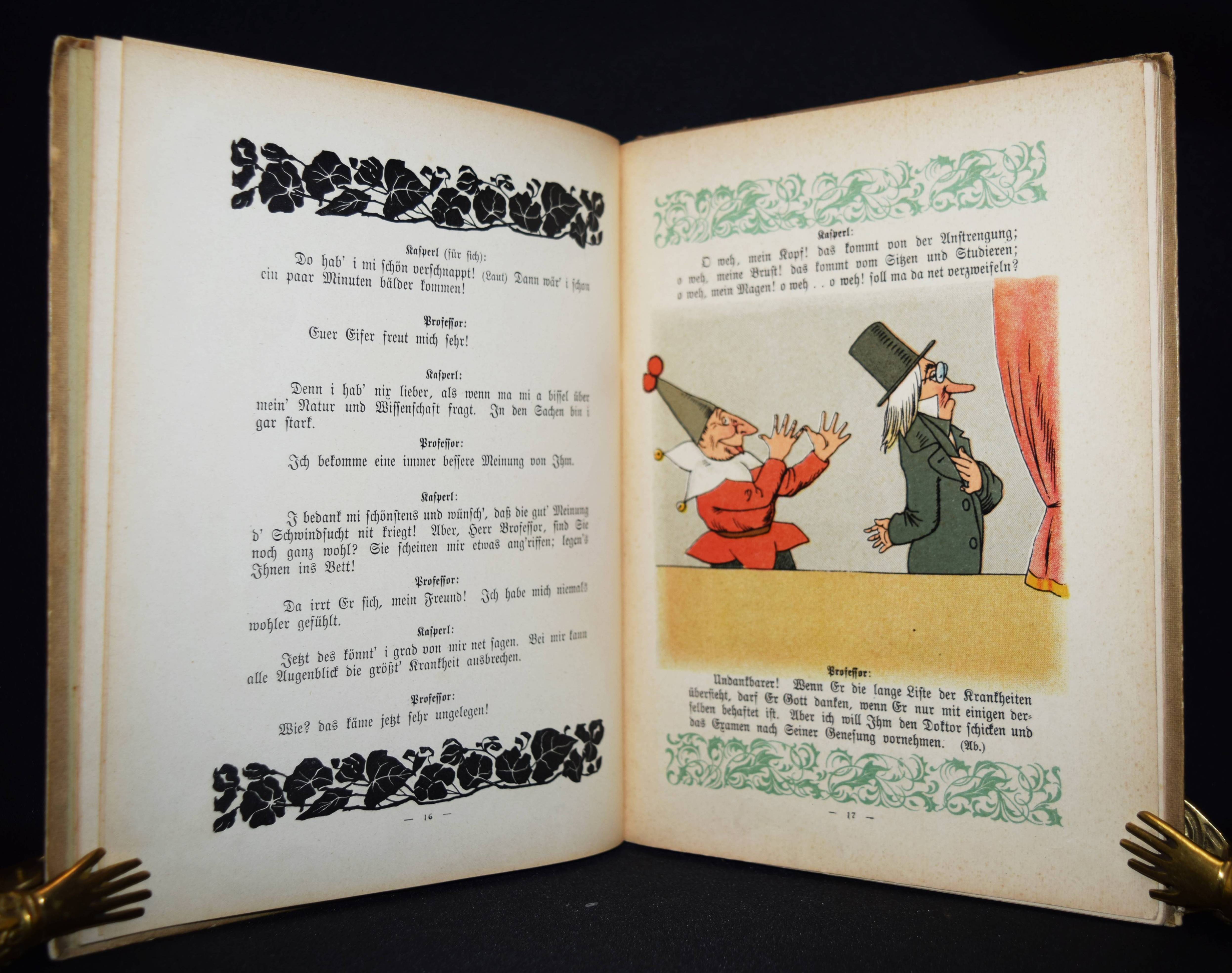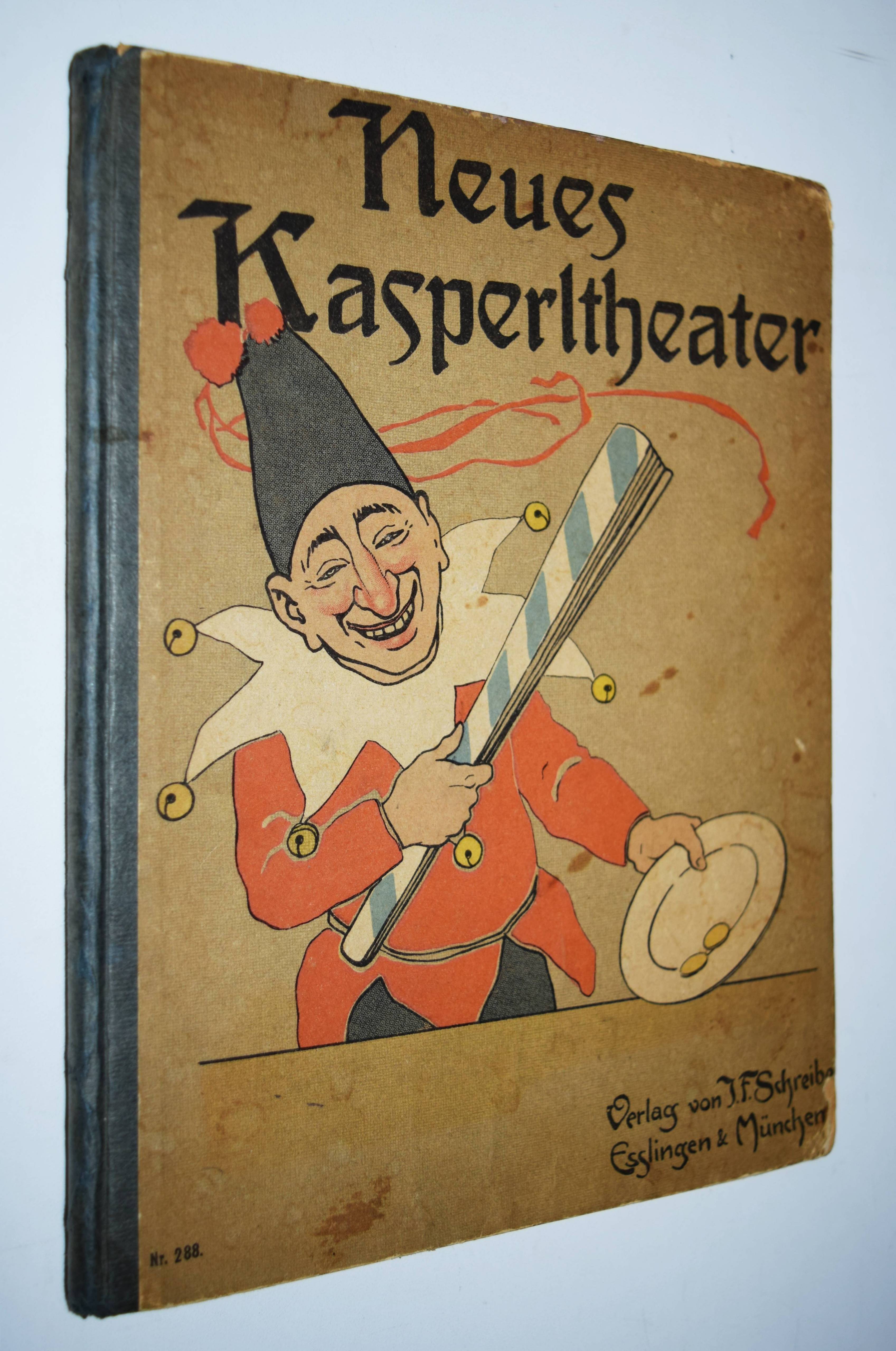 Meggendorfer, Lothar. Neues Kasperltheater. 2. Aufl. Eßlingen, München, Schreiber (ca. 1905). Gr.-8°. 47 S. mit 19 (12 farblithogr.) Illustrationen. Farbig illustr. OPbd. (Verlags-Nr. 288). Slg. Breitschwerdt 130. Katzenheim 259. Krahé 106. Ries 715, 128. (Alle EA von 1904). – „Meggendorfer hatte von Jugend an eine intensive Beziehung zu der Figur des Kasperl, seit er als 11jähriger in der Eröffnung des Schmidschen Marionettentheaters saß, zu dem Franz Pocci das Eröffungsstück geschrieben hatte“ (W. Geisenheyner). – „Wie gebannt folgte er dem teils spaßigen, teils zauberischen Geschehen. Er erlebte den Kasperl als Knappen, der nur Hunger und Durst kennt und nichts von den Idealen eines wahren Helden weiß“ (Krahé S. 48 ausführlich zu Meggendorfers Kasperlfiguren). – Deckel etwas berieben und fleckig, N. a. V., Blattränder teils etwas fingerfleckig, gutes Exemplar.