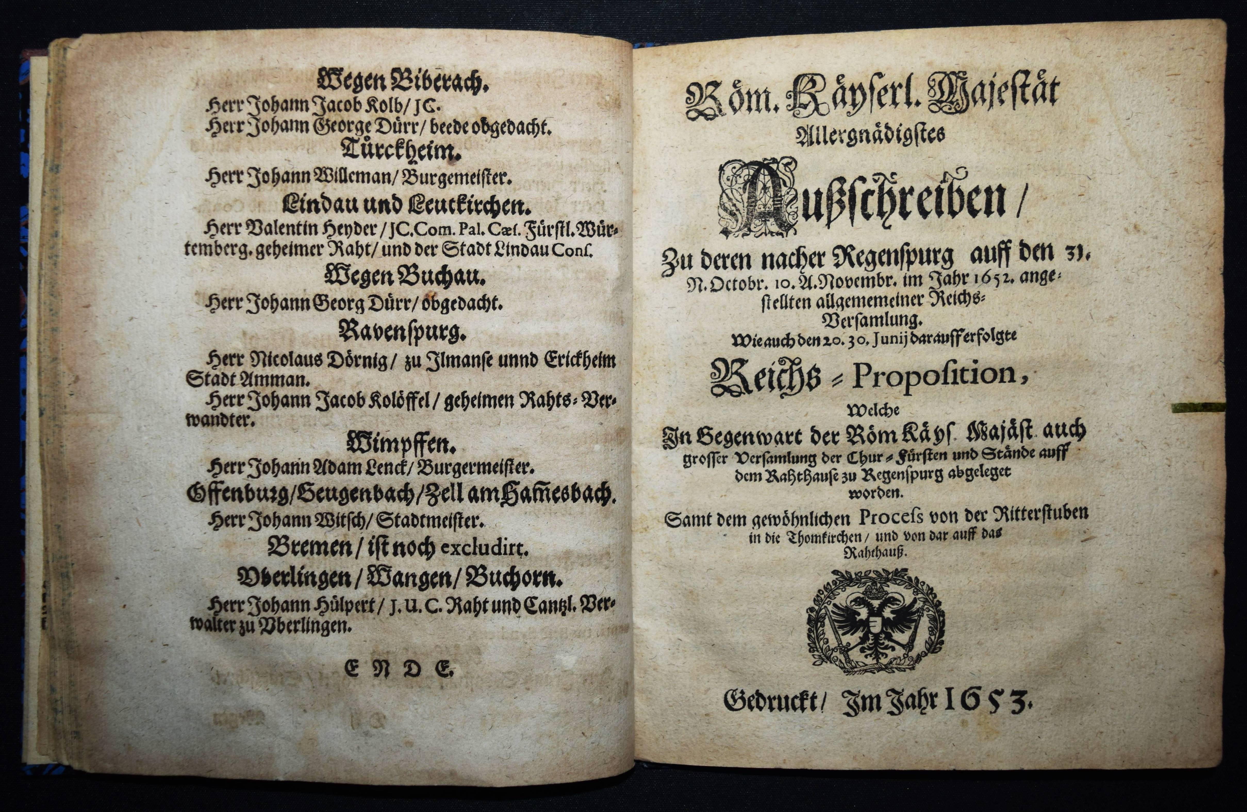 Summarische Chronick oder eigentliche Verfassung deß ein vnd Dreyssig-jährigen von Anno 1618. in Teutschland geführten Kriegs vnnd Friedens-Handlung. Sampt einem Anhang biß auff dieses Jahr, darin auff einen jeden Tag, Monat vnd Jahr alles was vorgelauffen kürtzlich vnd warhafftig verzeichnet. – Beigebunden: Verzeichnuß der jenigen Churfürsten, Fürsten und Ständen deß heiligen Römischen Reichs, auch der anwesenden Räht, Boschafften und Gesanden, wie sich dieselbe zu dem nacher Regenspurg auf den 21. 31. Tag Octobris deß 1652igsten Jahrs außgeschriebenen Reichstag, nach und nach eingefunden, und legitimirt haben. – Beigebunden: Röm. Käyserl. Majestät Allergnädigstes Außschreiben, zu deren nacher Regenspurg auff den 31. N. Octobr. 10. A. Novembr. im Jahr 1652. angestellten allgememeiner Reichs-Versamlung. Wie auch den 20. 30. Iunii darauff erfolgte Reichs-Proposition, Welche In Gegenwart der Röm Käys. Majäst. auch grosser Versamlung der Chur-Fürsten und Stände auff dem Rahthause zu Regenspurg abgeleget worden. Samt dem gewöhnlichen Process von der Ritterstuben in die Thomkirchen, und von dar auff das Rahthause zu Regenspurg abgeleget worden. Samt dem gewöhnlichen Prozess von der Ritterstuben in die Thomkirchen, und von dar auff das Rahthauß. – Beigebunden: Capitulatio Deß Allerdurchleuchtigsten Großmächtigsten Fürsten und Herrn Herrn Ferdinands deß IV. Erwöhlten Römischen Zu Hungarn und Böheim, Dalmatien, Croatien, und Sclavonien, [et]c. Königs, Ertzhertzogens zu Oesterreich, Hertzogens zu Burgund, Steyr, Kärnten, Crain und Würtenberg, [et]c. Grafens zu Tyrol, [et]c. auffgerichtet zu Augspurg den 29. May 1653. 4 Werke in 1 Band. Straßburg, Peter Aubry (1. Werk) und ohne Ort und Druck (2.-4. Werk) 1650 und 1653. 22 S., [1] Bl. mit illustr. gestoch. Titel; [14] Bl.; [10] Bl.; [12] Bl. Moderner Pappband mit floralem Buntpapier. I. VD17 12:150825V. – III. VD17 12:112110H. – IV. VD17 14:005995Z. – Interessanter Sammelband mit 4 seltenen Flugschriften zum Dreissigjährigen Krieg und Westfälischen Frieden am 24. Oktober 1648 bzw. den sog. Jüngsten Reichsabschieds (Schlussdokument des Regensburger Reichstages von 1653/1654): „Bei dem Dokument mit der ungewöhnlichen Bezeichnung handelt es sich um den letzten Reichsabschied eines offiziell einberufenen und offiziell beendeten Reichstags des Heiligen Römischen Reiches. Dieser letzte offizielle Reichstag war zugleich auch der erste Reichstag nach dem Ende des Dreißigjährigen Krieges. Der Reichstag sollte sich mit Fragen und Problemen beschäftigen, die beim Abschluss des Westfälischen Friedens ungeklärt geblieben waren. Einige schwierige Aufgaben konnten nicht abgeschlossen werden und auch der 10 Jahre später 1663 nach Regensburg einberufene Reichstag konnte diese alten und auch neue Probleme nicht lösen. Er wurde deshalb nicht offiziell beendet und wurde bald als Immerwährender Reichstag bezeichnet. Auch die gefassten Beschlüsse wurden nicht mehr als offizielle Reichsabschiede erarbeitet und konnten nicht mehr so bezeichnet werden. Stattdessen wurden diese Beschlüsse nur als Reichsschlüsse (conclusa imperii) bezeichnet“ (Wikipedia). – Das schöne Titelblatt des ersten Werks mit altem Besitzvermerk (dat. 1705), durchgehend etwas gebräunt, sonst sehr gut erhalten.