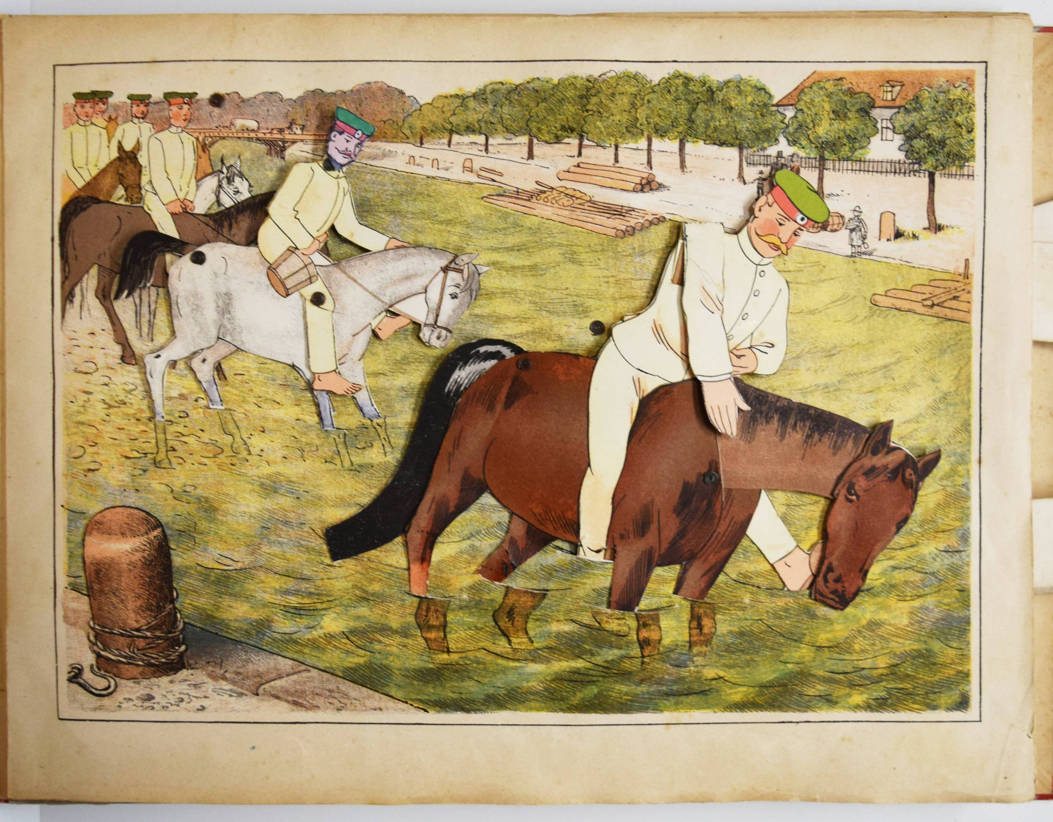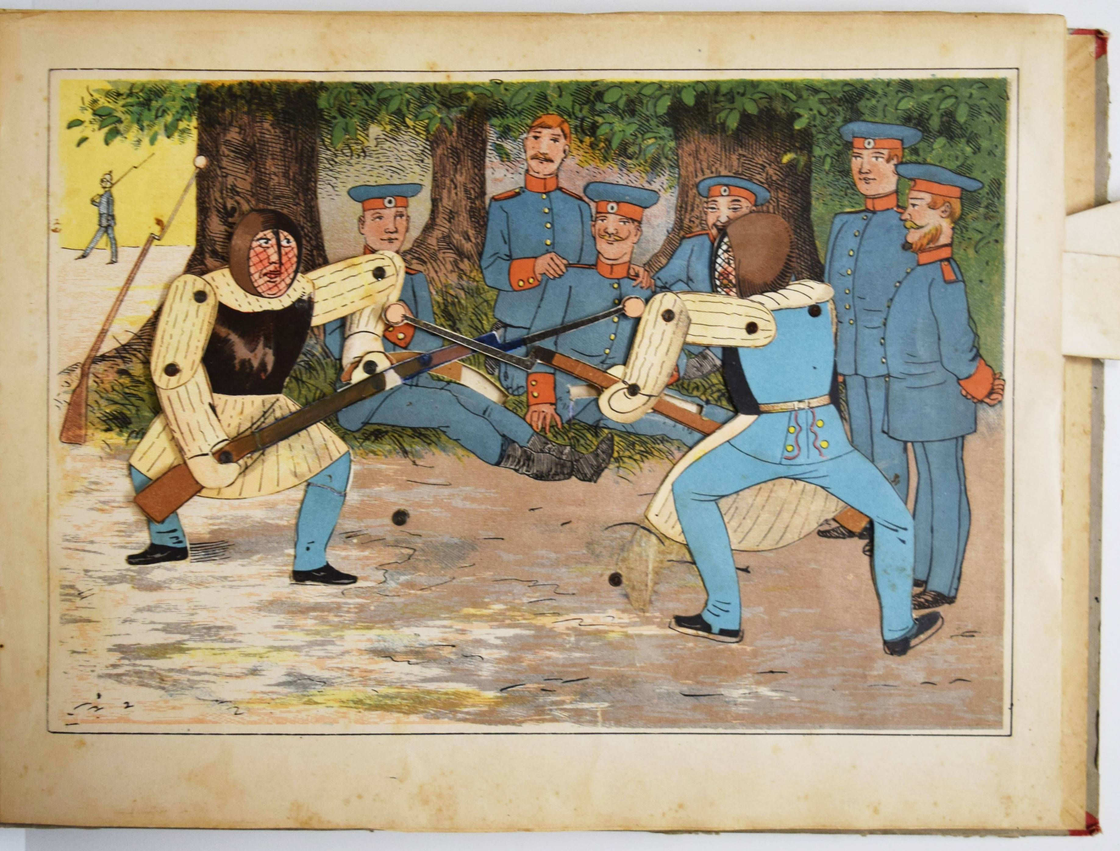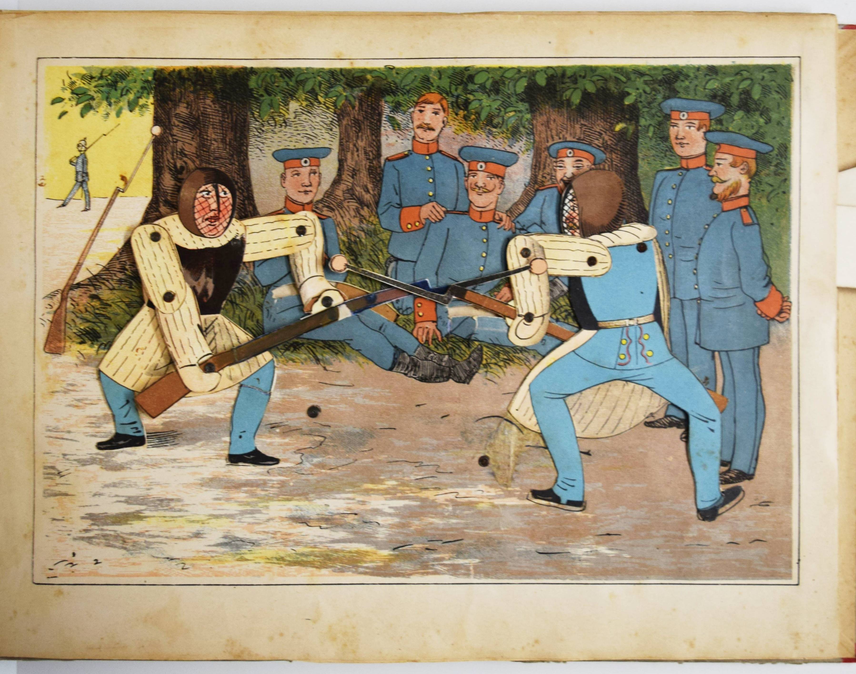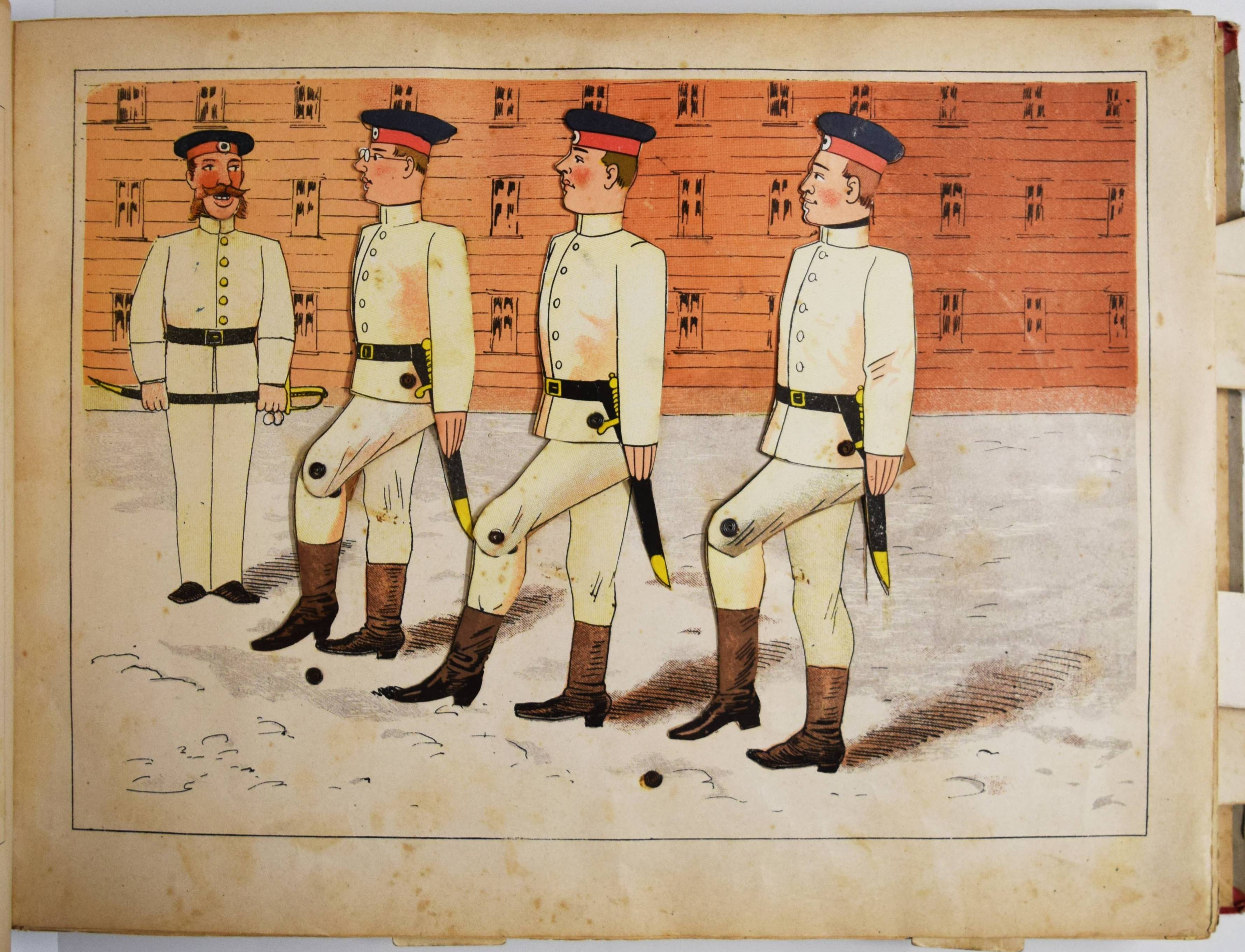 Meggendorfer, Lothar. Militärisches Ziehbilderbuch (Deckeltitel). München, Braun und Schneider o. J. (1890). Quer-4° (27 x 37 cm.). [17] S. mit 8 farblithogr. Tafeln mit beweglichen Teilen und Zieh-Mechanismus. Orig.-Halbleinenband mit farblithogr. Deckelbild. Hobrecker, Braunschweig 5080. Katzenheim 241 f. Krahé 95. LKJ II, 459 f. Ries 713, 73. Seebaß II, 1283. Wegehaupt IV, 2357 (vermutet irrig ein fehlendes Titelblatt). – Erste und einzige Ausgabe; eines der seltensten Spiel-Bilderbücher von L. Meggendorfer. Wie die meisten Spiel-Bilderbücher Meggendorfers ohne ein sep. Titelblatt; die erste Seite mit dem Vorwort. – „Aus dem Soldatenleben zeigt dies Buch Euch allerhand, die Jugend ist ja wohlgeneigt stets dem Soldatenstand“ (aus dem Vorwort). Zu sehen sind Rekruten, Husar, Musterung, Turnen, Außer Dienst, In der Schwemme, Bajonettfechten und Regimentsmusik. Meggendorfer verwendet hier nicht nur die von ihm bereits bekannten Ziehmechanismen, sondern dieses Buch verändert sich auch in der Dreidimensionalen. Als konstruktives Gestaltungsmittel benutzt Meggendorfer zur Veränderung der Bilder u. a. eine Tür, die sich in der Szene ‚Außer Dienst‘ öffnet und durch die ein Offizier tritt (der Offizier steckt den Kopf durch den Türschlitz) oder er läßt in der Szene ‚In der Schwemme‘ einen Reiter seinen Arm anheben um sein Pferd zu beruhigen (bei Betätigung des Ziehmechanismus und sein Pferd bewegt gleichzeitig den Schweif). – „Sogar das Militär wird von ihm lächerlich gemacht. In seinem Militärischen Ziehbilderbuch (1890) kontrolliert ein Offizier die Uniformen der angetretenen Soldaten. Als er einen fehlenden Knopf bemerkt, beugt er sich ruckartig vor und deutet mit dem Finger auf diese Stelle. Von einem Gefreiten wird der „Vorfall“ gleich in einem Buch notiert“ (C. Pohlmann, „Nur für brave Kinder“ – Spiel- und Verwandlungsbücher im 19. Jahrhundert). – Deckel leicht fleckig, die Köpfe von 2 Sodaten bei den Tafeln zu „Außer Dienst“ und „In der Schwemme“ in Farbkopie ersetzt, einige Textblätter mit restaurierten Randeinrissen, das Textblatt „Die Regimentsmusik“ mit restauriertem Abriss (kein Textverlust), stellenweise etwas braun- und fingerfleckig, gutes und voll funktionsfähiges Exemplar.