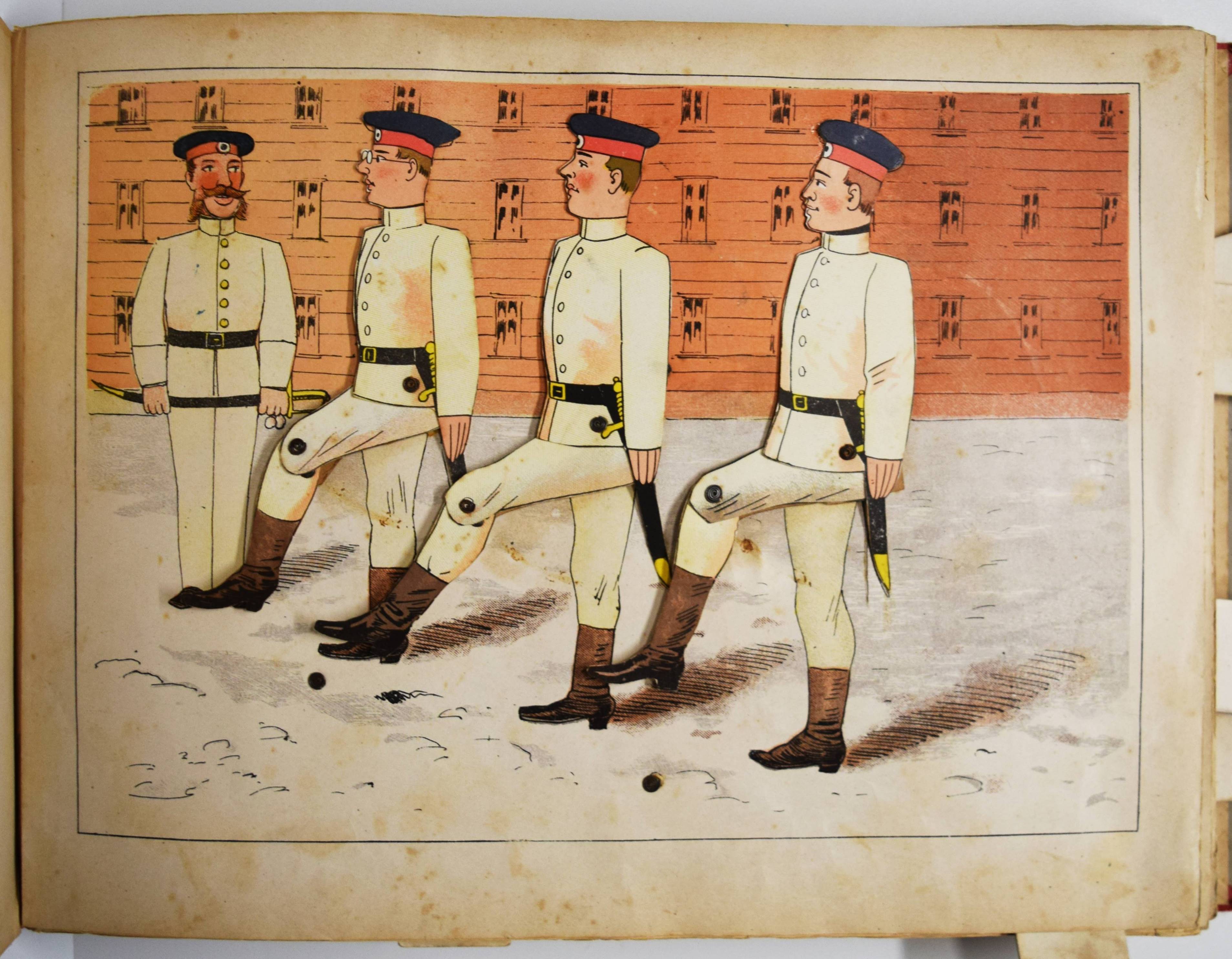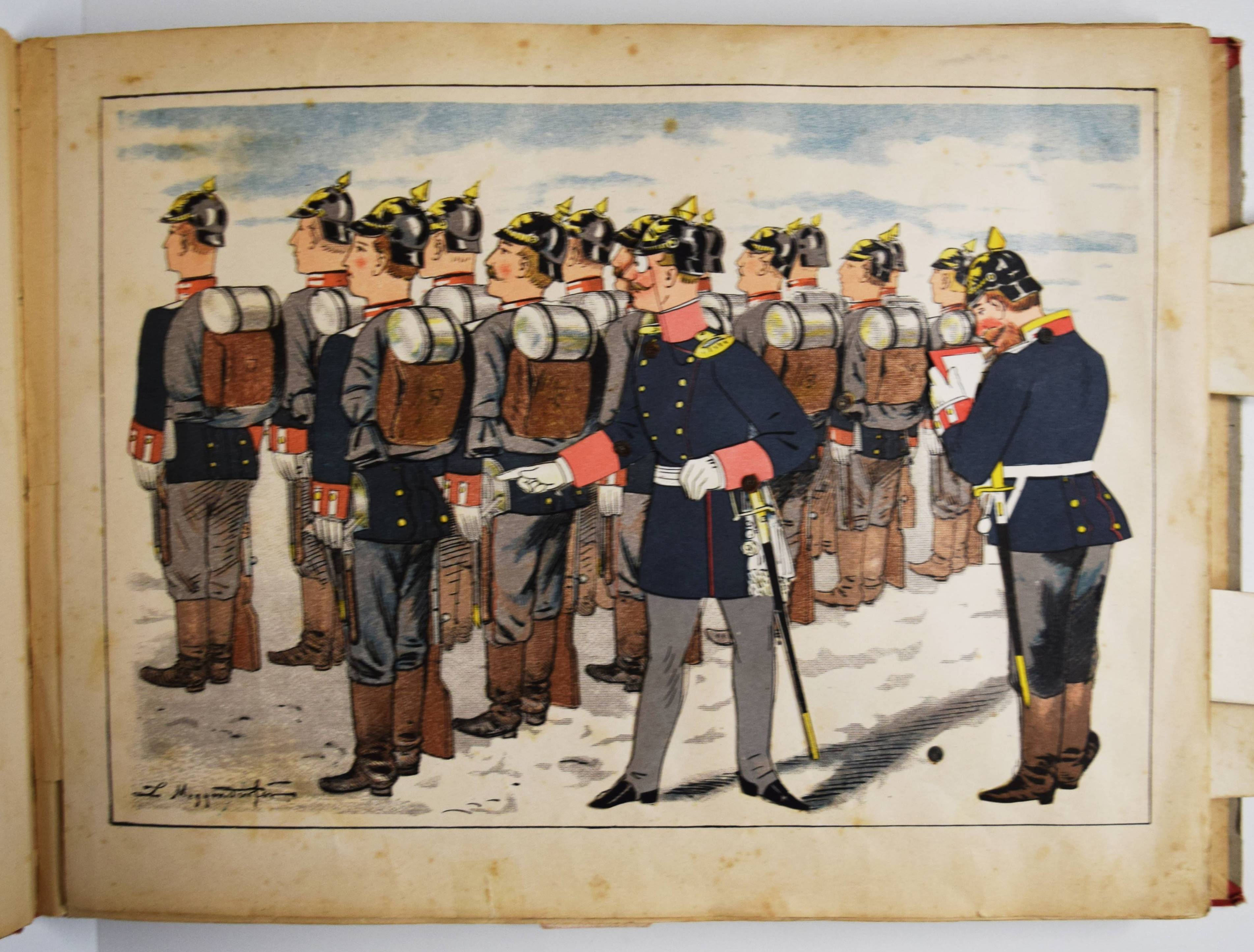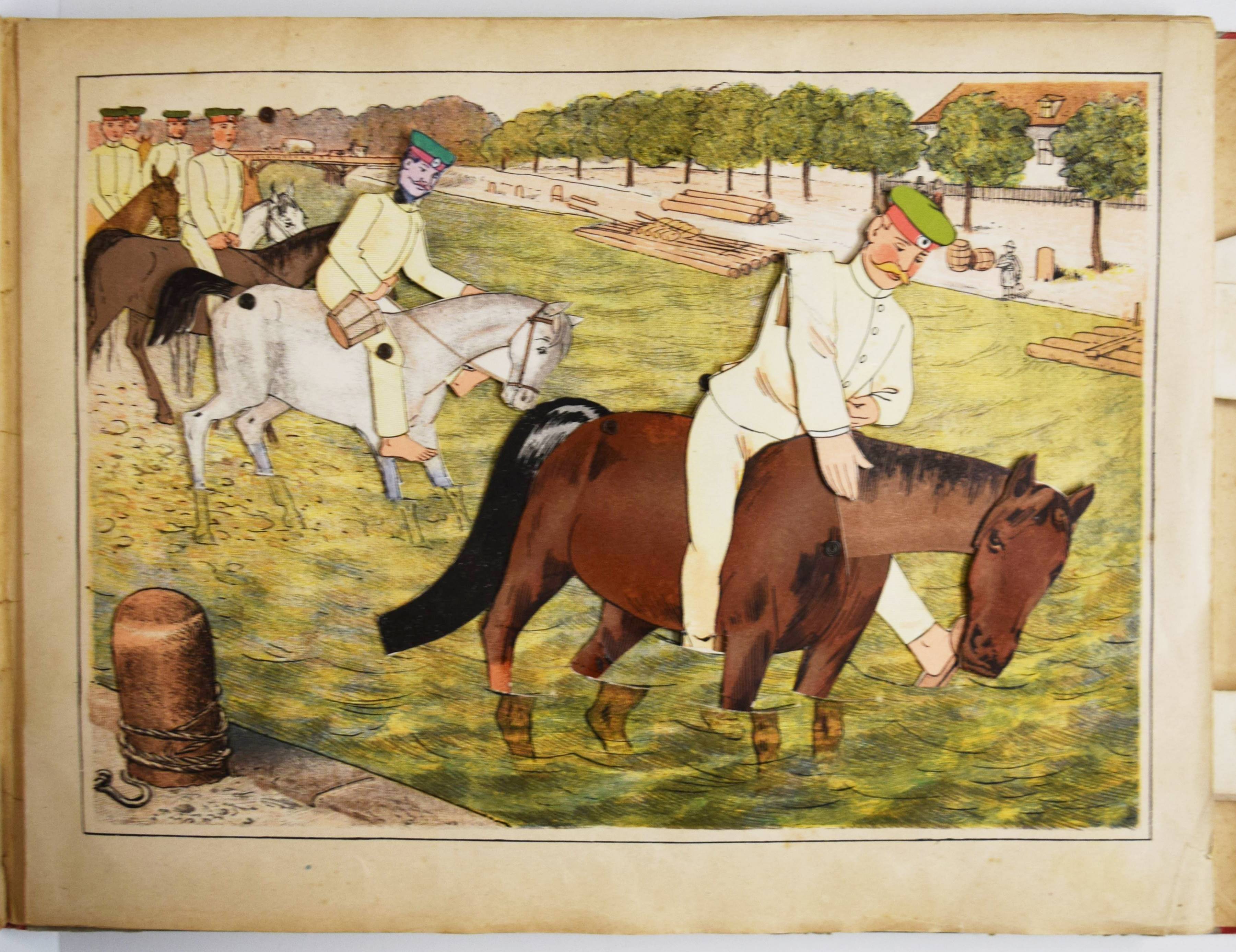 Meggendorfer, Lothar. Militärisches Ziehbilderbuch (Deckeltitel). München, Braun und Schneider o. J. (1890). Quer-4° (27 x 37 cm.). [17] S. mit 8 farblithogr. Tafeln mit beweglichen Teilen und Zieh-Mechanismus. Orig.-Halbleinenband mit farblithogr. Deckelbild. Hobrecker, Braunschweig 5080. Katzenheim 241 f. Krahé 95. LKJ II, 459 f. Ries 713, 73. Seebaß II, 1283. Wegehaupt IV, 2357 (vermutet irrig ein fehlendes Titelblatt). – Erste und einzige Ausgabe; eines der seltensten Spiel-Bilderbücher von L. Meggendorfer. Wie die meisten Spiel-Bilderbücher Meggendorfers ohne ein sep. Titelblatt; die erste Seite mit dem Vorwort. – „Aus dem Soldatenleben zeigt dies Buch Euch allerhand, die Jugend ist ja wohlgeneigt stets dem Soldatenstand“ (aus dem Vorwort). Zu sehen sind Rekruten, Husar, Musterung, Turnen, Außer Dienst, In der Schwemme, Bajonettfechten und Regimentsmusik. Meggendorfer verwendet hier nicht nur die von ihm bereits bekannten Ziehmechanismen, sondern dieses Buch verändert sich auch in der Dreidimensionalen. Als konstruktives Gestaltungsmittel benutzt Meggendorfer zur Veränderung der Bilder u. a. eine Tür, die sich in der Szene ‚Außer Dienst‘ öffnet und durch die ein Offizier tritt (der Offizier steckt den Kopf durch den Türschlitz) oder er läßt in der Szene ‚In der Schwemme‘ einen Reiter seinen Arm anheben um sein Pferd zu beruhigen (bei Betätigung des Ziehmechanismus und sein Pferd bewegt gleichzeitig den Schweif). – „Sogar das Militär wird von ihm lächerlich gemacht. In seinem Militärischen Ziehbilderbuch (1890) kontrolliert ein Offizier die Uniformen der angetretenen Soldaten. Als er einen fehlenden Knopf bemerkt, beugt er sich ruckartig vor und deutet mit dem Finger auf diese Stelle. Von einem Gefreiten wird der „Vorfall“ gleich in einem Buch notiert“ (C. Pohlmann, „Nur für brave Kinder“ – Spiel- und Verwandlungsbücher im 19. Jahrhundert). – Deckel leicht fleckig, die Köpfe von 2 Sodaten bei den Tafeln zu „Außer Dienst“ und „In der Schwemme“ in Farbkopie ersetzt, einige Textblätter mit restaurierten Randeinrissen, das Textblatt „Die Regimentsmusik“ mit restauriertem Abriss (kein Textverlust), stellenweise etwas braun- und fingerfleckig, gutes und voll funktionsfähiges Exemplar.