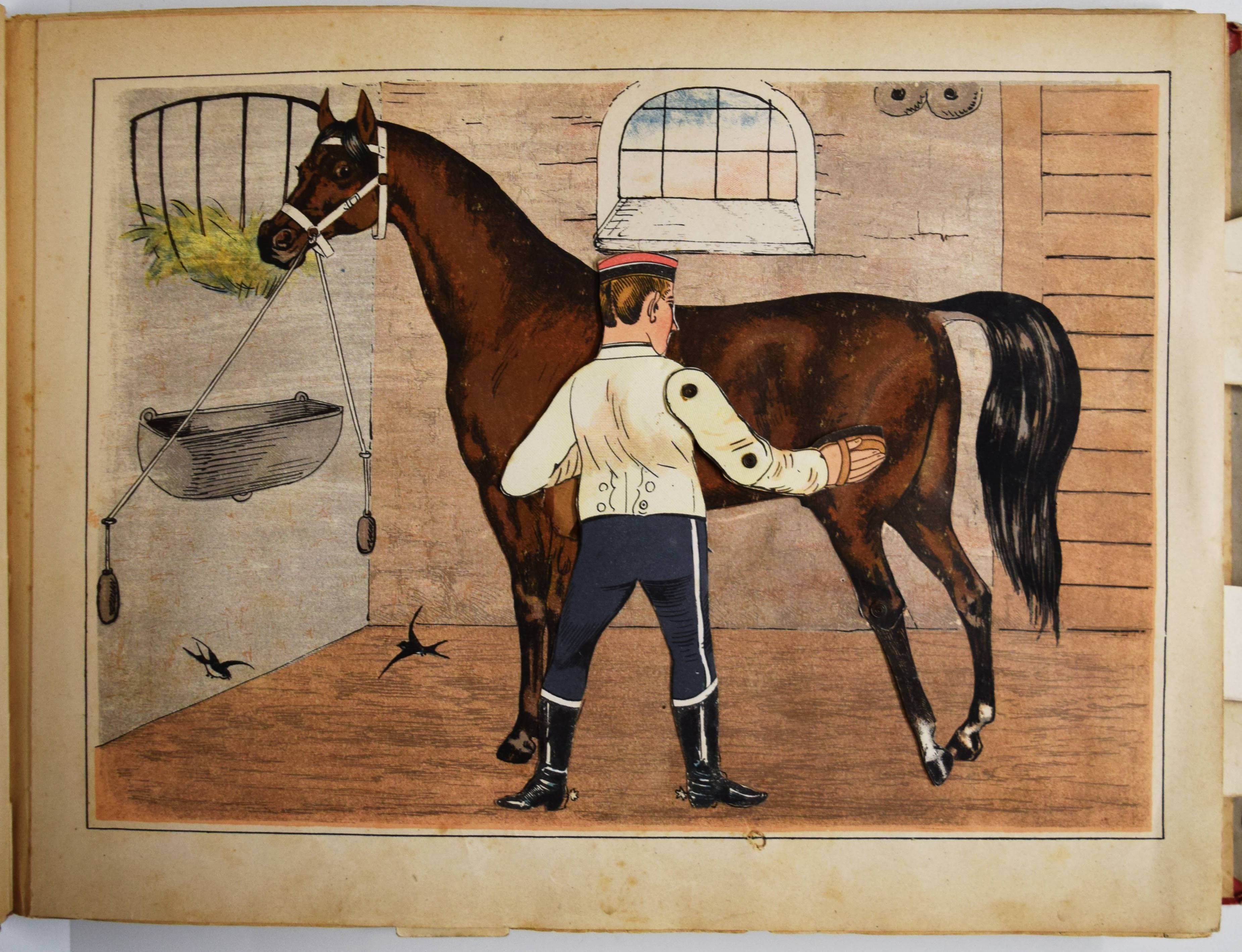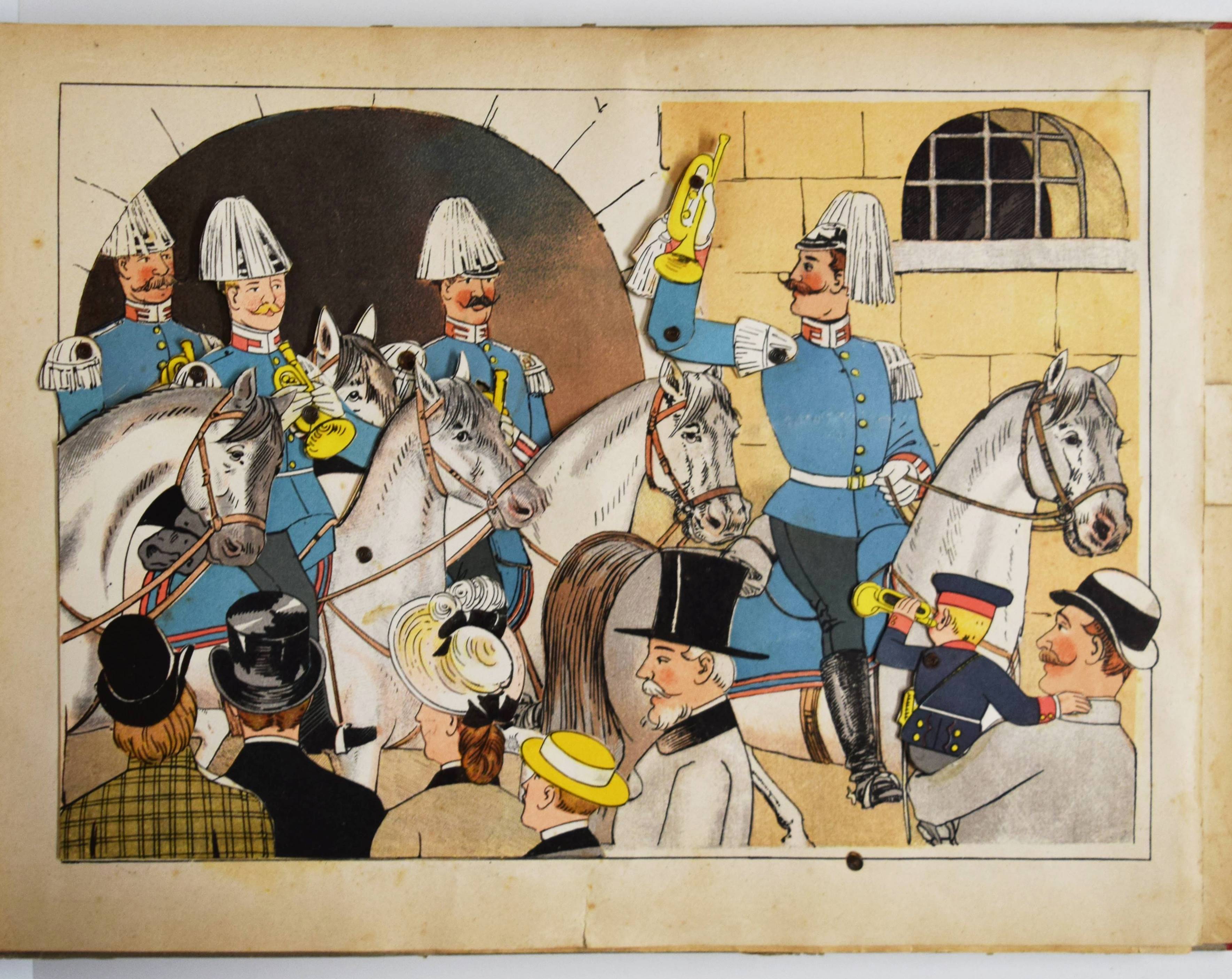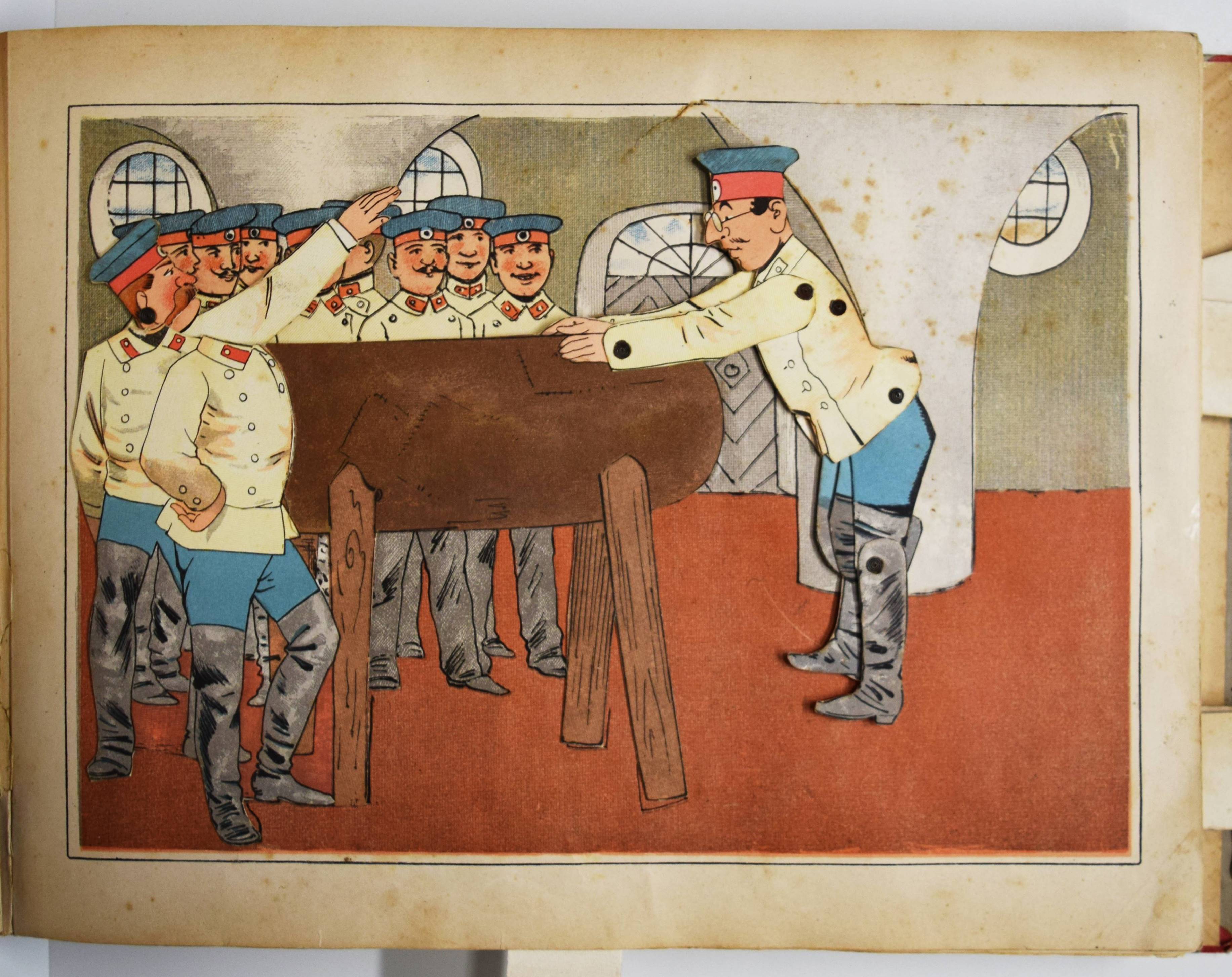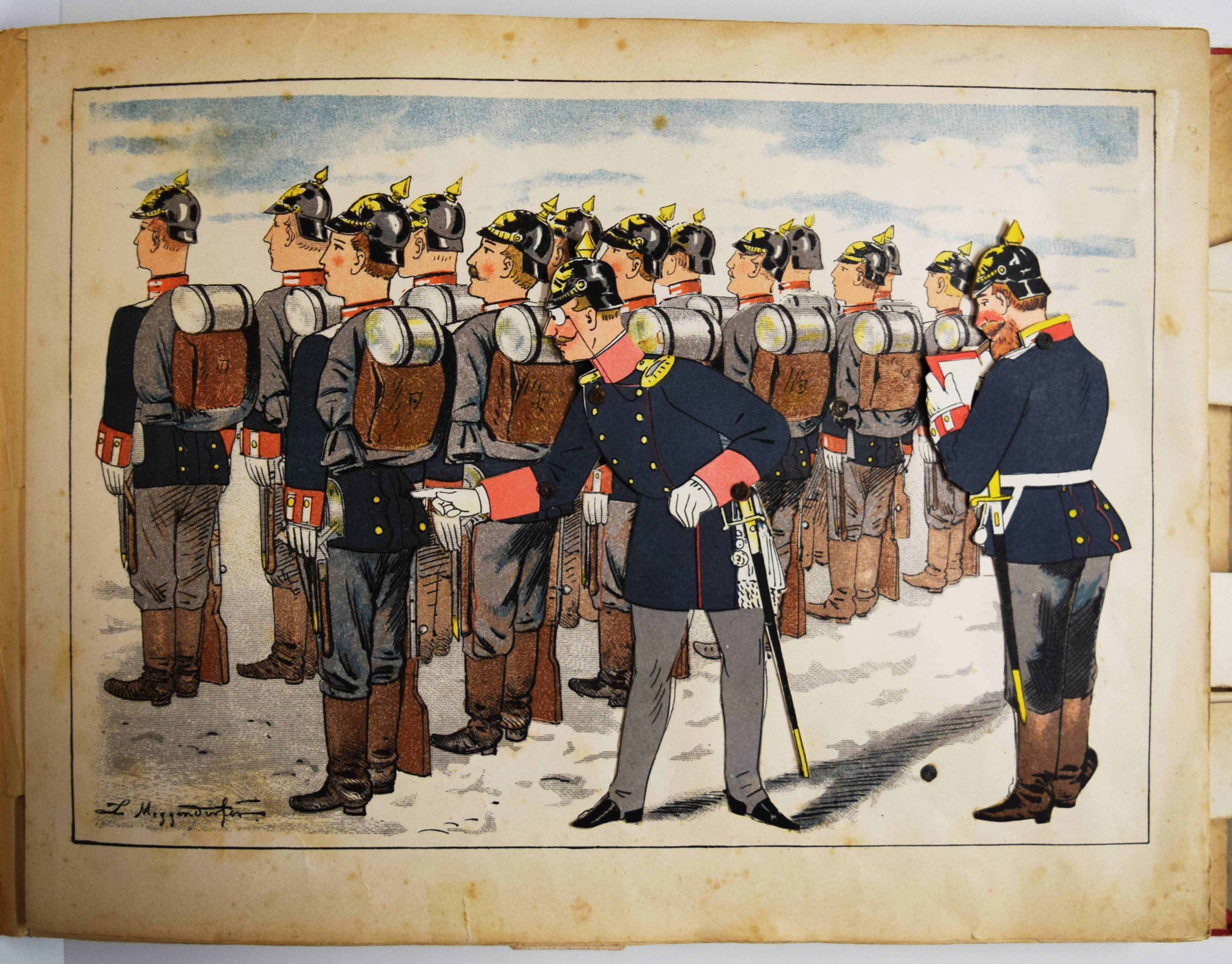 Meggendorfer, Lothar. Militärisches Ziehbilderbuch (Deckeltitel). München, Braun und Schneider o. J. (1890). Quer-4° (27 x 37 cm.). [17] S. mit 8 farblithogr. Tafeln mit beweglichen Teilen und Zieh-Mechanismus. Orig.-Halbleinenband mit farblithogr. Deckelbild. Hobrecker, Braunschweig 5080. Katzenheim 241 f. Krahé 95. LKJ II, 459 f. Ries 713, 73. Seebaß II, 1283. Wegehaupt IV, 2357 (vermutet irrig ein fehlendes Titelblatt). – Erste und einzige Ausgabe; eines der seltensten Spiel-Bilderbücher von L. Meggendorfer. Wie die meisten Spiel-Bilderbücher Meggendorfers ohne ein sep. Titelblatt; die erste Seite mit dem Vorwort. – „Aus dem Soldatenleben zeigt dies Buch Euch allerhand, die Jugend ist ja wohlgeneigt stets dem Soldatenstand“ (aus dem Vorwort). Zu sehen sind Rekruten, Husar, Musterung, Turnen, Außer Dienst, In der Schwemme, Bajonettfechten und Regimentsmusik. Meggendorfer verwendet hier nicht nur die von ihm bereits bekannten Ziehmechanismen, sondern dieses Buch verändert sich auch in der Dreidimensionalen. Als konstruktives Gestaltungsmittel benutzt Meggendorfer zur Veränderung der Bilder u. a. eine Tür, die sich in der Szene ‚Außer Dienst‘ öffnet und durch die ein Offizier tritt (der Offizier steckt den Kopf durch den Türschlitz) oder er läßt in der Szene ‚In der Schwemme‘ einen Reiter seinen Arm anheben um sein Pferd zu beruhigen (bei Betätigung des Ziehmechanismus und sein Pferd bewegt gleichzeitig den Schweif). – „Sogar das Militär wird von ihm lächerlich gemacht. In seinem Militärischen Ziehbilderbuch (1890) kontrolliert ein Offizier die Uniformen der angetretenen Soldaten. Als er einen fehlenden Knopf bemerkt, beugt er sich ruckartig vor und deutet mit dem Finger auf diese Stelle. Von einem Gefreiten wird der „Vorfall“ gleich in einem Buch notiert“ (C. Pohlmann, „Nur für brave Kinder“ – Spiel- und Verwandlungsbücher im 19. Jahrhundert). – Deckel leicht fleckig, die Köpfe von 2 Sodaten bei den Tafeln zu „Außer Dienst“ und „In der Schwemme“ in Farbkopie ersetzt, einige Textblätter mit restaurierten Randeinrissen, das Textblatt „Die Regimentsmusik“ mit restauriertem Abriss (kein Textverlust), stellenweise etwas braun- und fingerfleckig, gutes und voll funktionsfähiges Exemplar.