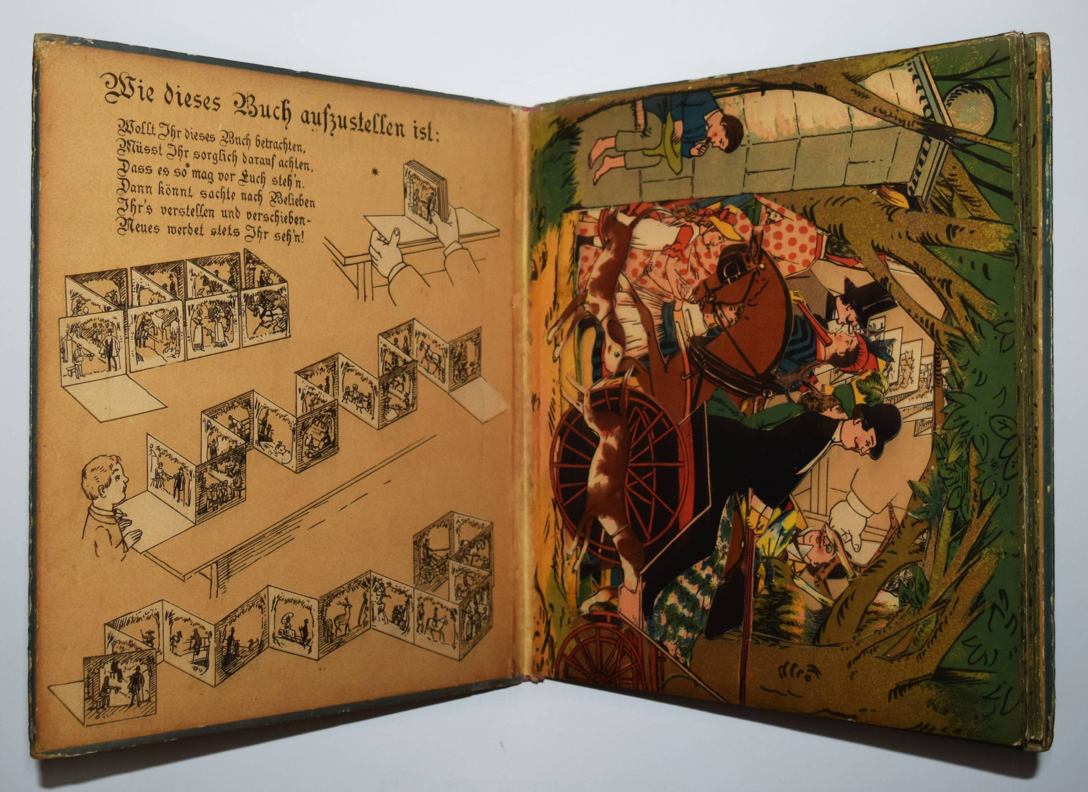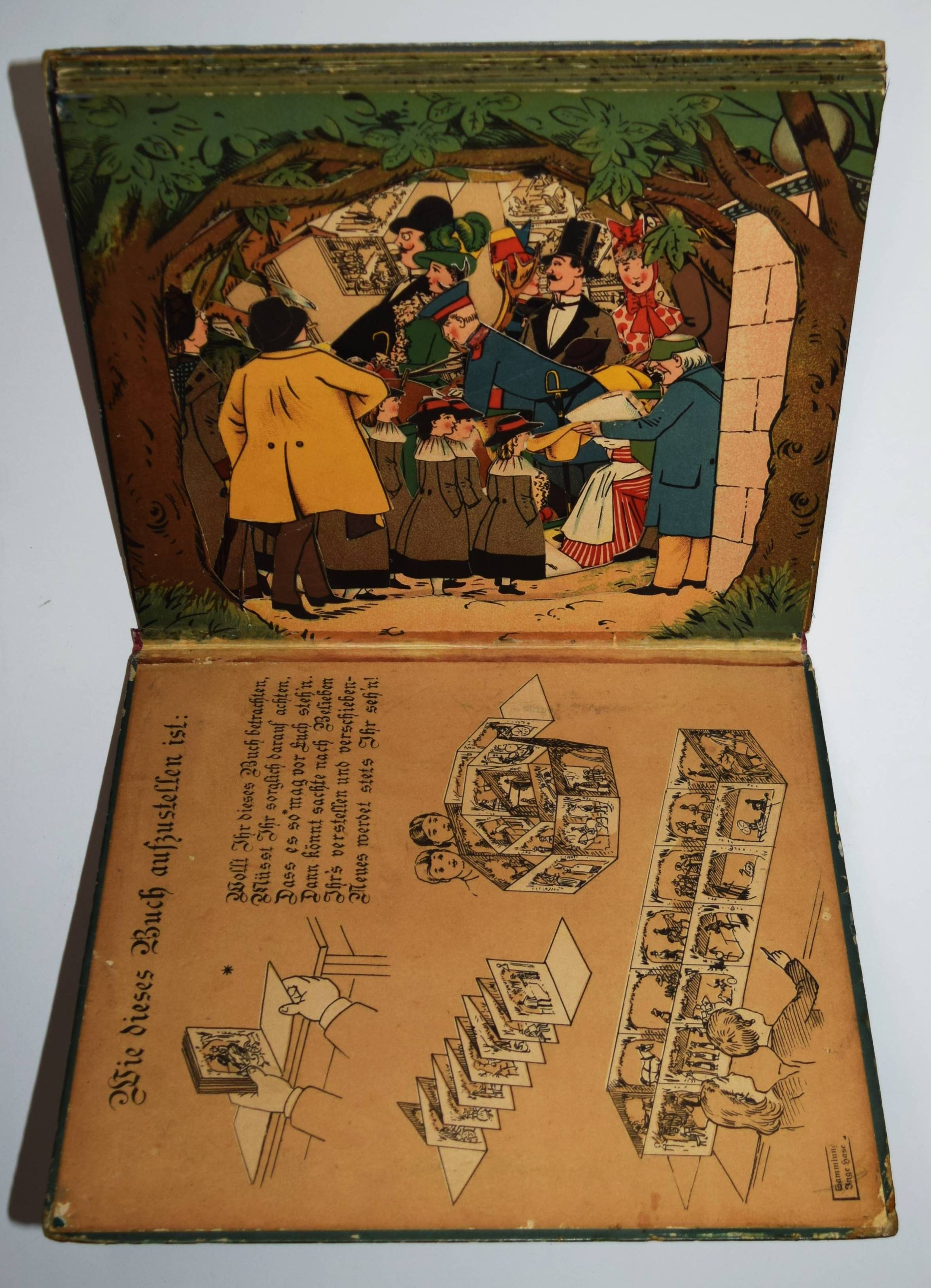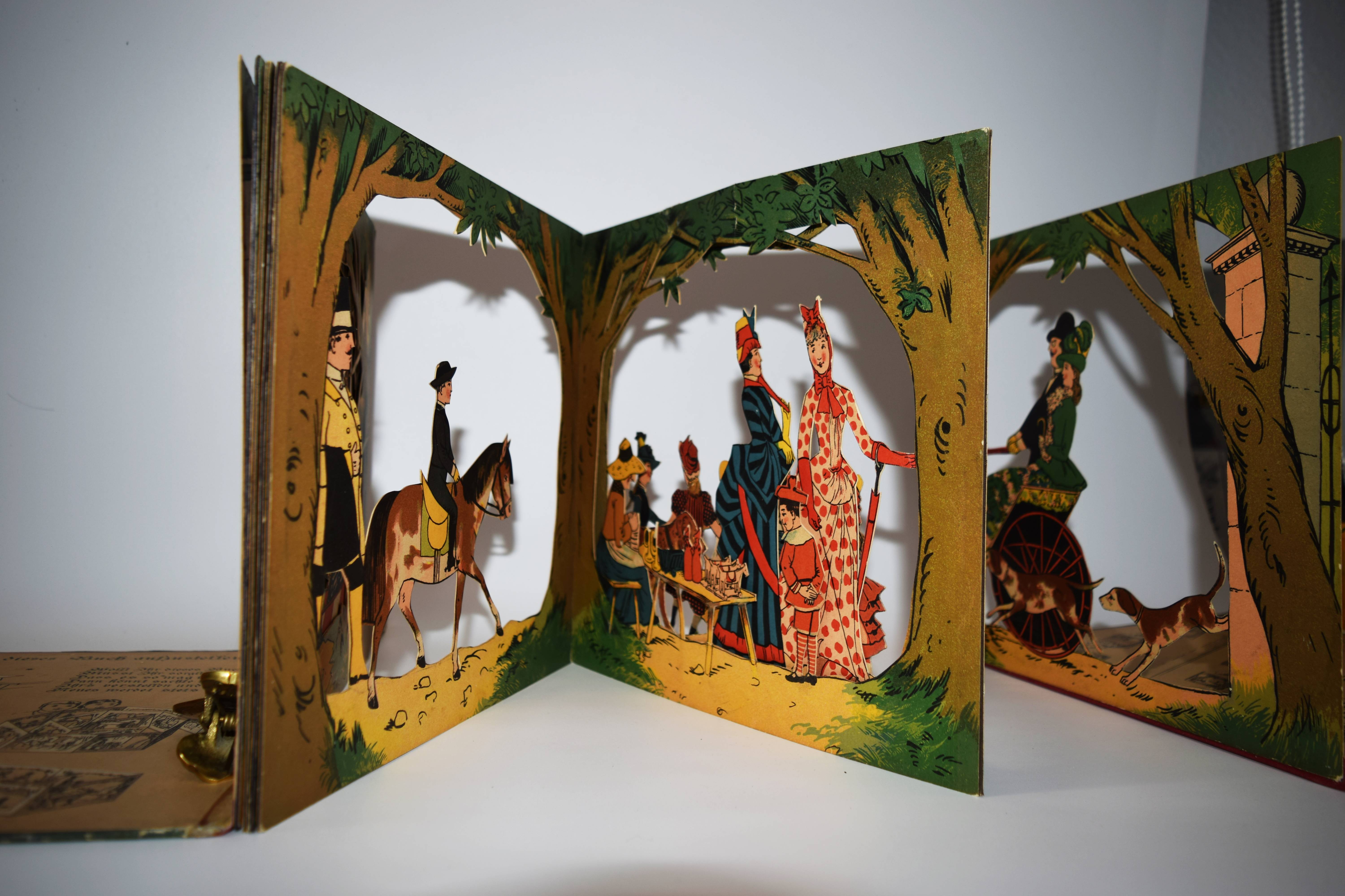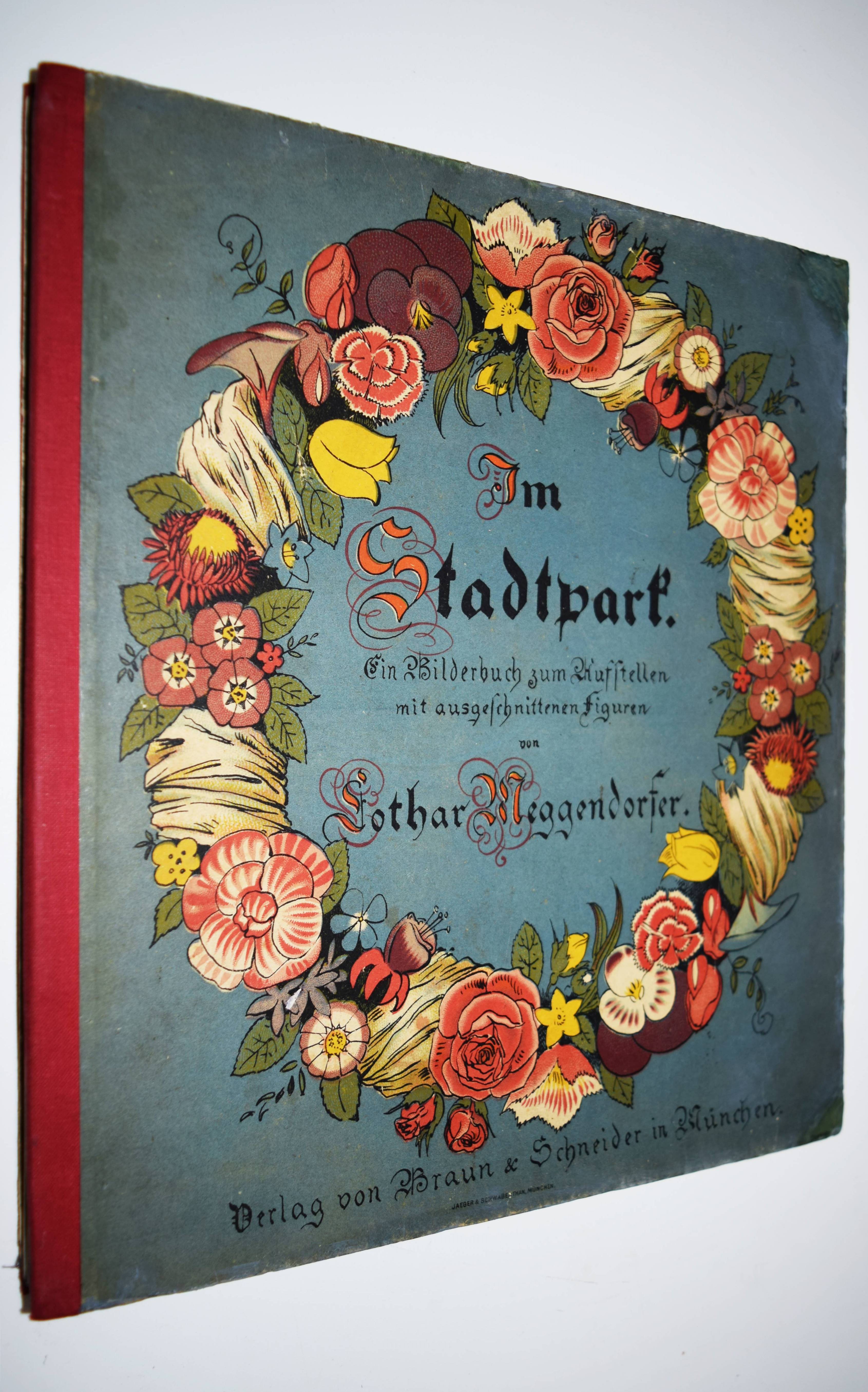 Meggendorfer, Lothar. Im Stadtpark. Ein Bilderbuch zum Aufstellen mit ausgeschnittenen Figuren. München, Braun & Schneider o. J. (1887). Gr.-4° (31 x 27,5 cm.). Leporello, [14] farblithogr. Tafeln mit ausgestanzten Figuren und Versen im unteren Rand. Farbig illustr. Orig.-Kartondeckel. Katzenheim S. 178 f. Krahé S. 79 ff. und 188. LKJ II, 460. Ries 711, 41 und S. 53. Wegehaupt IV, 1416. Vgl. Laub 187 (Reprint der englischen Ausgabe). – Erste Ausgabe des seltensten Spiel-Bilderbuchs von L. Meggendorfer. – „Wie dieses Buch aufzustellen ist / Wollt Ihr dieses Buch betrachten / Müsst Ihr sorglich darauf achten, / Daß es so mag vor Euch steh ’n. / Dann könnt sachte nach belieben / Ihr’s verstellen und verschieben – / Neues werdet stets Ihr seh’n!“ (Einbanddeckel vorne verso). – „Das Leporello „Im Stadtpark“ ist wieder einer jener genialen Einfälle Meggendorfers, mit denen er das Objekt Buch zu einem Spiel- und Anschauungsobjekt der vergnüglichsten Sorte umgestaltete. Die beidseitig bedruckten Elemente des Leporelloses … sind ausgestanzt wie bei Theaterkulissen und lassen sich in beliebiger Form stellen: Als Rechteck, als Mäander, als Spirale usw., sodass sich immer neue Situationen und Durchblicke ergeben, die das bürgerliche Leben – in einem Stadtpark in unendlichen Variationen vorstellen. Jeweils drei solcher Stellmöglichkeiten sind auf die beiden Innenseiten der Deckel eingedruckt, aber es gibt natürlich viele mehr. Zwar hat „Im Stadtpark“ in geschlossenem Zustand noch den Charakter eines Buches, aber ihm fehlt der Rücken, die Deckel dienen allein noch der „Verpackung“ eines Spielzeugs“ (Peter Laub). – Deckel geringfügig berieben, wenige exponierte Teile unauffällig restauriert, sehr gutes Exemplar.