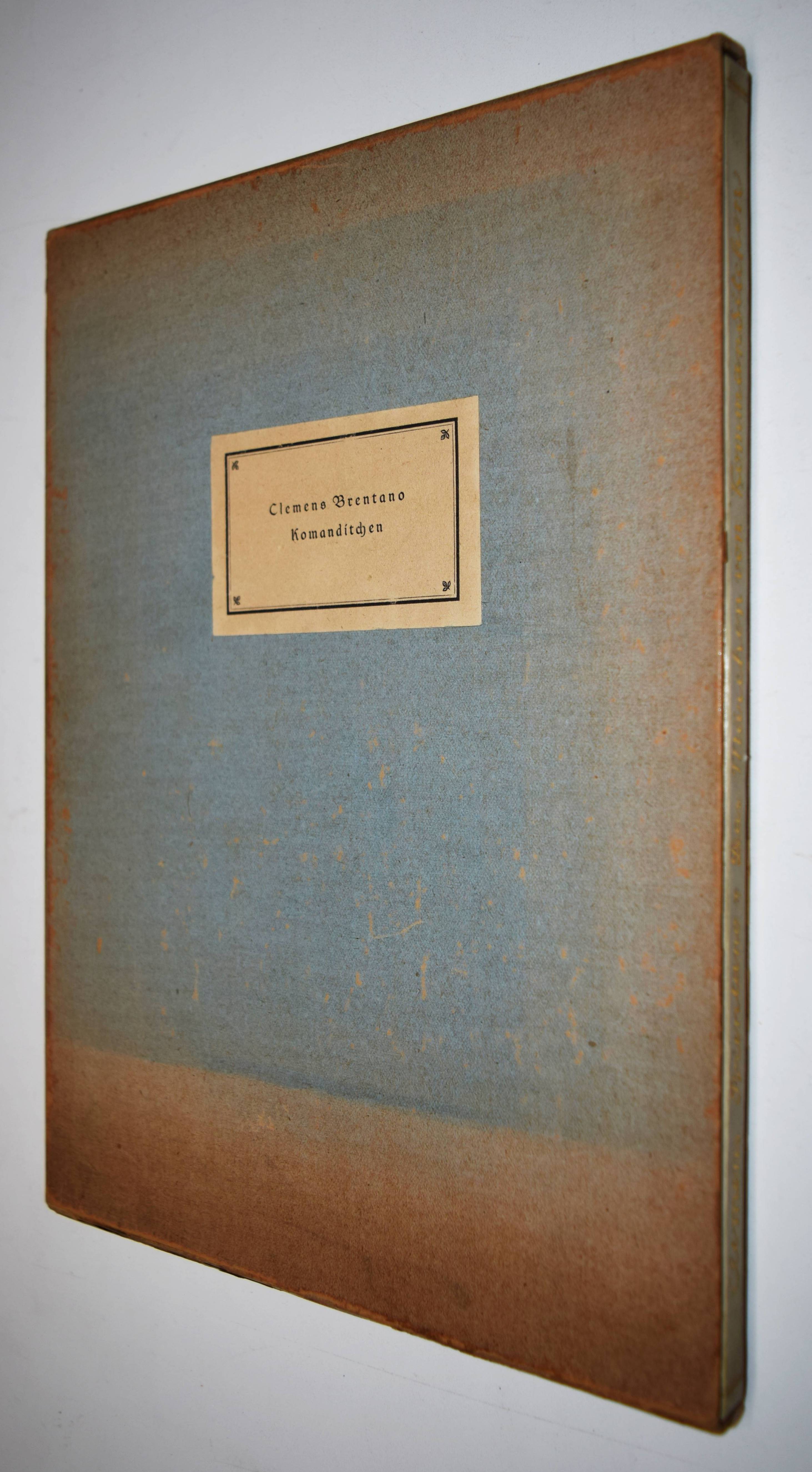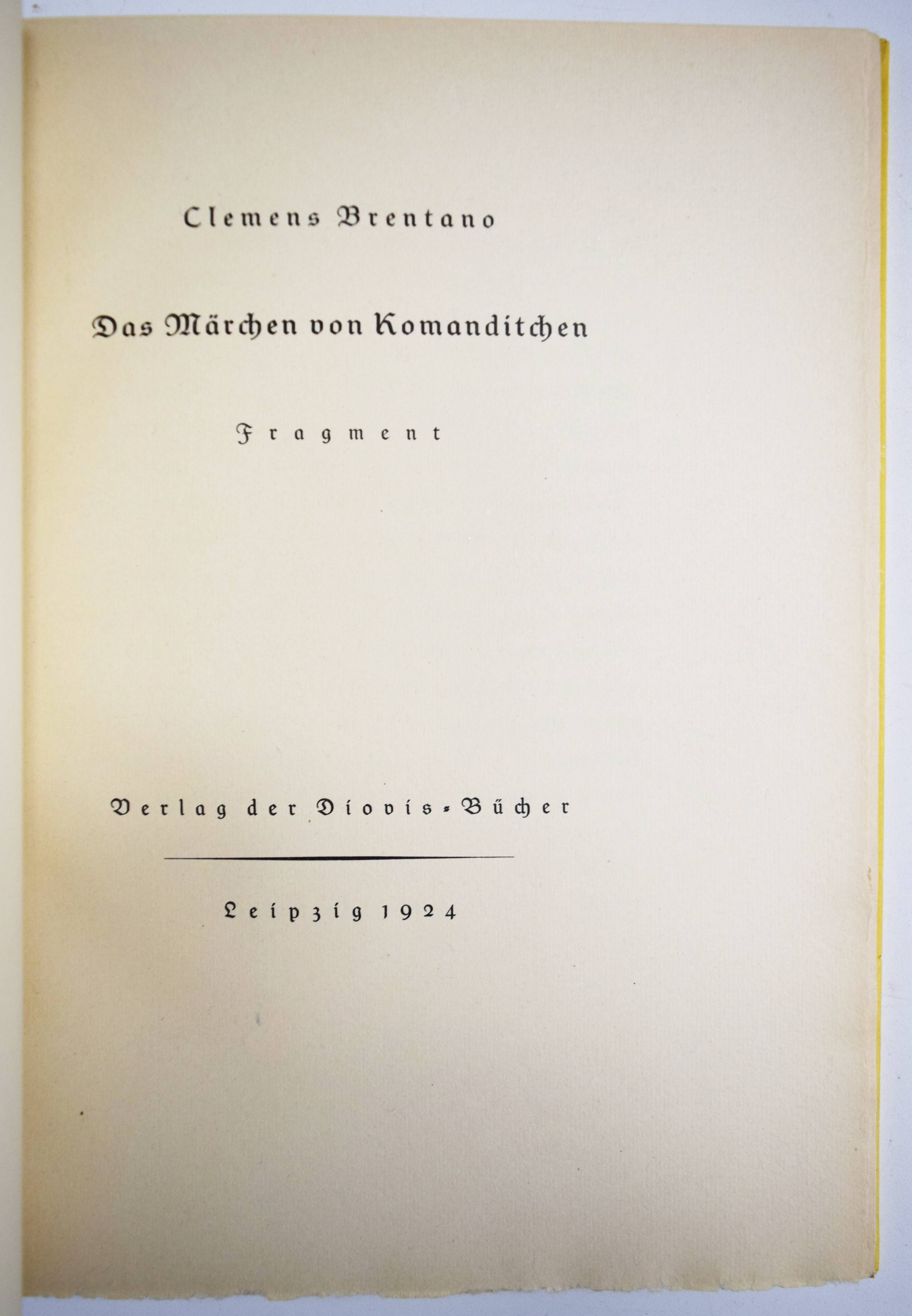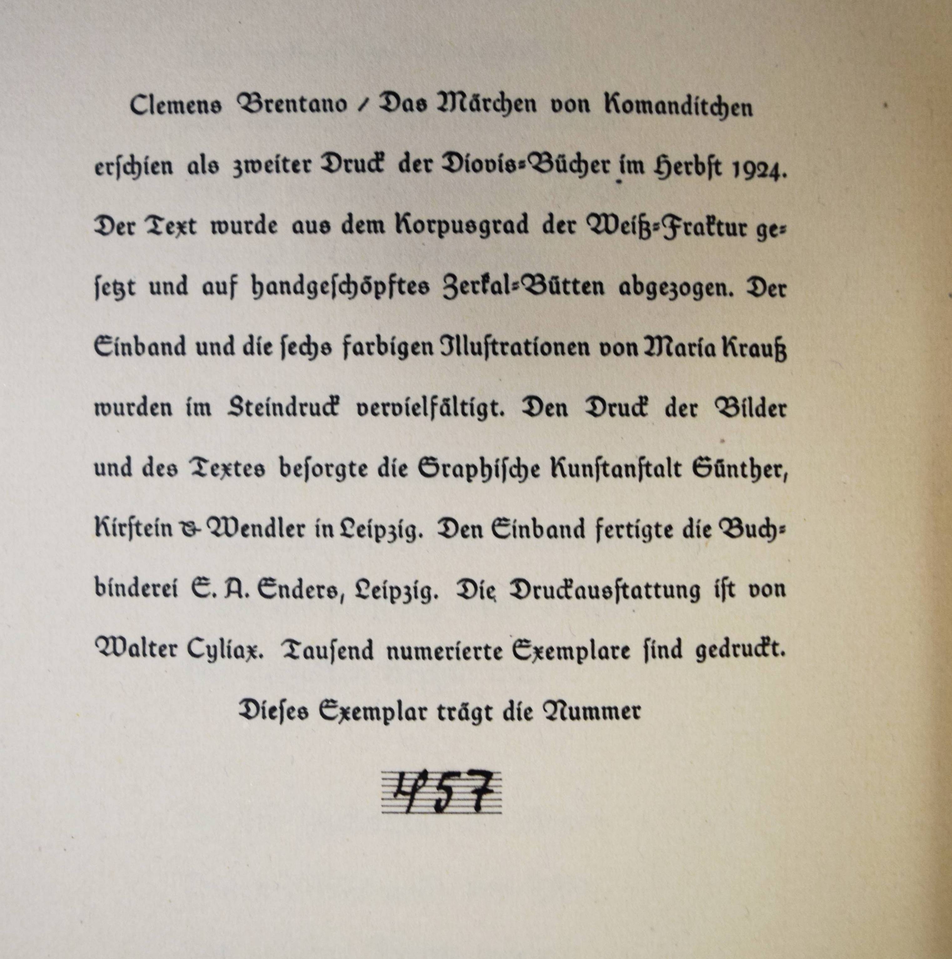Brentano, Clemens. Das Märchen von Komanditchen. Fragment. Leipzig, Verlag der Diovis-Bücher 1924. 4° (27 x 19,5 cm.). 54 S., [3] Bl. mit 6 ganzs. farbigen Orig.-Lithographien von Maria Krauss. Farbig illustr. Orig.-Halbpergamentband mit goldgepr. Rückentitel und Kopfgoldschnitt (Entwurf: E. A. Enders) in Pappschuber. (Diovis-Bücher, Druck 2). Klotz 686/99. – Eines von 1000 num. Exemplaren. Schöner Druck in der Weiß-Fraktur auf seitlich und unten unbeschnittenes Zerkall-Büttenpapier. – „Die Künstlerin Maria Krauss war bis 1921 in Wien Schülerin der privaten Schule und Werkstätte von Emmy Zweybrück und gehört zur zweiten Generation der Wiener Werkstätte. Später war sie Schülerin von Walter Tiemann in Leipzig. Im Jahr 1925 heiratete sie den Graphiker Walter Cyliax, der die Druckausstattung des Buches übernahm“ (vgl. Katalog „Angewandte Kunst“ der Antiquariate Keune, Duisburg und Wölfle, München). – Schuber berieben und gebräunt, sonst sehr gut erhalten.