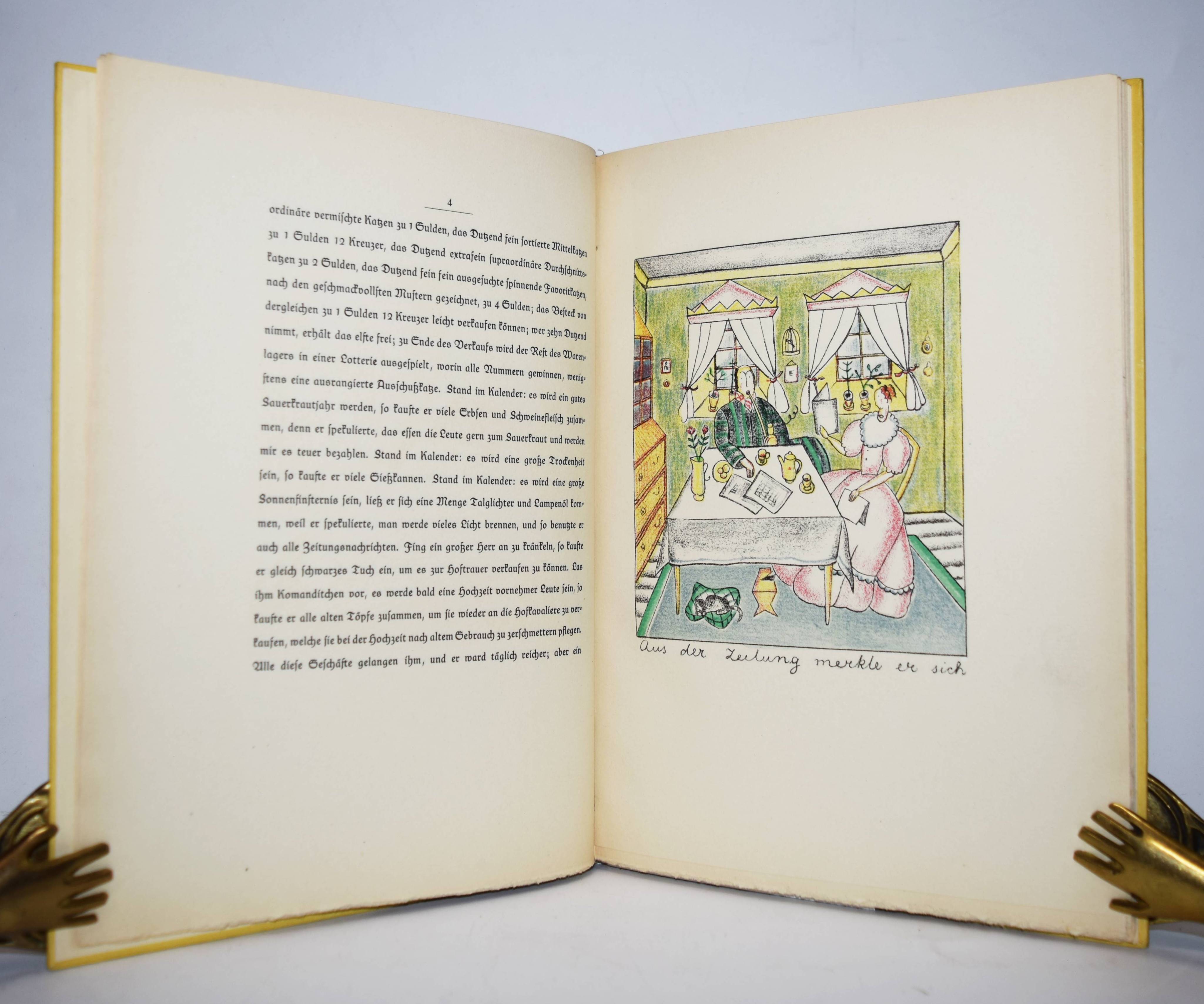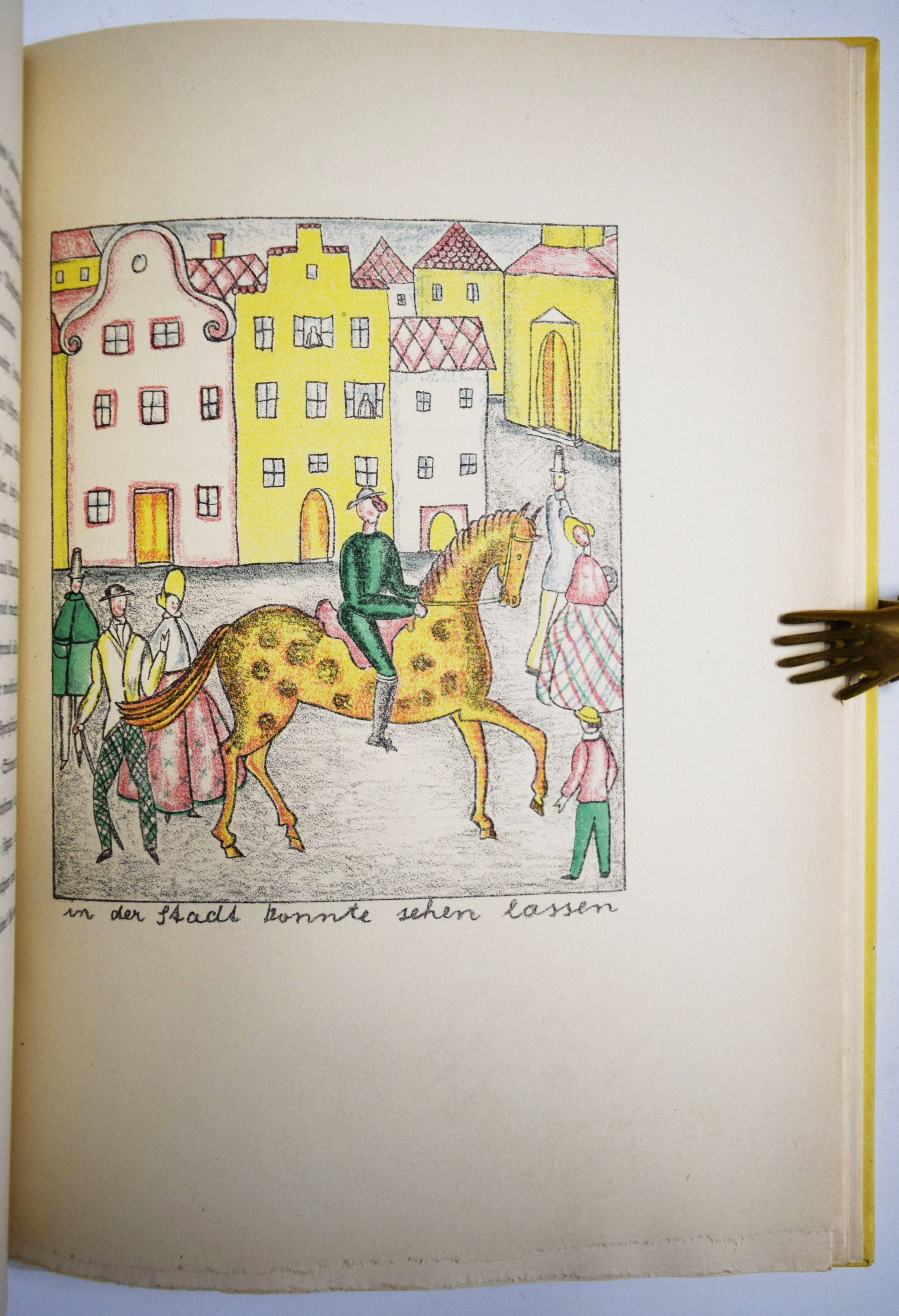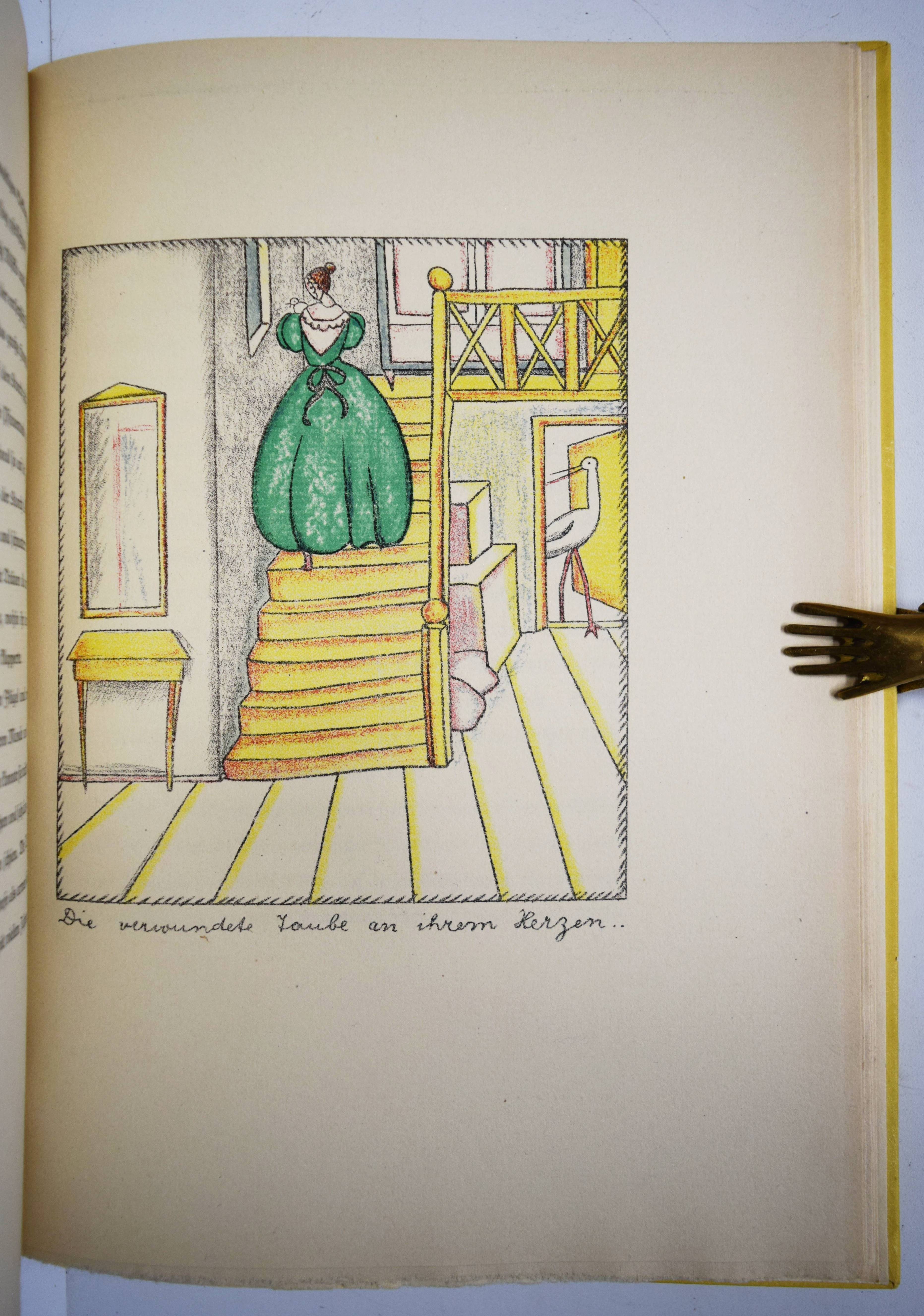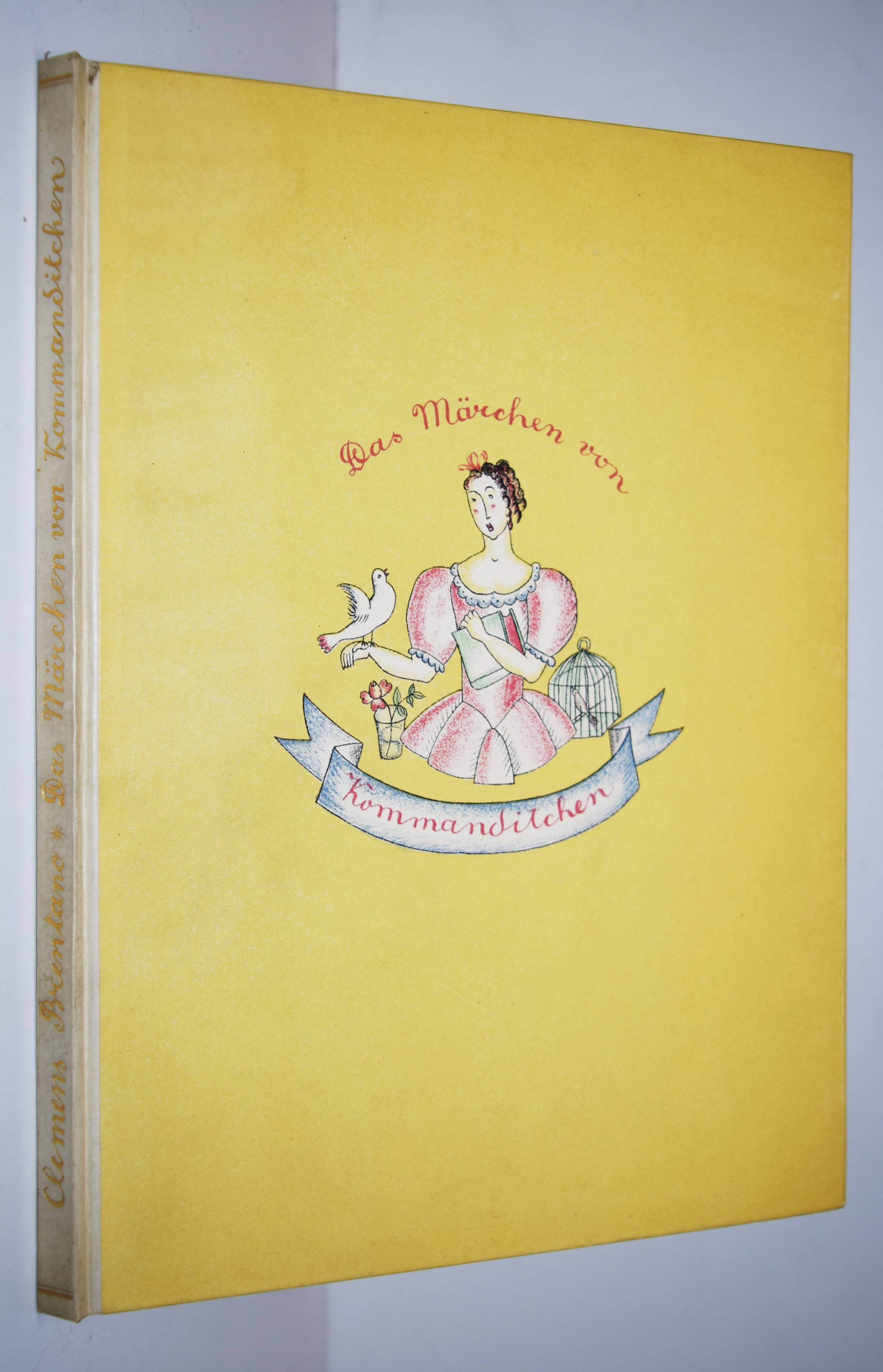 Brentano, Clemens. Das Märchen von Komanditchen. Fragment. Leipzig, Verlag der Diovis-Bücher 1924. 4° (27 x 19,5 cm.). 54 S., [3] Bl. mit 6 ganzs. farbigen Orig.-Lithographien von Maria Krauss. Farbig illustr. Orig.-Halbpergamentband mit goldgepr. Rückentitel und Kopfgoldschnitt (Entwurf: E. A. Enders) in Pappschuber. (Diovis-Bücher, Druck 2). Klotz 686/99. – Eines von 1000 num. Exemplaren. Schöner Druck in der Weiß-Fraktur auf seitlich und unten unbeschnittenes Zerkall-Büttenpapier. – „Die Künstlerin Maria Krauss war bis 1921 in Wien Schülerin der privaten Schule und Werkstätte von Emmy Zweybrück und gehört zur zweiten Generation der Wiener Werkstätte. Später war sie Schülerin von Walter Tiemann in Leipzig. Im Jahr 1925 heiratete sie den Graphiker Walter Cyliax, der die Druckausstattung des Buches übernahm“ (vgl. Katalog „Angewandte Kunst“ der Antiquariate Keune, Duisburg und Wölfle, München). – Schuber berieben und gebräunt, sonst sehr gut erhalten.