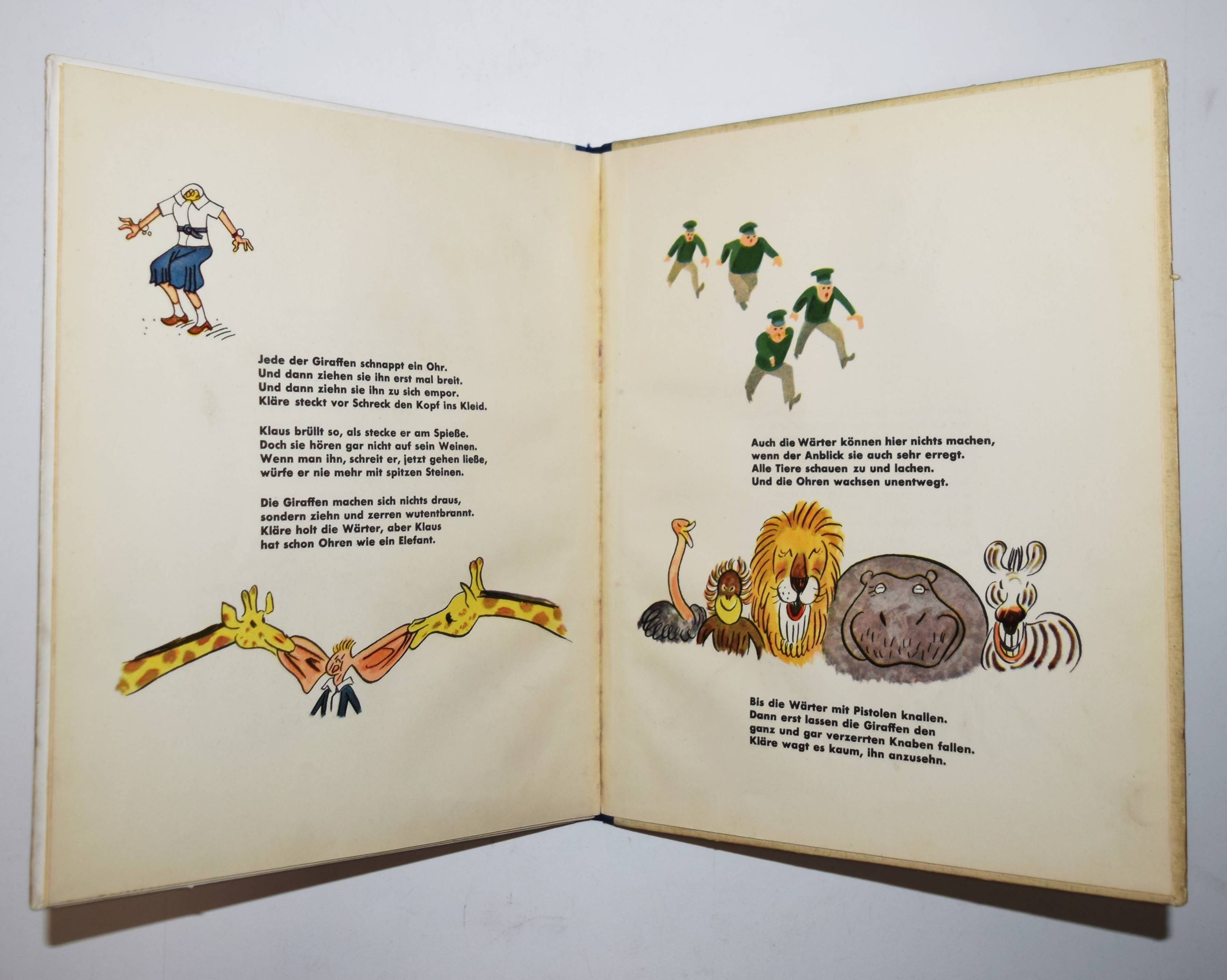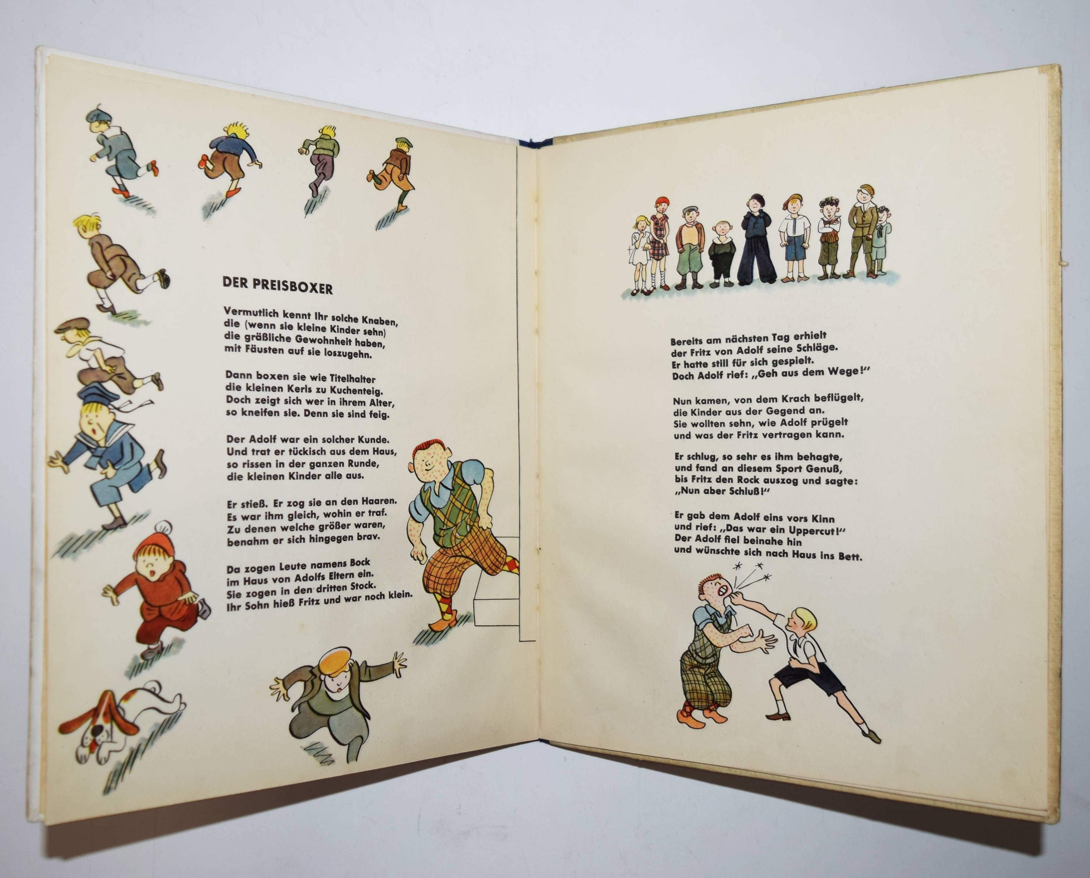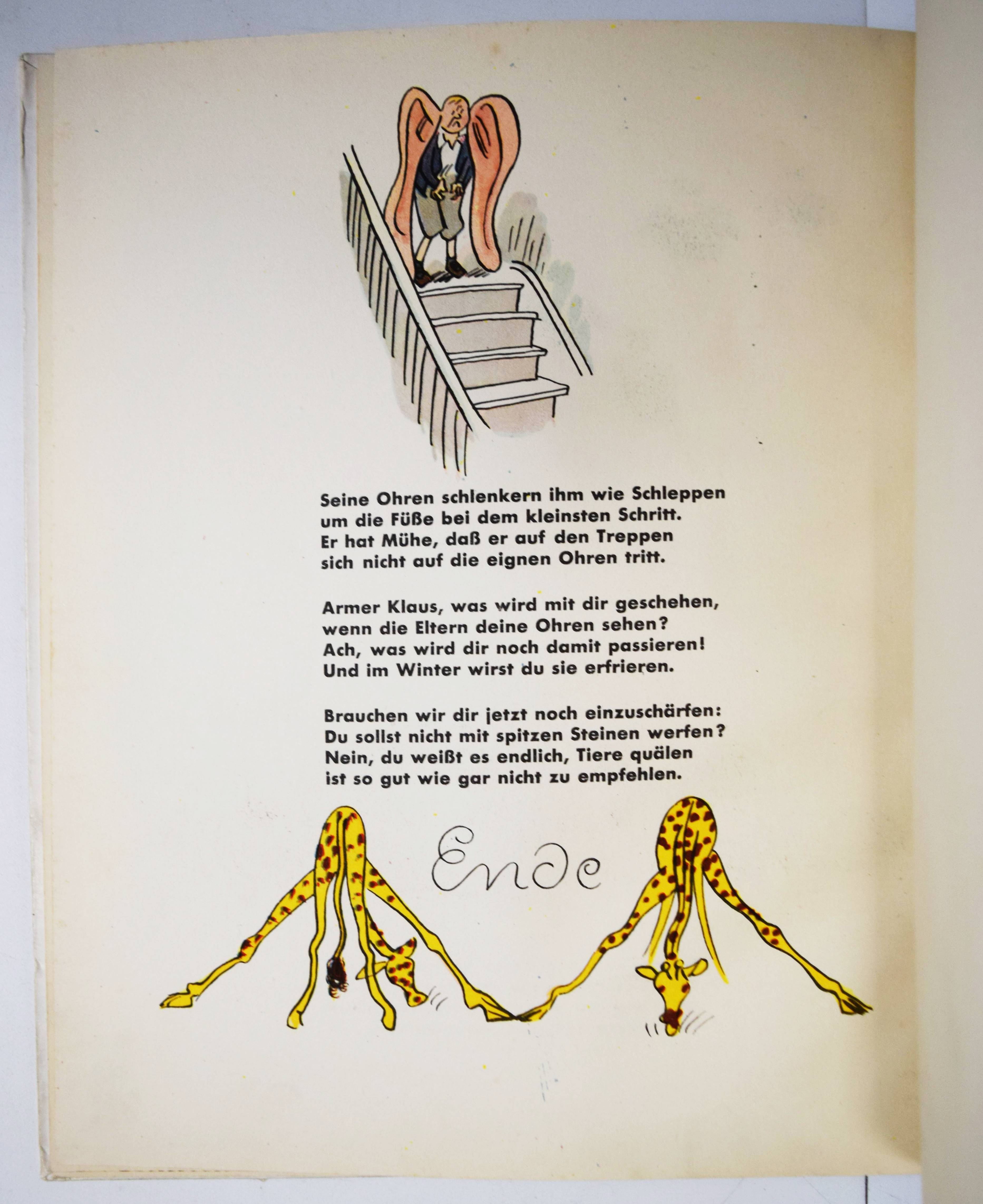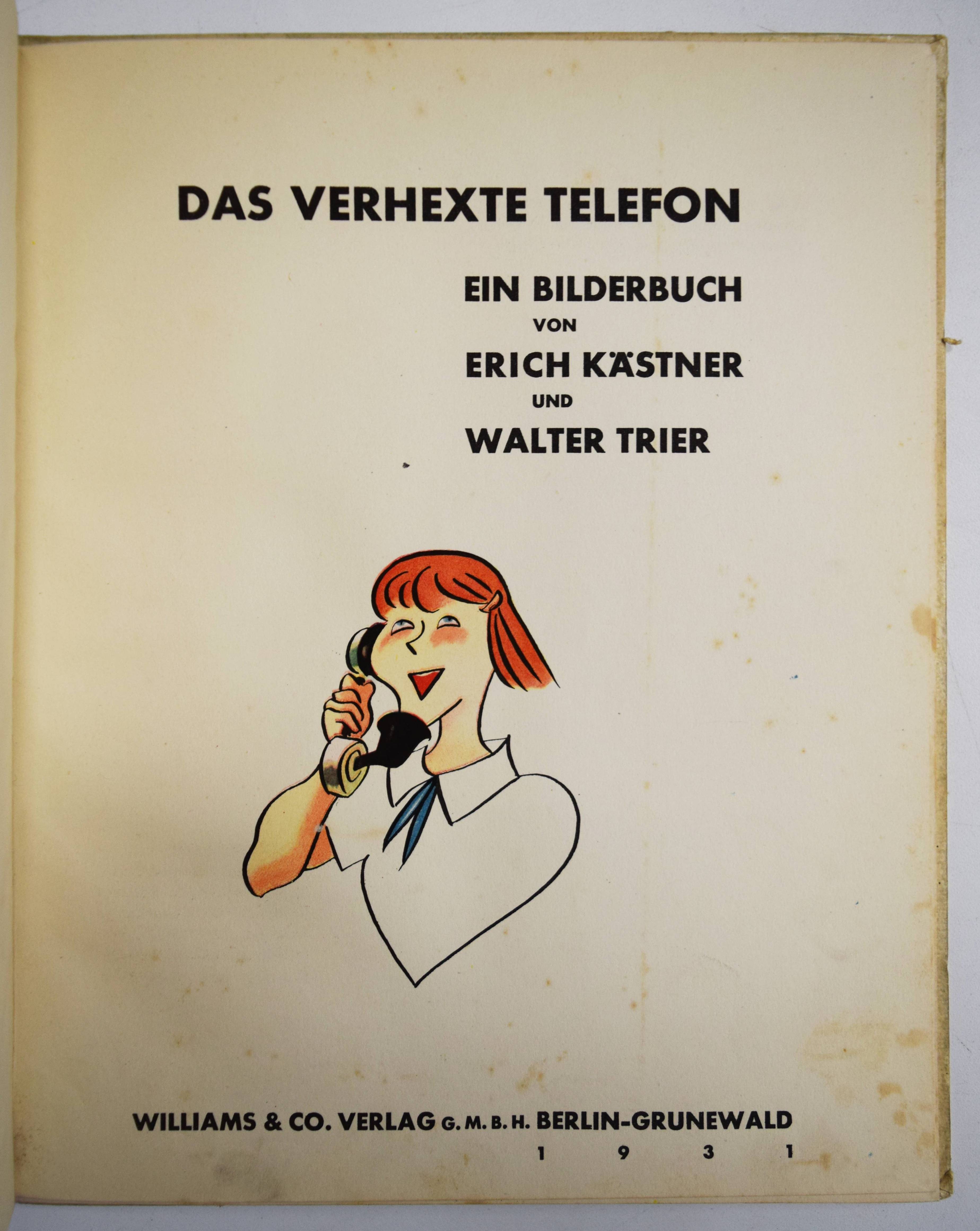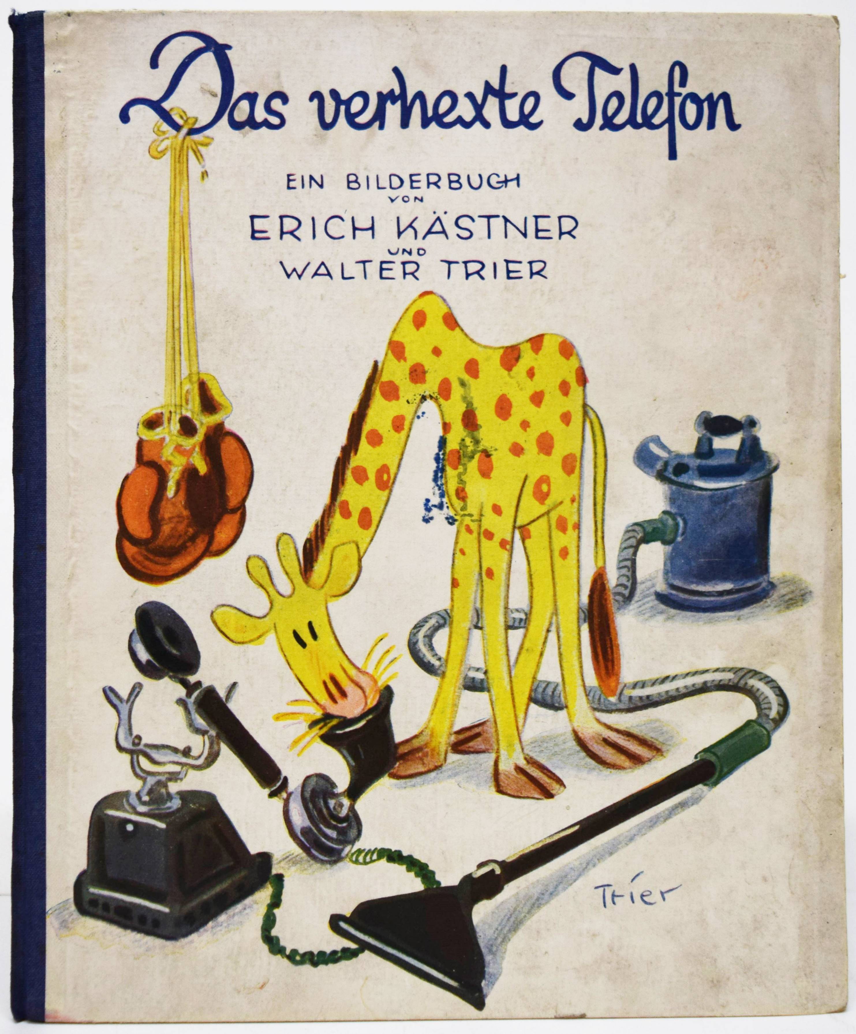 Struwwelpeteriade – Kästner, Erich. Das verhexte Telefon. Ein Bilderbuch. Berlin, Williams & Co. (1930). 4°. [10] Bl. mit farb. Illustrationen von Walter Trier. Farbig illustr. Orig.-Halbleinenband. Slg. Brüggemann II, 471. Doderer-Müller 768. Flechtmann 28. Hatry 174. Klotz 3208/160. LKJ II, 127 und III, 561 f. Rühle 402. Seebaß I, 1020. W.-G.² 14. – Seltene erste und in dieser Form einzige Ausgabe. – „(T)rotz des Copyrightvermerks 1931 schon im November 1930 vom Verlag ausgeliefert (laut Weltbühne 49/26), wurden bis Anfang Dezember 3000 Exemplare verkauft. Kästner empfand das als ‚sehr wenig‘ (das gleiche gilt für ‚Arthur mit dem langen Arm‘)…“ (Hatry). – Folgende Geschichten sind enthalten „Das verhexte Telefon“, „Der Preisboxer“, „Ferdinand saugt Staub“ und „Übermut tut selten gut“. – „Insgesamt dreizehn Bücher von Kästner hat Trier mit Bildern ausgestattet. Charme und Witz beseelen seine Zeichnungen. Erich Kästner erinnert sich an Trier: „Es war ein stiller, ernster Mann mit Kinderaugen. Alles was er zeichnete und malte, lächelte und lachte, sogar der Schrank und der Apfel, die Wanduhr und der Damenhut. Alles war und machte heiter. Er sah die Bosheit und wurde nicht böse. Er sah die Dummheit und blieb gelassen… Trier hatte den, guten Blick’…“ (C. Scheffler in LKJ). – „Beide Bilderbücher sind buchkünstlerisch meisterhaft gestaltet. Die Einheit zwischen Bild und Typographie ist beispielhaft“ (G. Sauer in: Erich Kästner 1899-1989. Ausstellungskat. Ffm. 1989, S. 9). – Rückendeckel etwas fingerfleckig, im Blattrand geringfügig fleckig, gutes Exemplar.