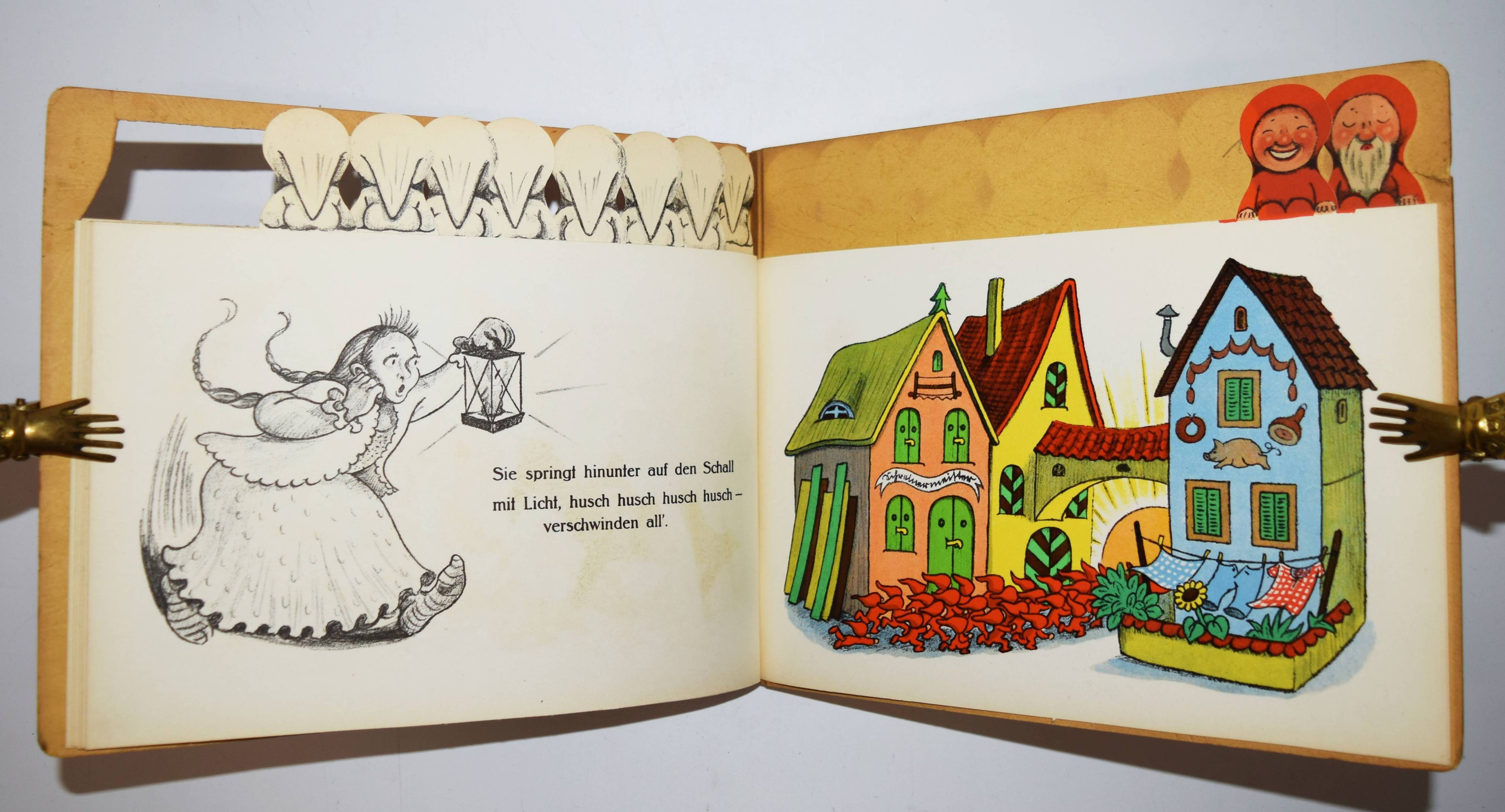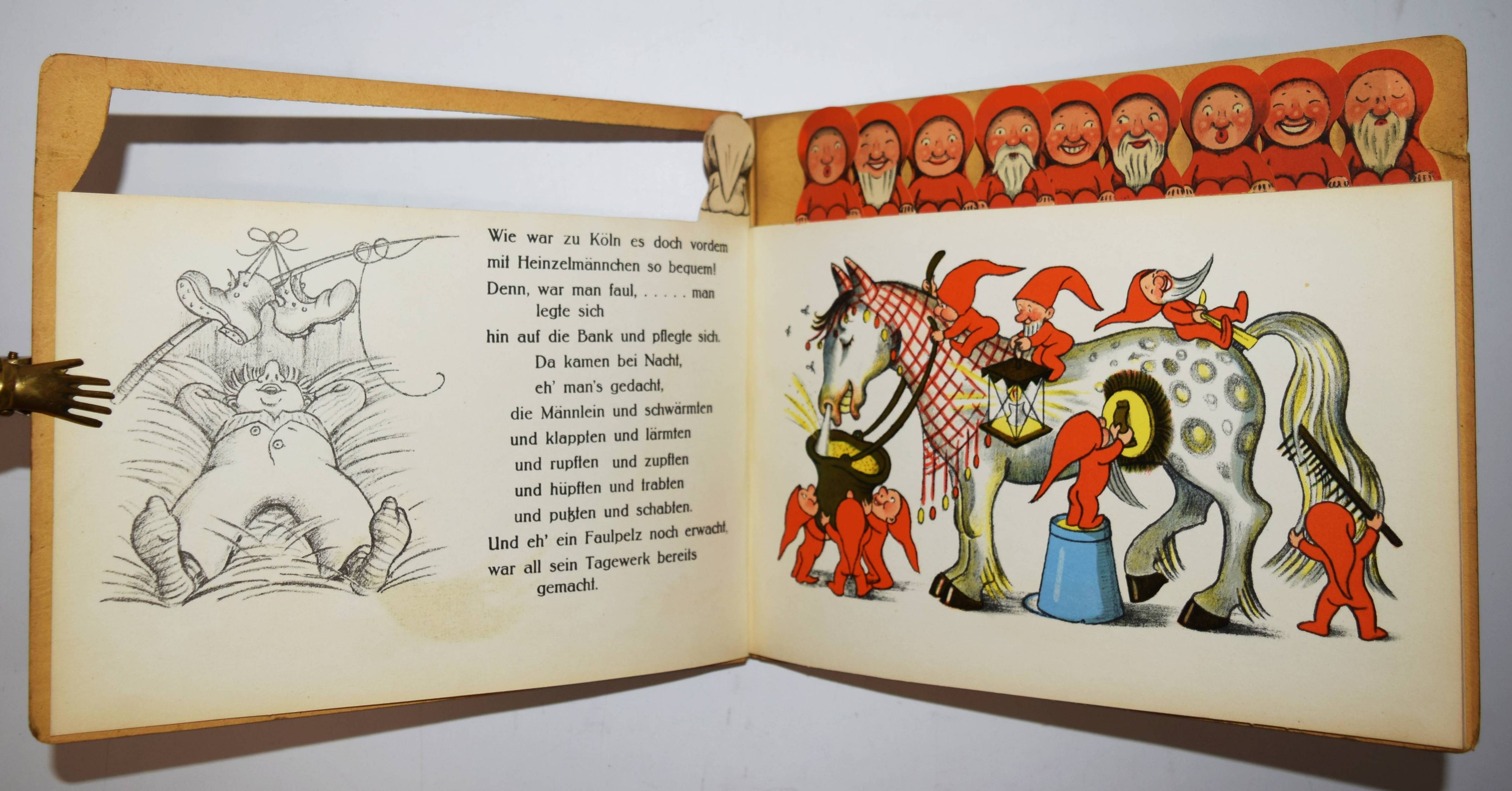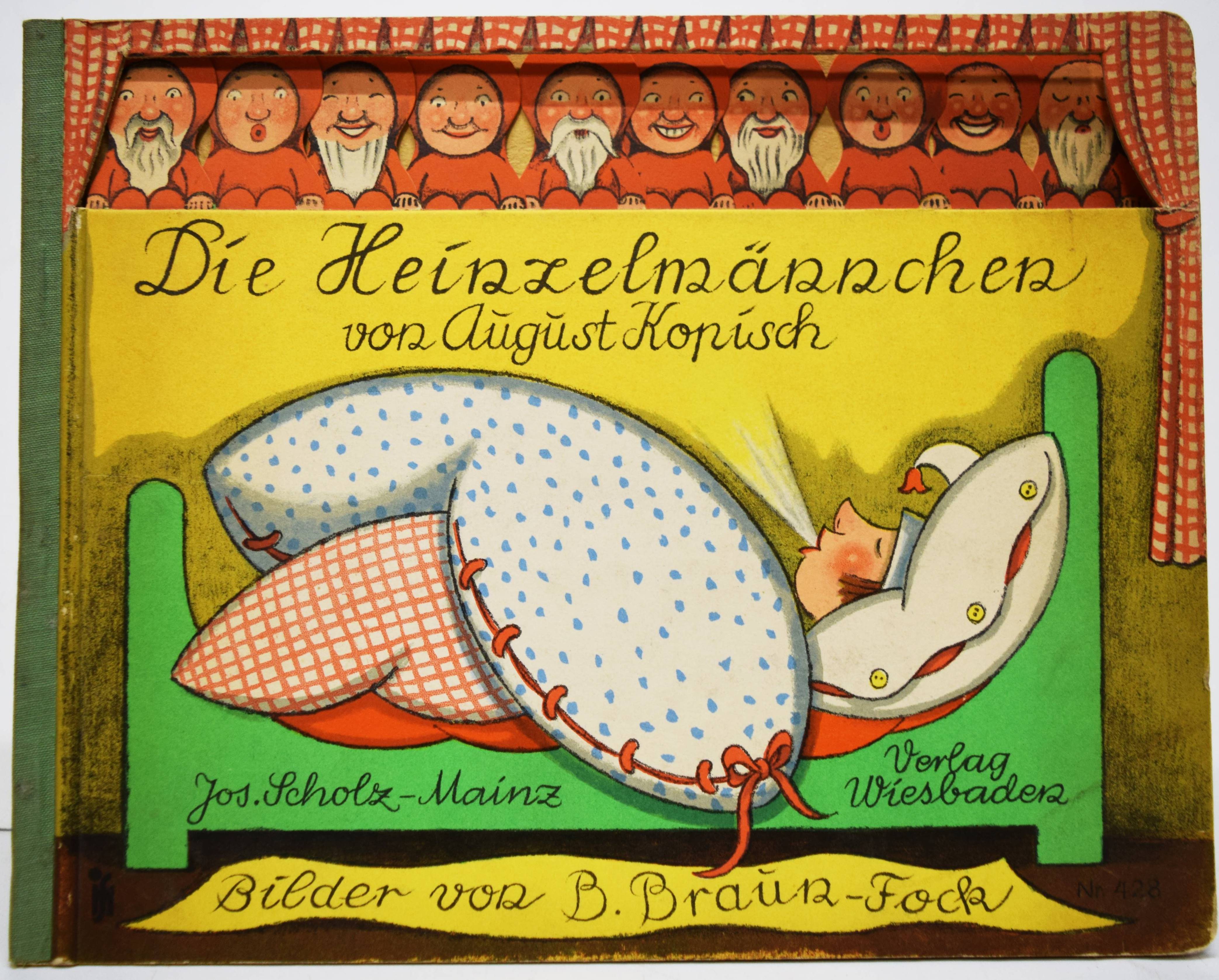 Kopisch, August. Die Heinzelmännchen. Bilder von Beatrice Braun-Fock. Wiesbaden, Scholz o. J. (1948). Quer-Gr.-8°. [10] Bl. mit farbigen Illustrationen und ausgestanzten Heinzelmännchen-Köpfen im oberen Rand. Ausgestanzter farbig illustr. Orig.-Halbleinenband. (Verlags-Nr. 428). Mück II, 2340. Vgl. Bilderwelt 724, Klotz 3625/31 und LKJ I, 200. – Nachkriegs-Ausgabe, erschien in dieser Ausstattung zuerst 1940. – Orginelles Bilderbuch der in Amsterdam geborenen Bilderbuch-Künstlerin und Graphikerin B. Braun-Fock (1898-1973). Sie hat über 40 Jahre lang zahlreiche Bilderbücher gestaltet, außerdem schuf sie Spielquartette und Beschäftigungsbücher für Kinder sowie Illustrationen zu Schulbüchern. – Das vorliegende Bilderbuch erschien zuerst 1937 in Hochformat und ohne die ausgestanzten Figuren. Es erschien auch eine Ausgabe in Sütterlin-Schrift. – Sehr gut erhaltenens Exemplar, dieses empfindlichen Bilderbuchs mit schönen humorvollen Bildern in leuchtenden Farben.