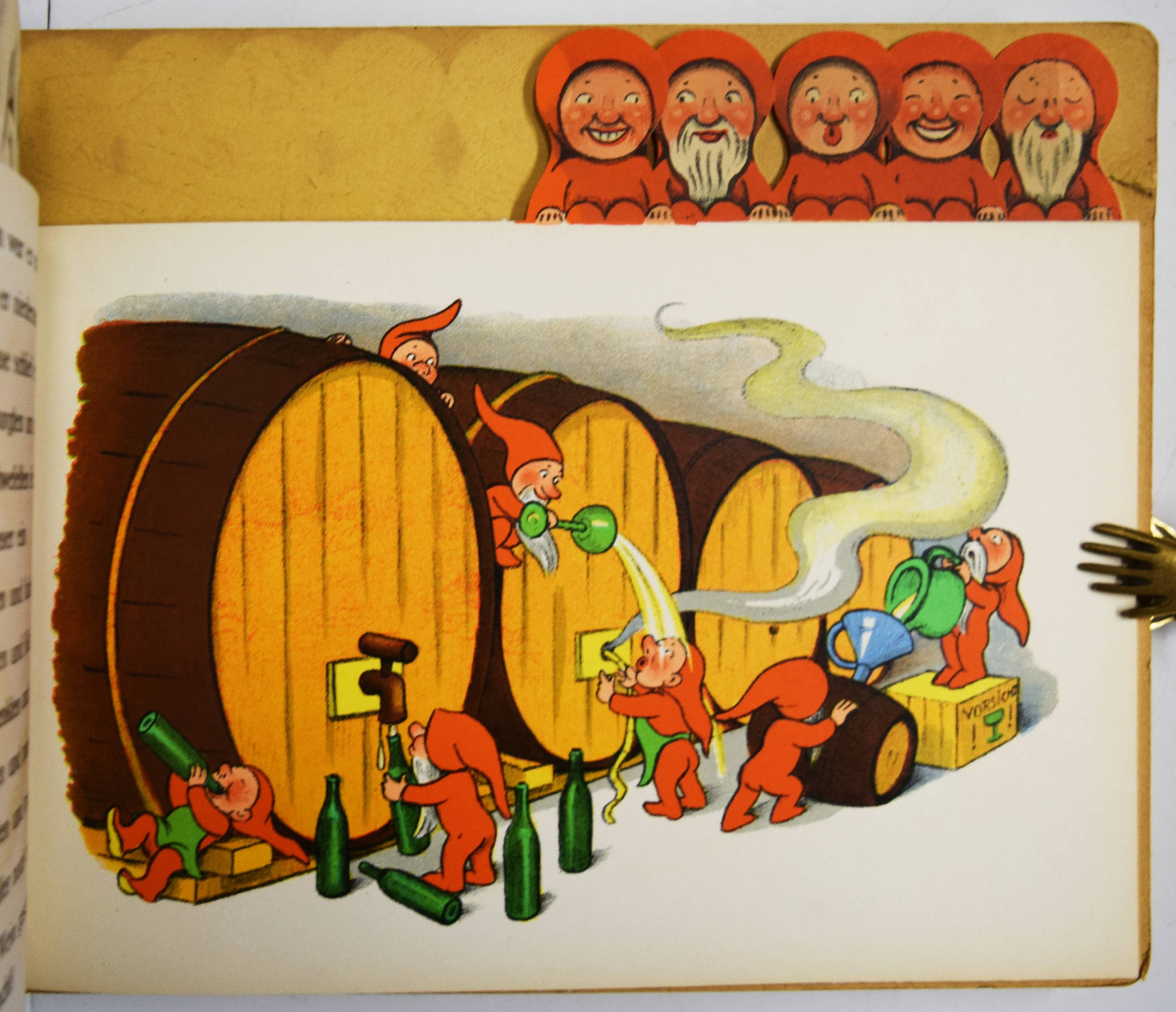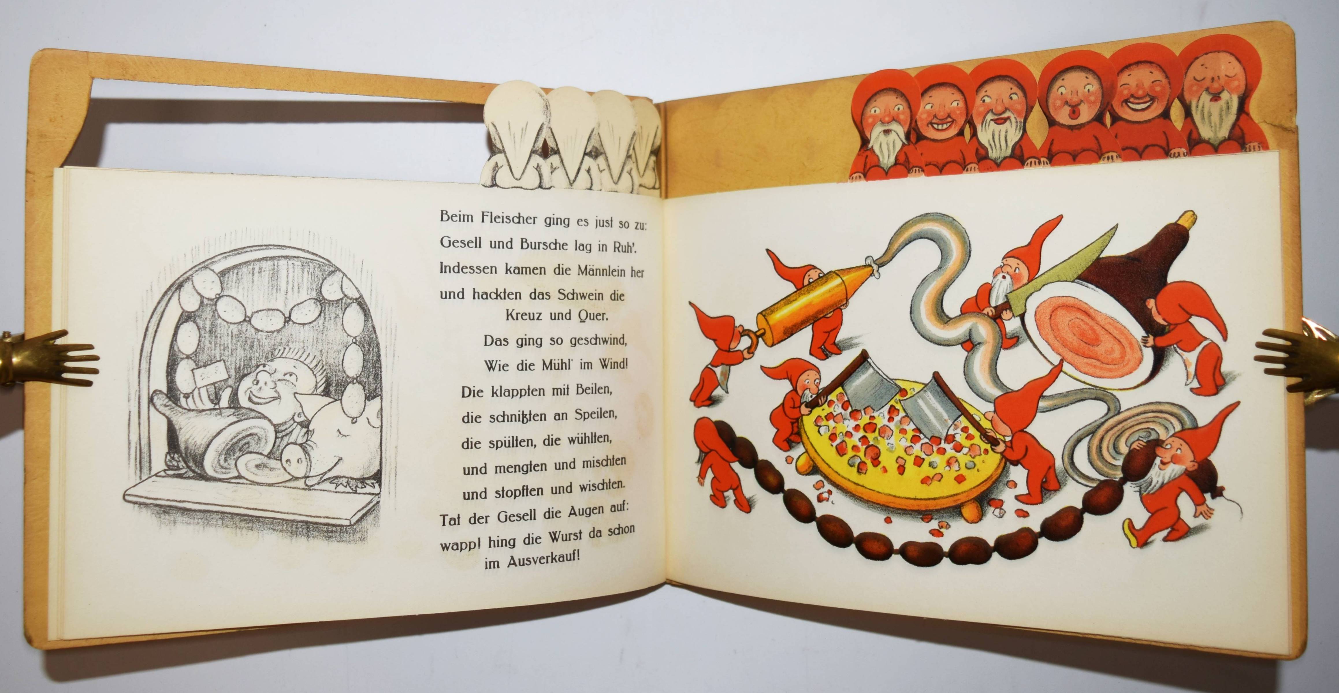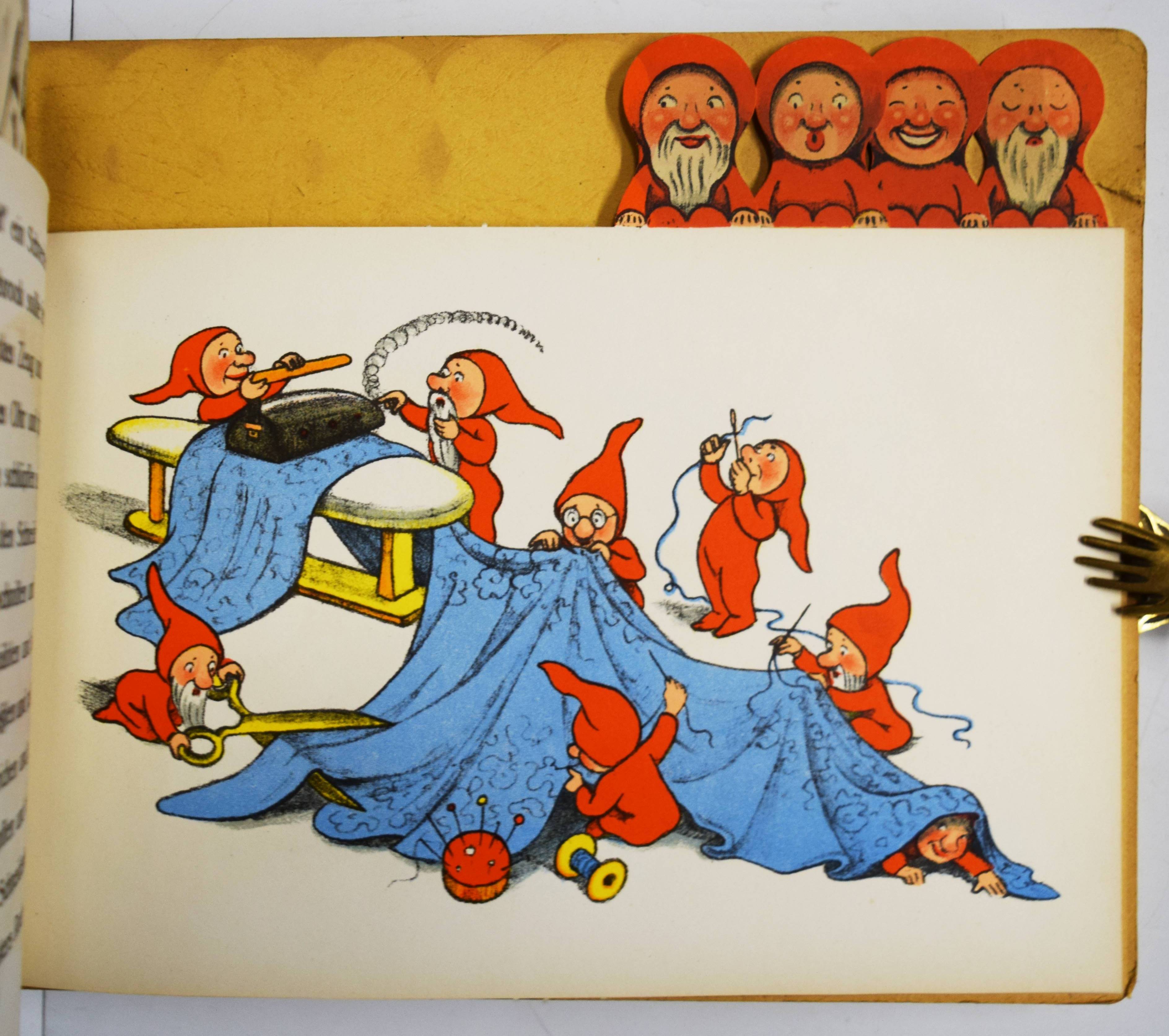 Kopisch, August. Die Heinzelmännchen. Bilder von Beatrice Braun-Fock. Wiesbaden, Scholz o. J. (1948). Quer-Gr.-8°. [10] Bl. mit farbigen Illustrationen und ausgestanzten Heinzelmännchen-Köpfen im oberen Rand. Ausgestanzter farbig illustr. Orig.-Halbleinenband. (Verlags-Nr. 428). Mück II, 2340. Vgl. Bilderwelt 724, Klotz 3625/31 und LKJ I, 200. – Nachkriegs-Ausgabe, erschien in dieser Ausstattung zuerst 1940. – Orginelles Bilderbuch der in Amsterdam geborenen Bilderbuch-Künstlerin und Graphikerin B. Braun-Fock (1898-1973). Sie hat über 40 Jahre lang zahlreiche Bilderbücher gestaltet, außerdem schuf sie Spielquartette und Beschäftigungsbücher für Kinder sowie Illustrationen zu Schulbüchern. – Das vorliegende Bilderbuch erschien zuerst 1937 in Hochformat und ohne die ausgestanzten Figuren. Es erschien auch eine Ausgabe in Sütterlin-Schrift. – Sehr gut erhaltenens Exemplar, dieses empfindlichen Bilderbuchs mit schönen humorvollen Bildern in leuchtenden Farben.