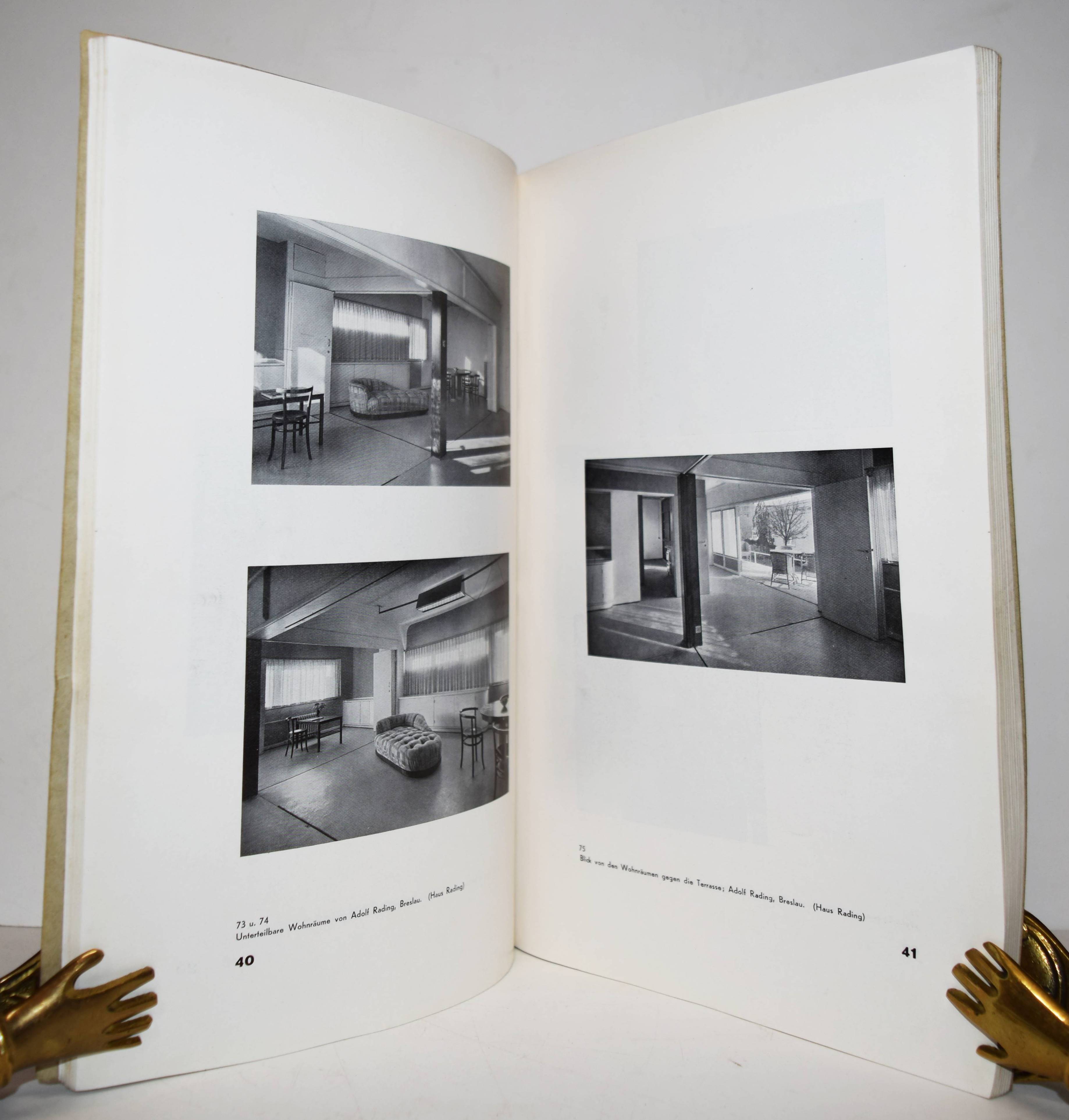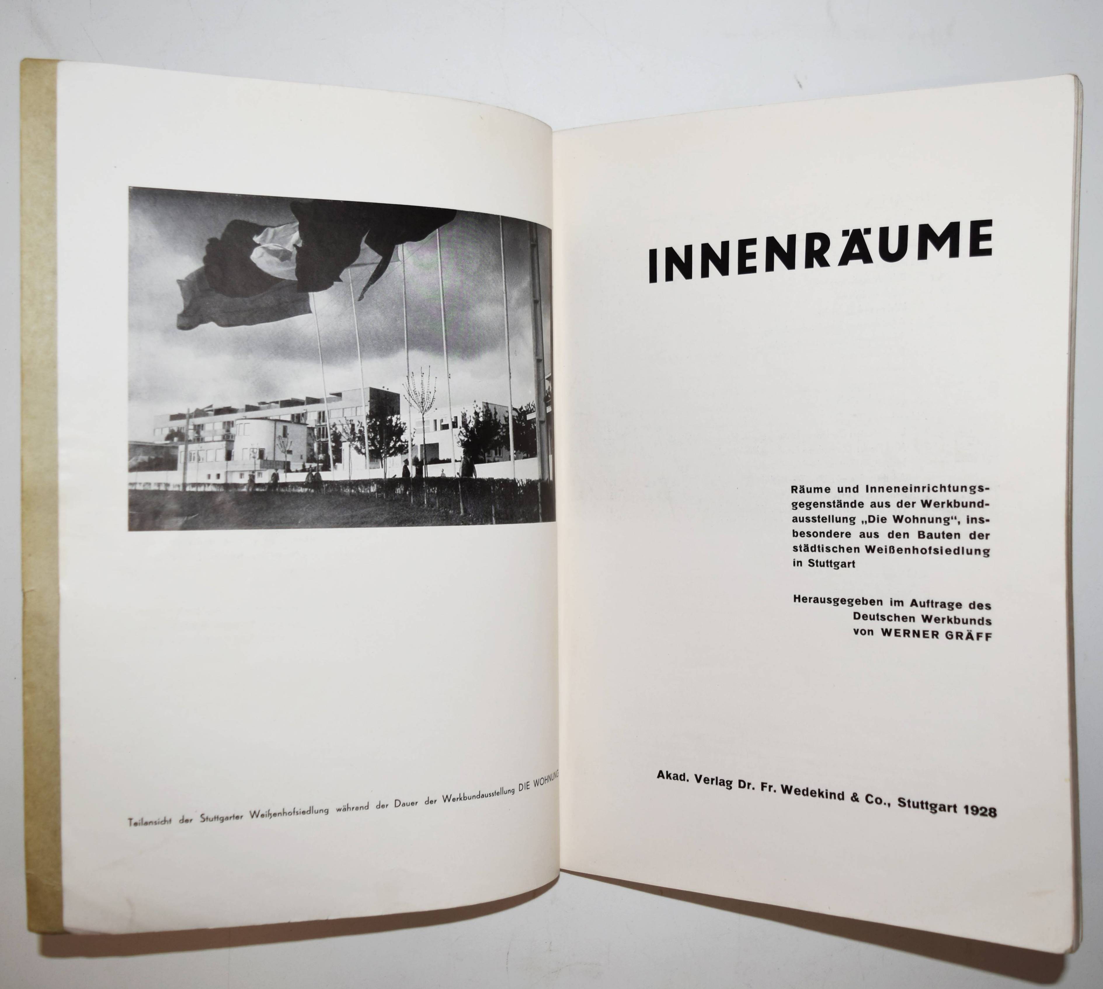 Graeff, Werner (Hrsg.). Innenräume. Räume und Inneneinrichtungsgegenstände aus der Werkbundausstellung „Die Wohnung“, insbesondere aus den Bauten der städtischen Weissenhofsiedlung in Stuttgart. Herausgegeben im Auftrage des Deutschen Werkbunds. Stuttgart, Fr. Wedekind 1928. 4°. 164 S. mit 185 Abbildungen. Typogr. Orig.-Kartonumschlag. Bolliger, Dokumentations-Bibliothek VI, 52, 3. – Der dritte und letzte Teil der Publikationen „über eine der bedeutensten Siedlungsbauten in Europa vor 1933. Über die Durchführung schrieb Werner Graeff, der Presseleiter der Ausstellung: „Im Frühjahr 1926 entschloss sich die Stadt Stuttgart, im Rahmen ihres allgemeinen Wohnbauprogramms eine Mustersiedlung von rund 60 Wohneinheiten bauen zu lassen. Die Siedlung sollte nach Vorschlägen des Deutschen Werkbundes erstellt, für die Dauer einer grossen Werkbundausstellung [″Die Wohnung“] der Öffentlichkeit zugänglich gemacht werden und danach zur Verfügung des Städtischen Wohnungsamts stehen. Man sah teils Einfamilienhäuser, teils mehrstöckige Wohnblöcke vor. Mies van der Rohe, Berlin, stellte den Überbauungsplan auf und erhielt die künstlerische Oberleitung über die Ausstellung. An der Beteiligung verhindert waren Adolf Loos, Hugo Häring … und Erich Mendelsohn, aber sonst enthält die Liste der mitwirkenden Architekten die wesentlichsten Neuerer europäischer Baukunst: P. Behrens, Gropius, Hilberseimer, Le Corbusier und P. Jeanneret, Mies van der Rohe, Oud, Poelzig, Mart Stam, die Brüder Taut u. a. „Die Siedlung ist auch heute noch von beispielhafter Wirkung, ein gnädiges Schicksal hat sie uns erhalten!“ (Hans Bolliger). – Gelenke leicht berieben, Umschlag etwas angestaubt, sehr gutes Exemplar.