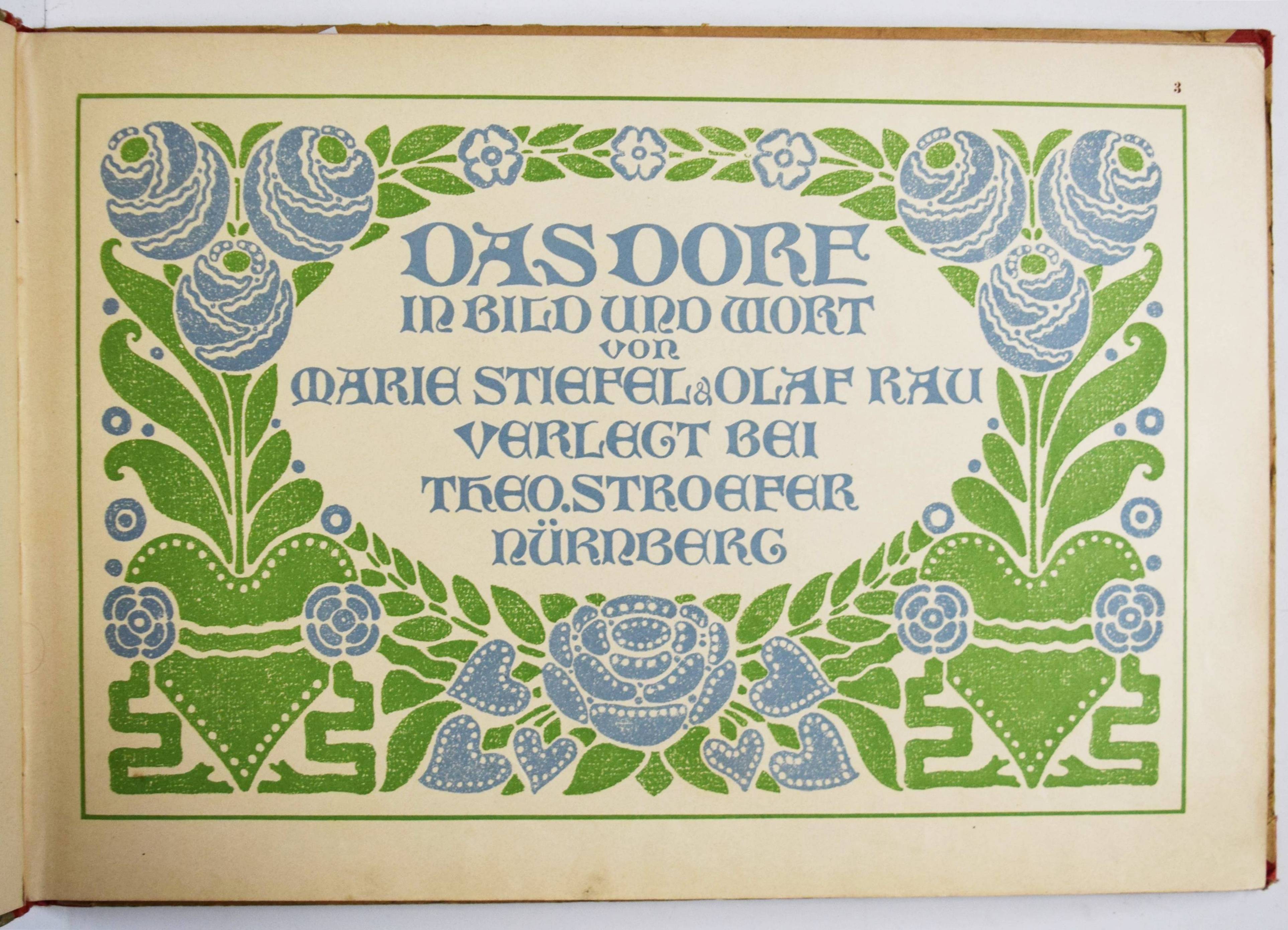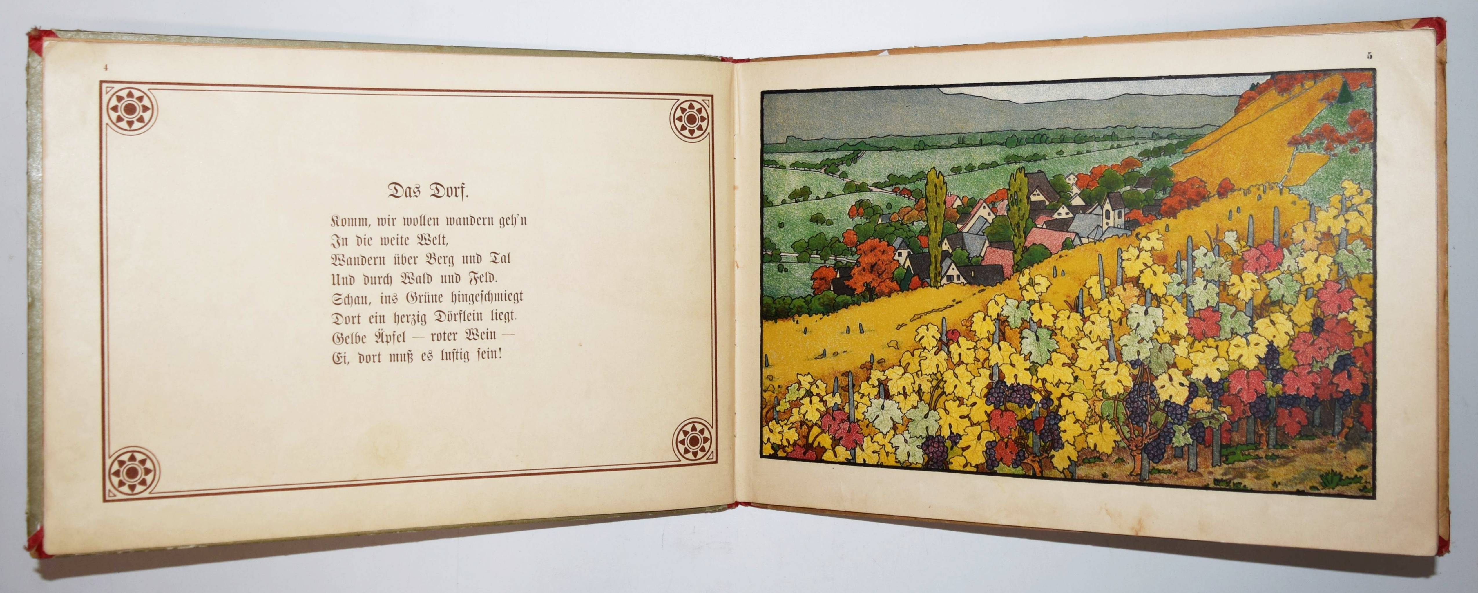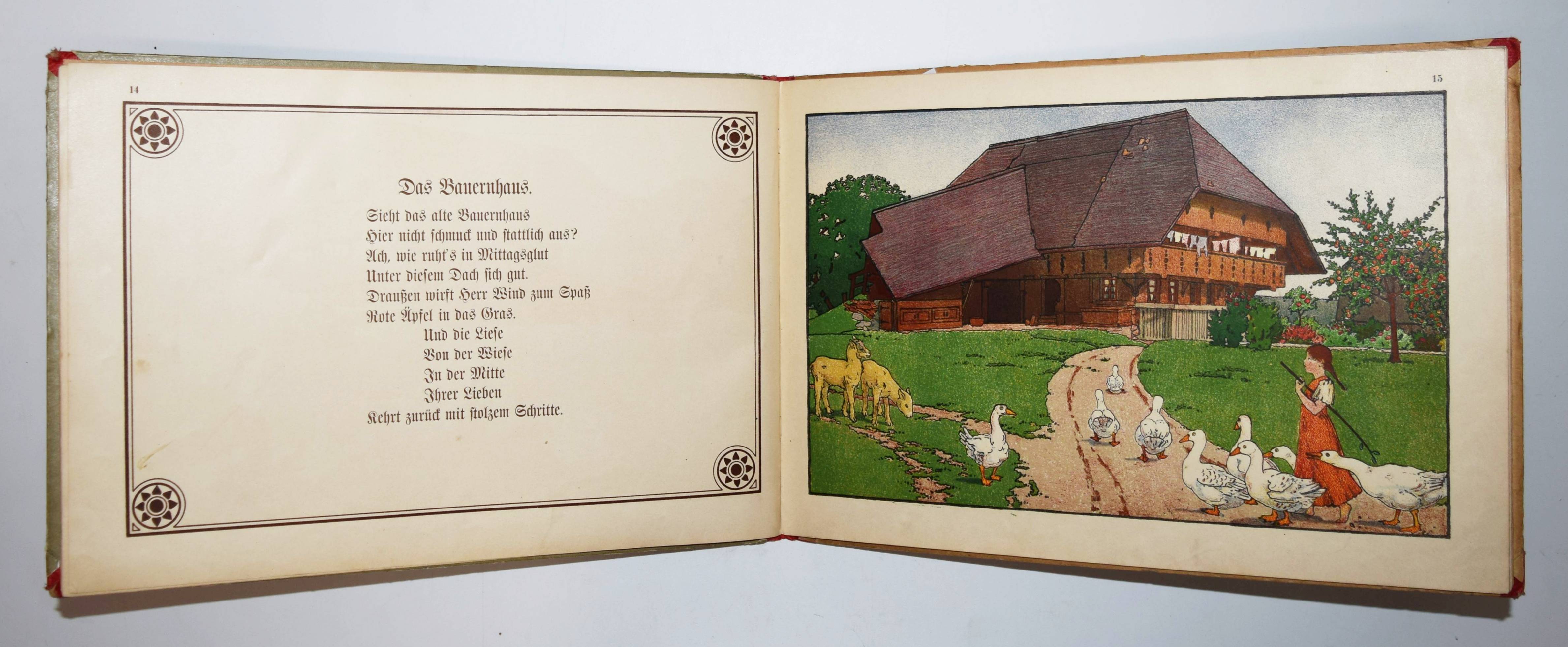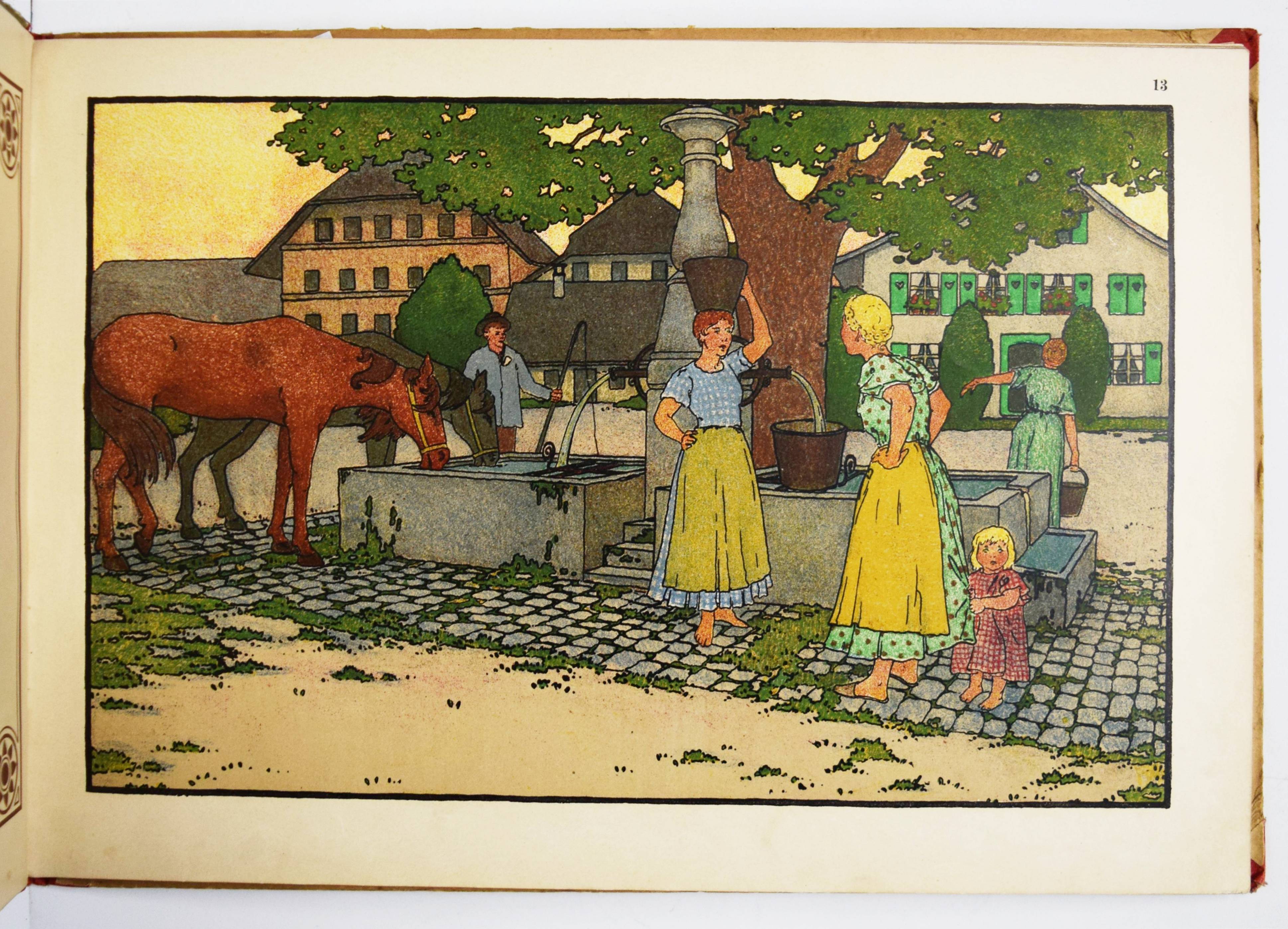 Rau, Olaf. Das Dorf in Bild und Wort. Nürnberg, Theo. Stroefer o. J. (1906). Quer-4° (24,5 x 36 cm.). 36 S. mit farbig illustr. Titel, 12 farblithogr. Tafeln und Vignetten von Marie Stiefel. Farbig illustr. Orig.-Halbleinenband. (Verlags-Nr. 1352). Bilderwelt 502. Ries 906, 1. SBI 199 und S. 75 (mit Abb. u. Farbabb. auf Tafel 11). Stuck-Villa I, 501 und II, 325 (mit Farbabb. S. 148). Nicht bei Rammensee. – Erste Ausgabe dieses seltenen Jugendstilbilderbuchs. – „Sachschilderung, jahreszeitliche Stimmung und Lokalkolorit gehen in diesem Buch der Schweizer Illustratorin Marie Stiefel (1879-1962) eine geglückte Verbindung ein. Es handelt sich wohl um das schönste Beispiel Schweizer Heimatkunst im Bilderbuch, das merkwürdigerweise in einem deutschen Verlag (zugleich auch in einer Ausgabe ohne Text auf Pappe) erschienen ist“ (H. Ries in Bilderwelt). – Die Züricher Künstlerin studierte nach einer Ausbildung an der Kunstgewerbeschule Zürich (1896-1900) und im Atelier E. Grasset in Paris (1900-1903) in München und Florenz. „In ihrem Bilderbuch „Das Dorf“ wechseln stimmungsvolle Landschaftsbilder mit informativen, sachbuchartigen Ansichten von verschiedenen Bereichen eines Bauernhofes. Die sorgfältige Ausstattung, vom schön gestalteten Vorsatzblatt über den Titel und die mit Ornamenten und Vignetten geschmückten Zwischenseiten bis hin zu den eindrucksvollen Farbtafeln, machen das Buch zu einem besonders schönen Beispiel des Künstlerbilderbuchs“ (V. Rutschmann). – Deckel leicht angestaubt, Kanten etwas berieben, gutes Exemplar.